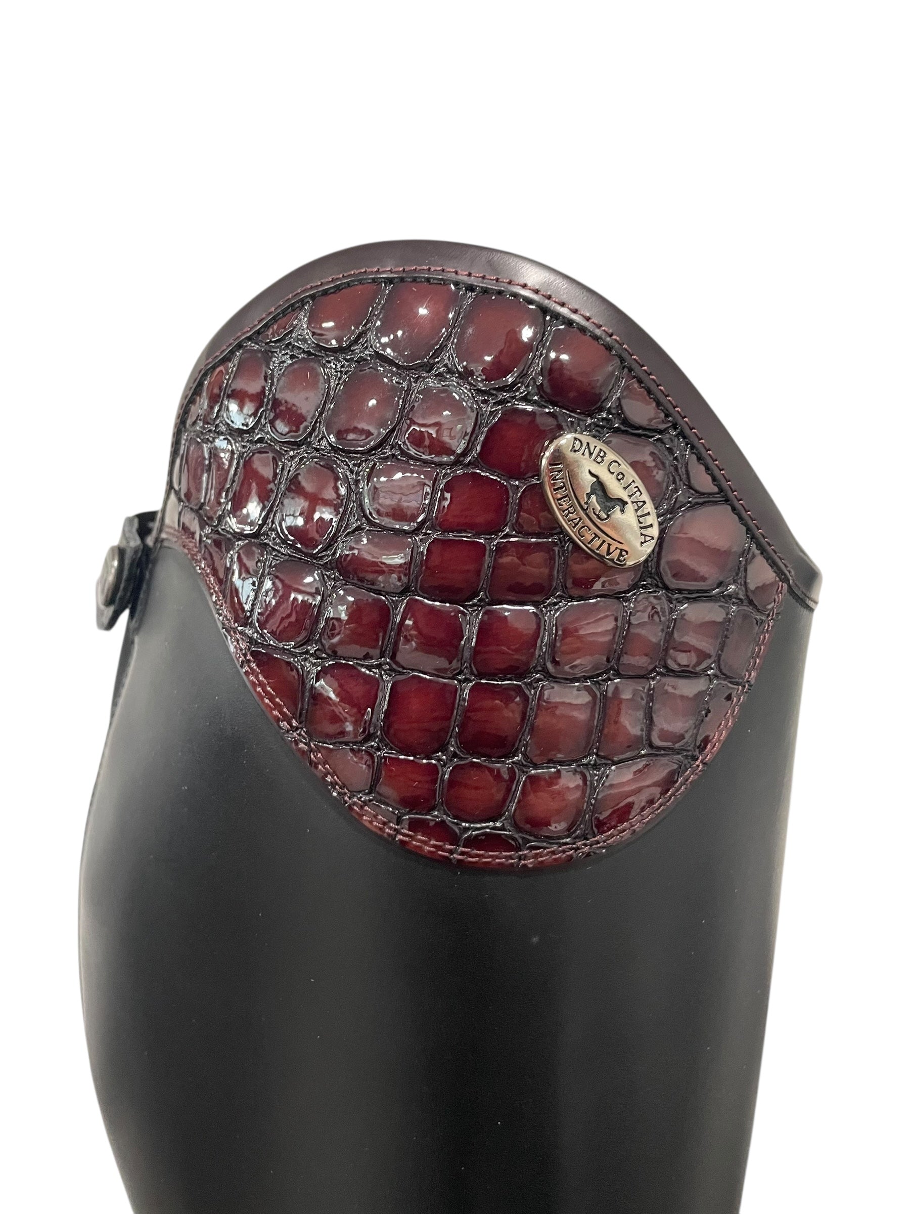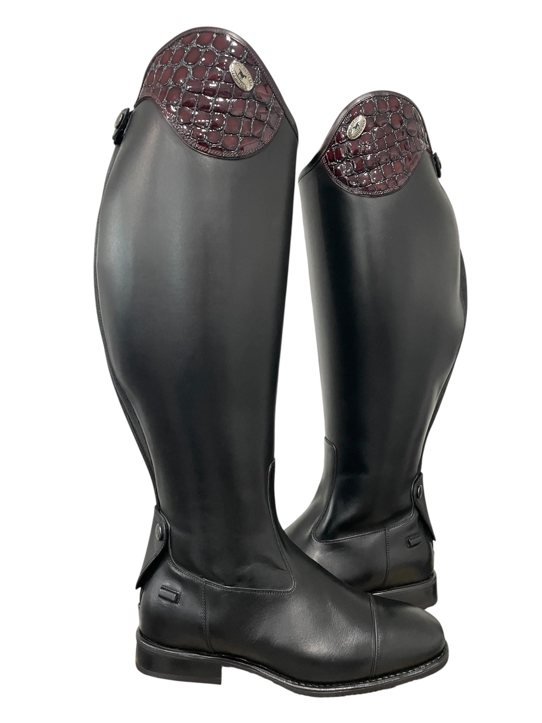 Description: WRAT black base, spur rests, top in lucidi porpora with brushed burgundy piping, toecap with brushed burgundy piping, silver logo, and black outsole.