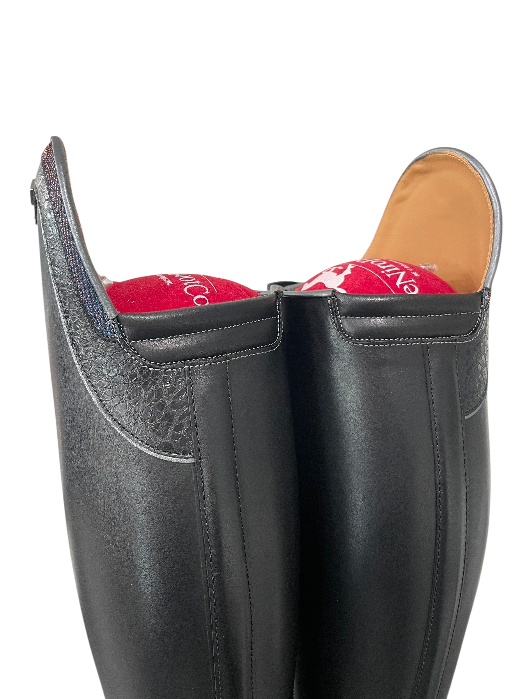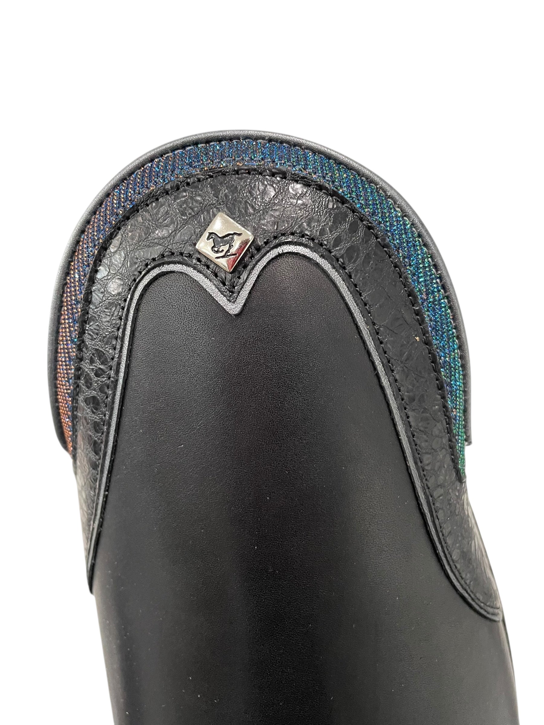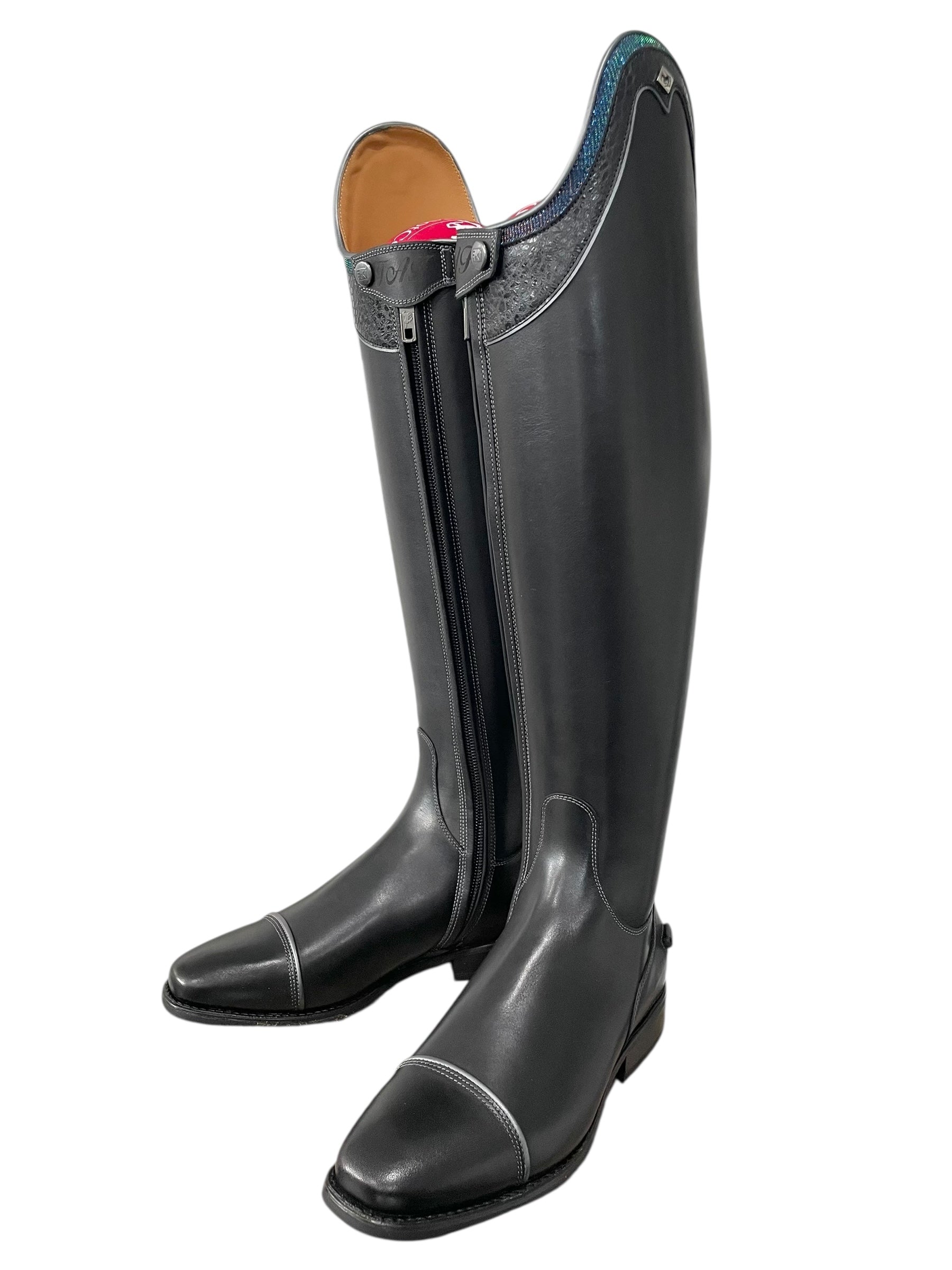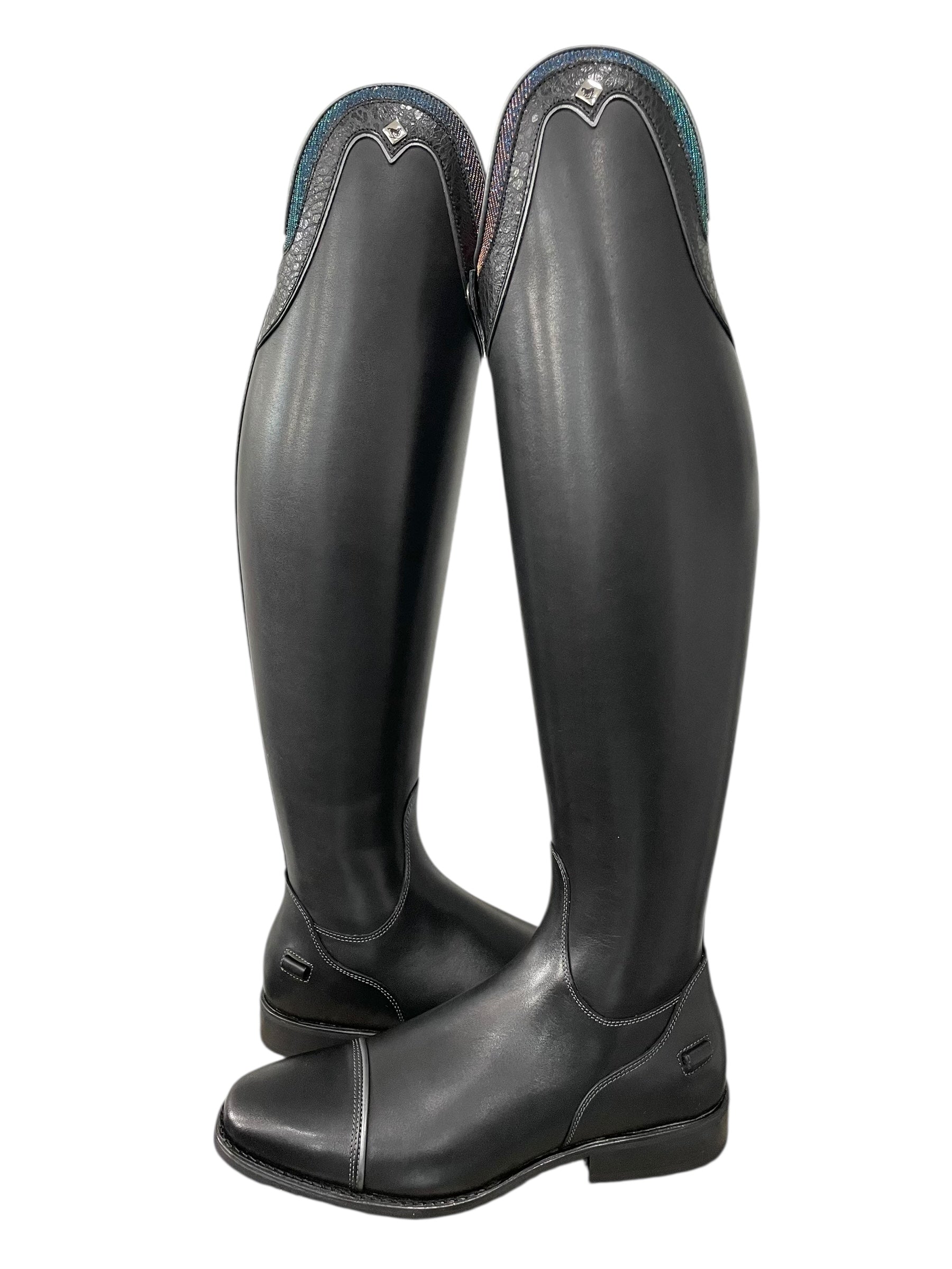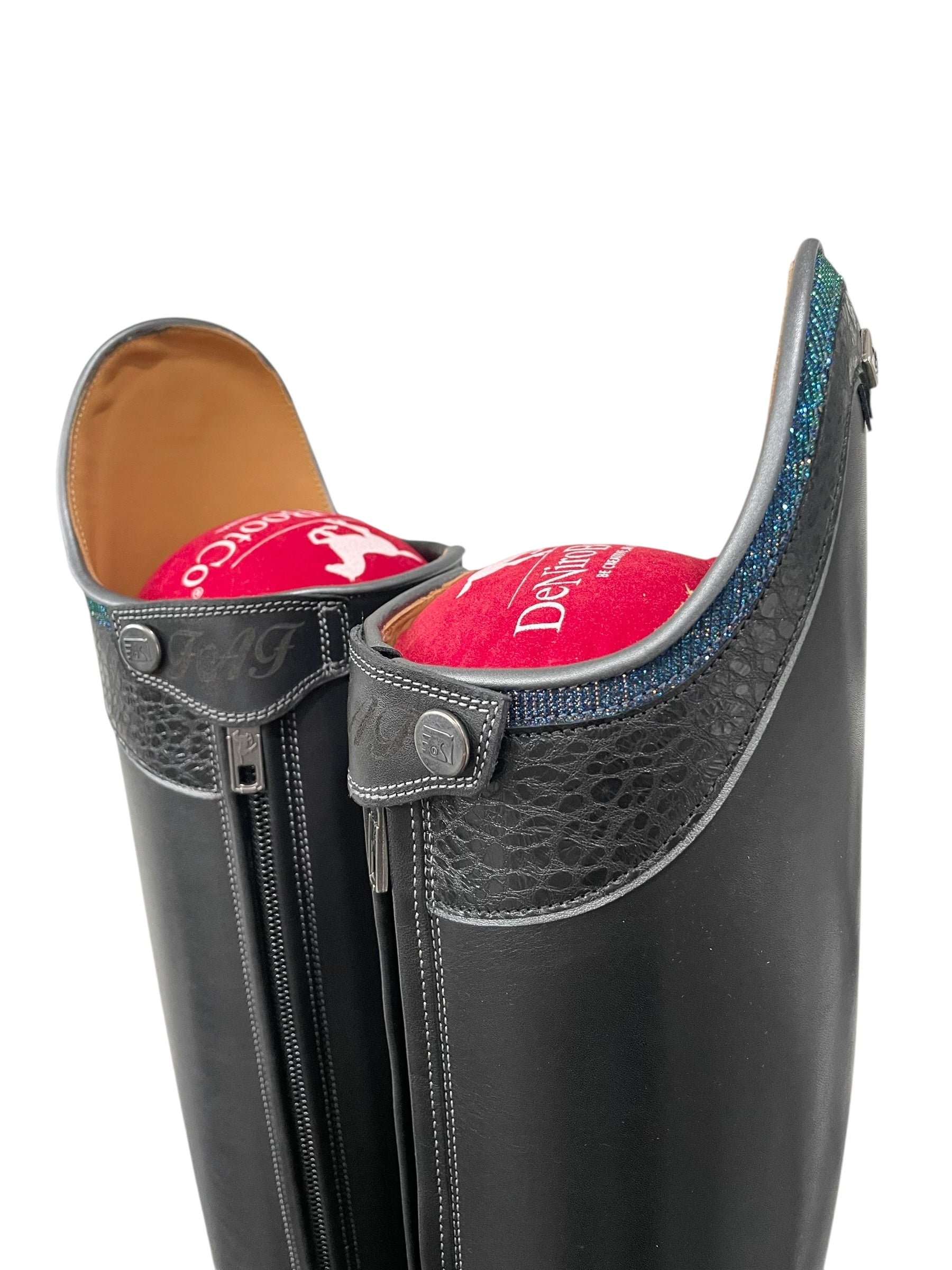 Description: WRAT black base, G34 Capinera top in buongiorno black with iride notte frame and rosetto petrolio piping under the top, luxury 2500 top and rolled toecap piping, engraved initials on the top zip protectors ("FAF"), Q13 comfort knee, teal stitching, and black outsole.