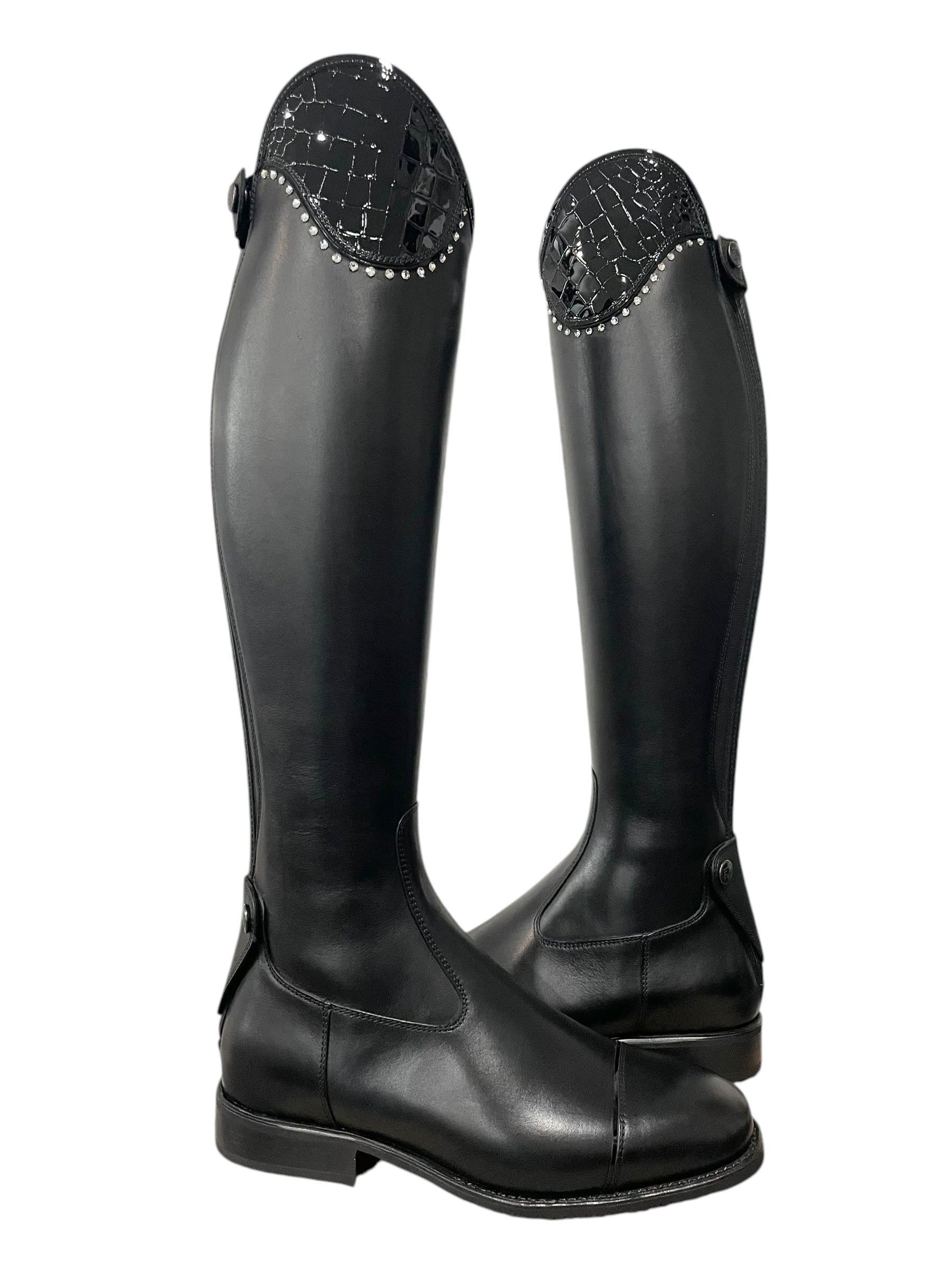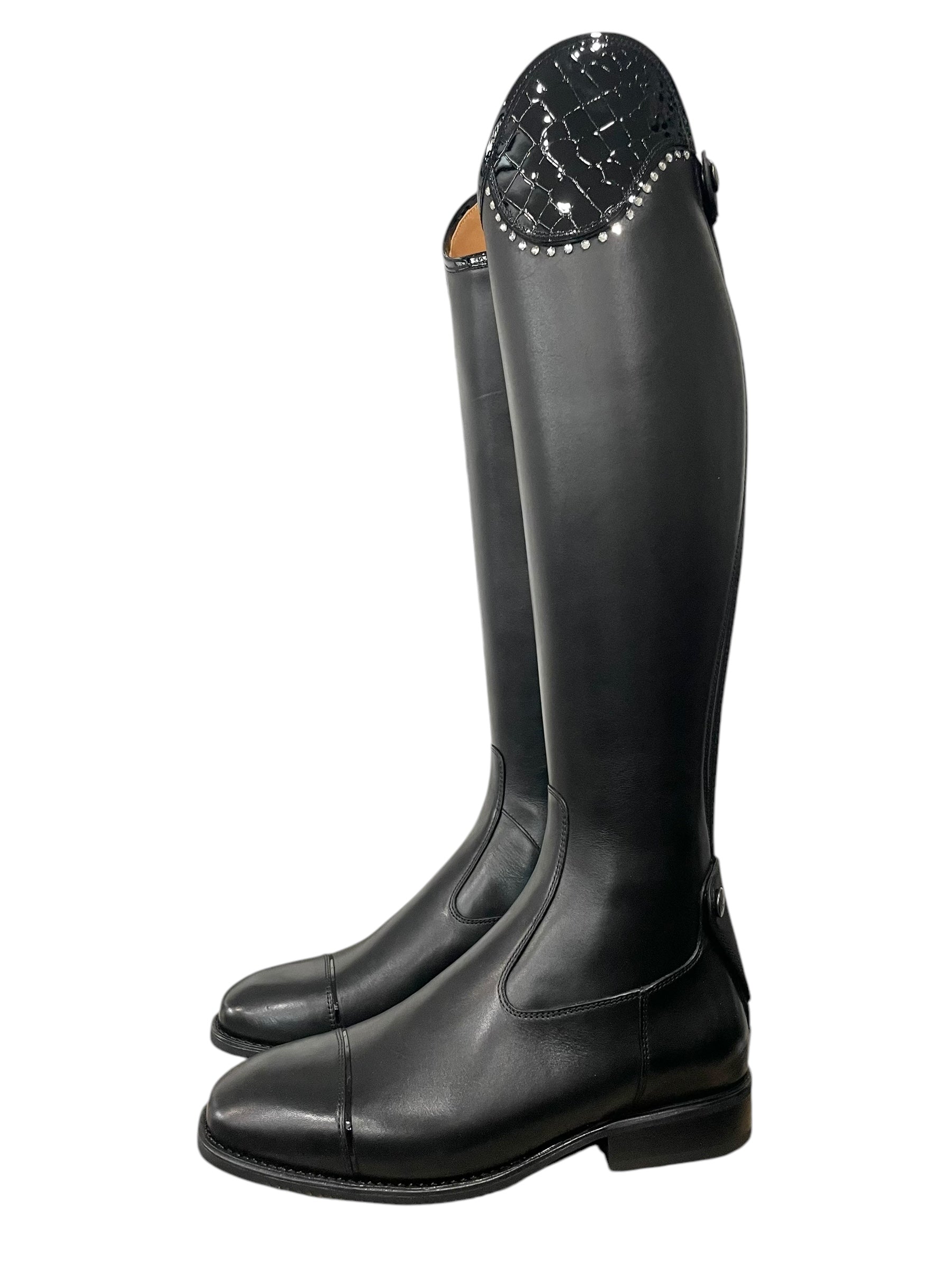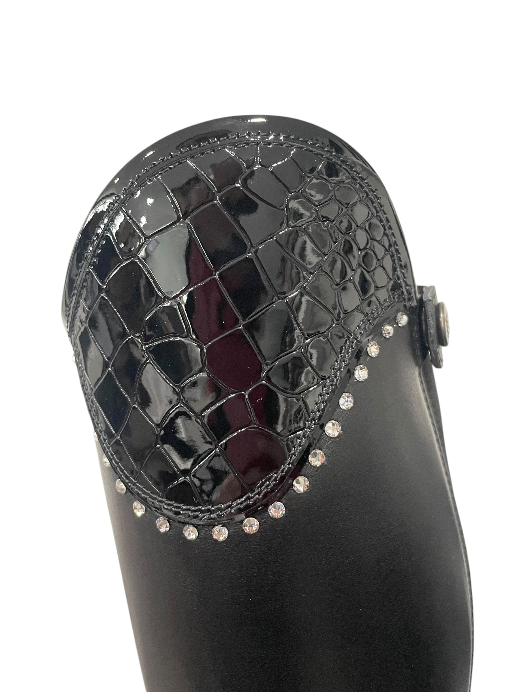 Description: WRAT black base, Salento top in patent cocco nero with GG08 SS16 clear crystals, top and toecap piping in black patent, and black outsole.
