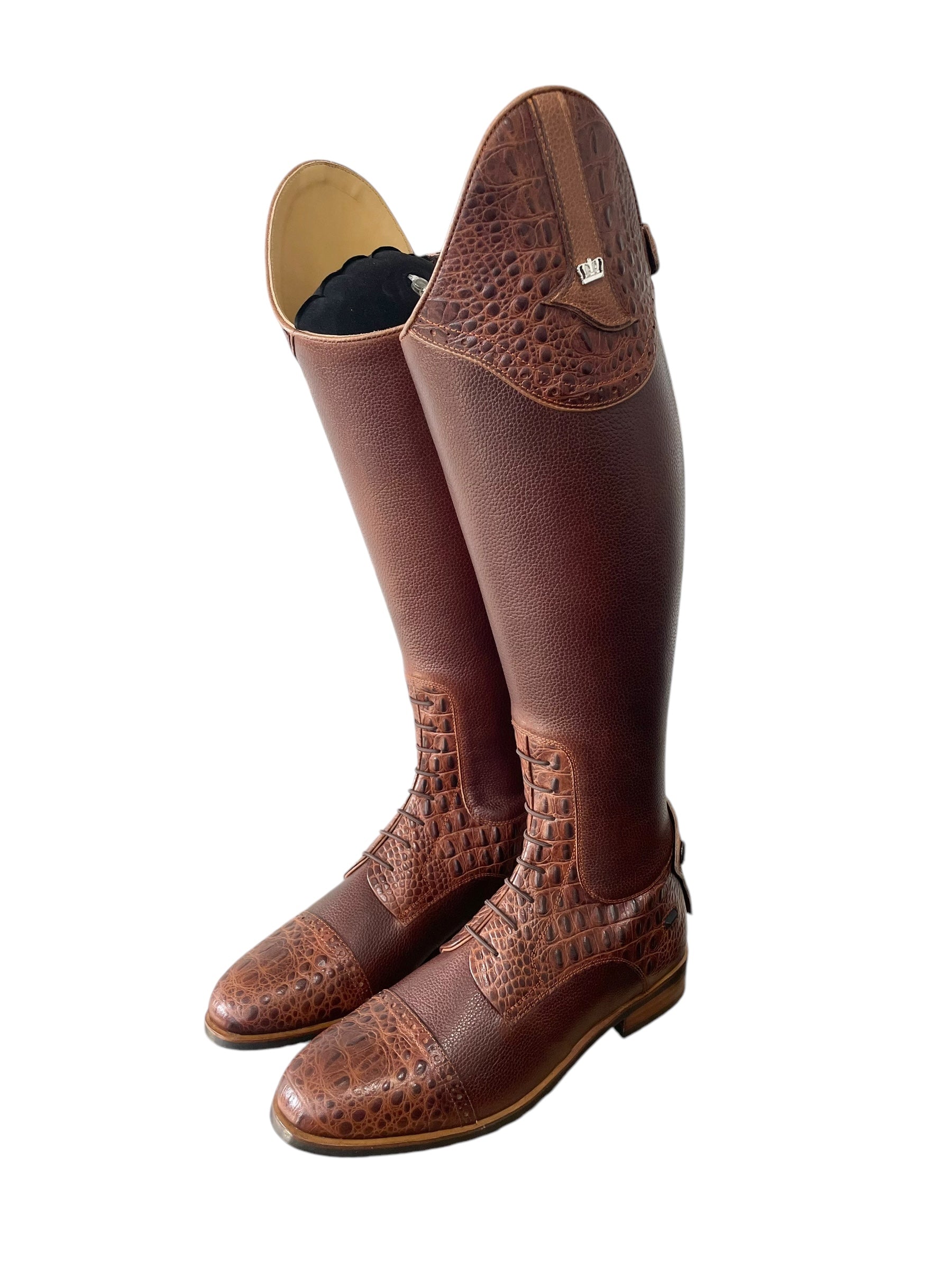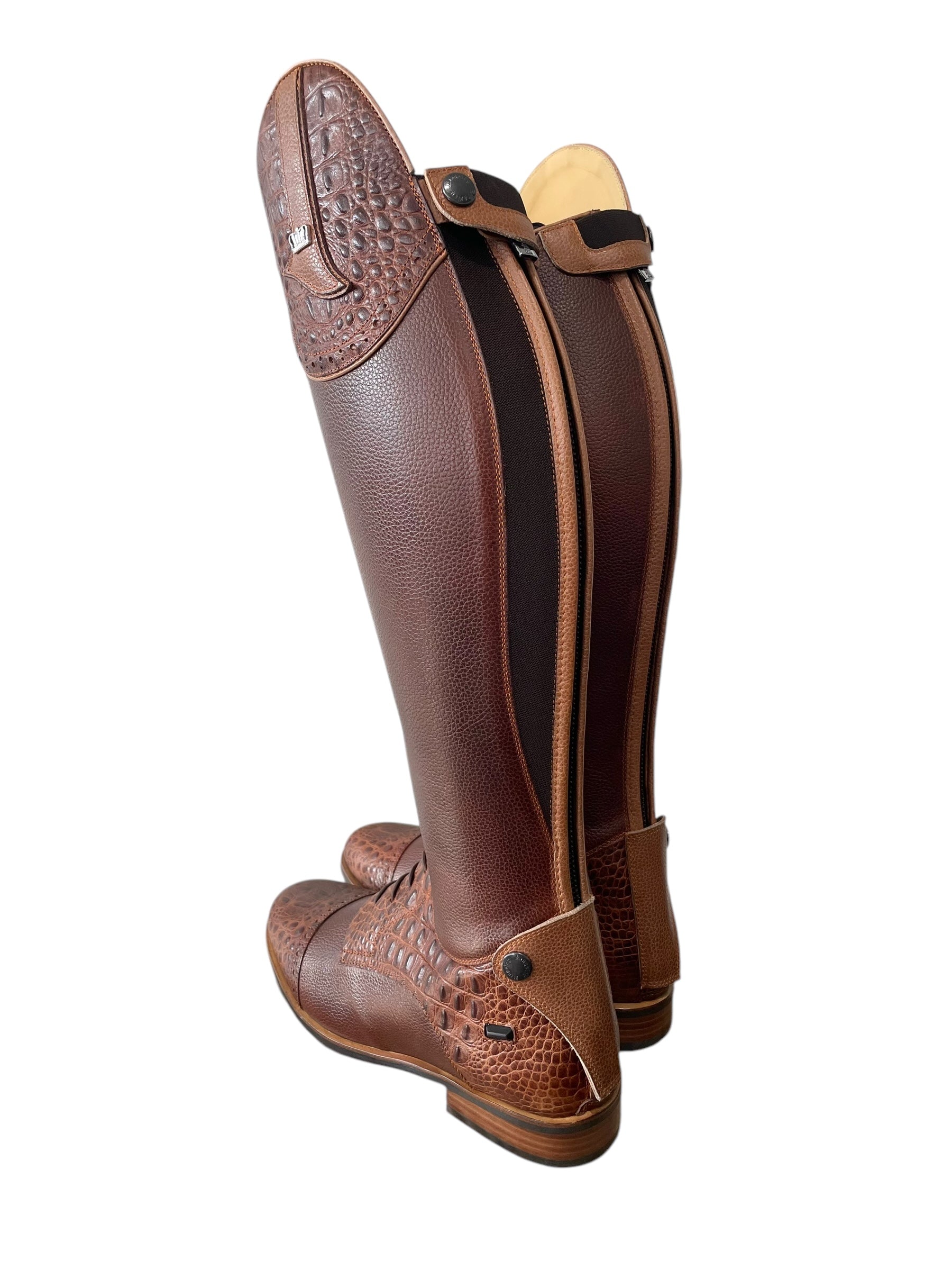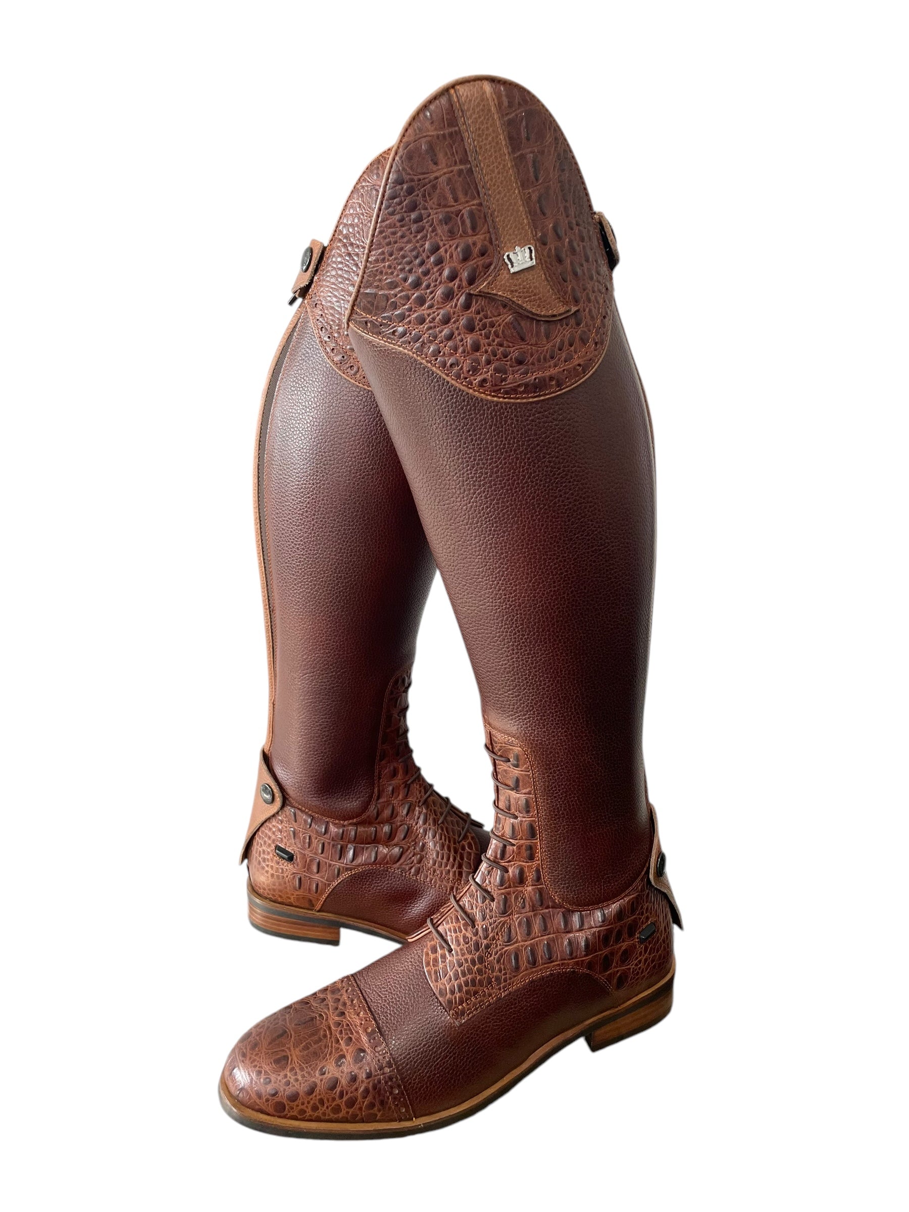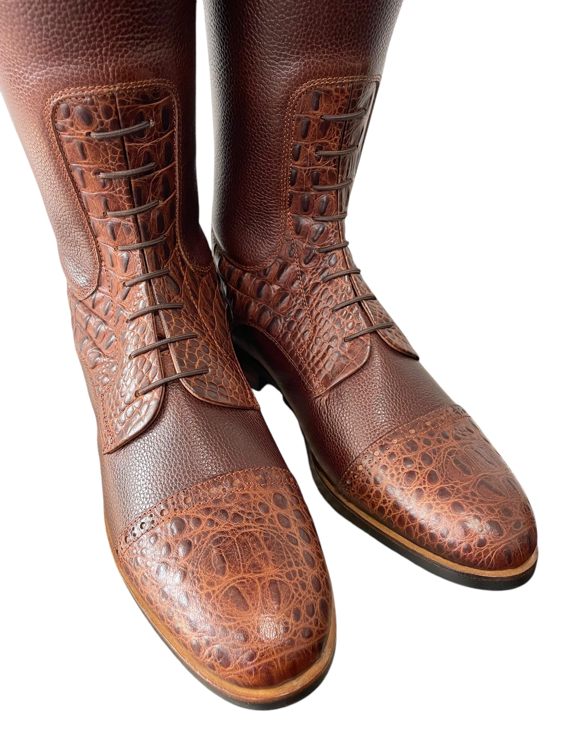 Description: Paxson chestnut base, Anna 2 top in alligator brown with paxson camel piping and sidestrap, alligator brown toecap with brogues and paxson camel piping, alligator brown quarter with dark brown laces, brown elastic along the shaft, paxson camel zip protectors, camel stitching, silver logo crown, and brown outsole.
