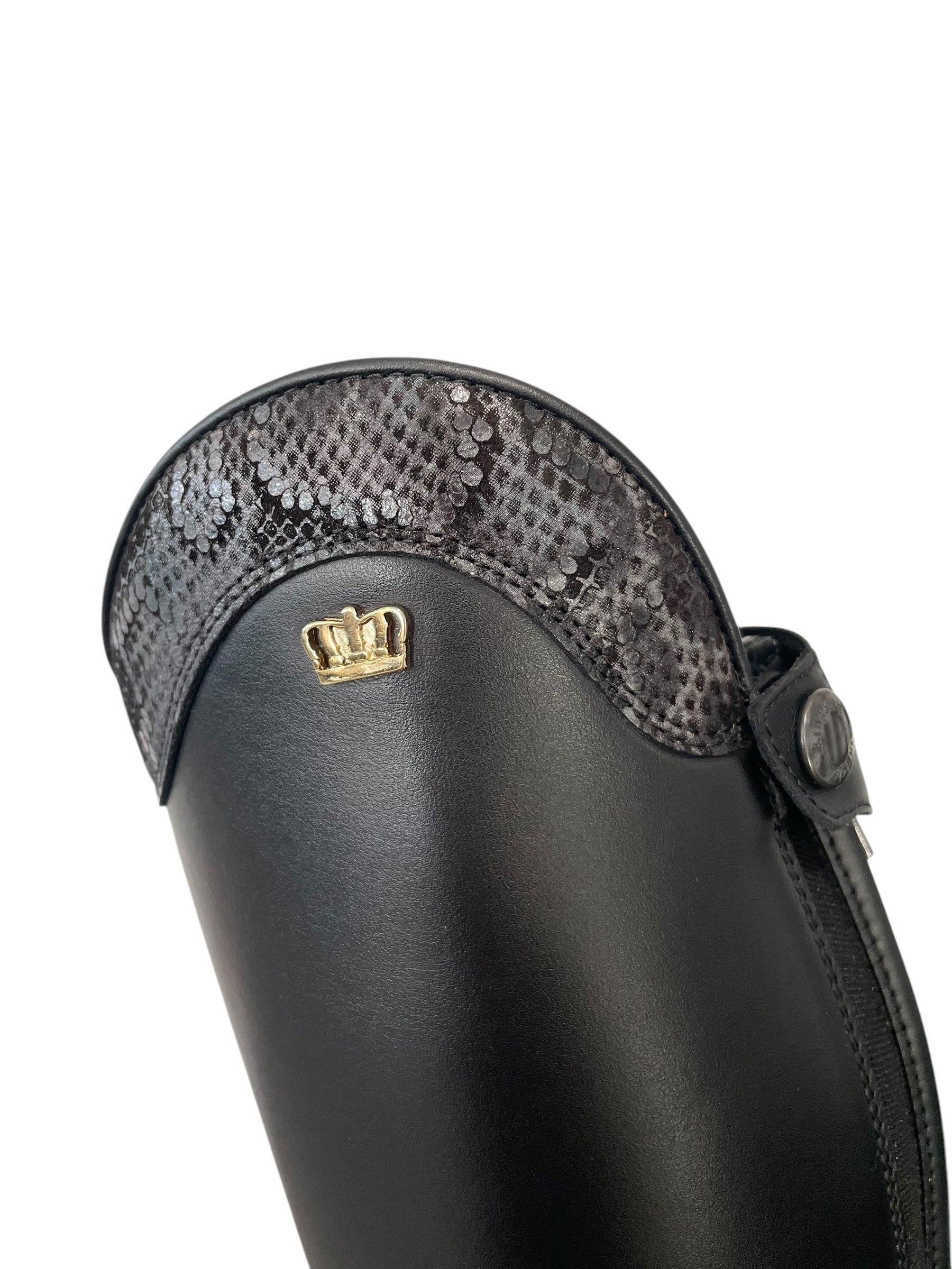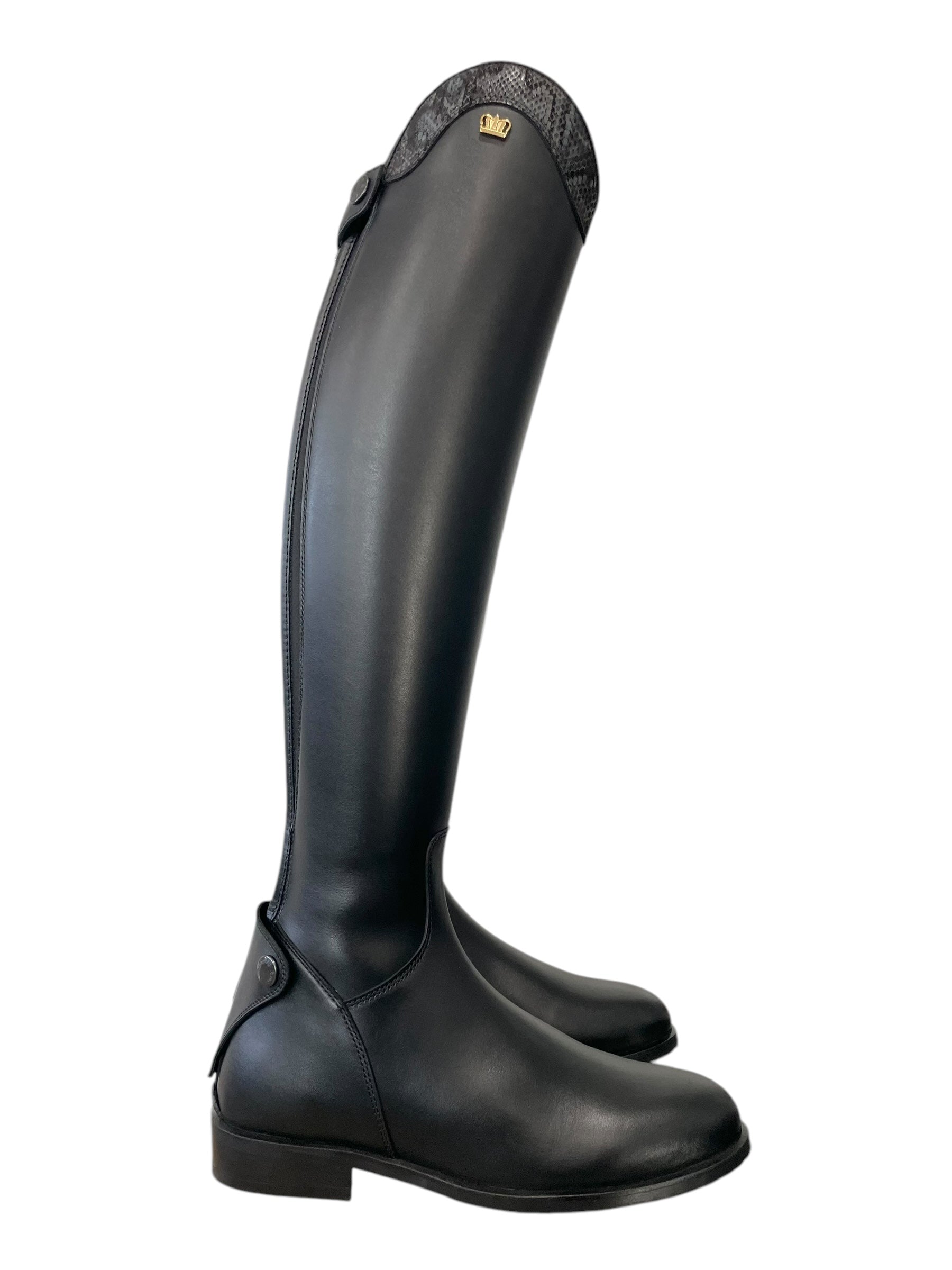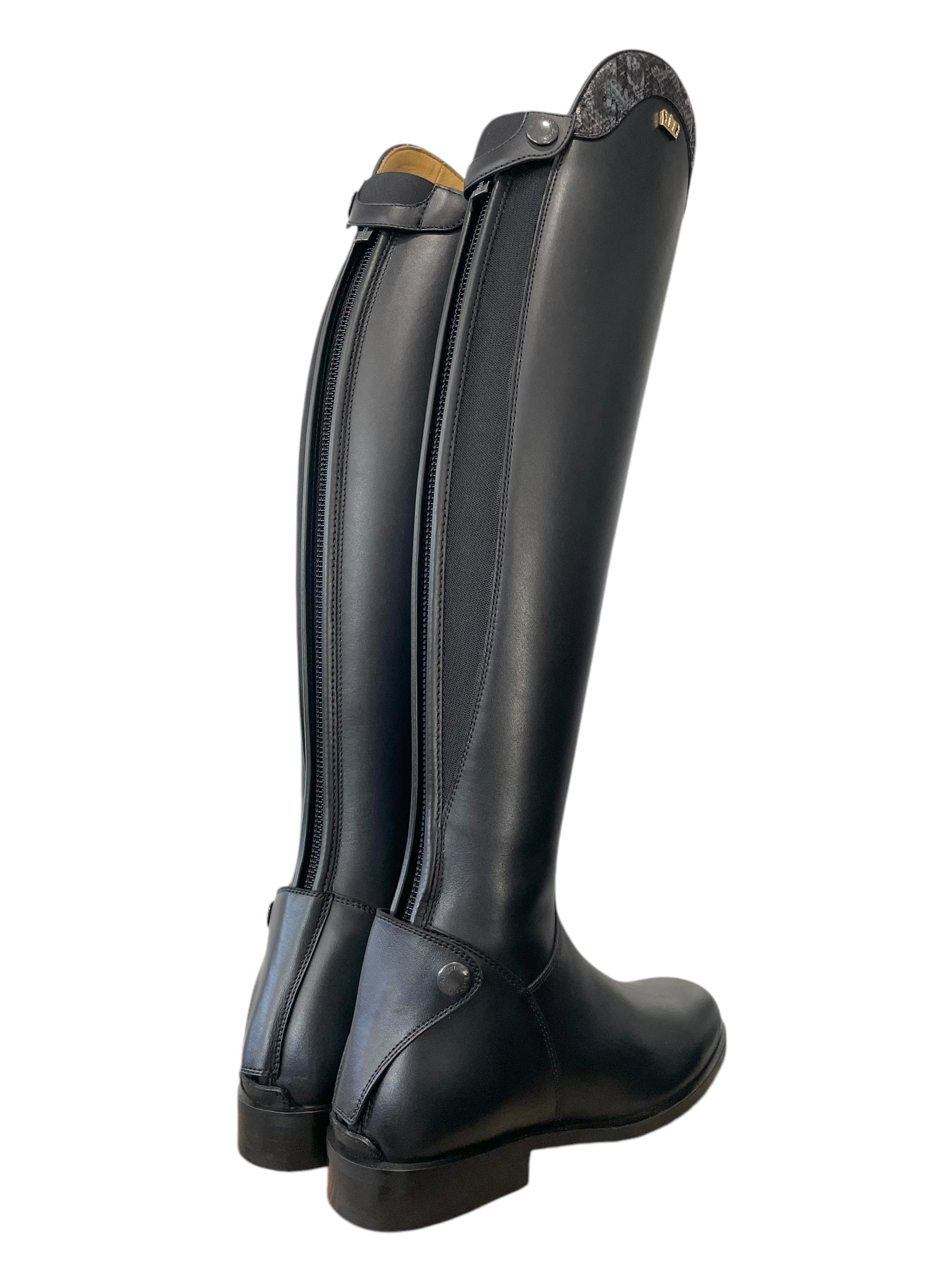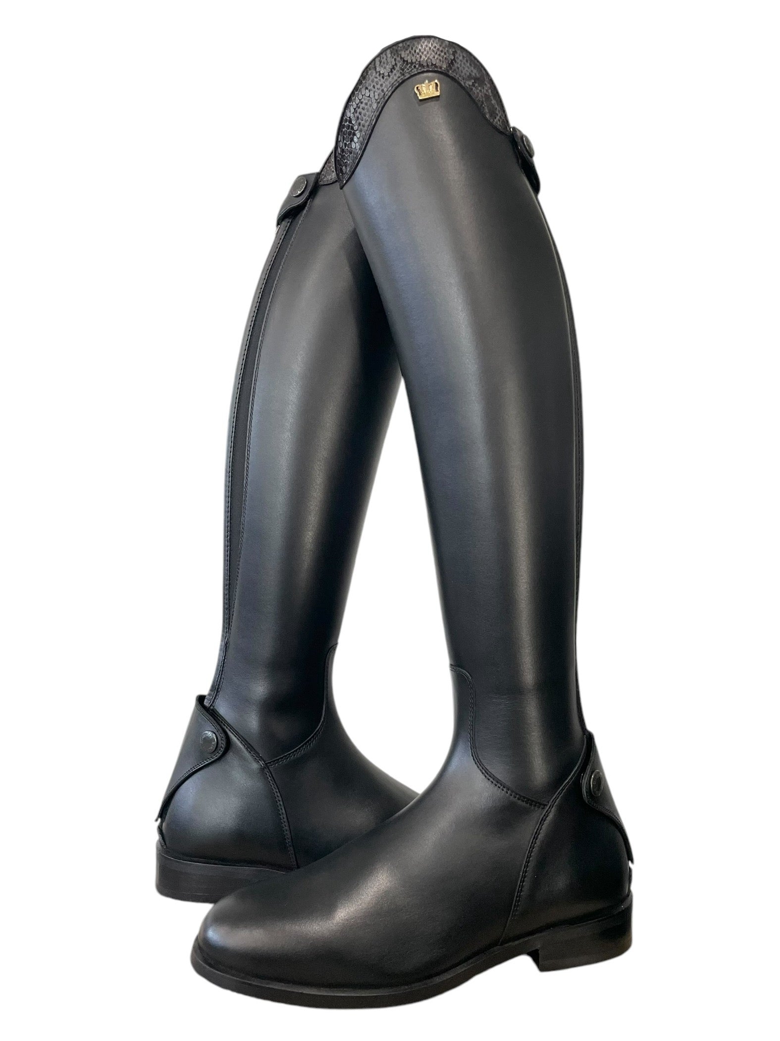 Description: Aspen black base, Libra top in boa blue, black elastic, gold logo crown, and black outsole.
