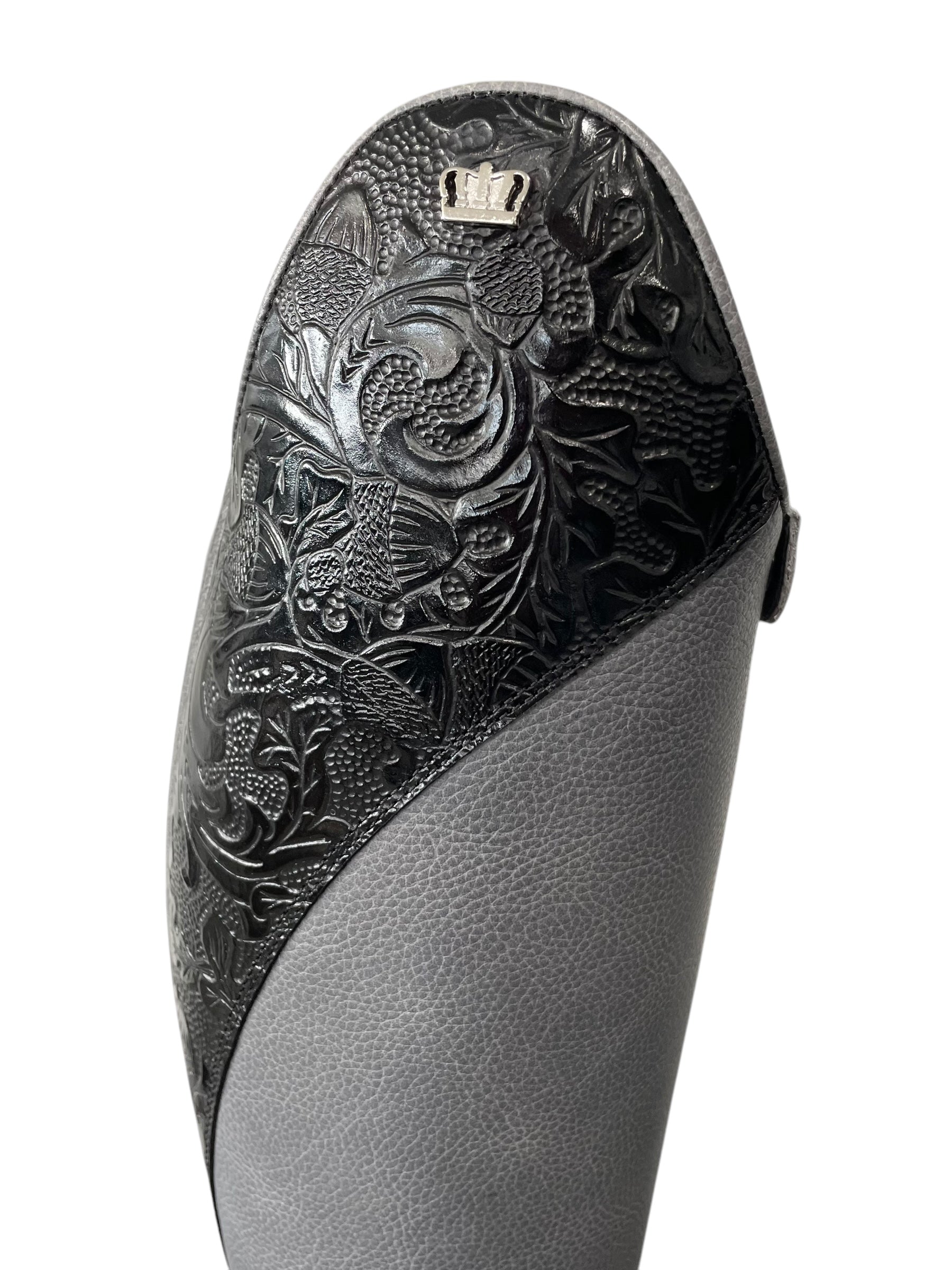 Description: Paxson grey base, Paula top in oak black, black elastic along the zipper, silver logo crown, and black Denver sole.