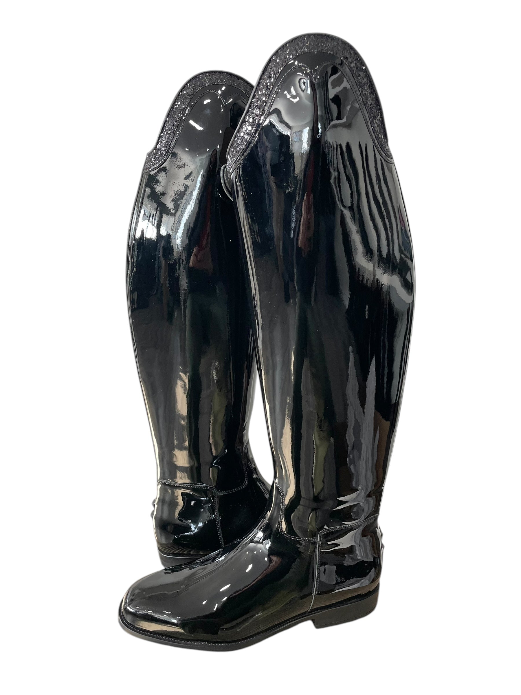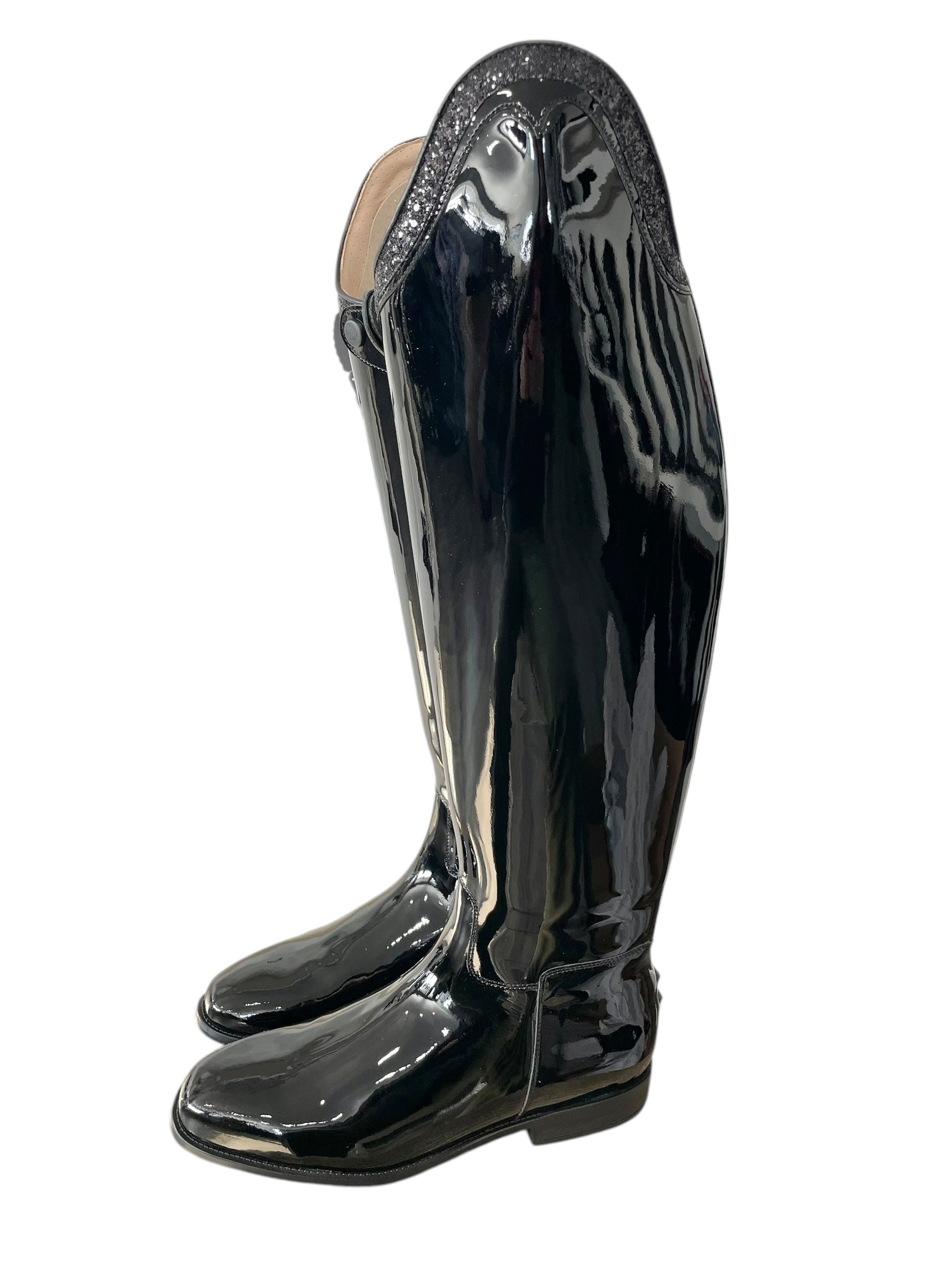 Description: P5 patent black base, T4 top in P38 black glitter and P5 black patent, SR1 spur rests, and S3 outsole.