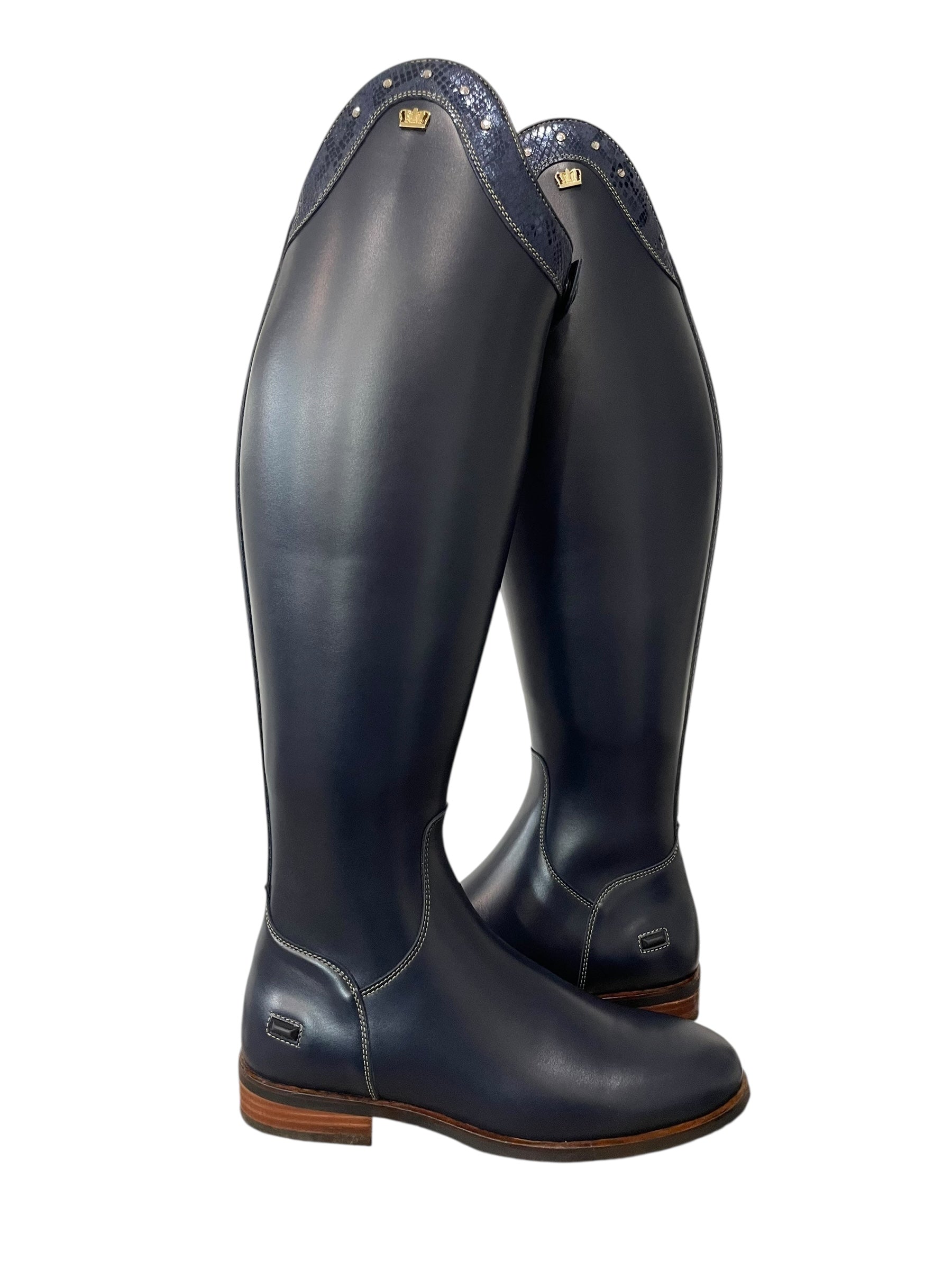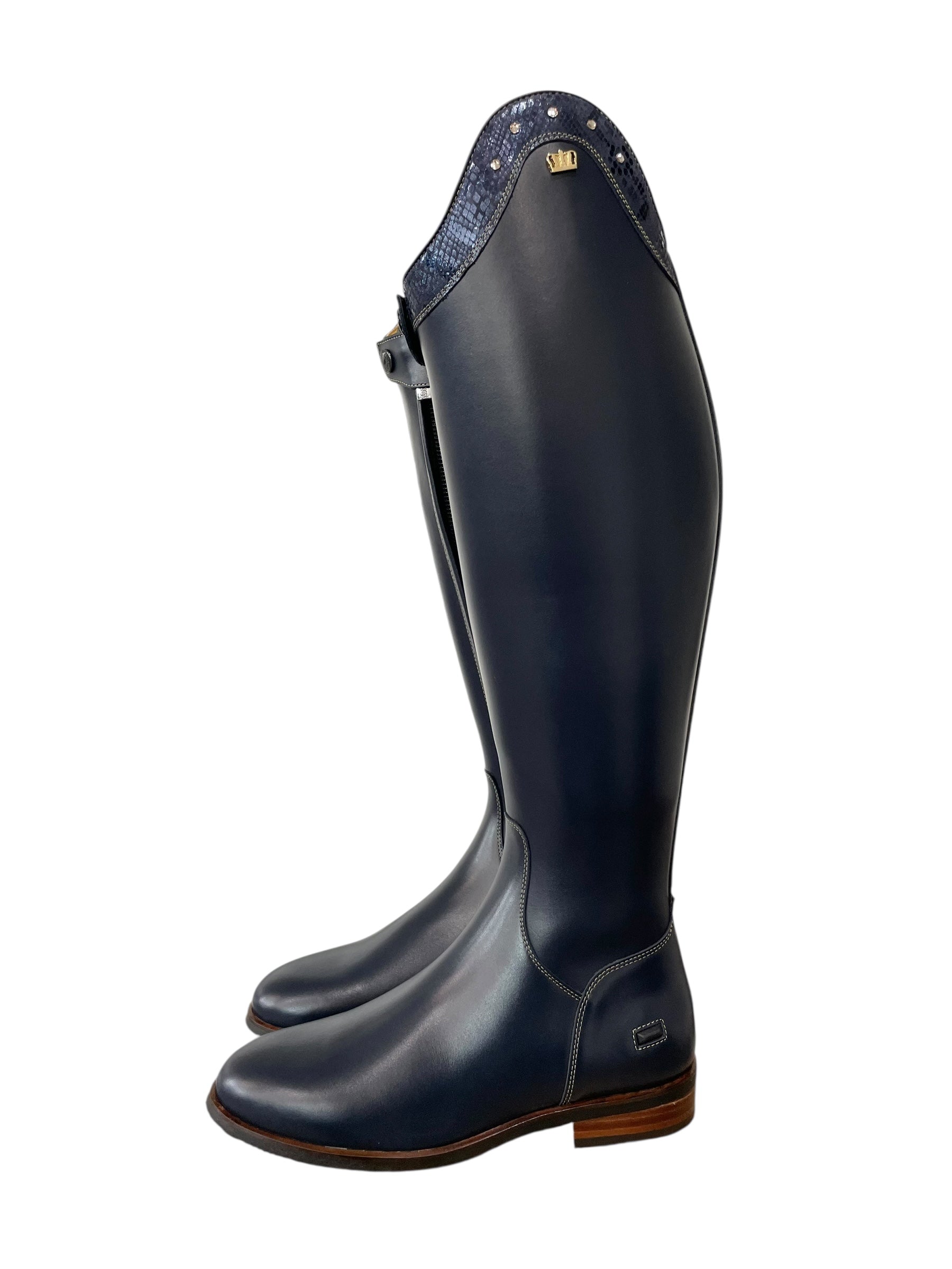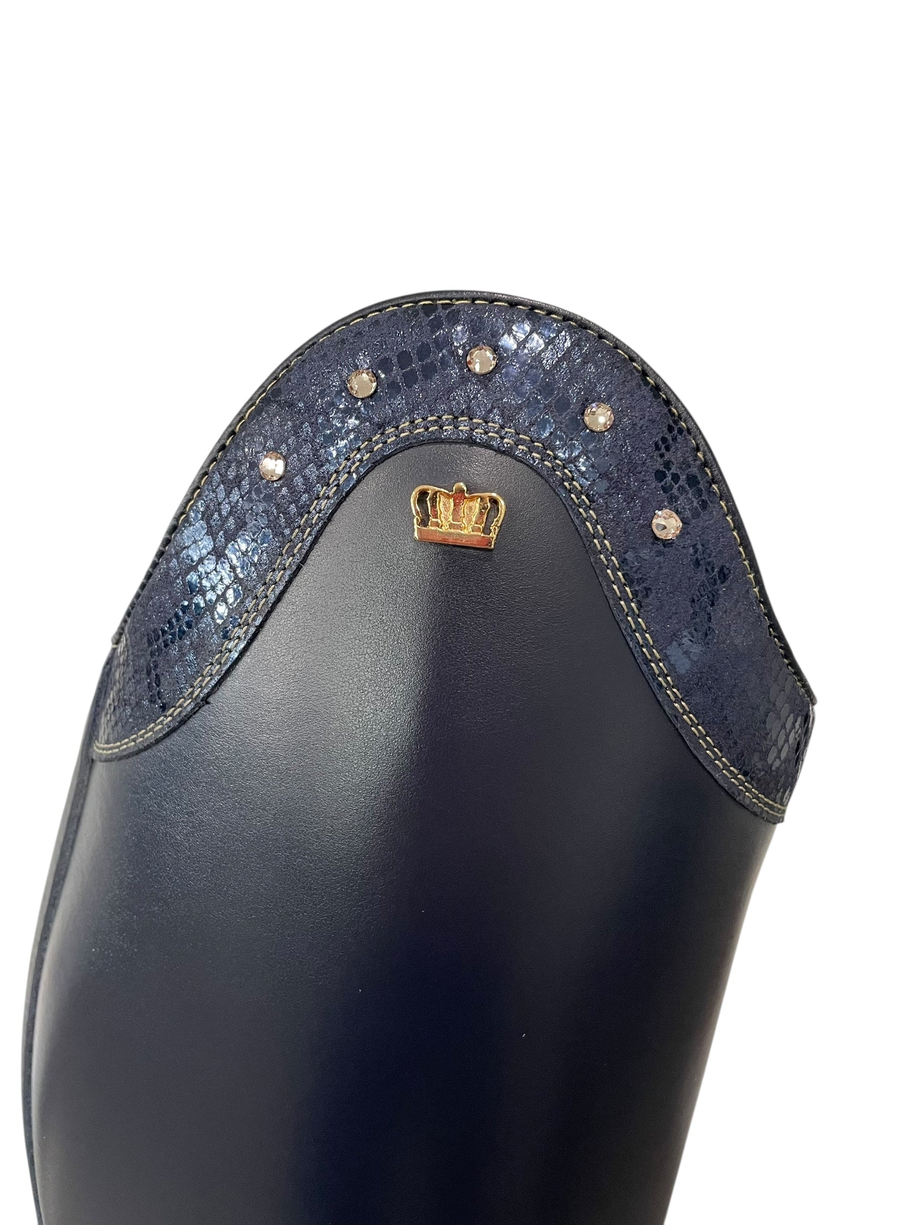 Description: Aspen blue base, Jenny top in blue scales with champagne Swarovski crystals, sand stitching, gold logo crown, and brown outsole.