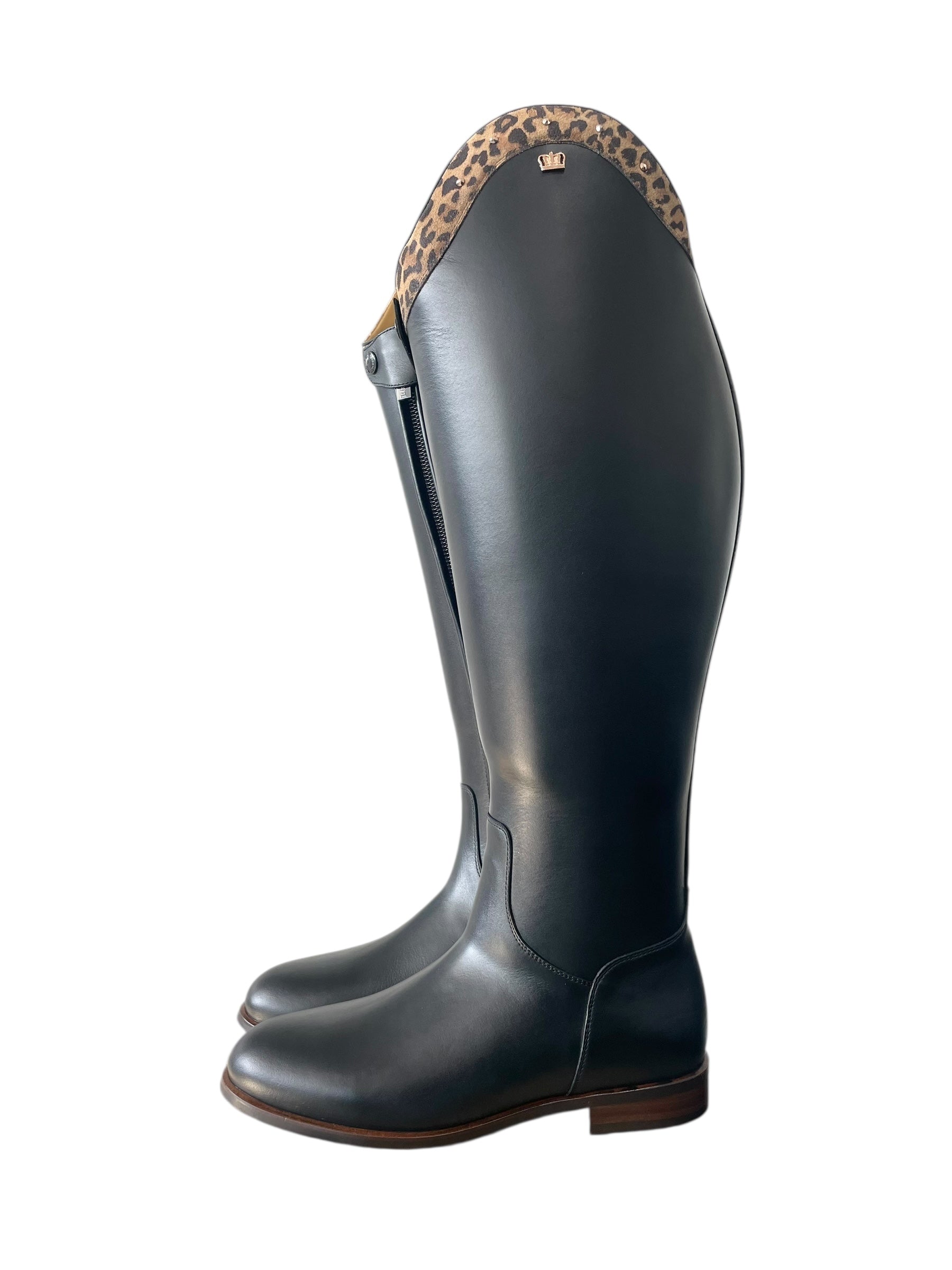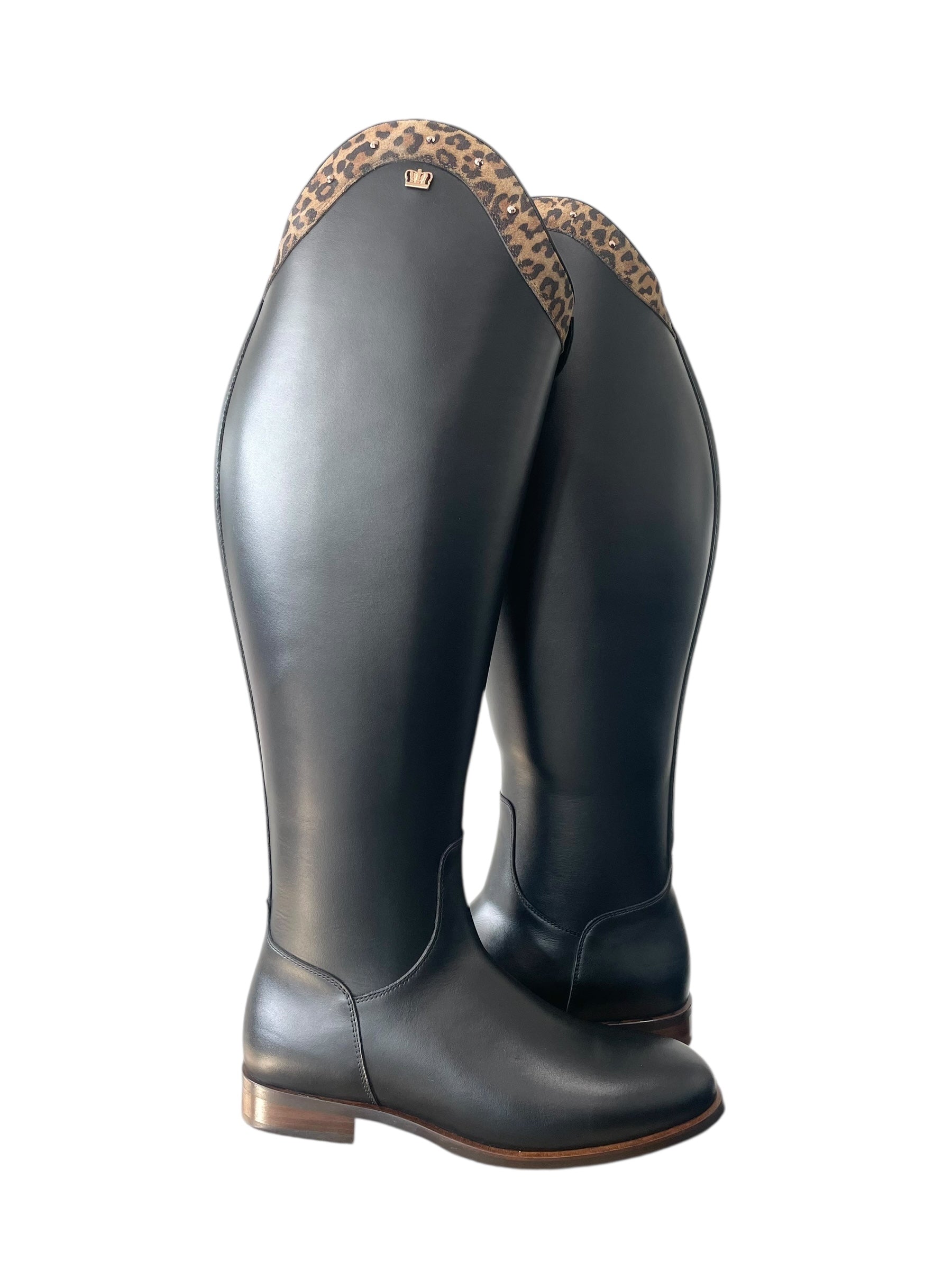 Description: Aspen black base, Jenny top in jaguar with rose gold Swarovski crystals, rose gold logo, and brown sole.