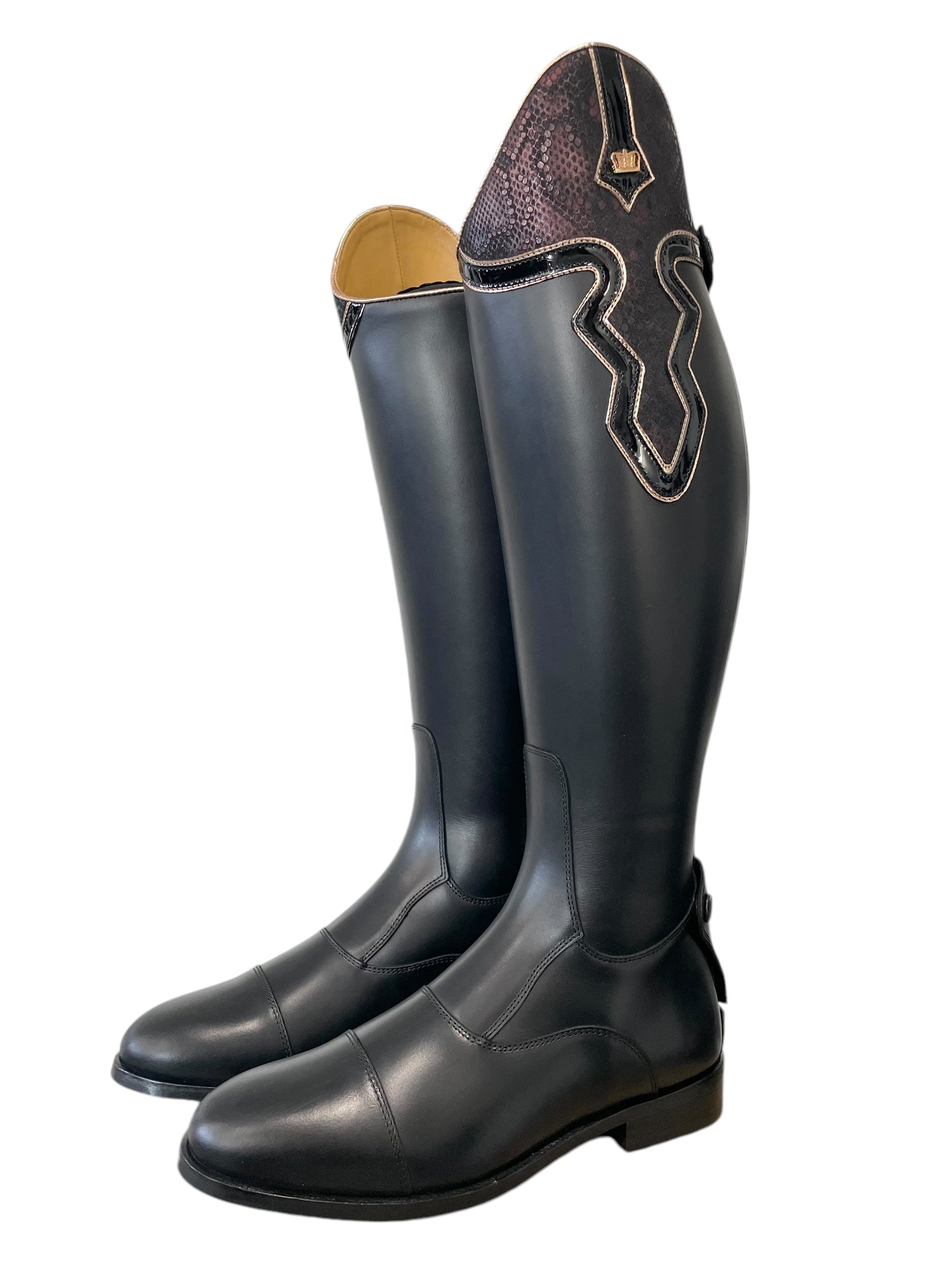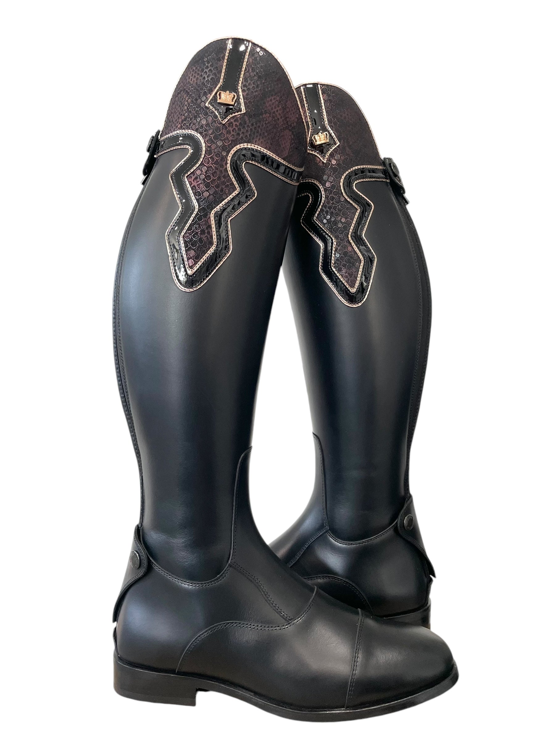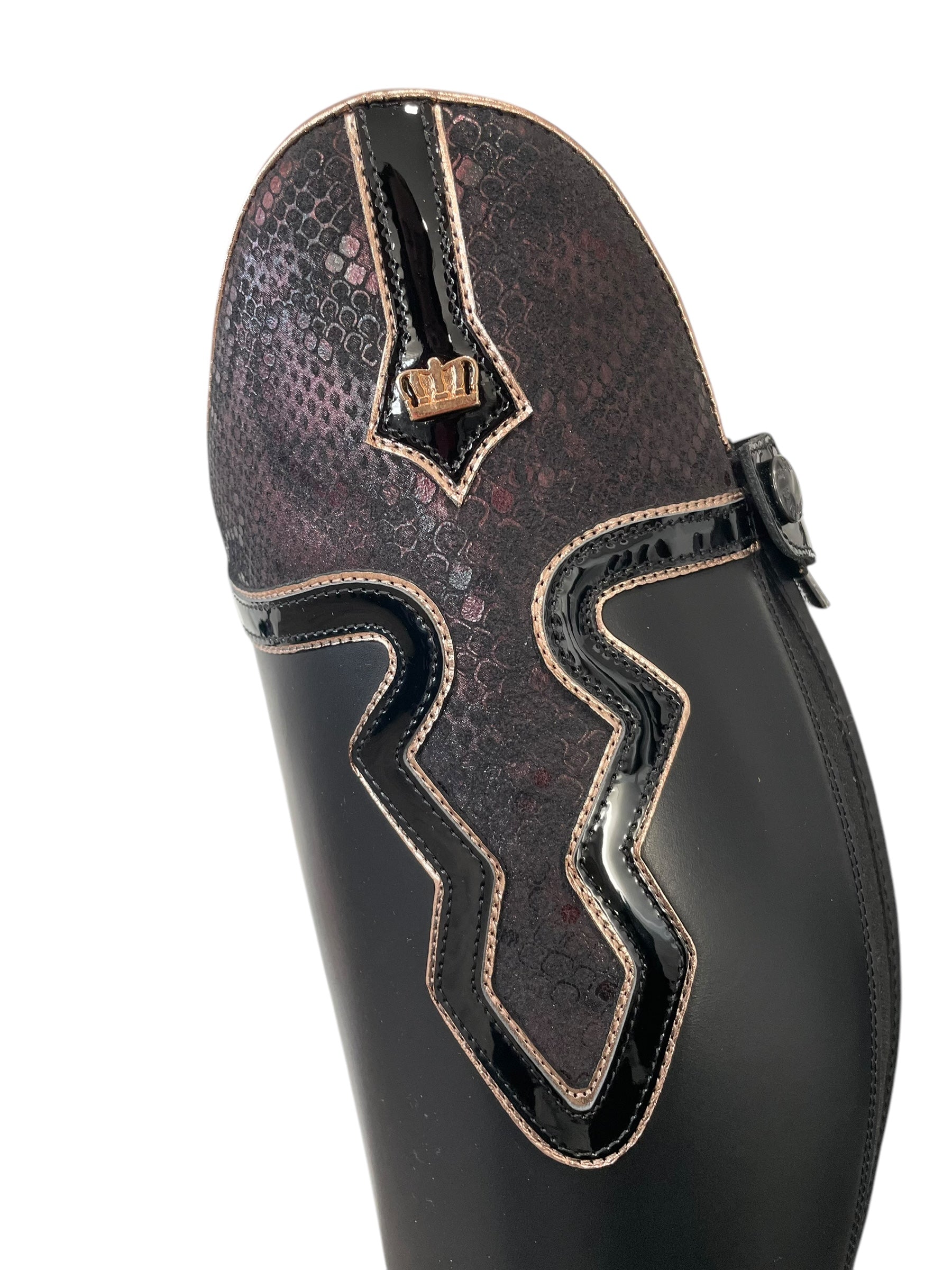 Description: Nature black base, black elastic along the back, Britt top in boa fuchsia with roma black framing and sidestrap plus shiny rose piping, rose gold logo crown, and black outsole.