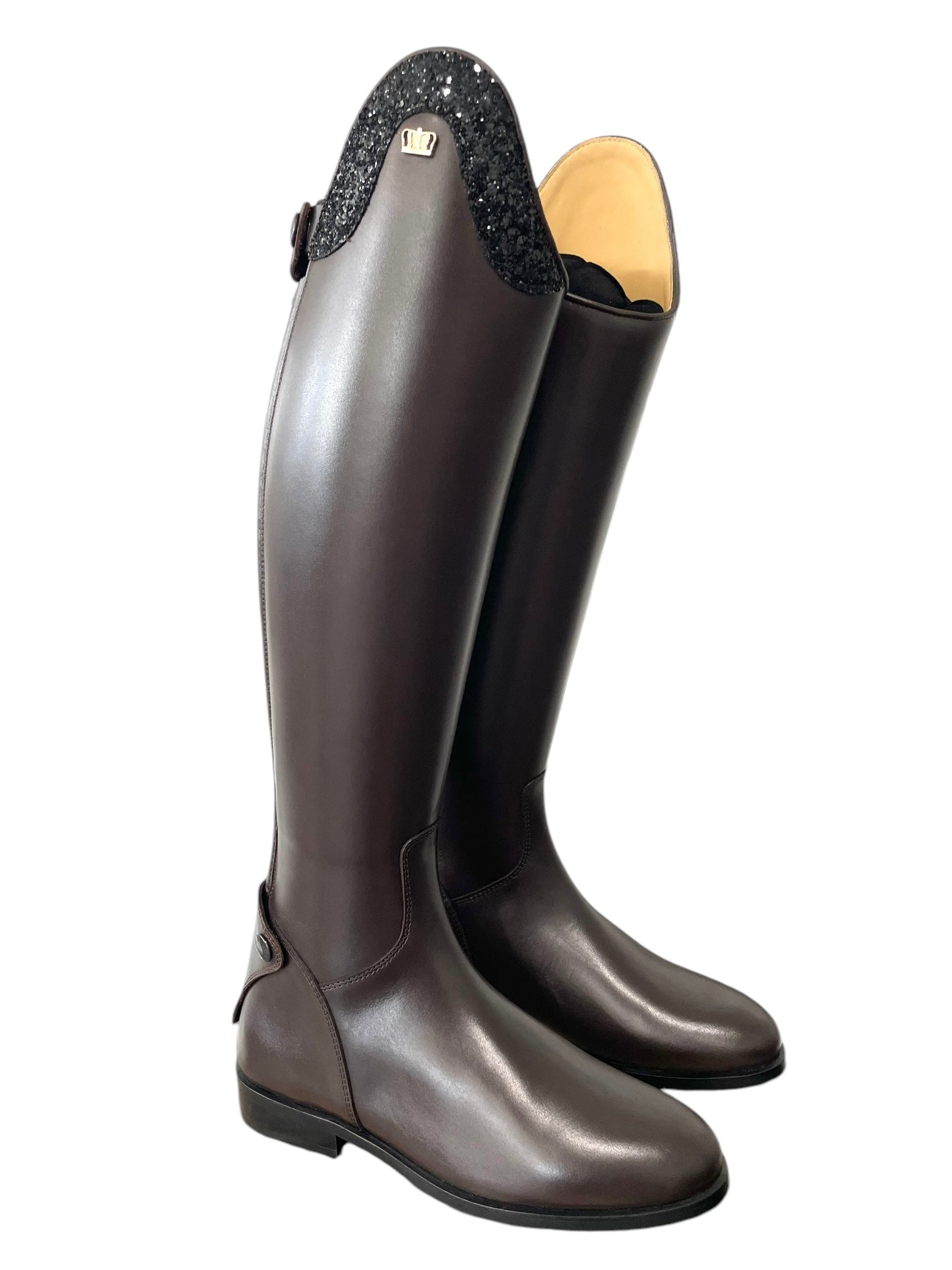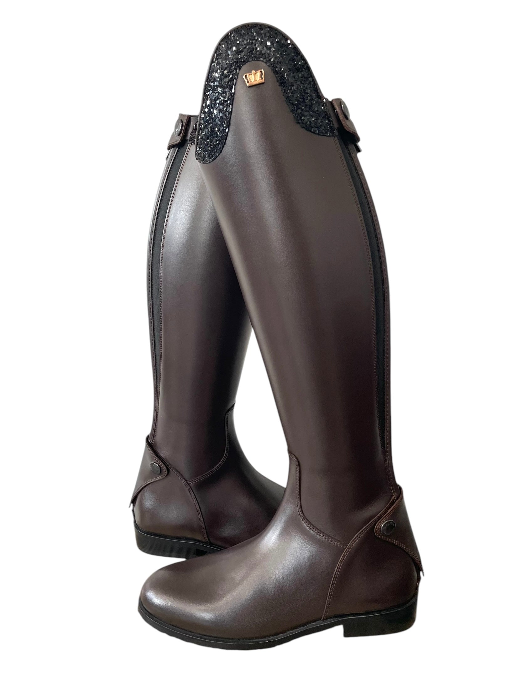 Description: Aspen dark brown base, black elastic along the shaft, Libra top in grueso black, rose gold logo crown, and black outsole.
