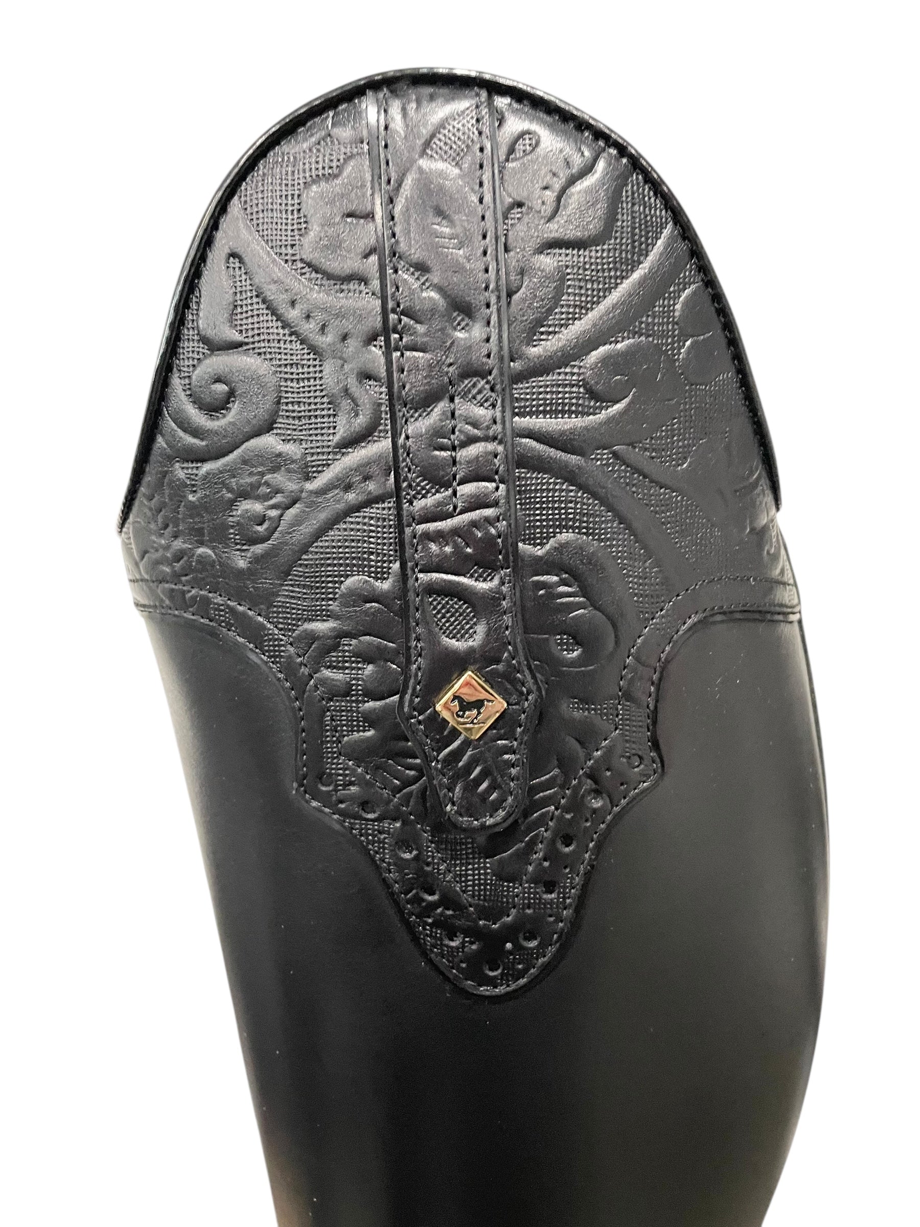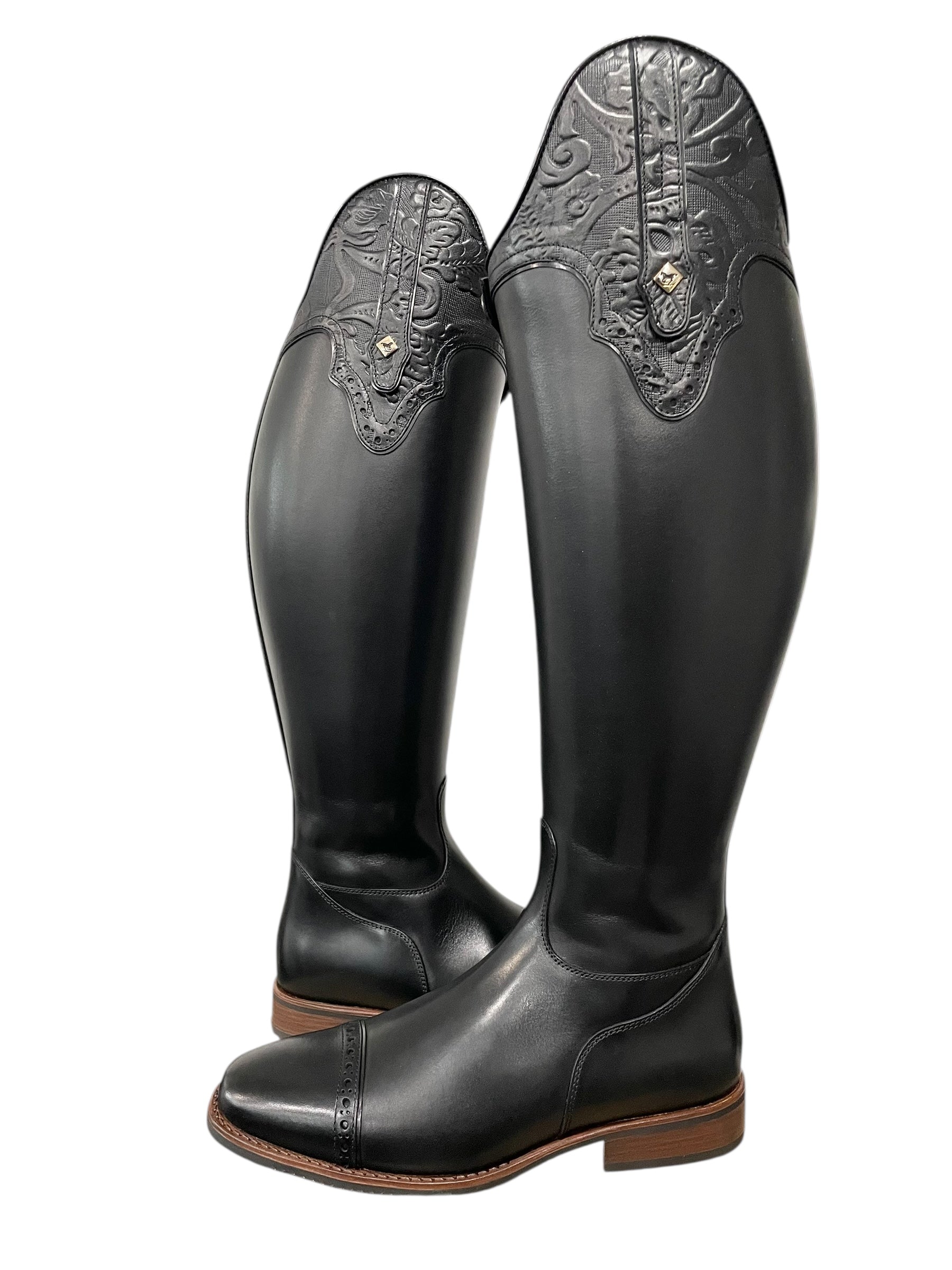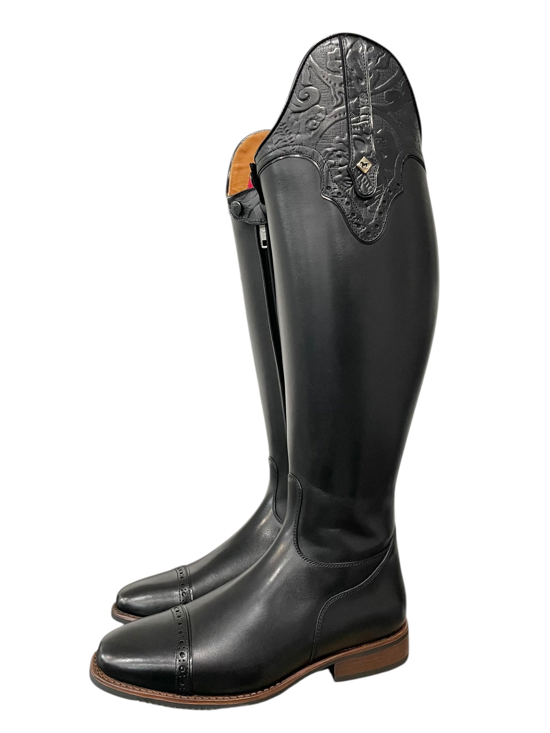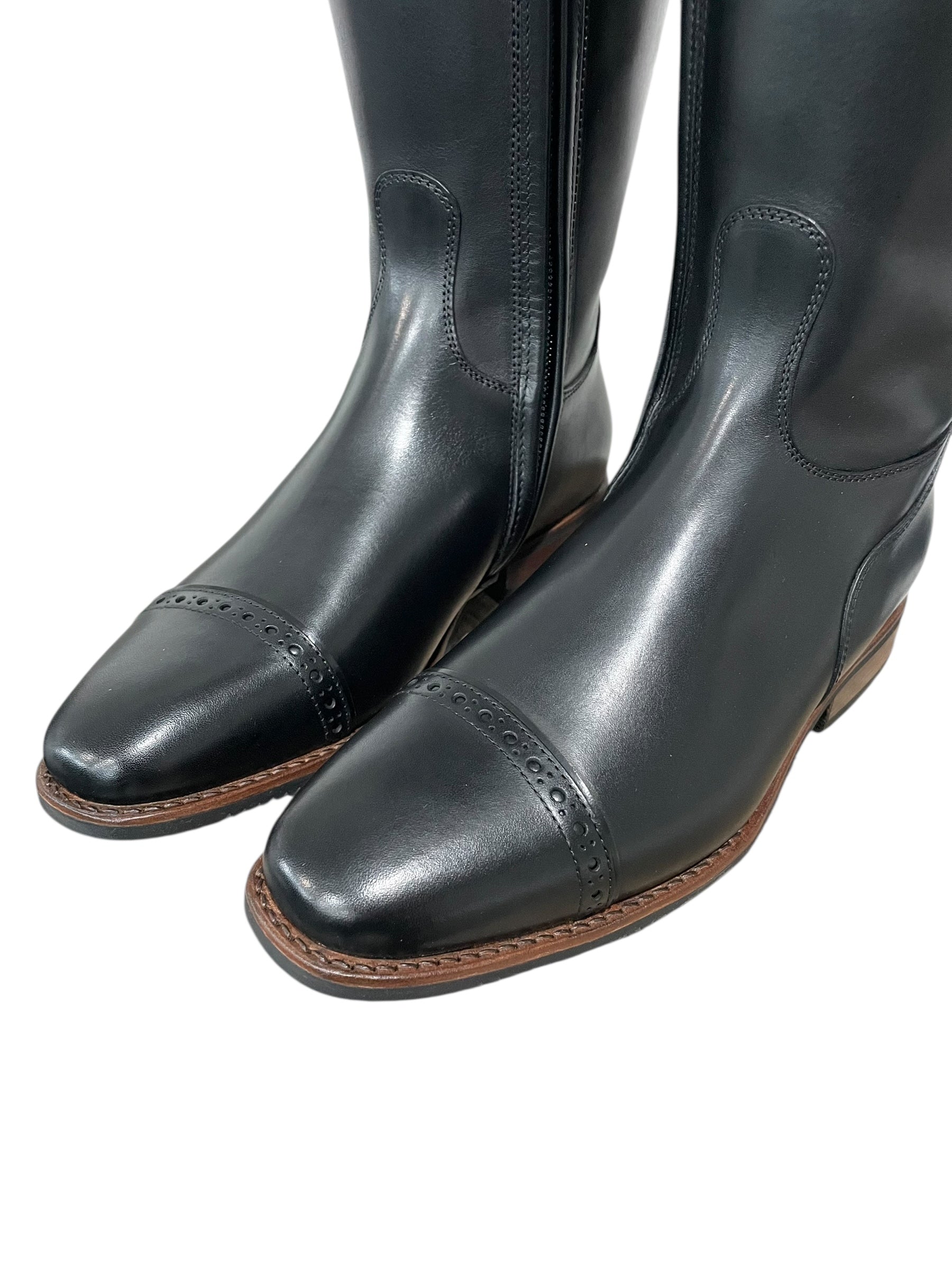 Description: WRAT black base, G5 America top in EMS nero with tab and holes Tomasso, brushed black top piping, E5 toecap with holes Tomasso and brushed black piping, gold logo, and brown outsole.