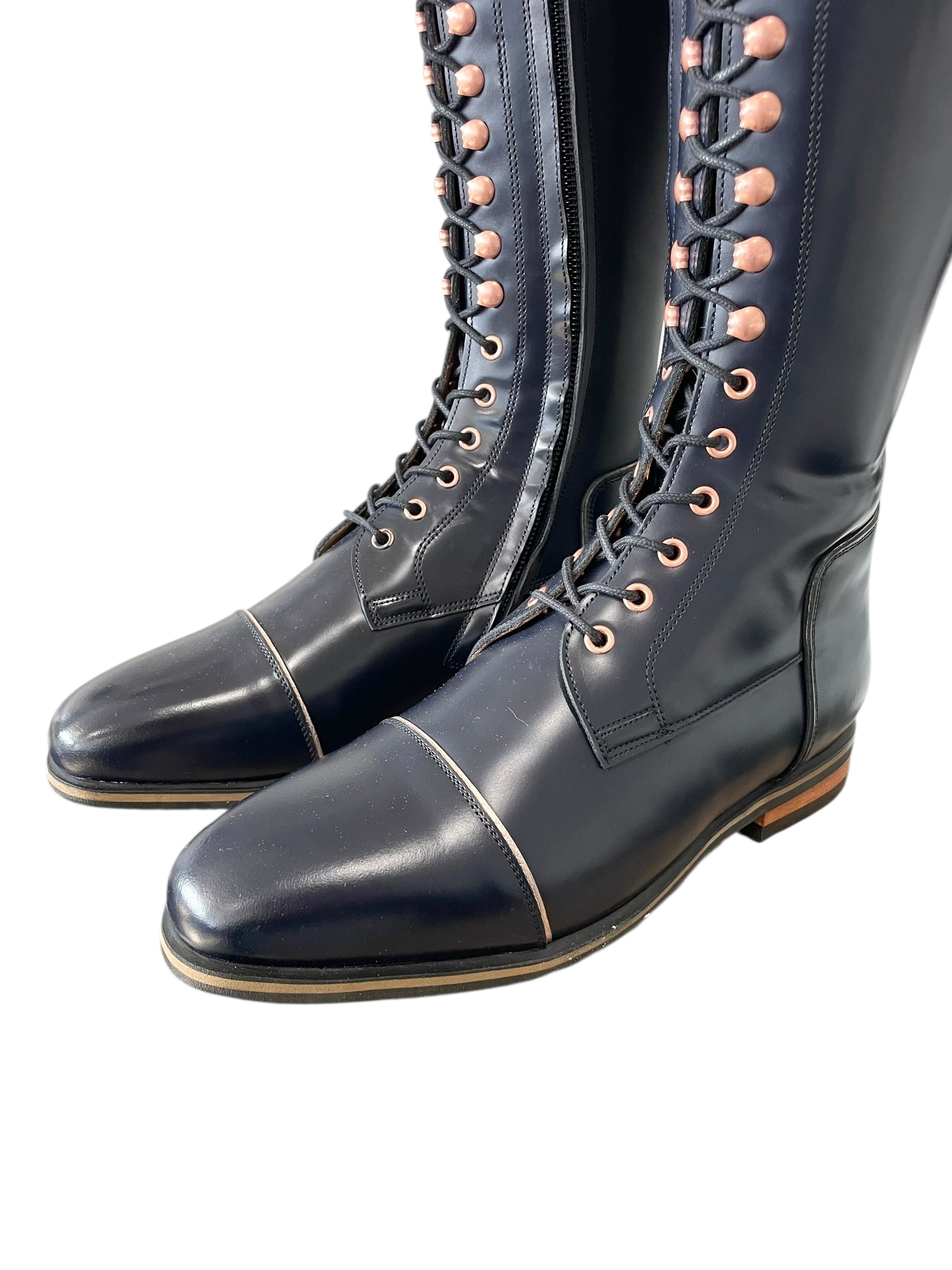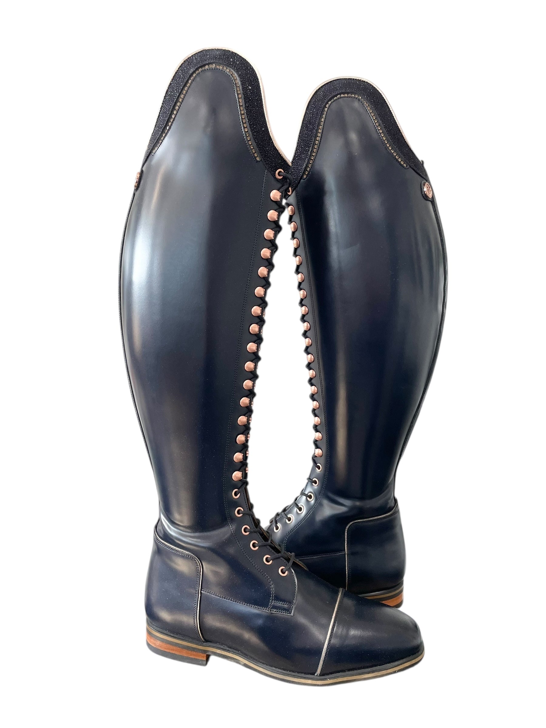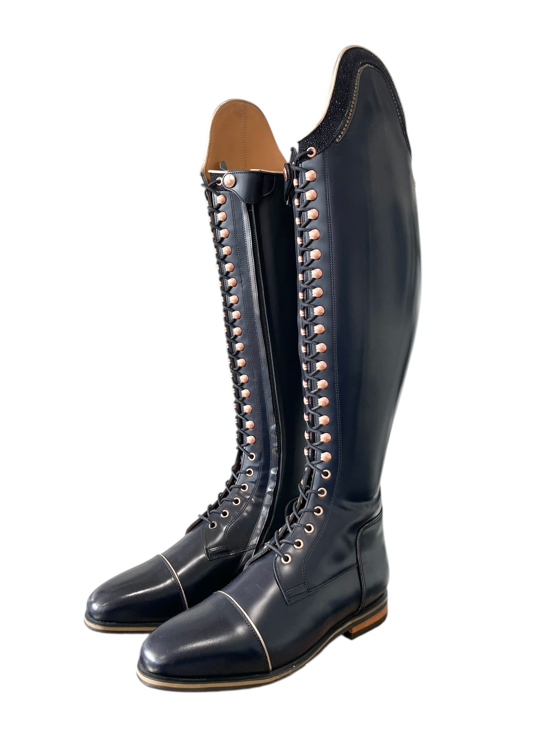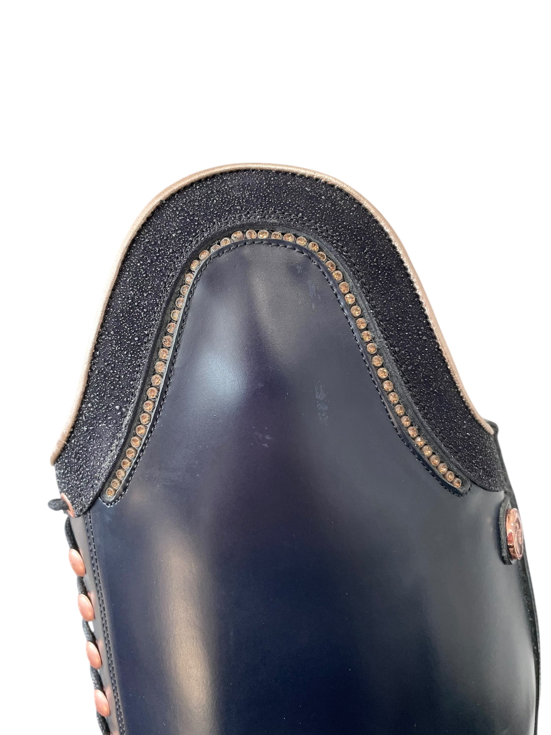 Description: Hand-polished navy blue base, Top Style #2 in midnight blue shimmer with rose gold crystals and textured true rose gold piping, back stripe with rose gold crystals, toecap and heel piping in textured true rose gold, rose gold hooks with navy laces, rose gold logo, and brown sole.