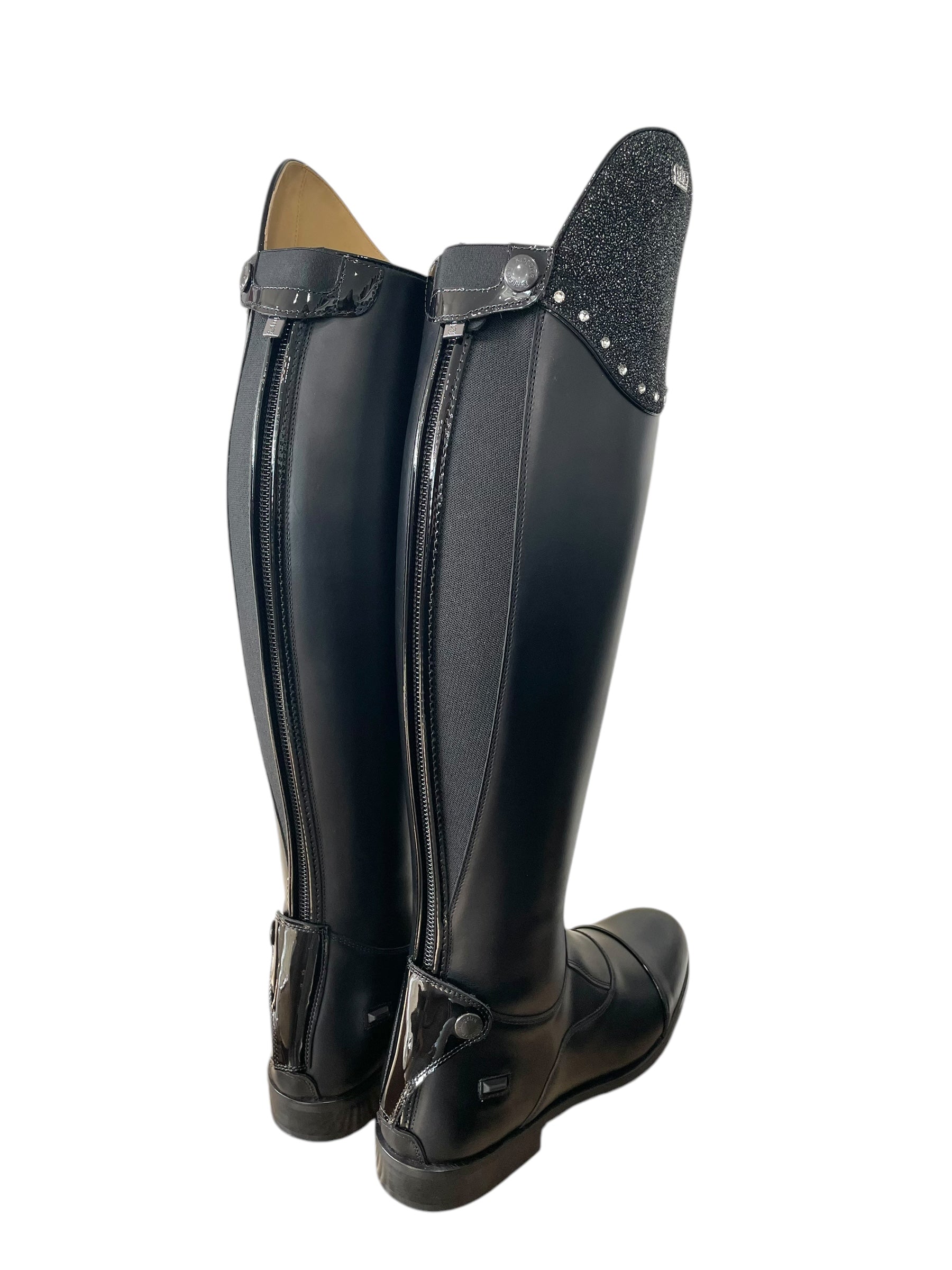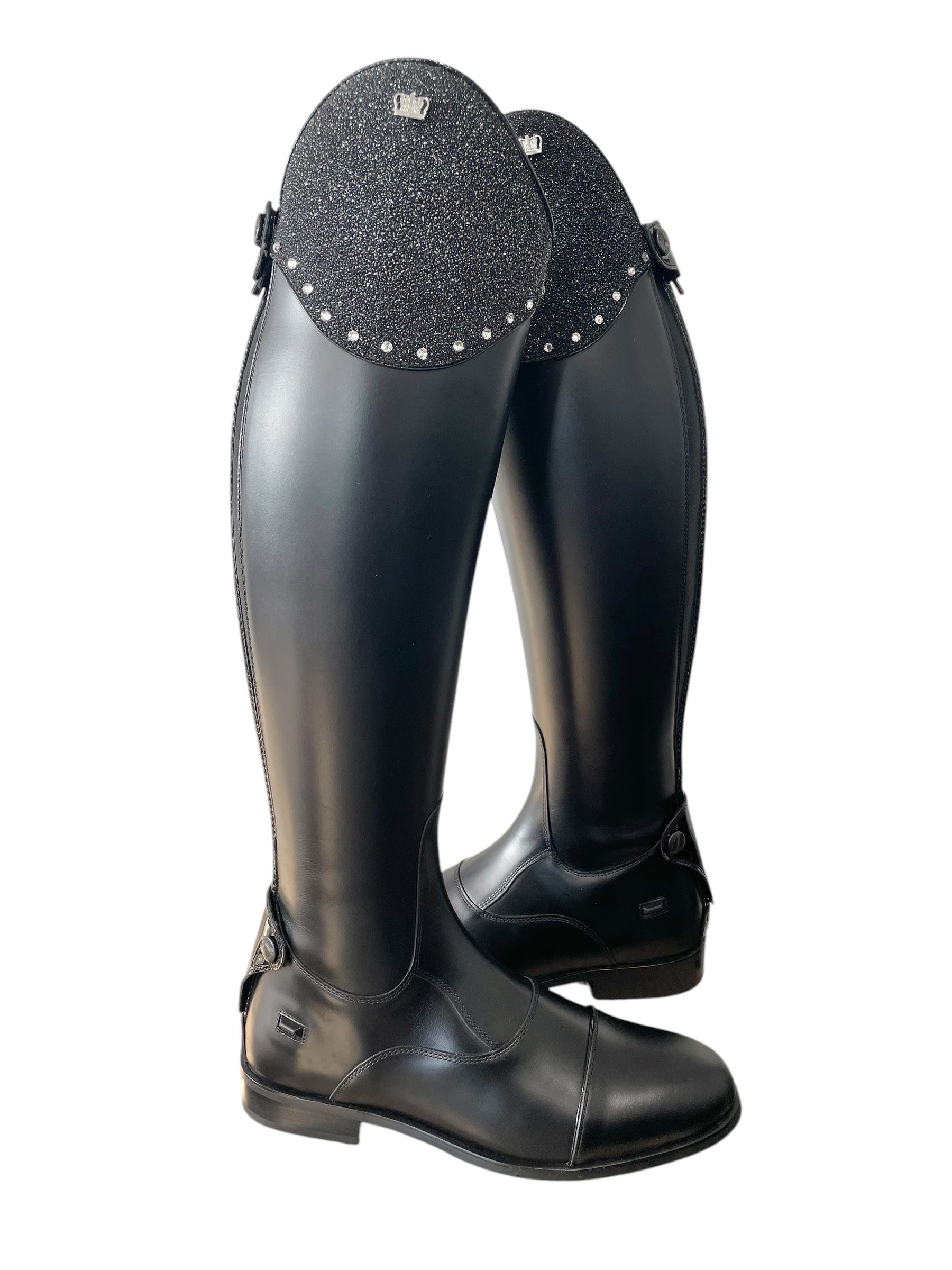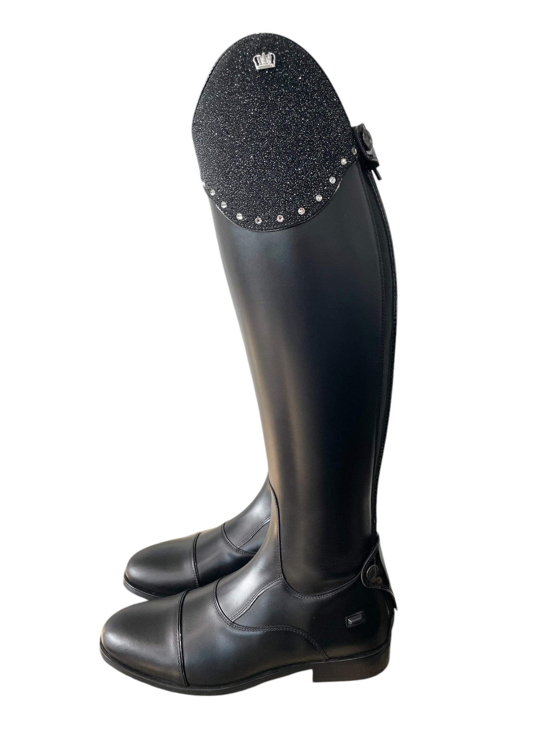 Description: Nature black base, Anna top in stardust black with roma black piping and Swarovski crystal details, toecap with roma black piping, roma black zip protectors and parts along the zipper, silver logo crown, and black outsole.
