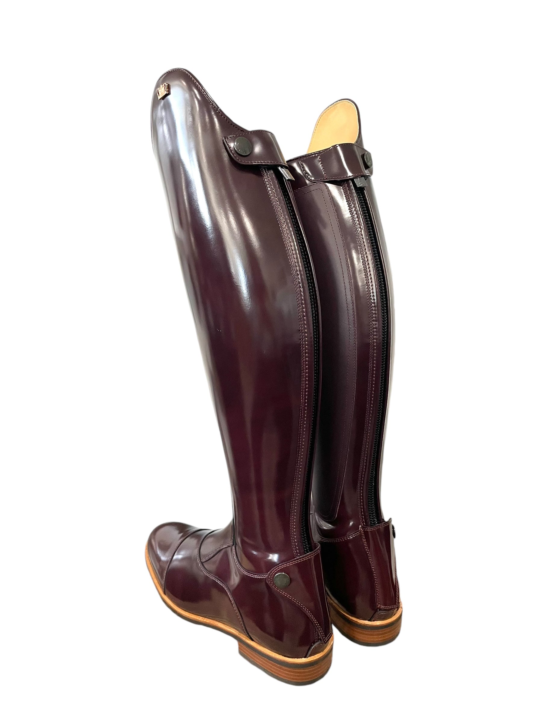 Description: Uragano bordeaux base, nature bordeaux inside patch, V gusset on inside patch, rose gold logo crown, and brown outsole.