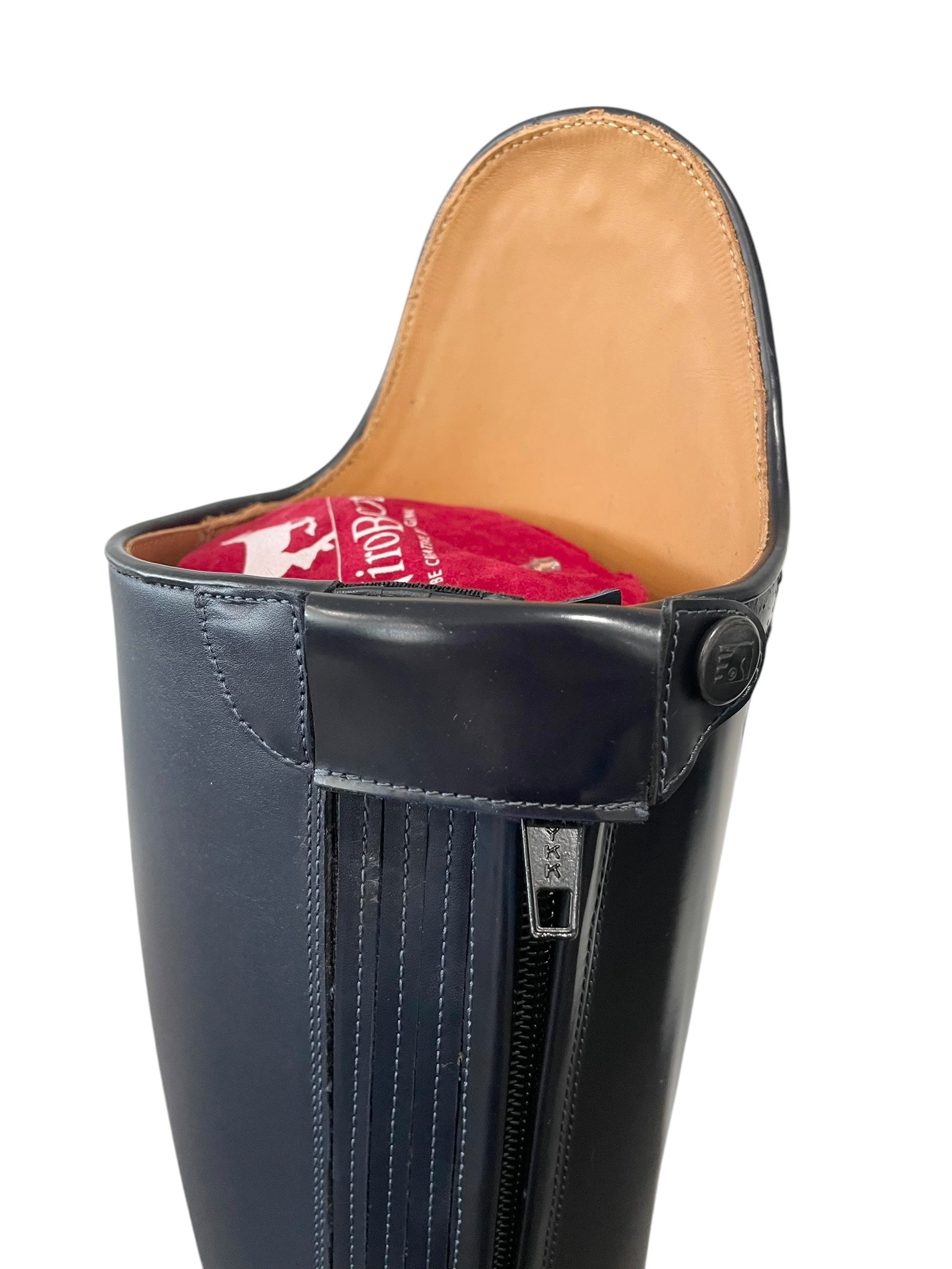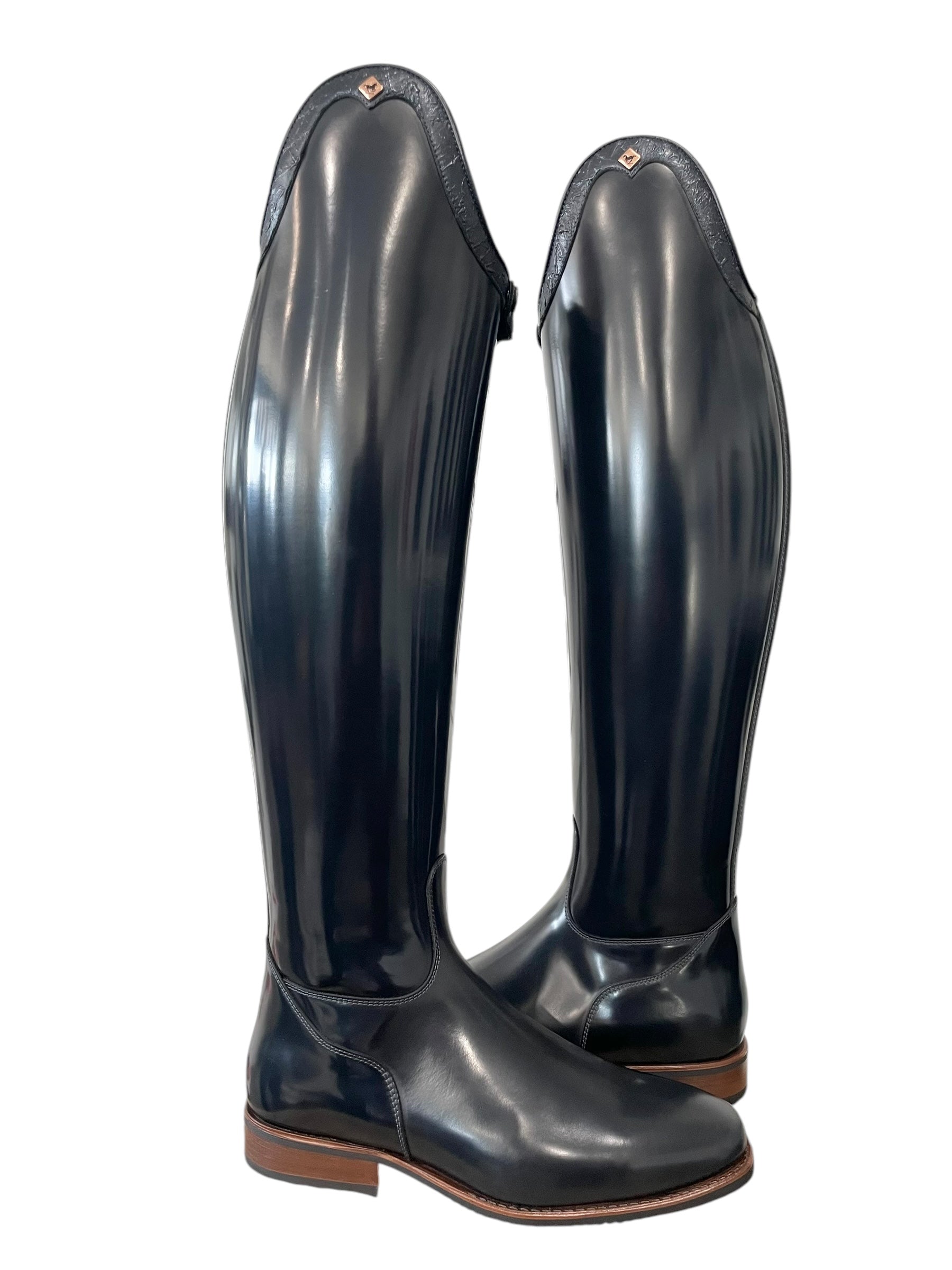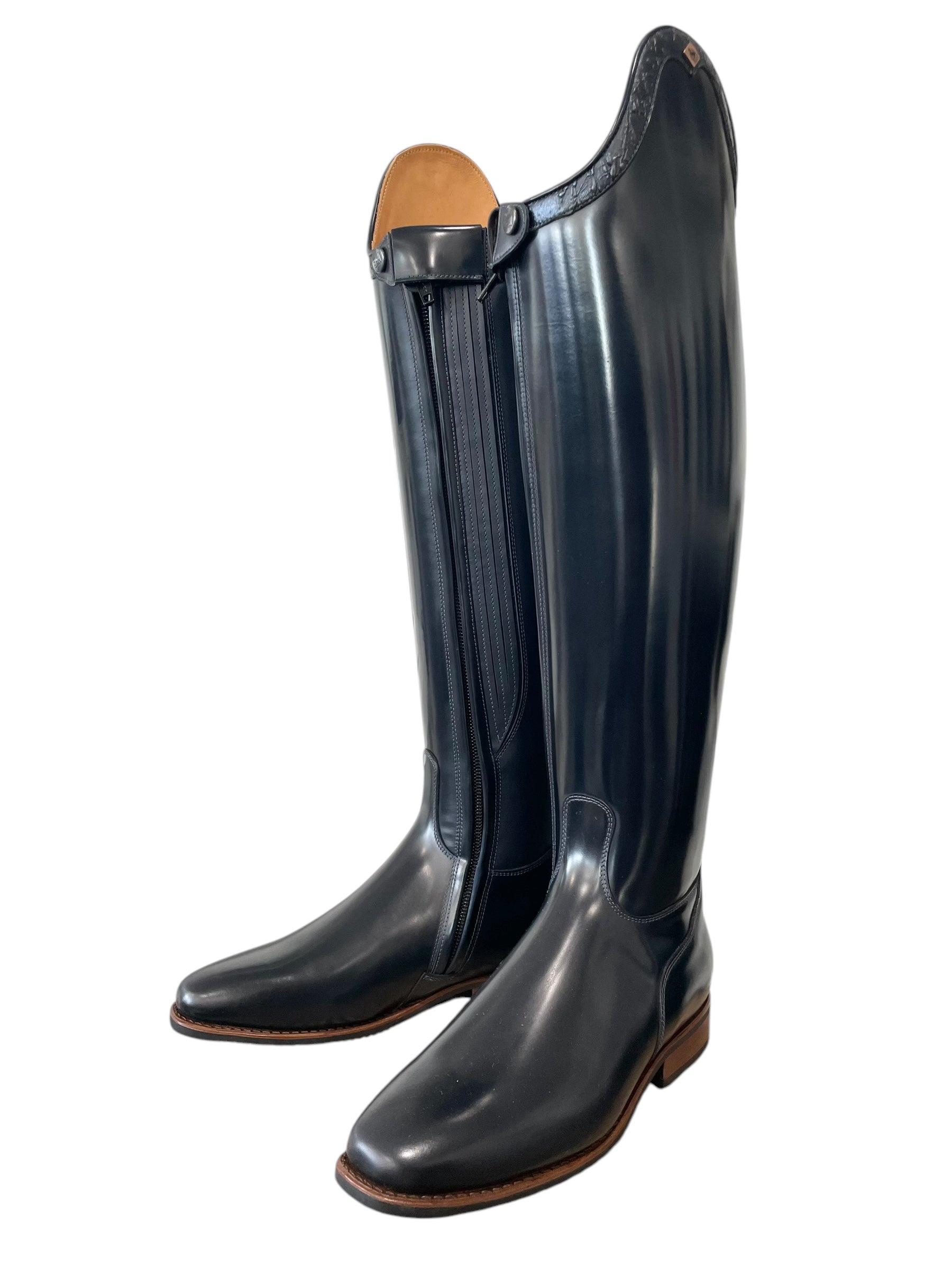 Description: Brushed blue navy base, G9 rondine top in graffiti blue, Q7 elastic along the zipper and inside patch in WRAT indaco, rose gold logo, and brown outsole.