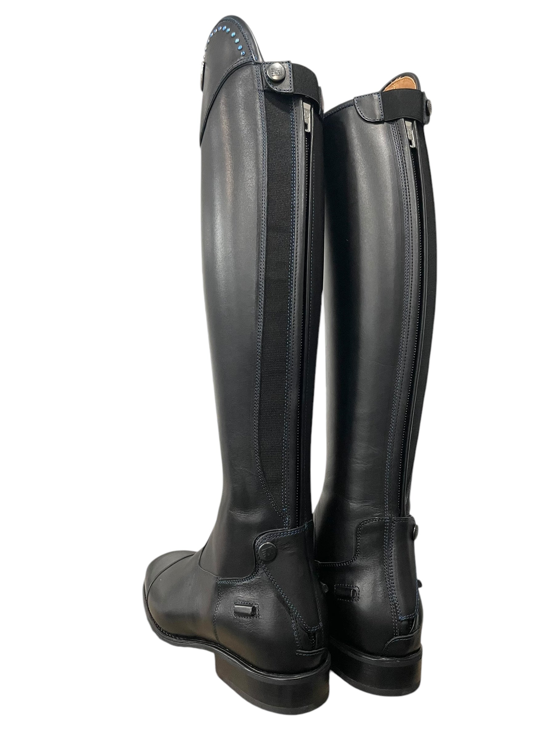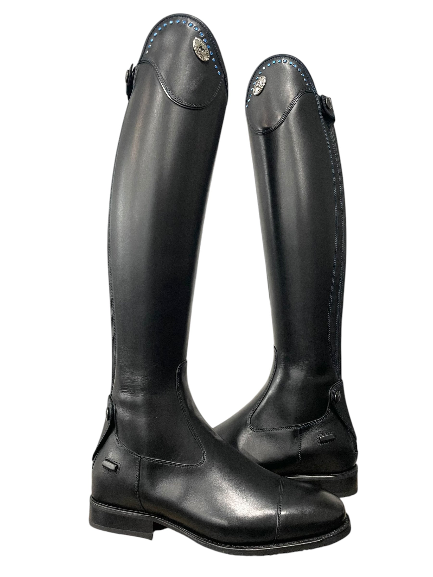 Description: WRAT black base, GG90 crystals in RSW Sapphire 3.6 mm, brushed blue navy top piping, sapphire stitching, silver logo, E2 toecap, and black outsole.