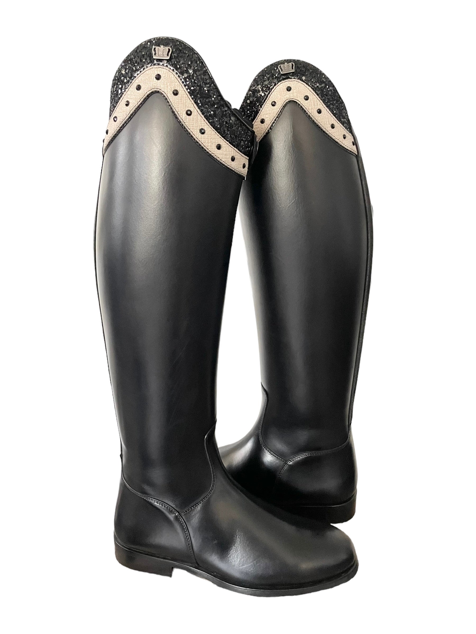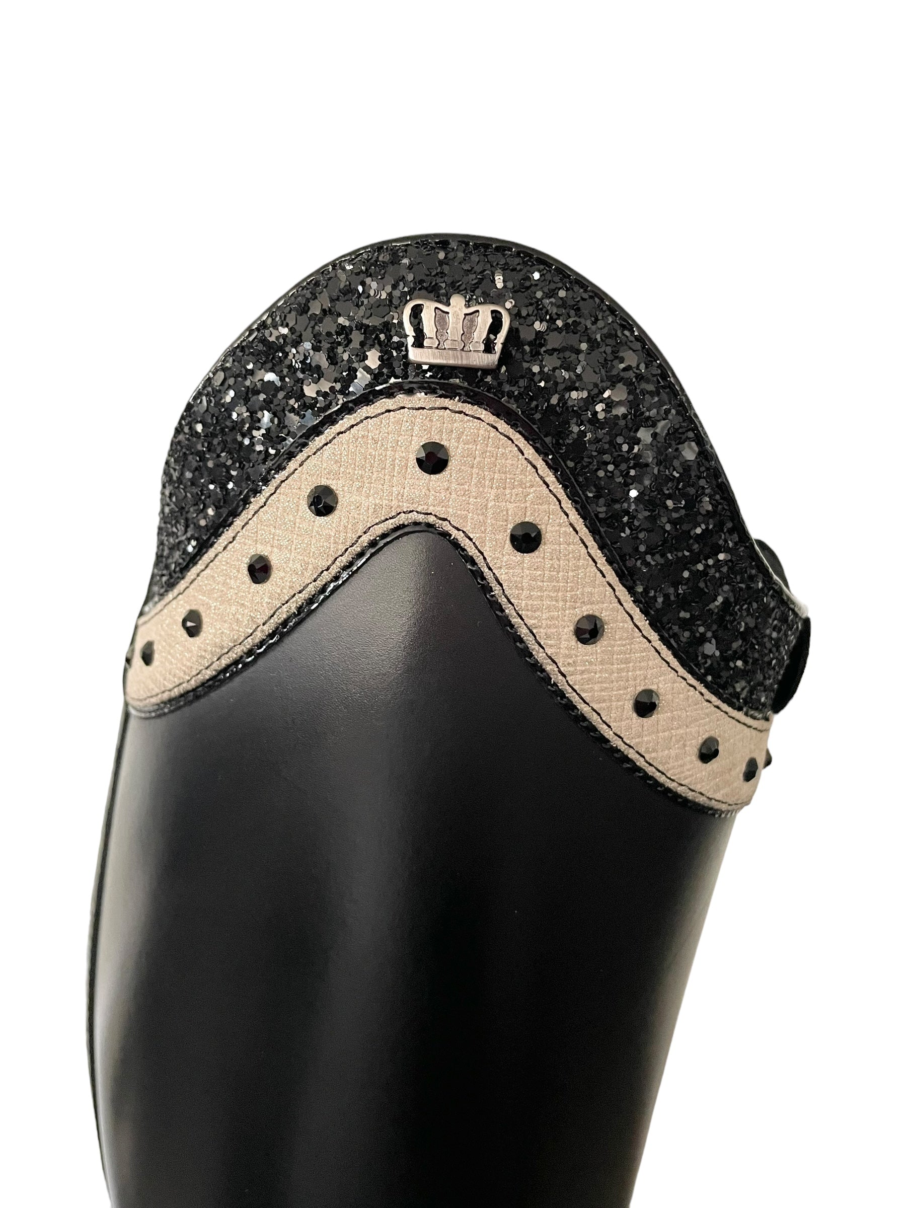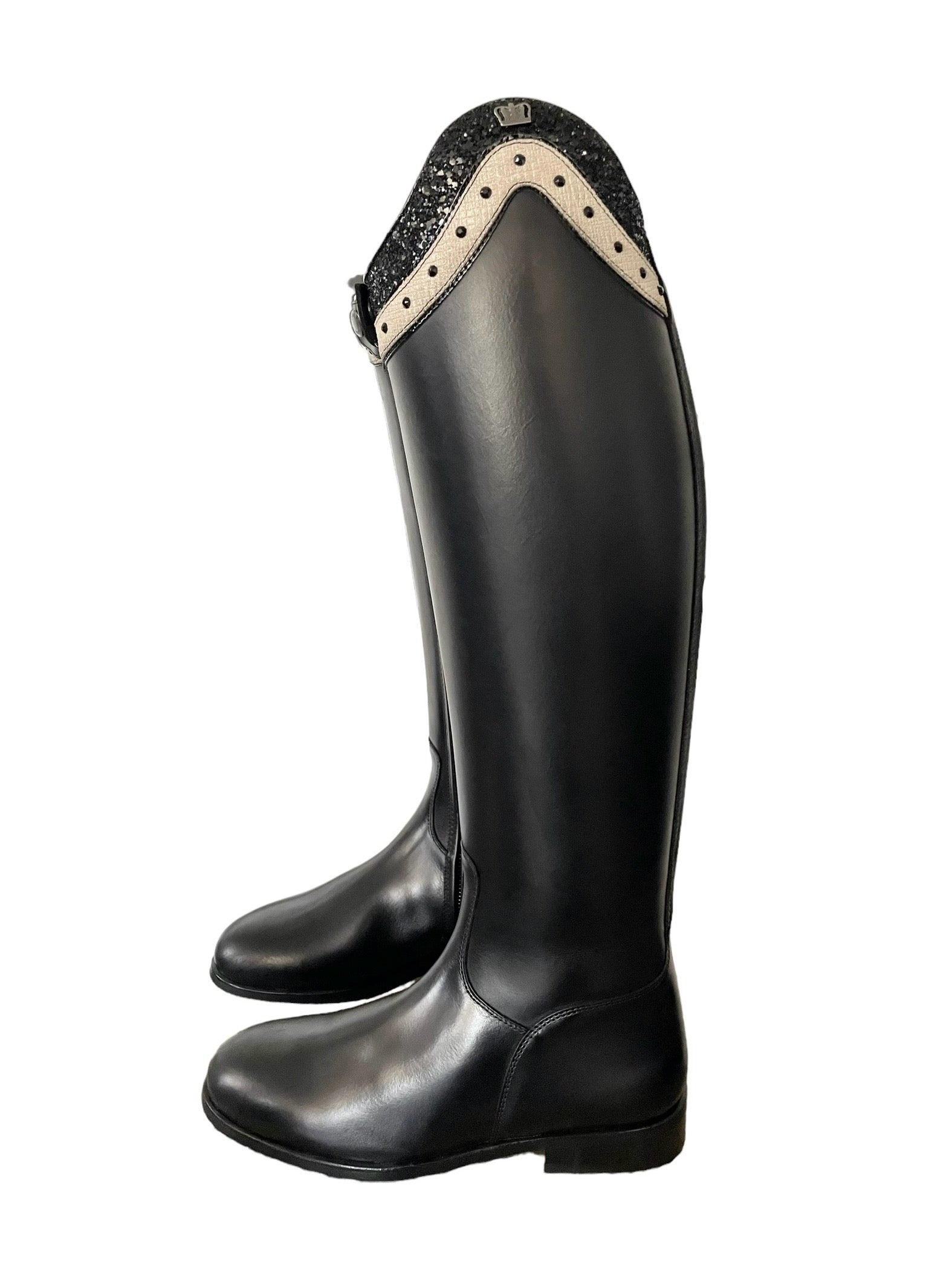 Description: Nature black, dulce top in creme frame and grueso black with roma black top piping, polished black logo, and black outsole.