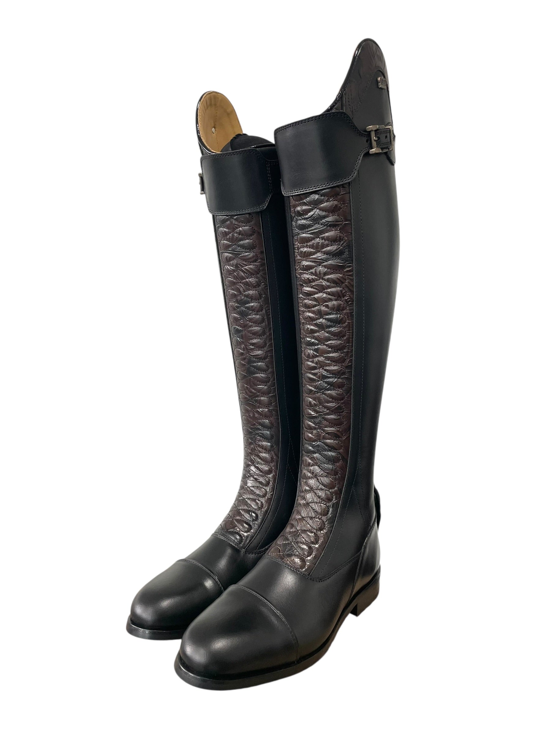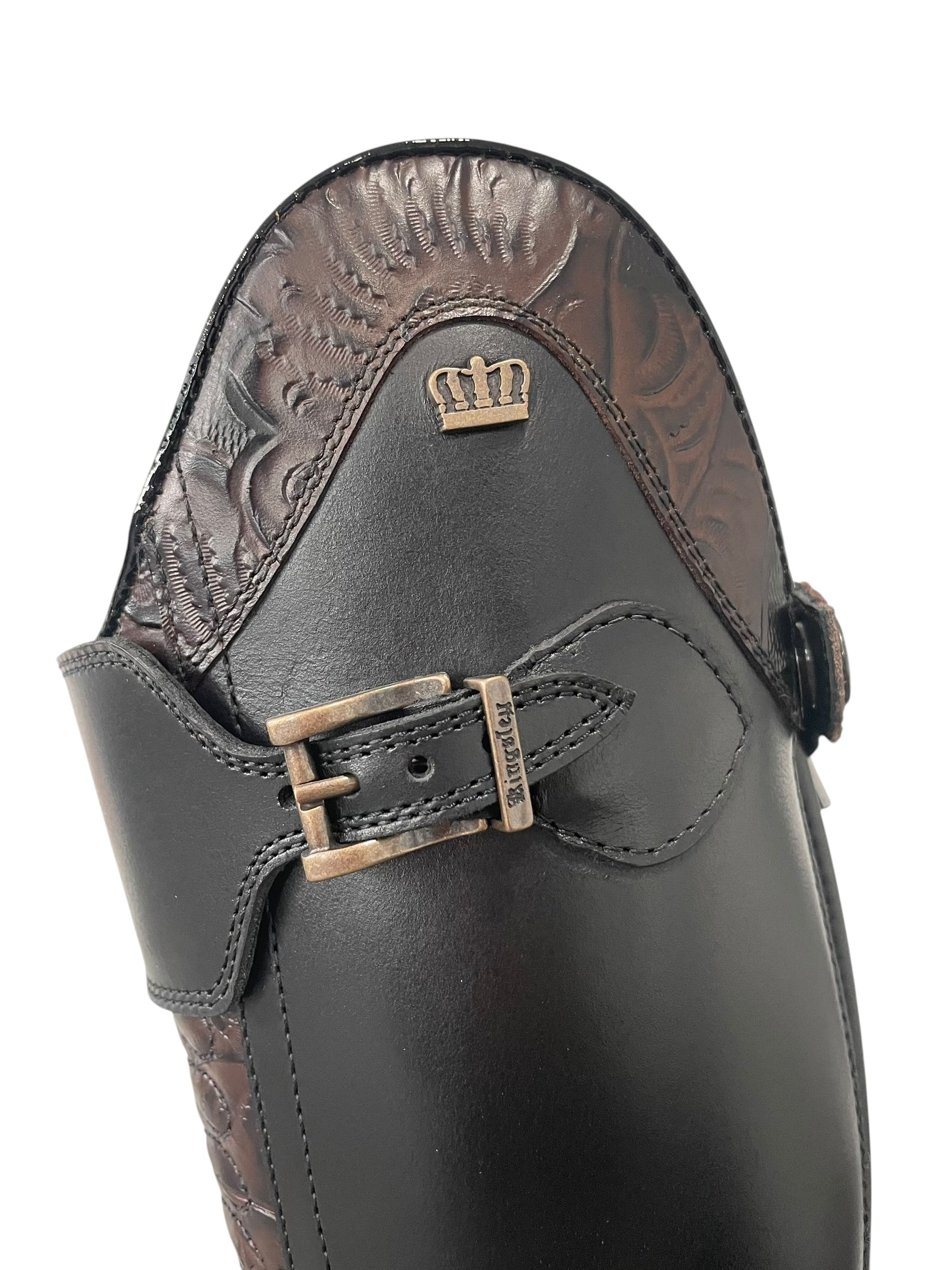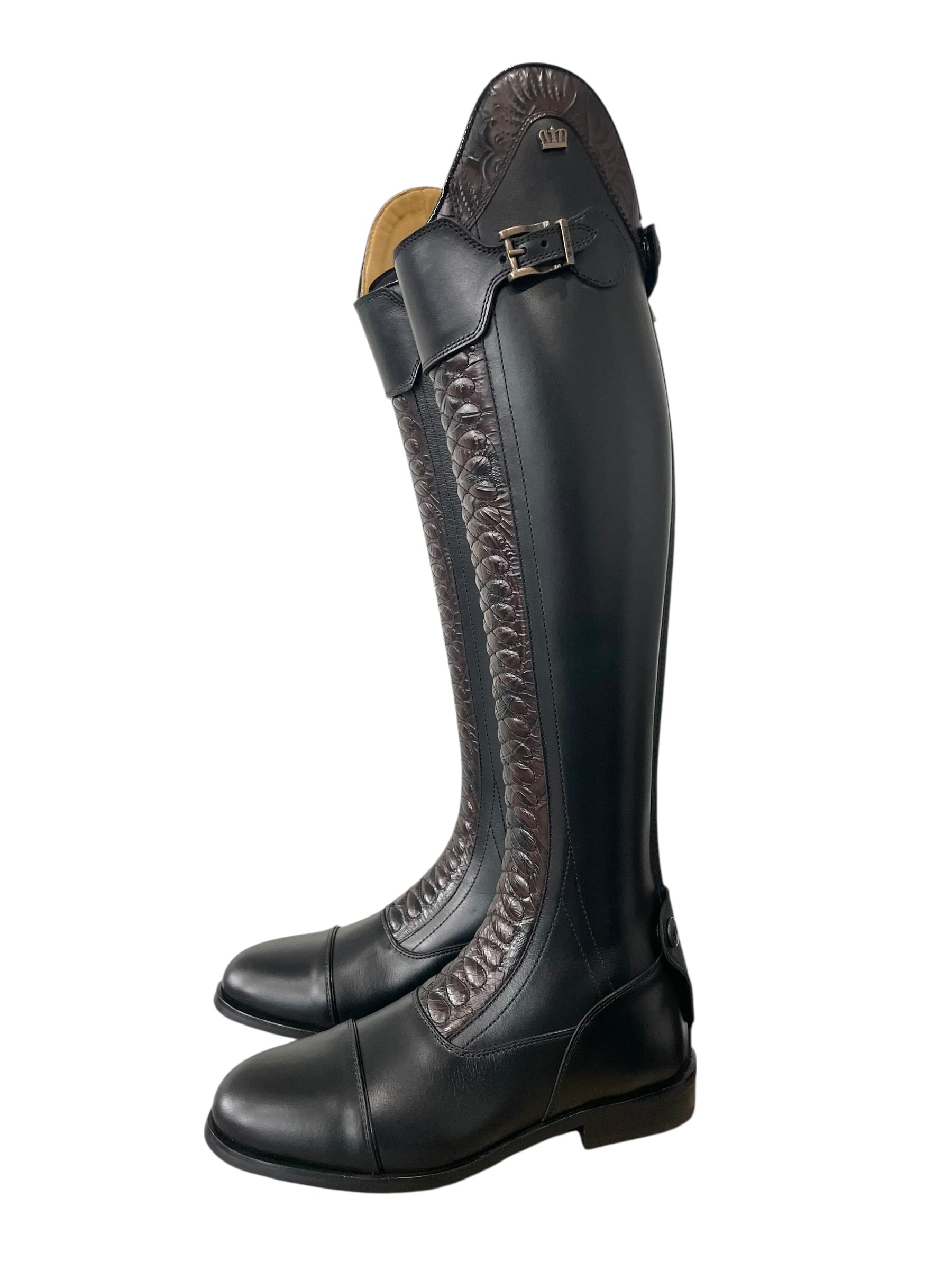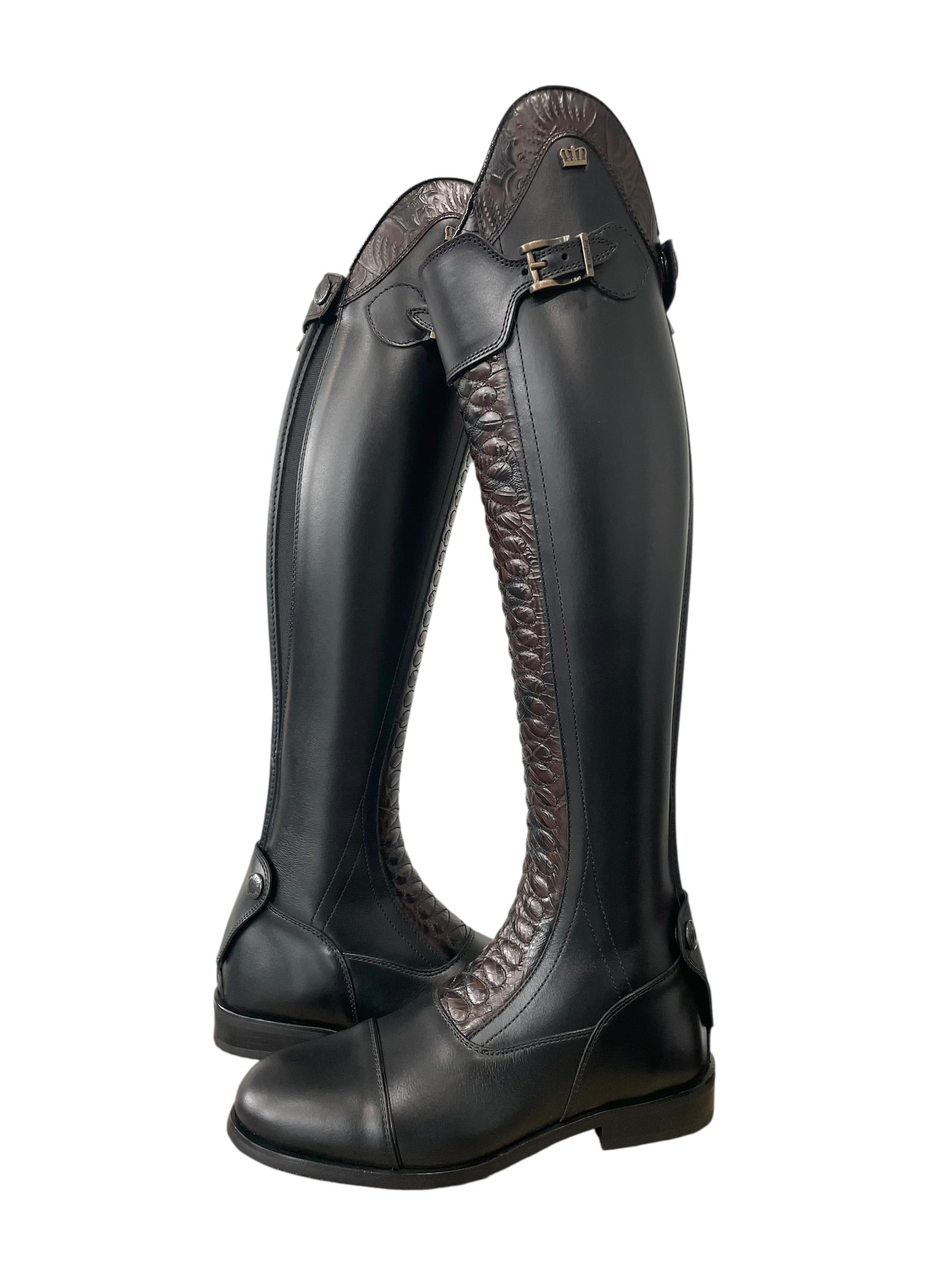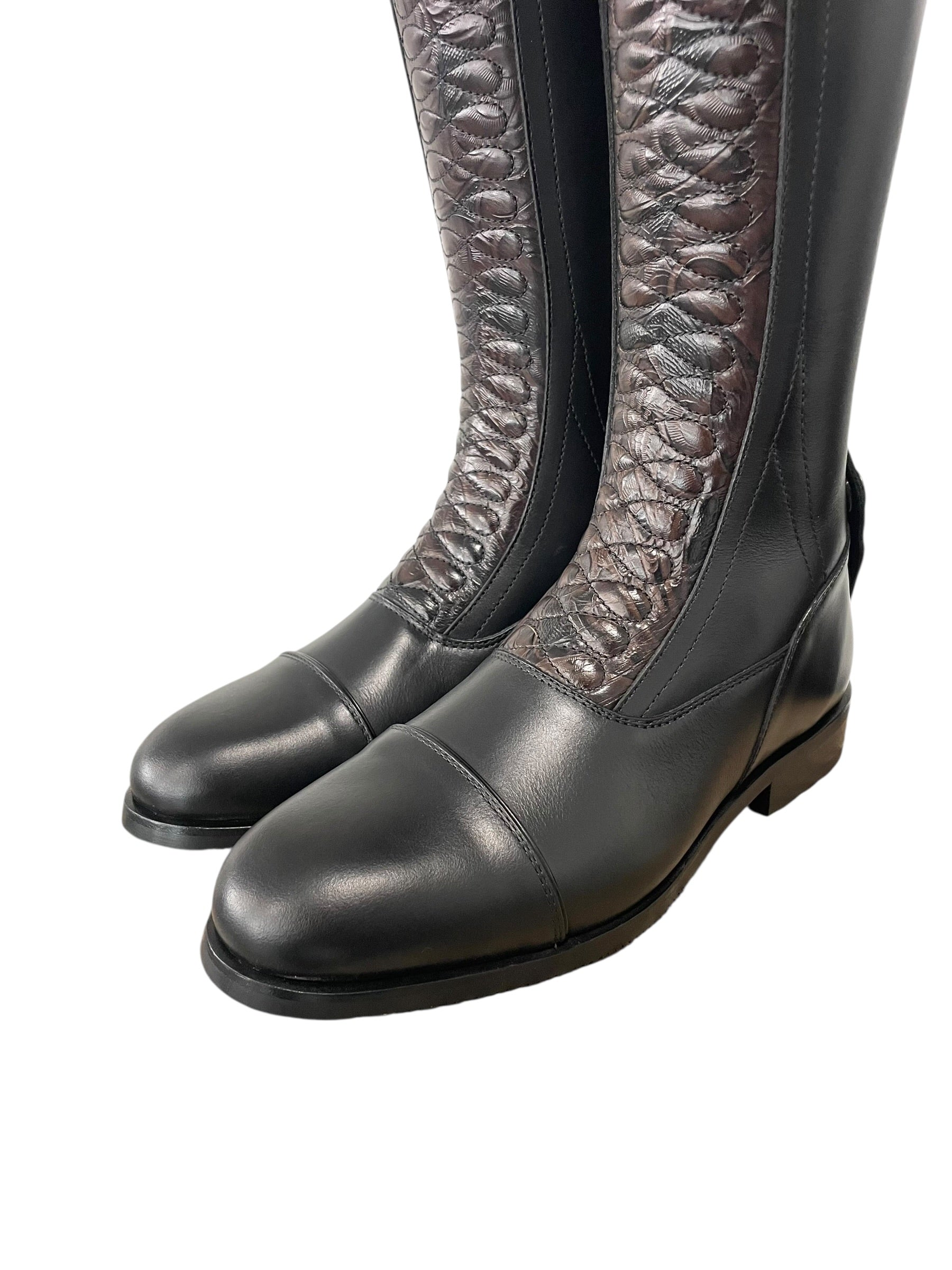 Description: Nature black base, top strap in nature black with old gold buckle, Jenny top in engraved brown with roma black piping, Infinity front in engraved brown, toecap with roma black piping, black elastic along the shaft, top zip protector in engraved brown, bottom zip protector in nature black, old gold logo crown, and black sole.