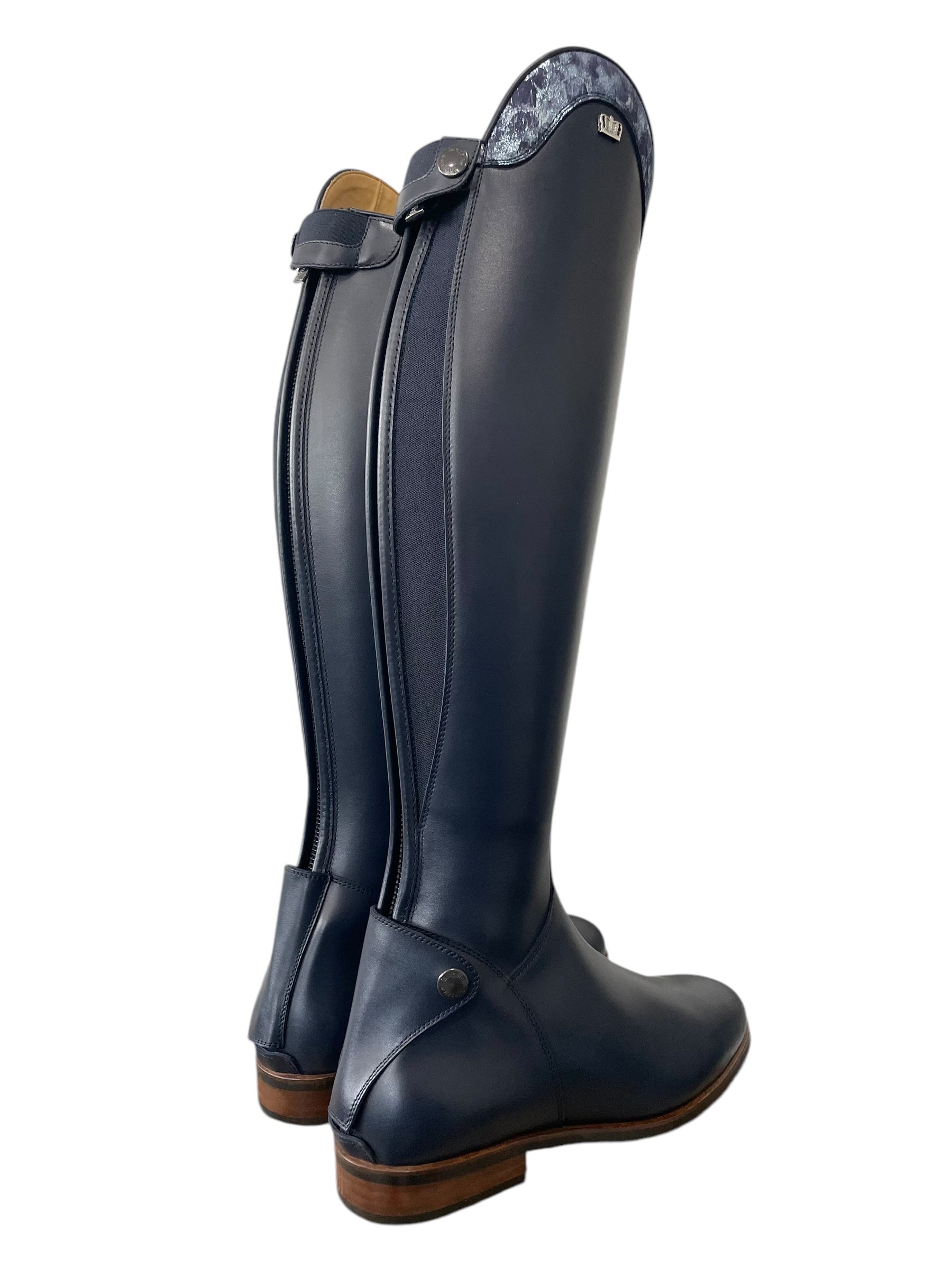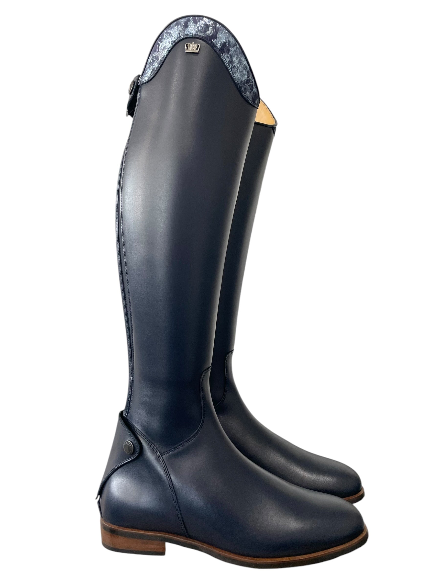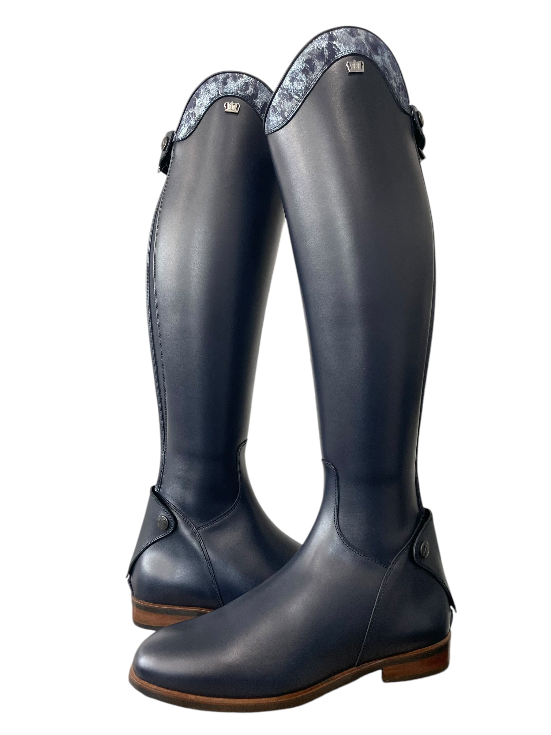 Description: Aspen blue base, Libra top in blue storm deep, navy elastic along the shaft, silver logo crown, and brown outsole.