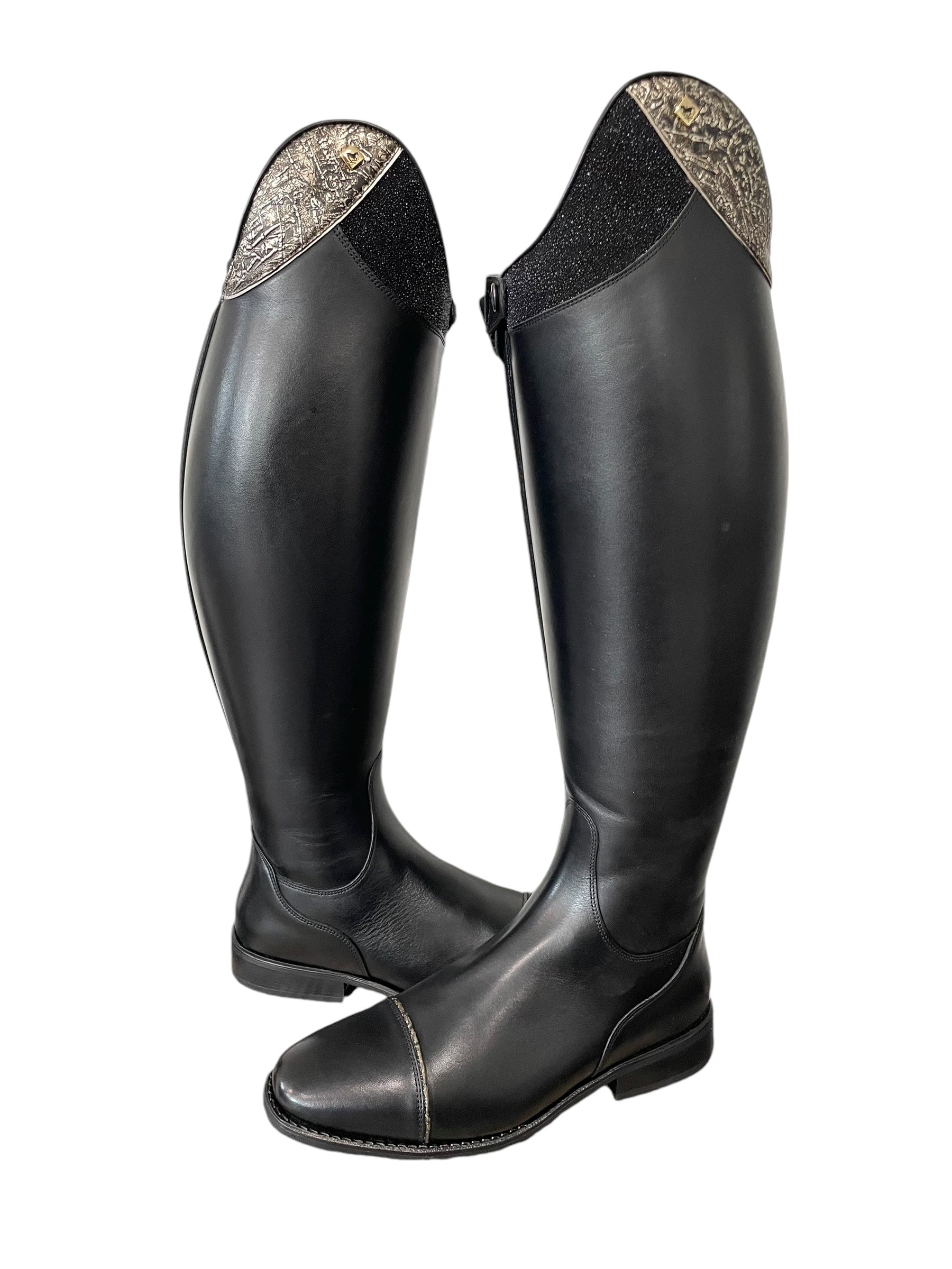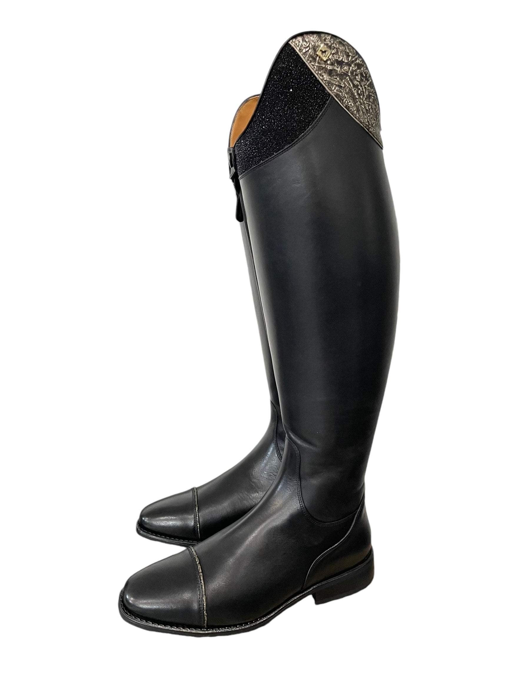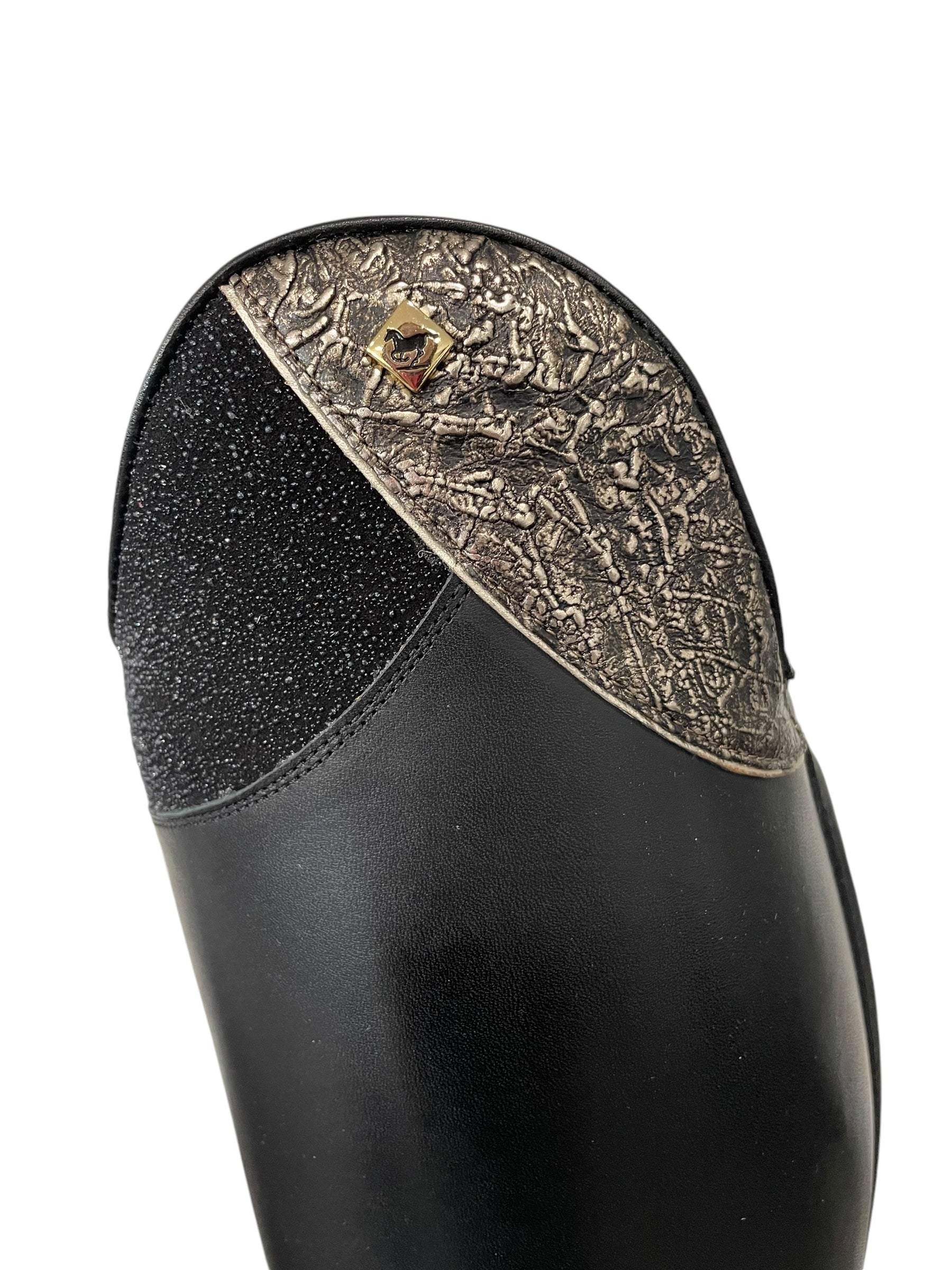 Description: WRAT black base, G35 musa top in graffiti papiro and stardust black with specchio 3691 piping, E3 toecap with graffiti papiro piping, Q13 comfort knee and Q12 V-gusset, black logo, and black outsole.