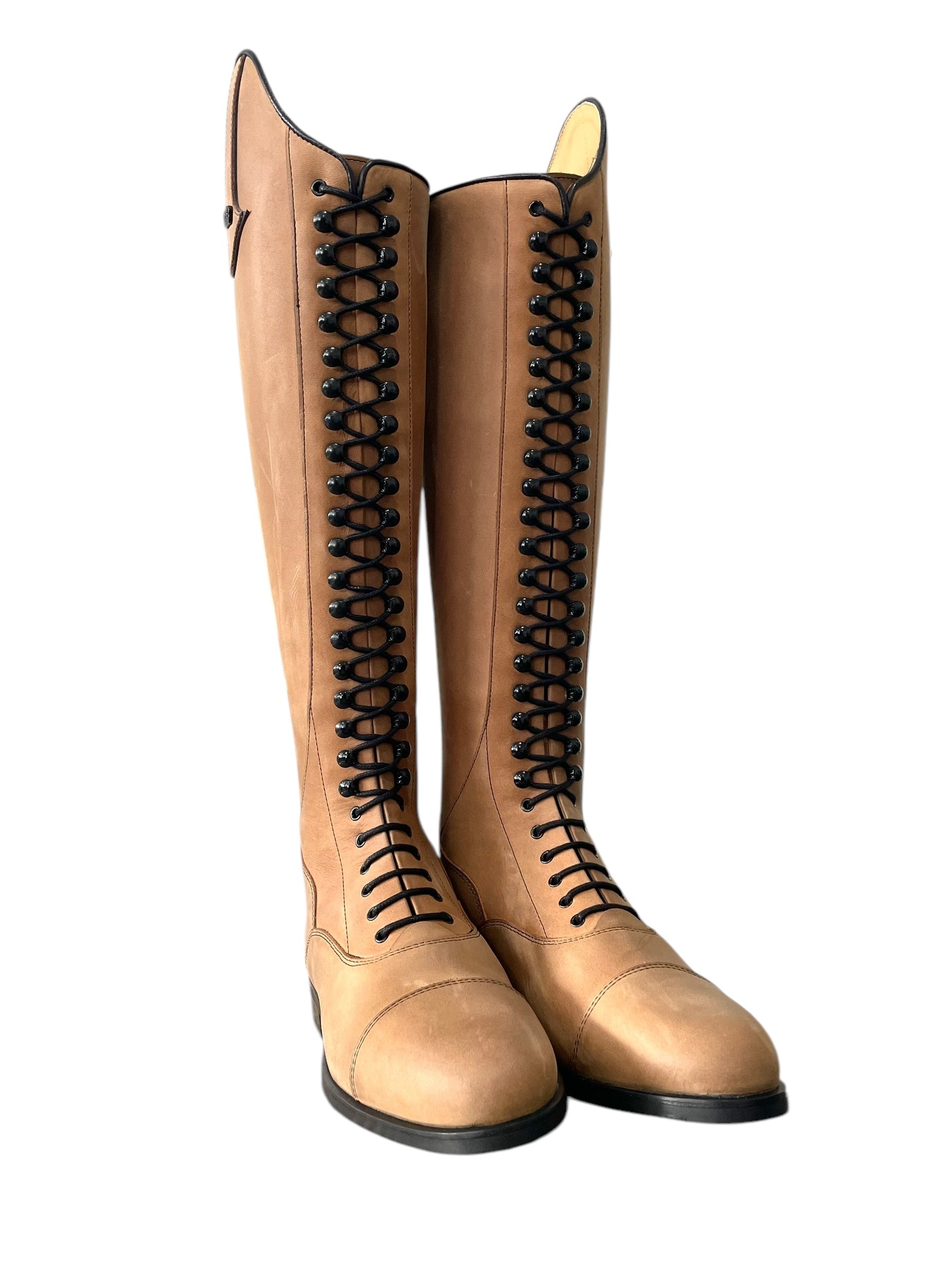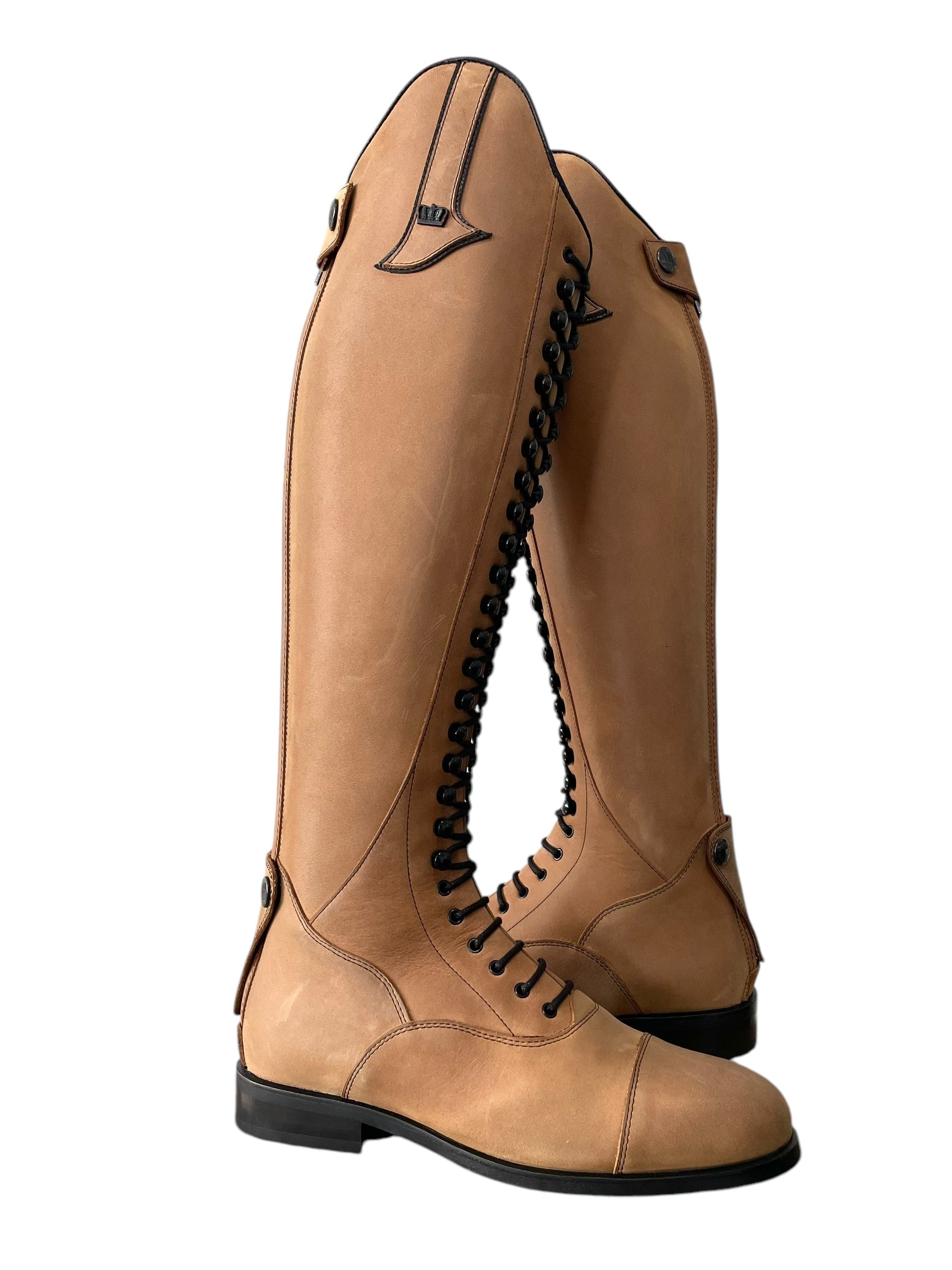 Description: Gaucho brown base, sidestrap piping and top piping in paxson black, black stitching, matte black hooks and logo crown, and black outsole.