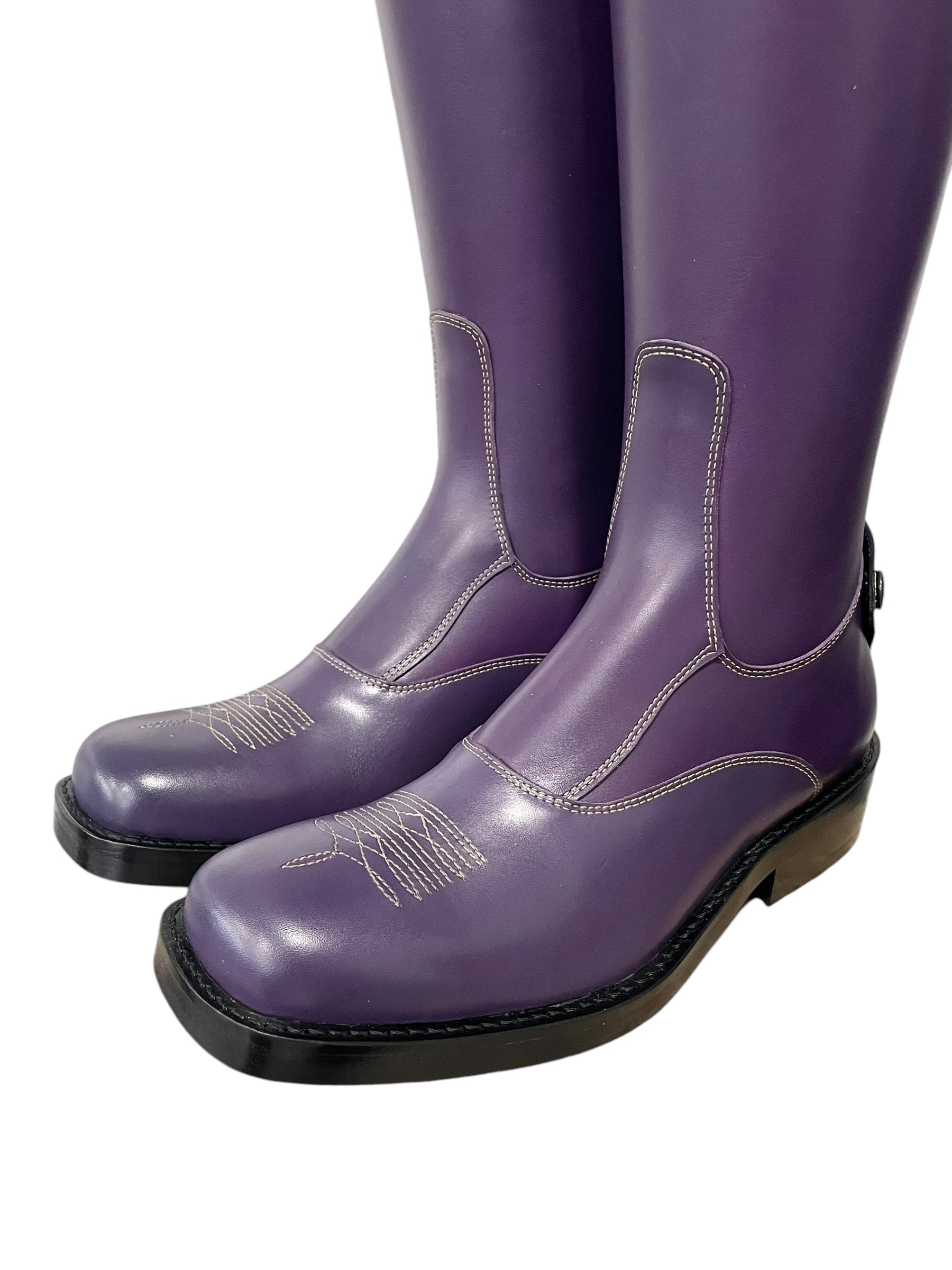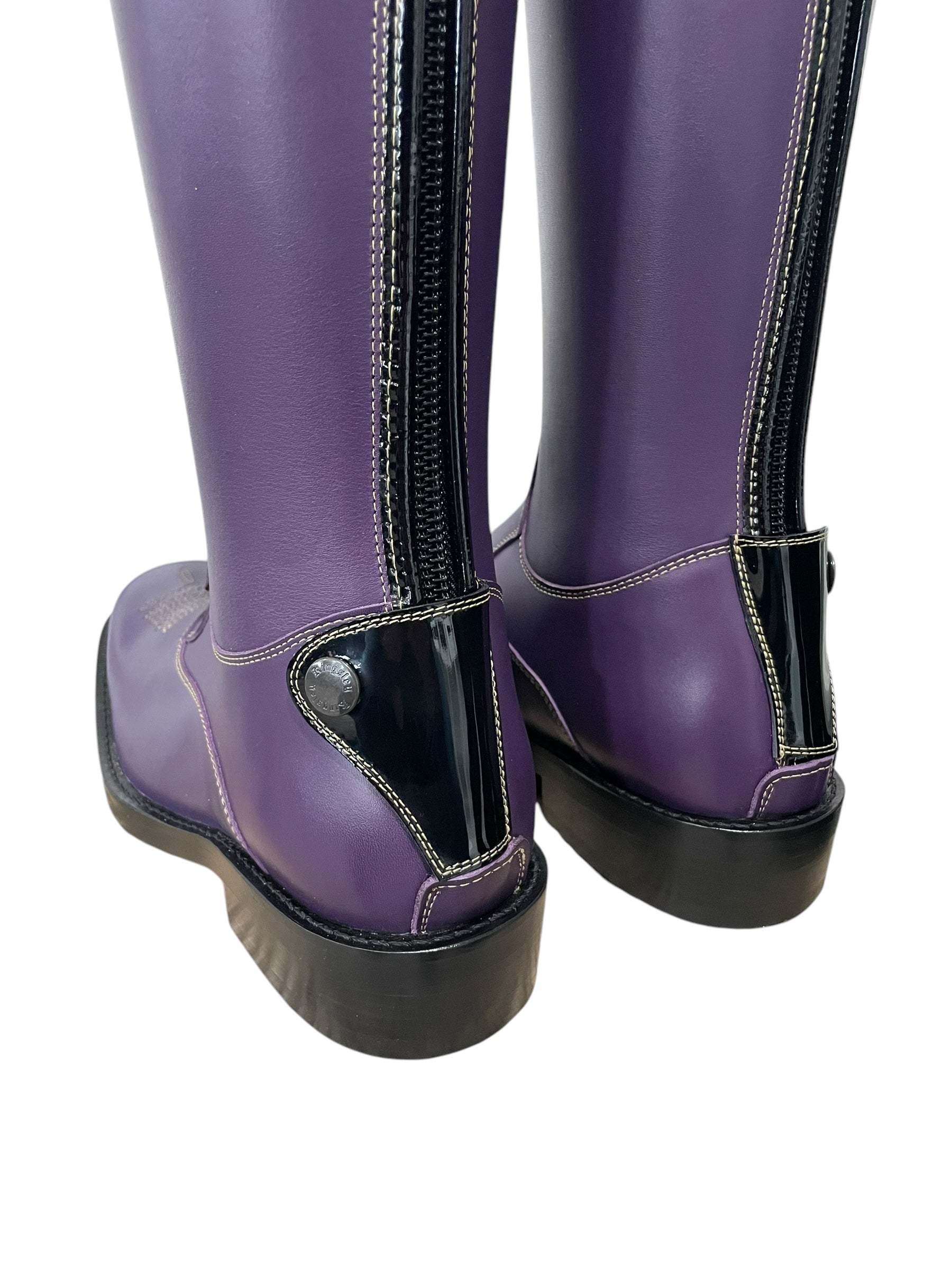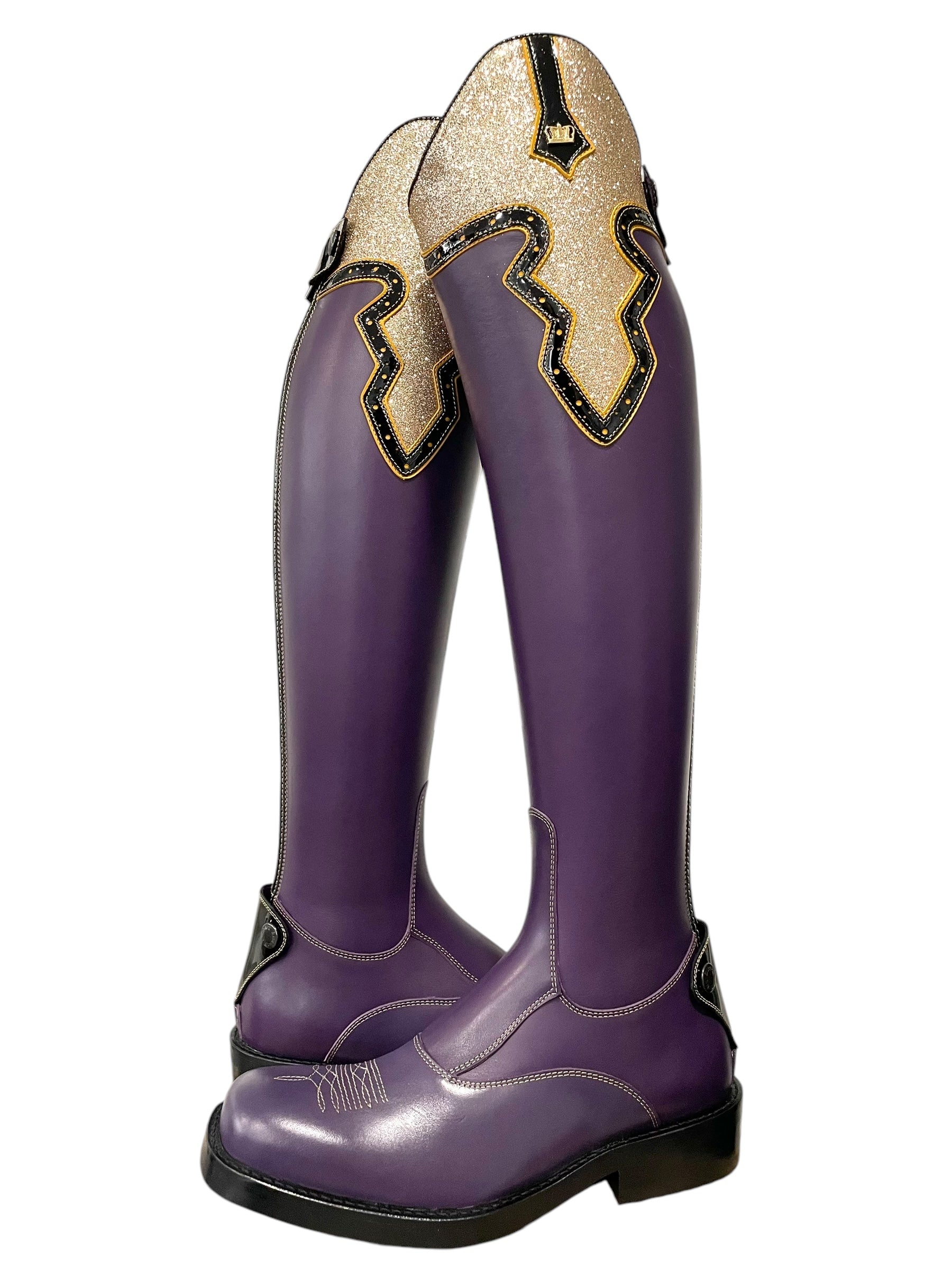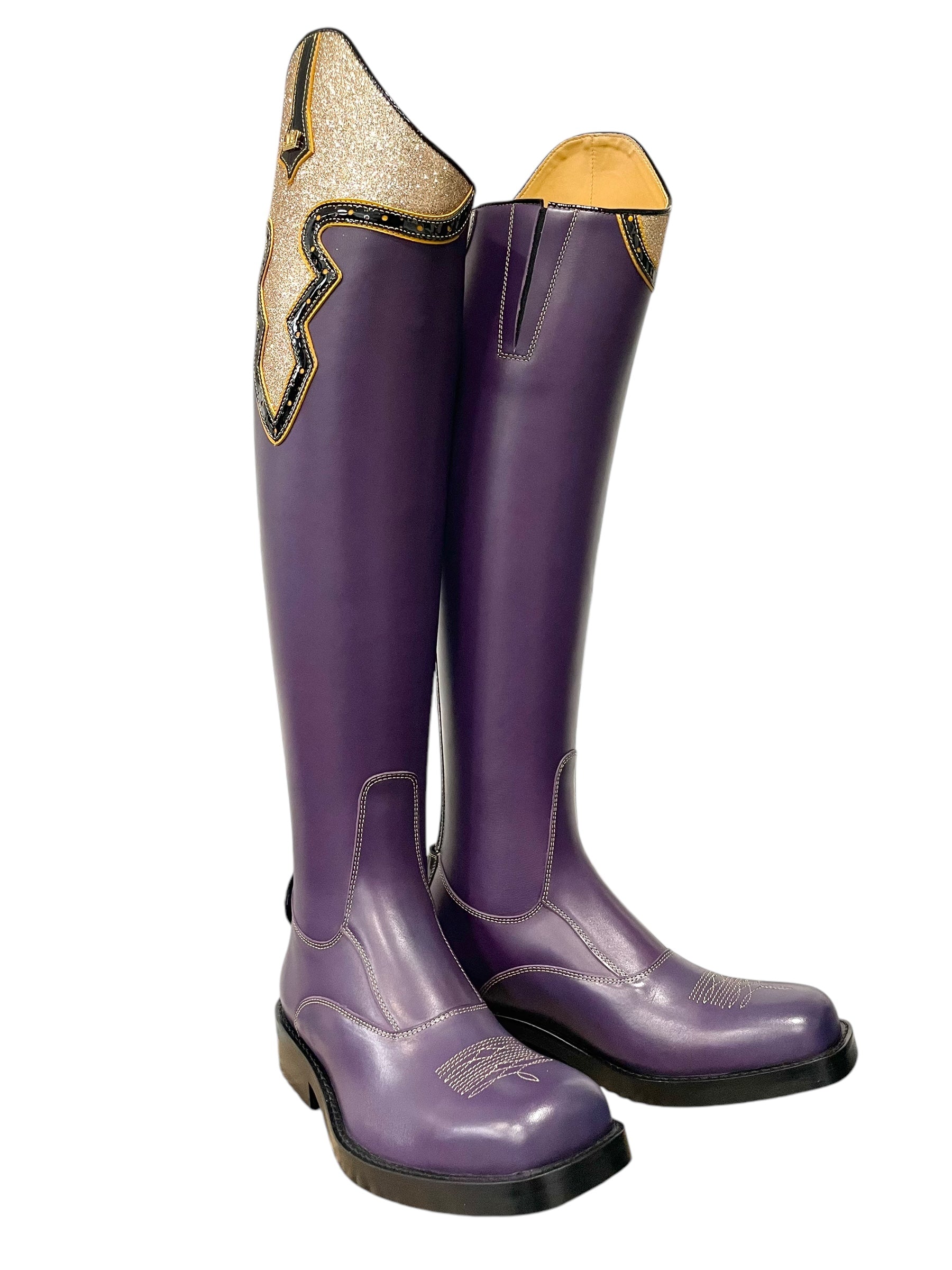 Description: Nature roxo base, sand stitching, stitched design on the toe, Britt top in fino gold and roma black with nature canary details, roma black parts along the zipper and zip protectors, V-gusset on the inside shaft, gold logo crown, and black outsole.