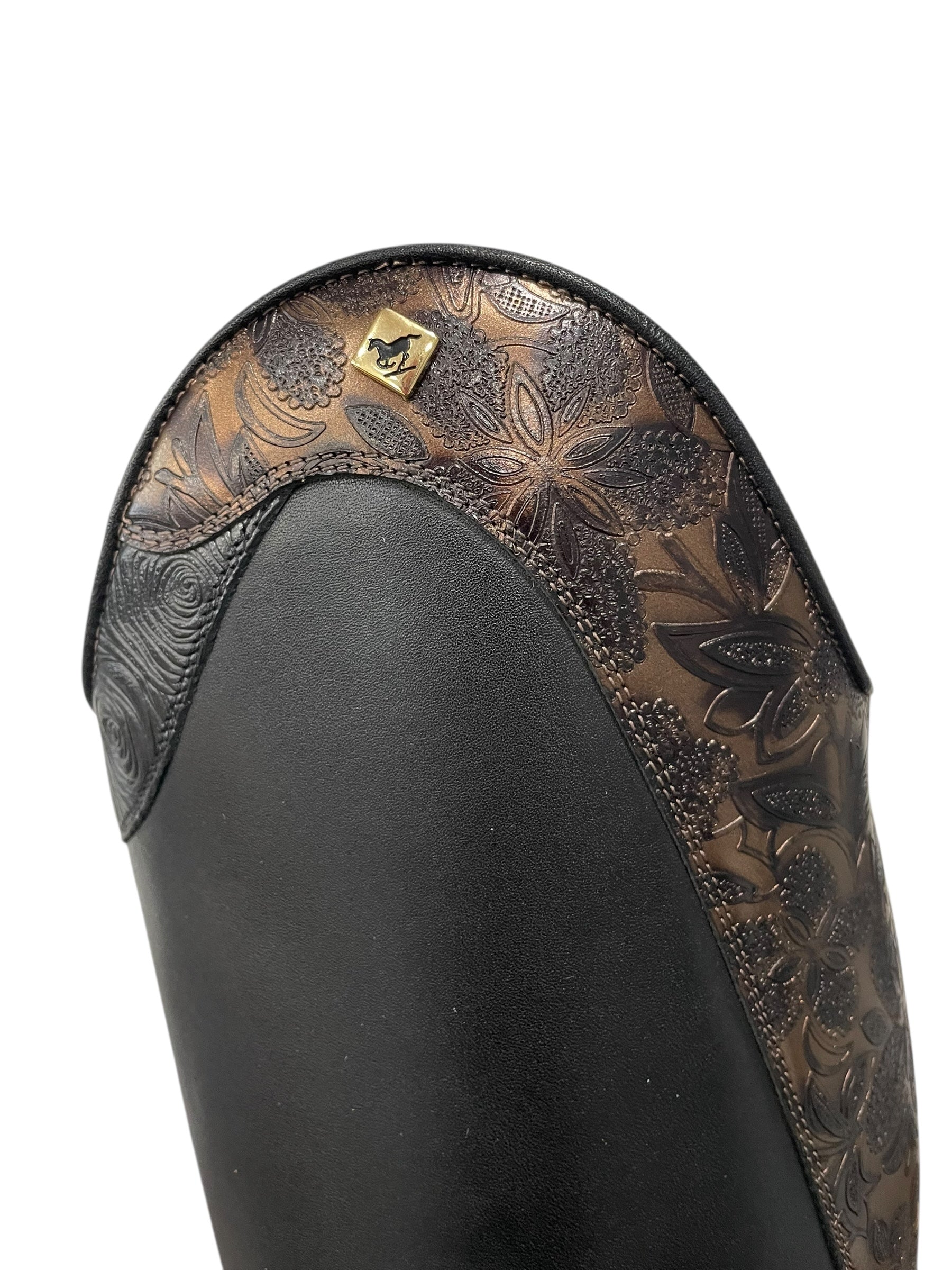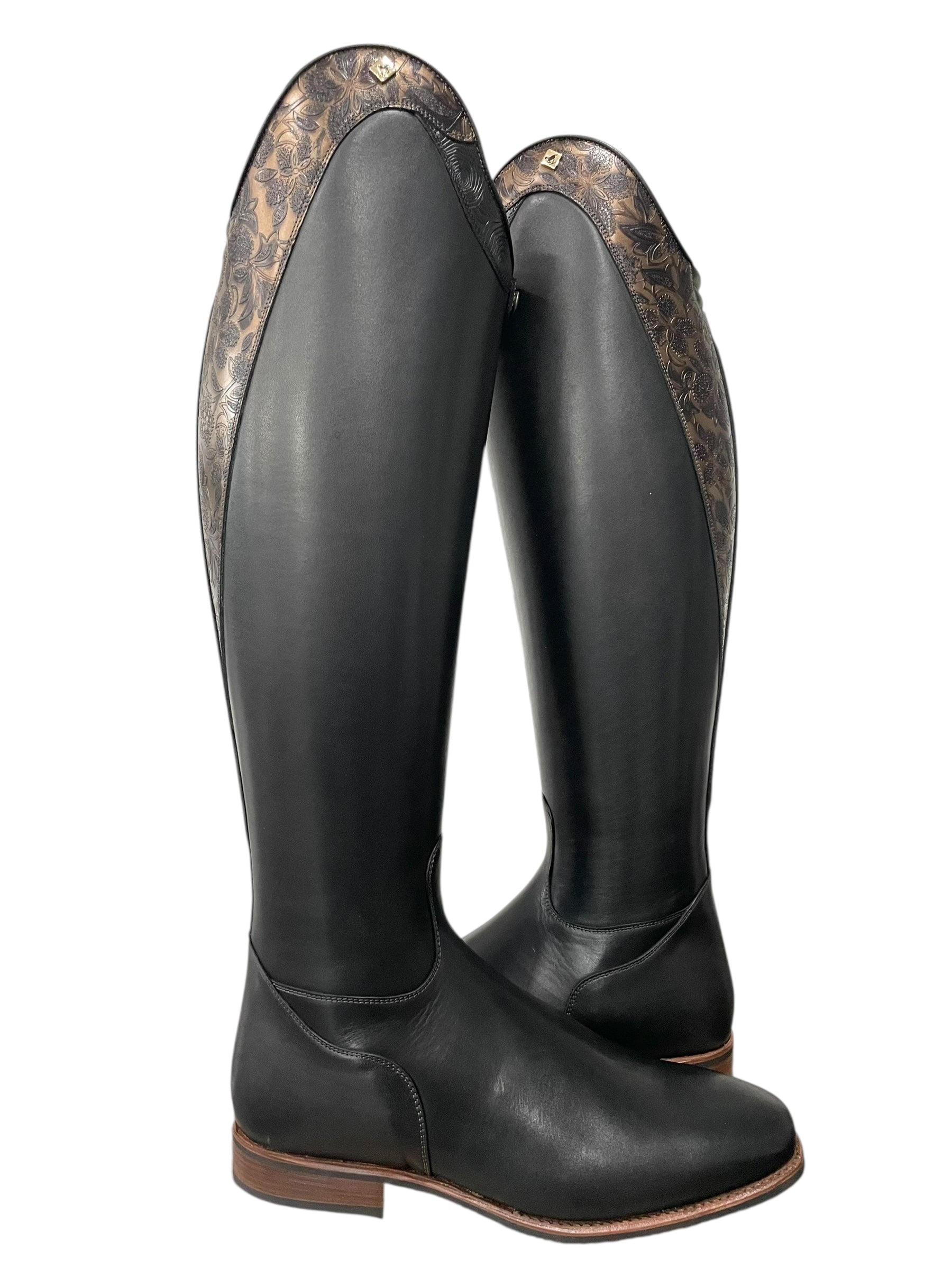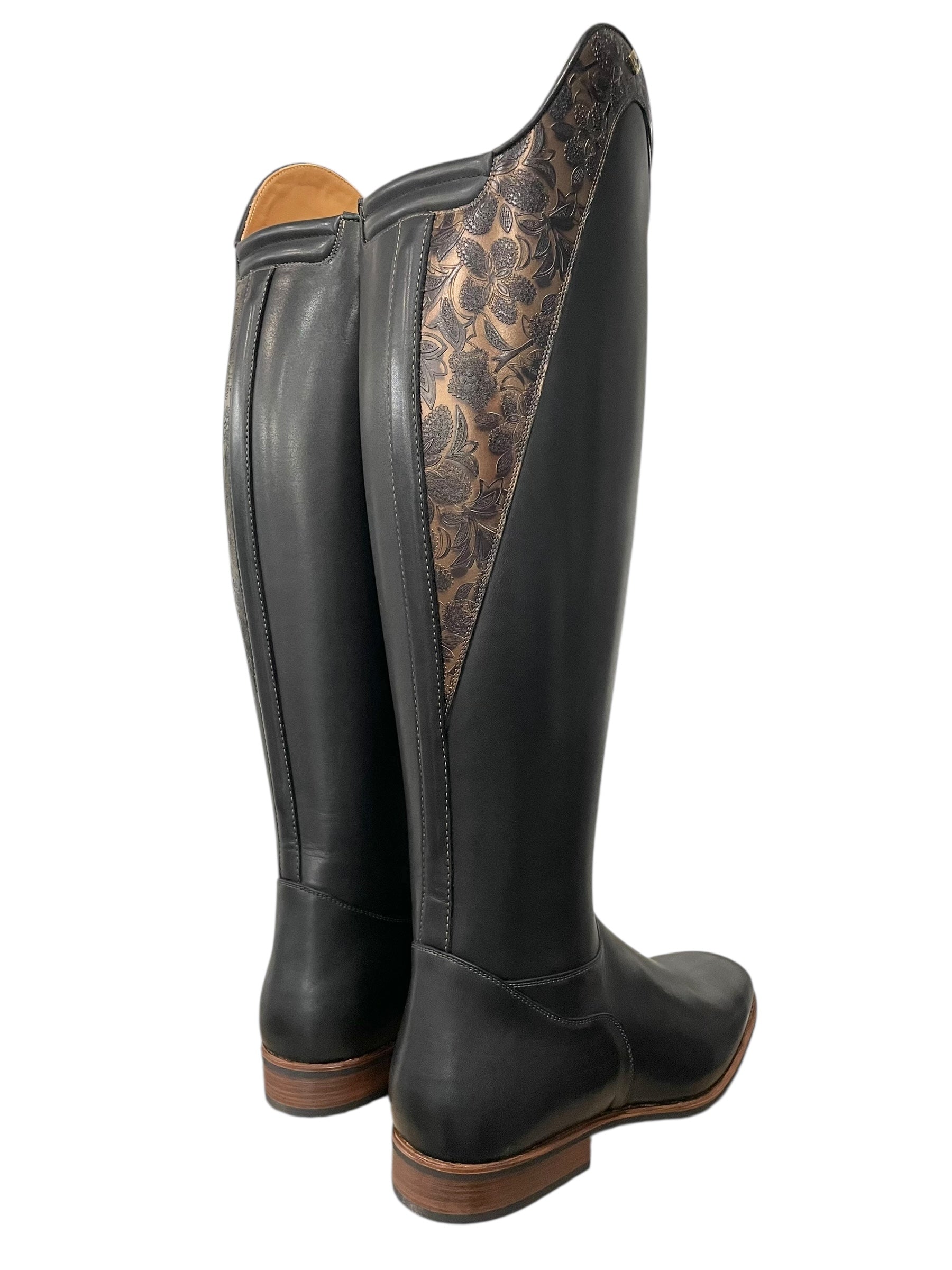 Description: WRAT black base, G40 top in greta brown and roseto black, comfort knee, bronze stitching, gold logo, and brown outsole.