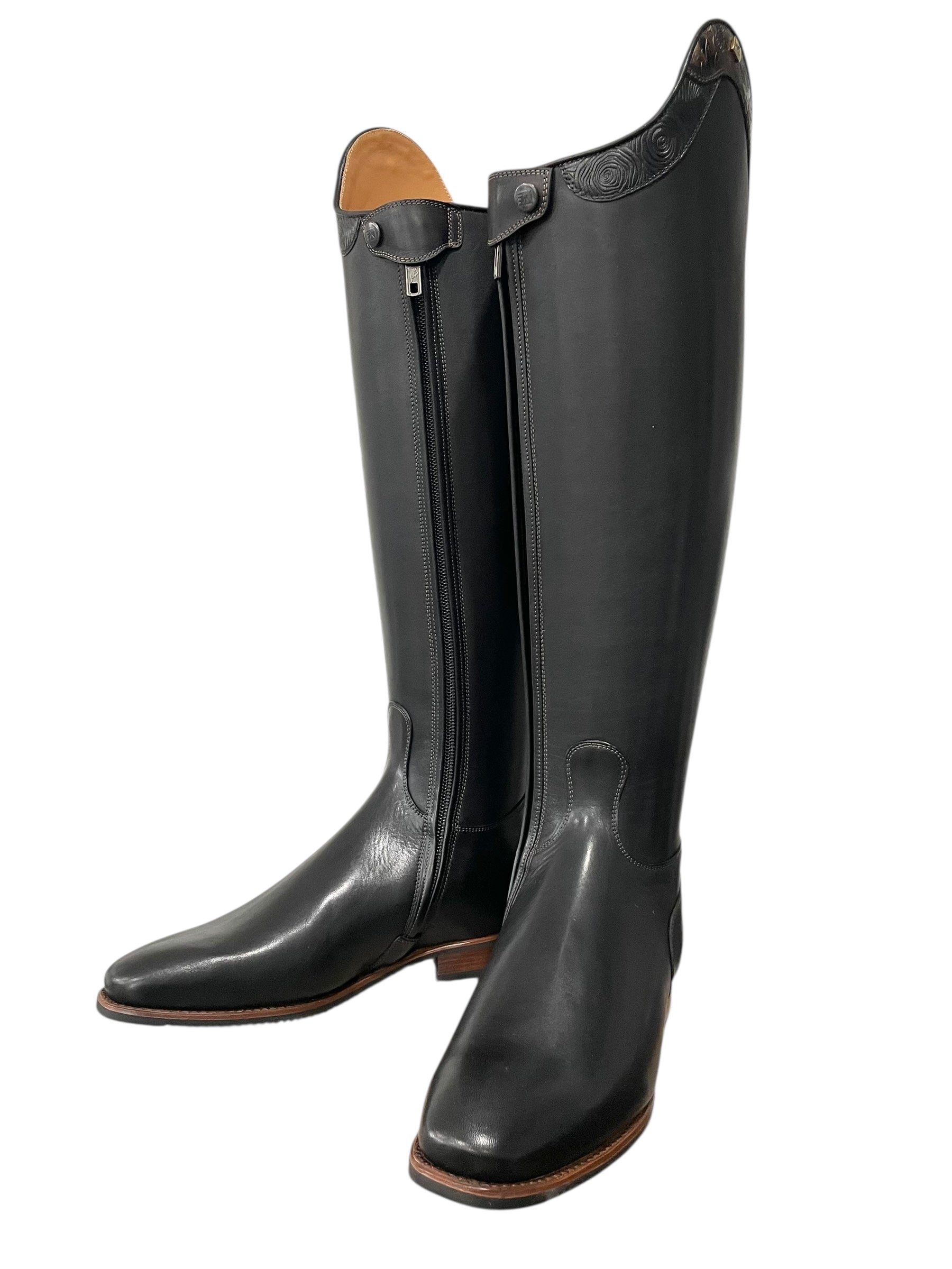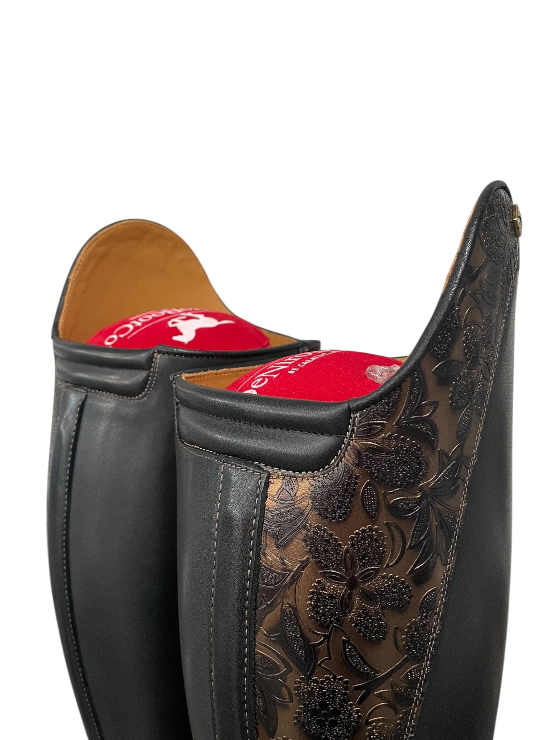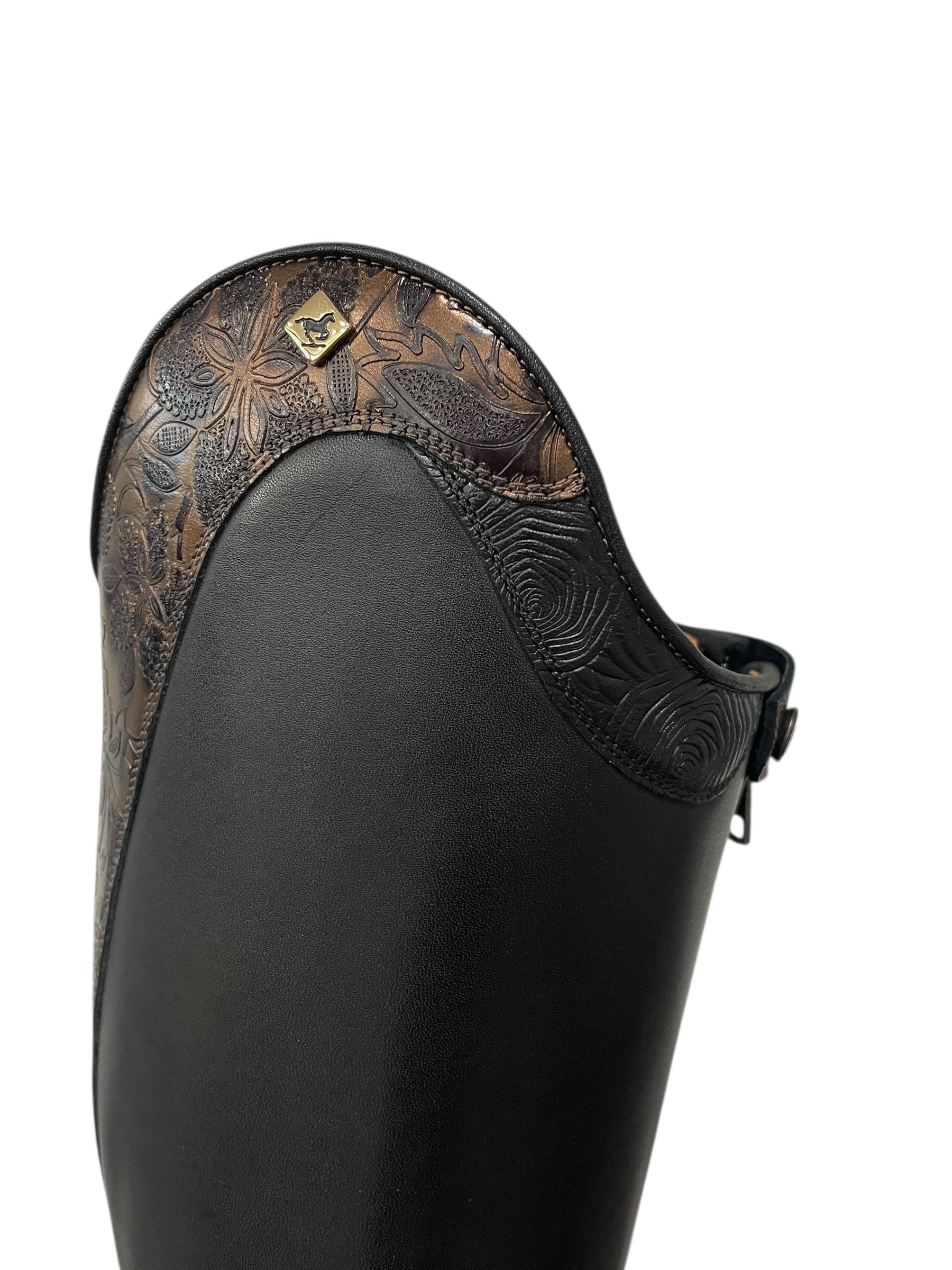Description: WRAT black base, G40 top in greta brown and roseto black, comfort knee, bronze stitching, gold logo, and brown outsole.