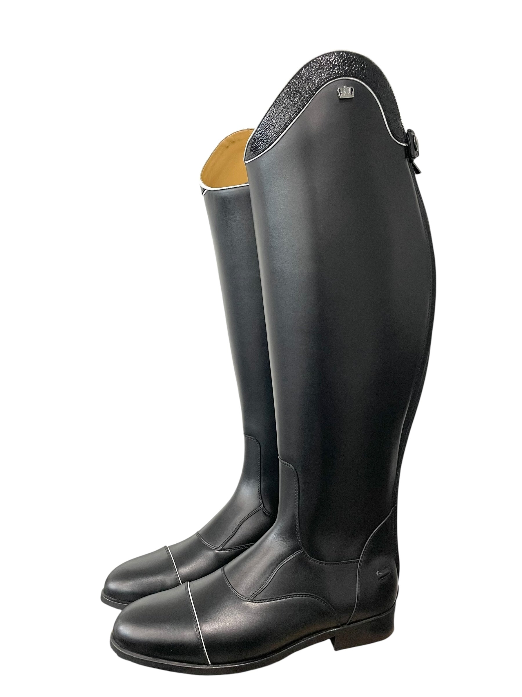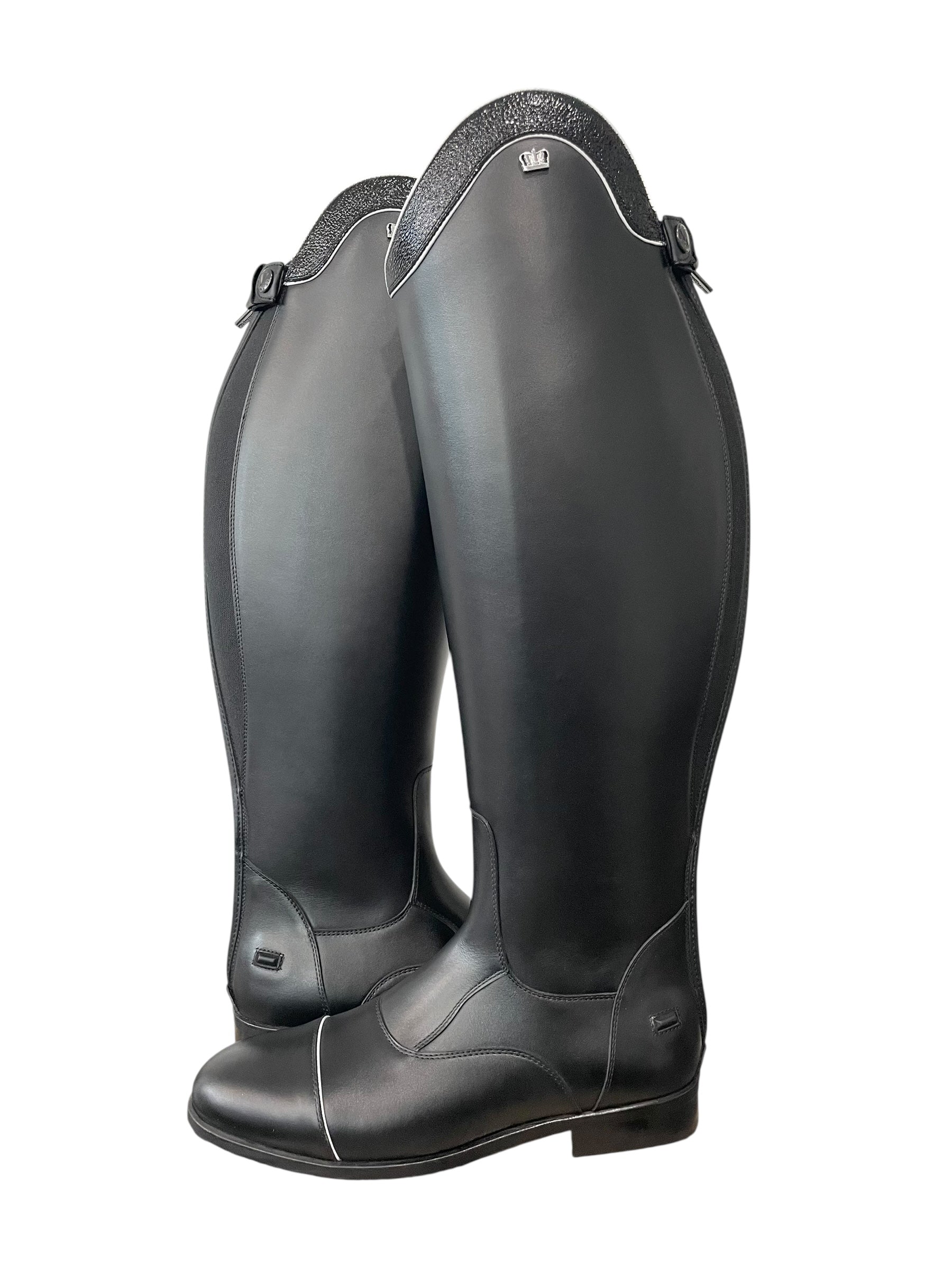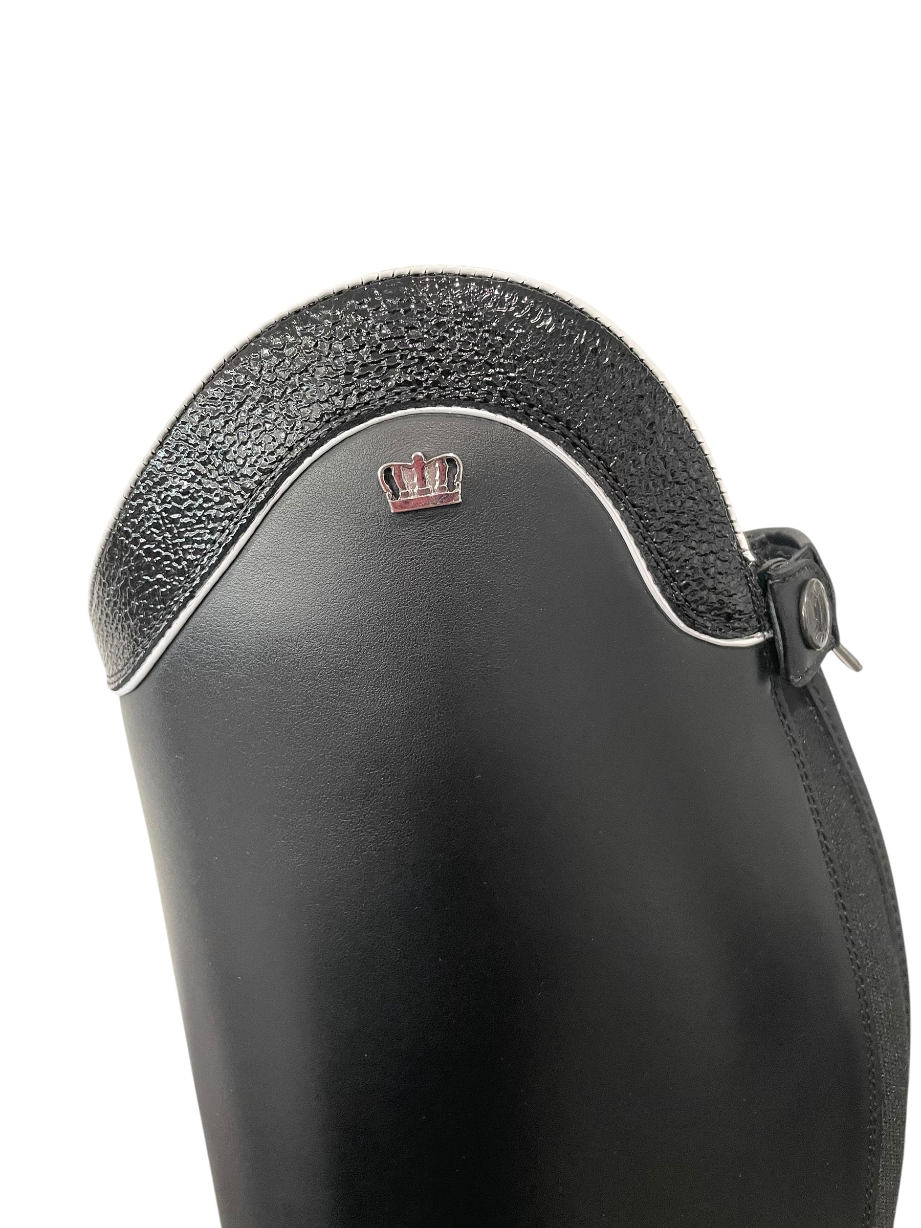 Description: Aspen black base, Jenny top in verniz black with roma white piping, toecap with roma white piping, black elastic, silver logo crown, and black outsole.