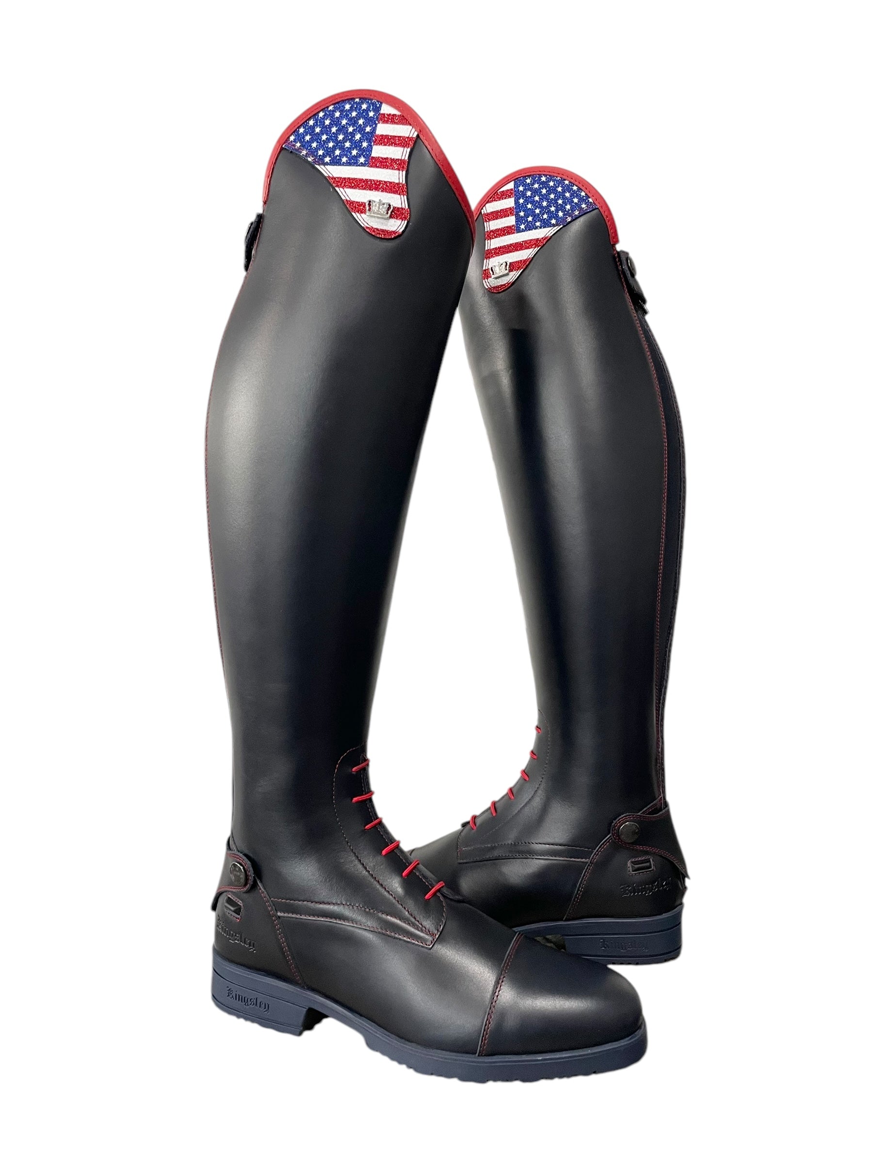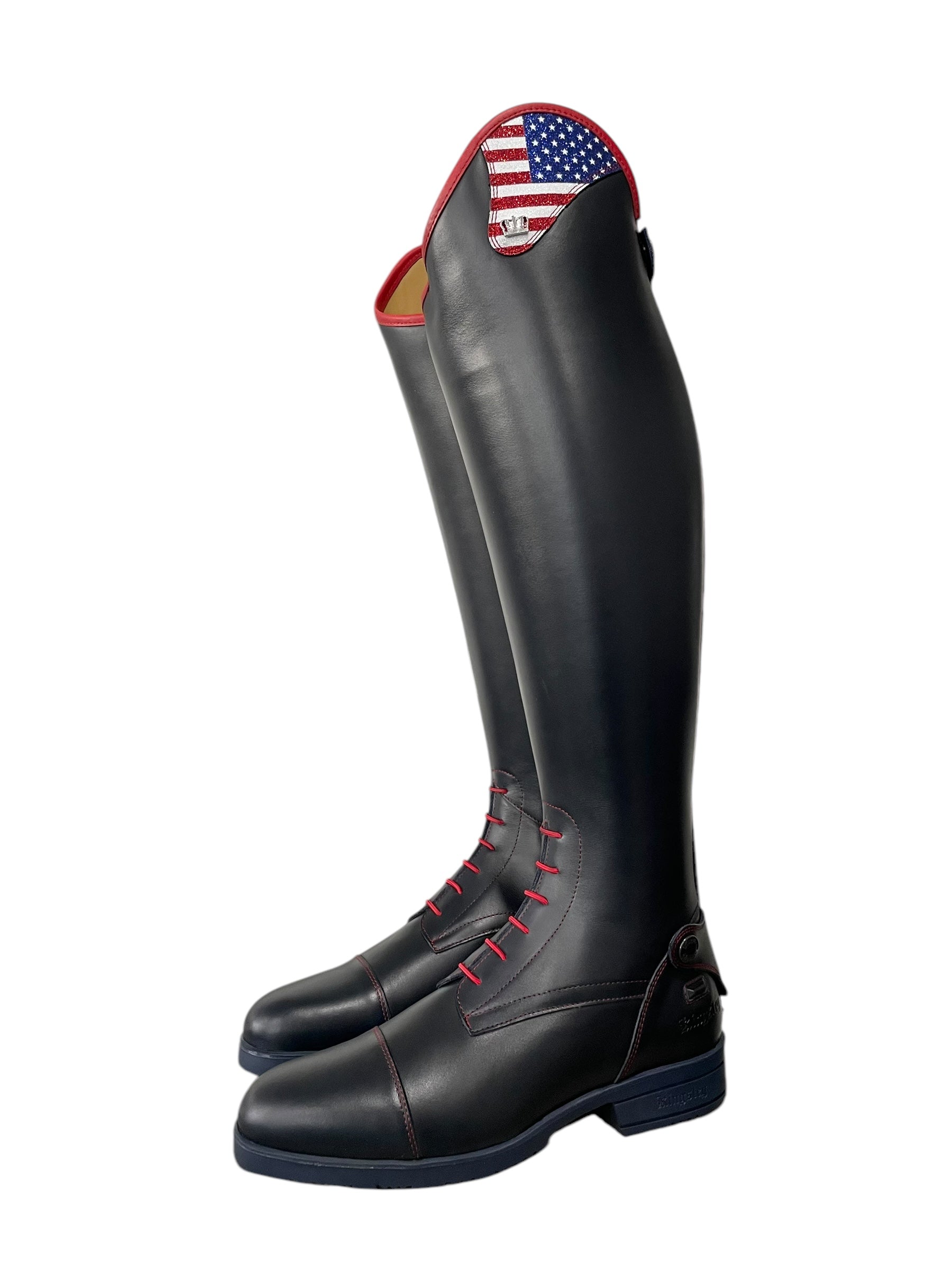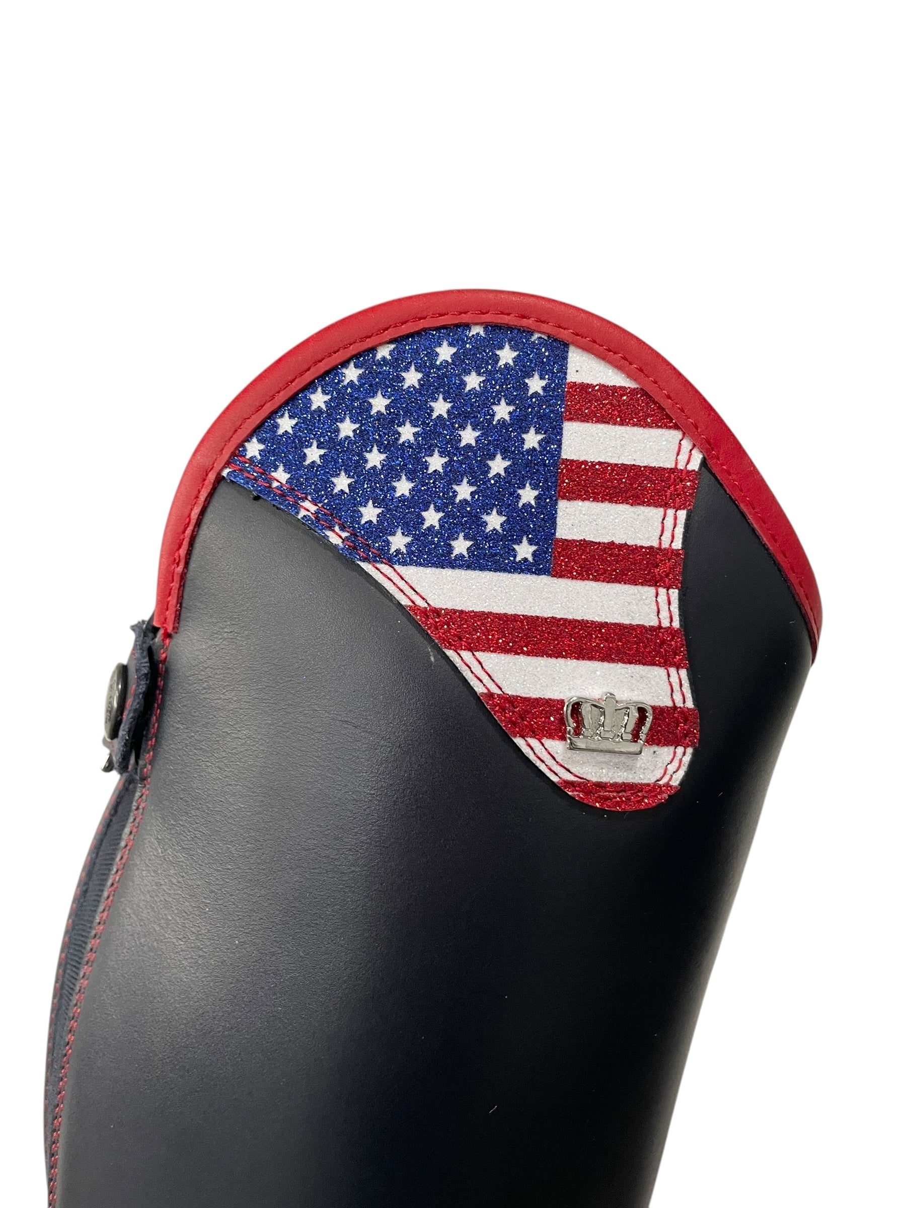 Description: Nature blue base, glitter USA flag top, nature red top piping, red stitching, red laces, navy elastic along the shaft, silver logo crown, and blue outsole.