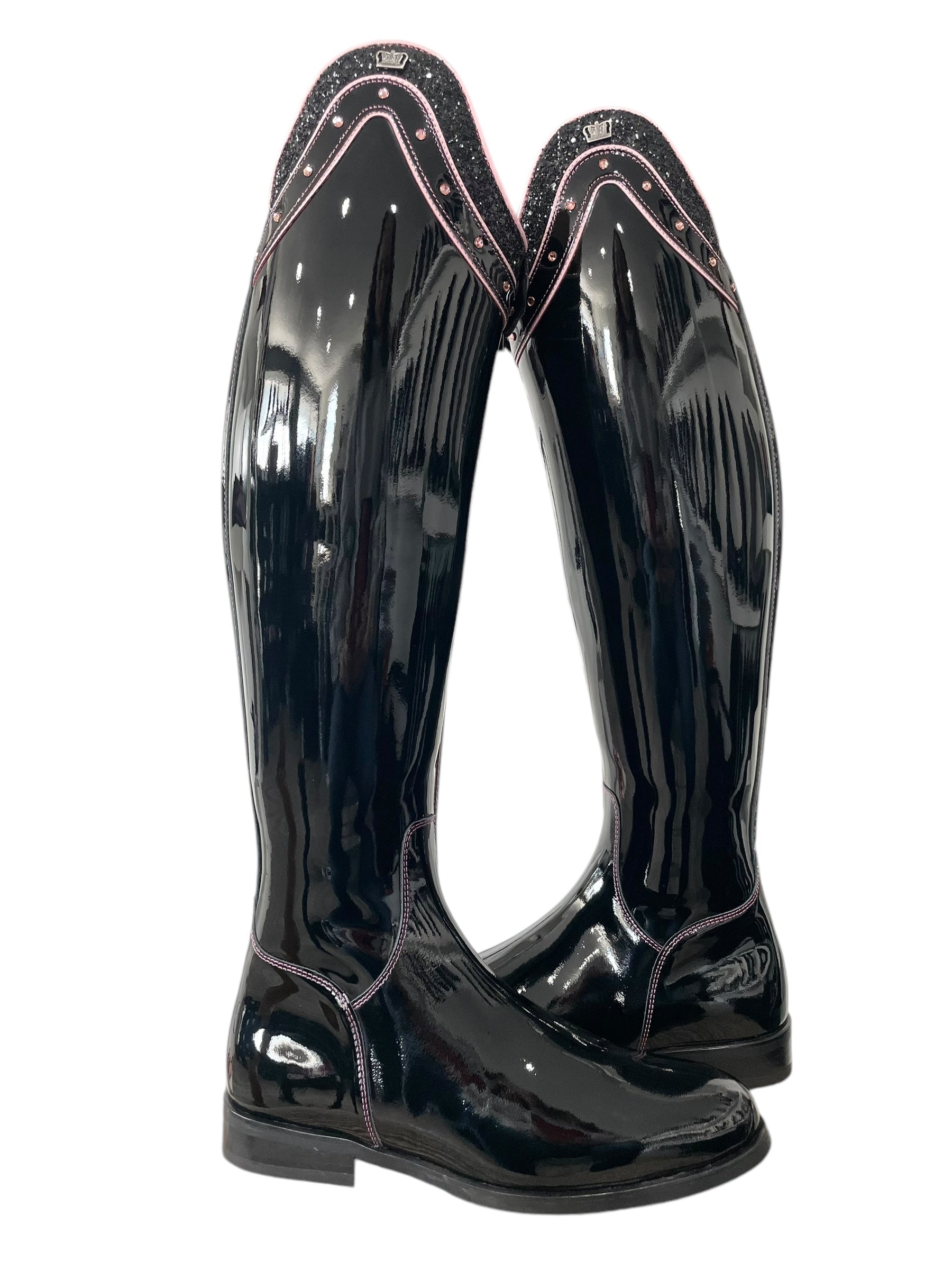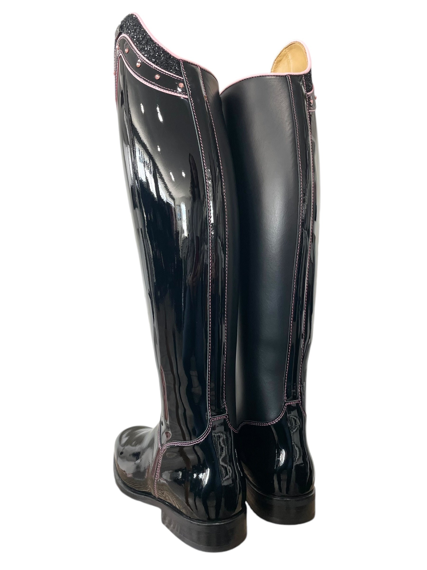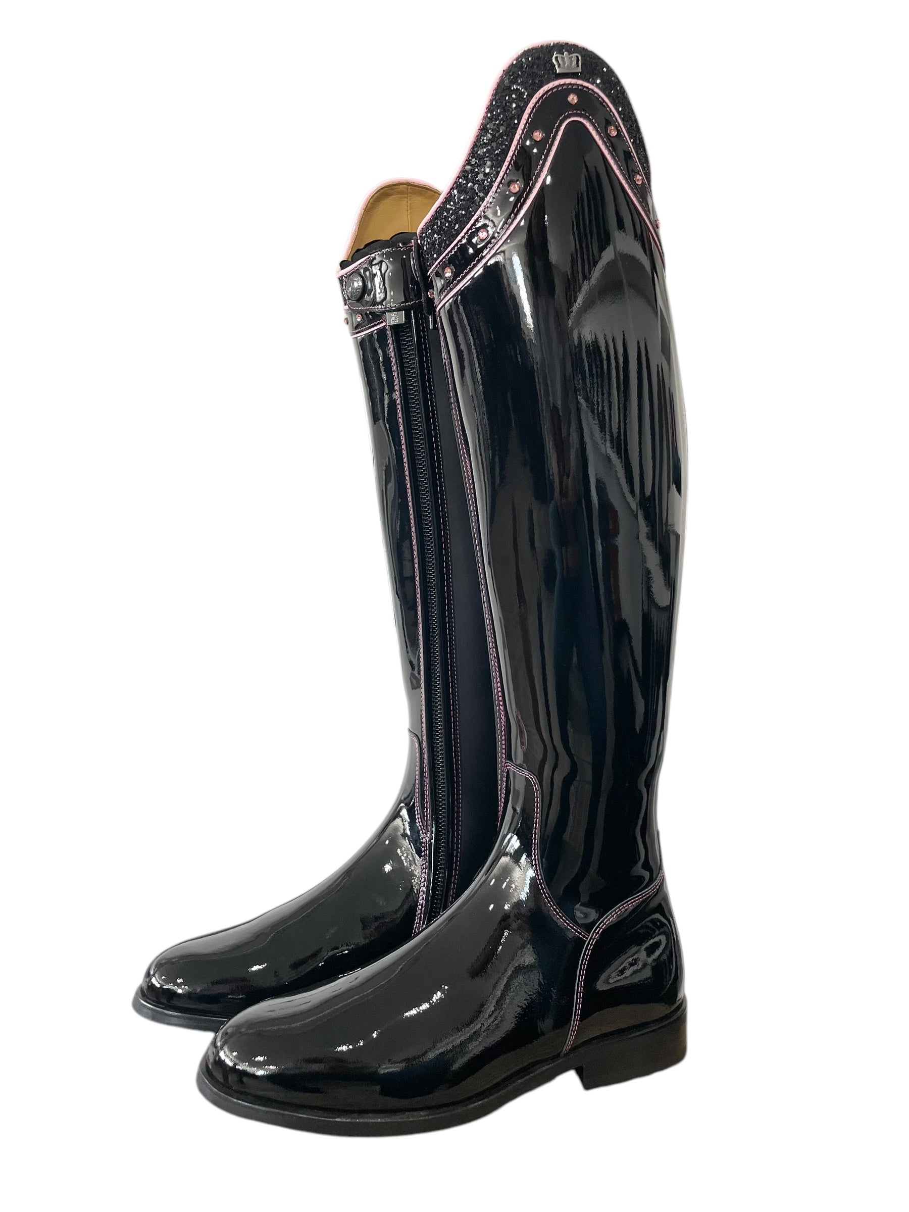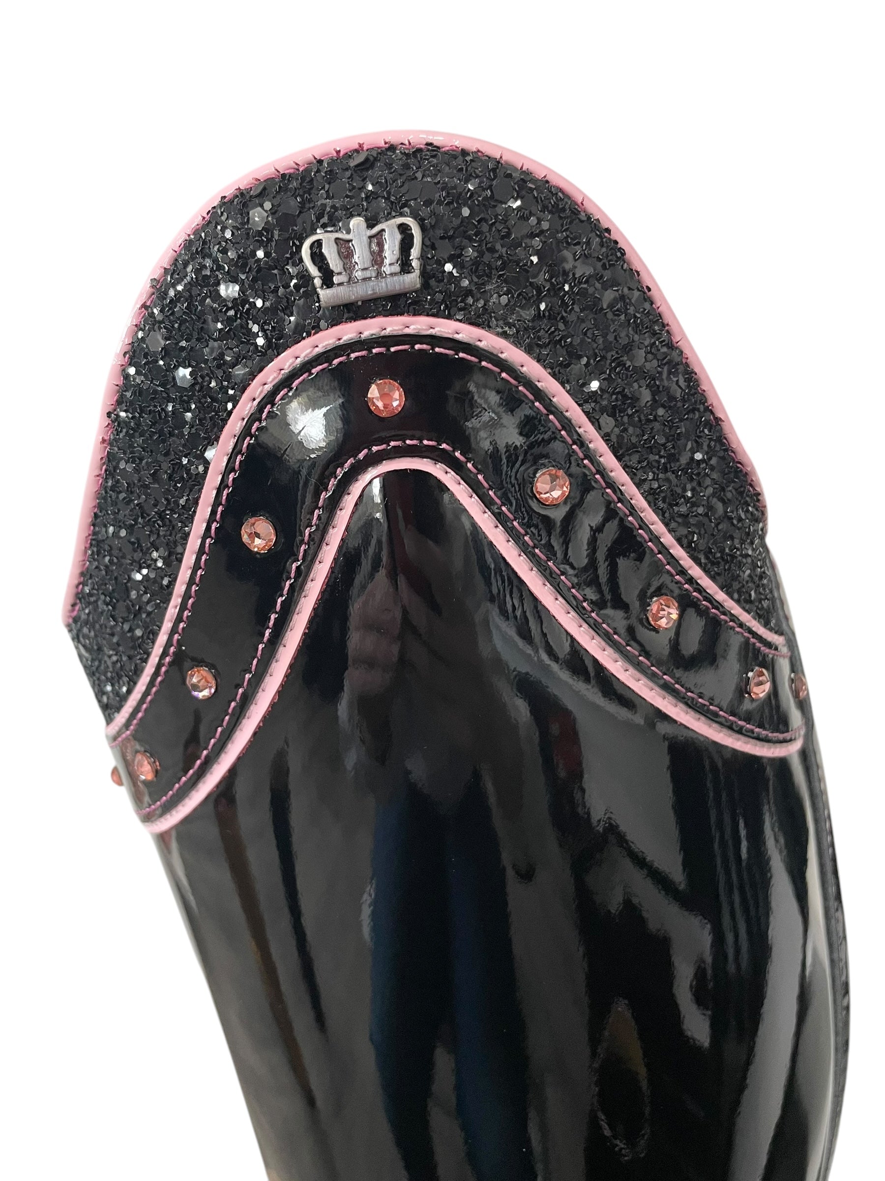 Description: Roma black base, pink stitching, Dulce top in grueso black and roma black with roma rose piping and pink Swarovski crystals, polished black logo crown, and black outsole.