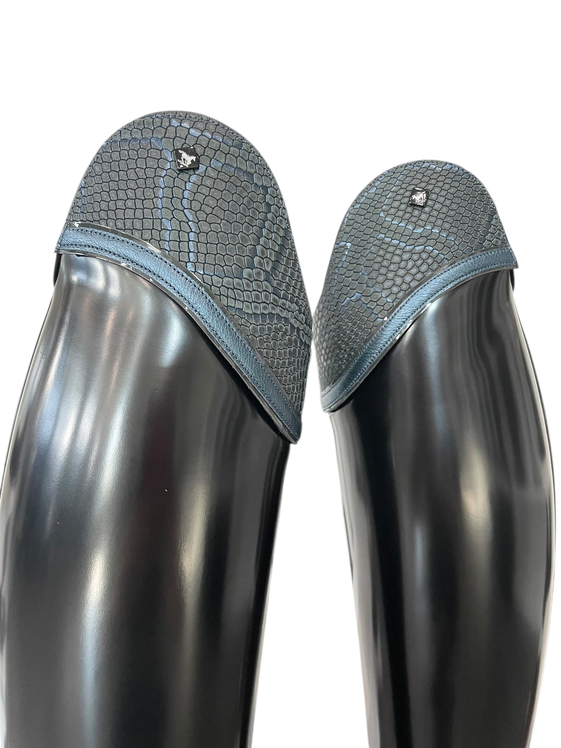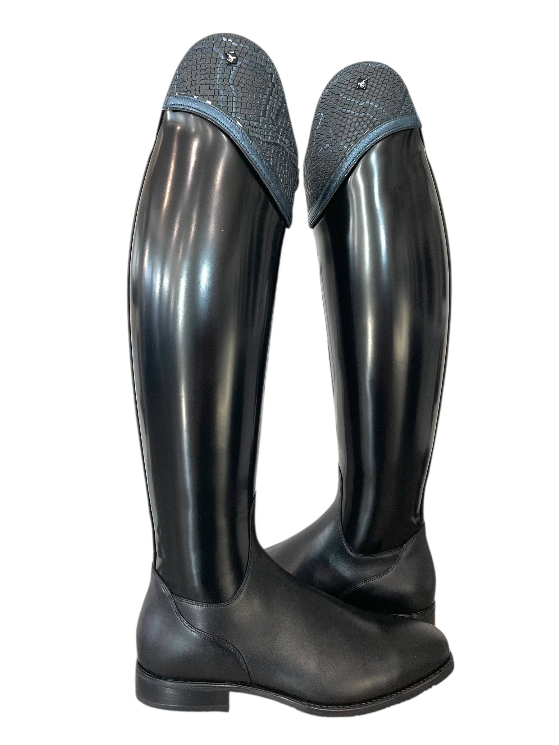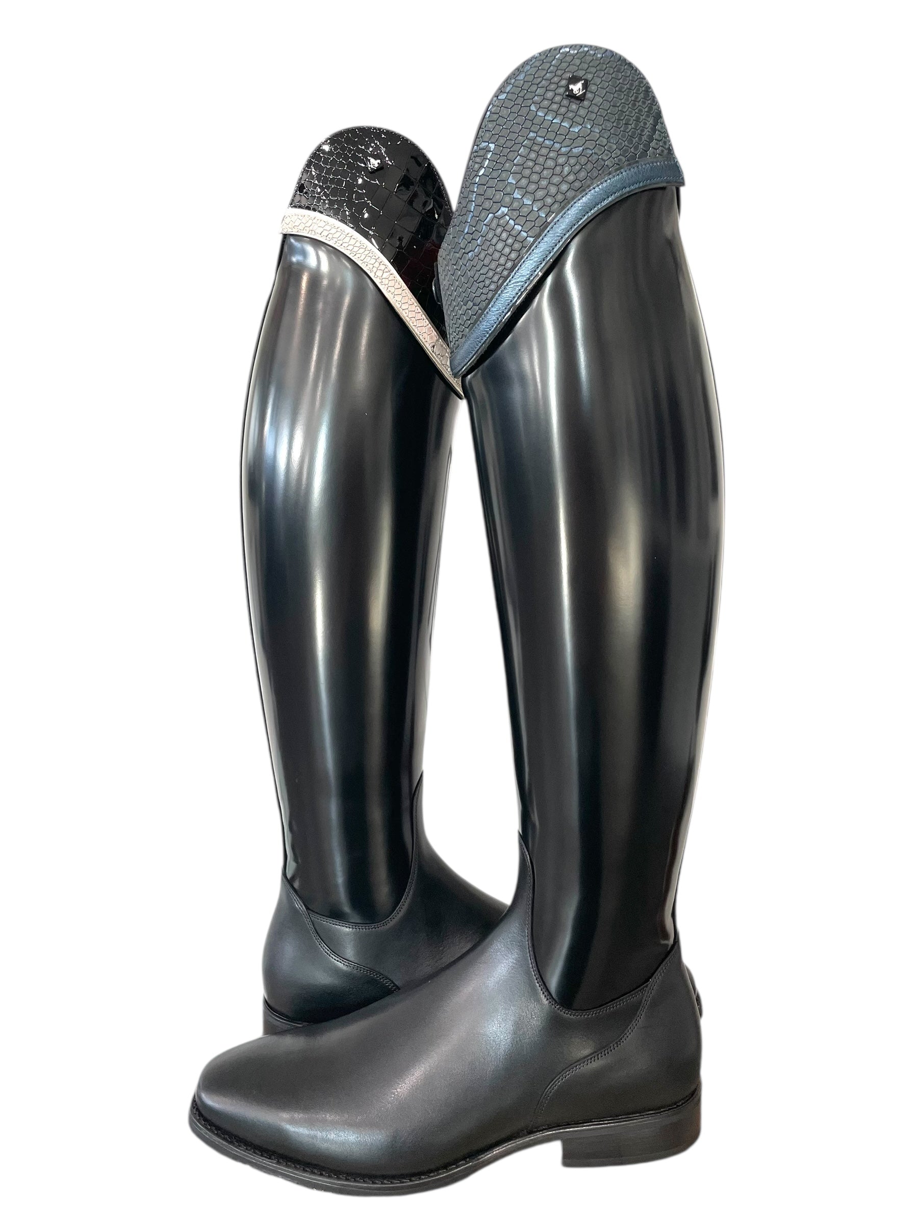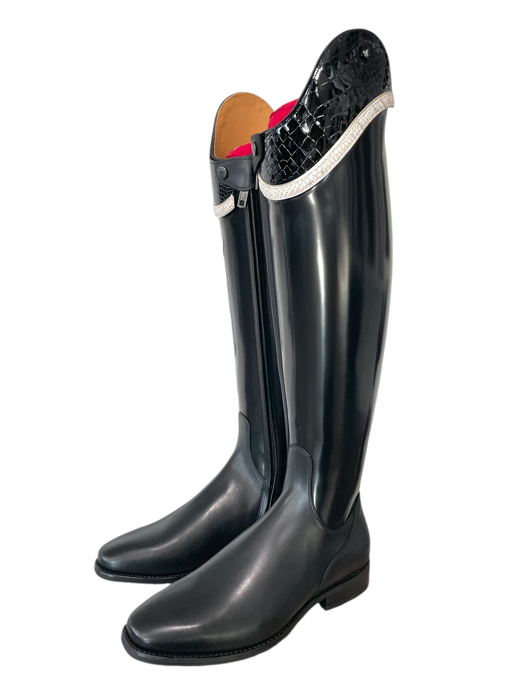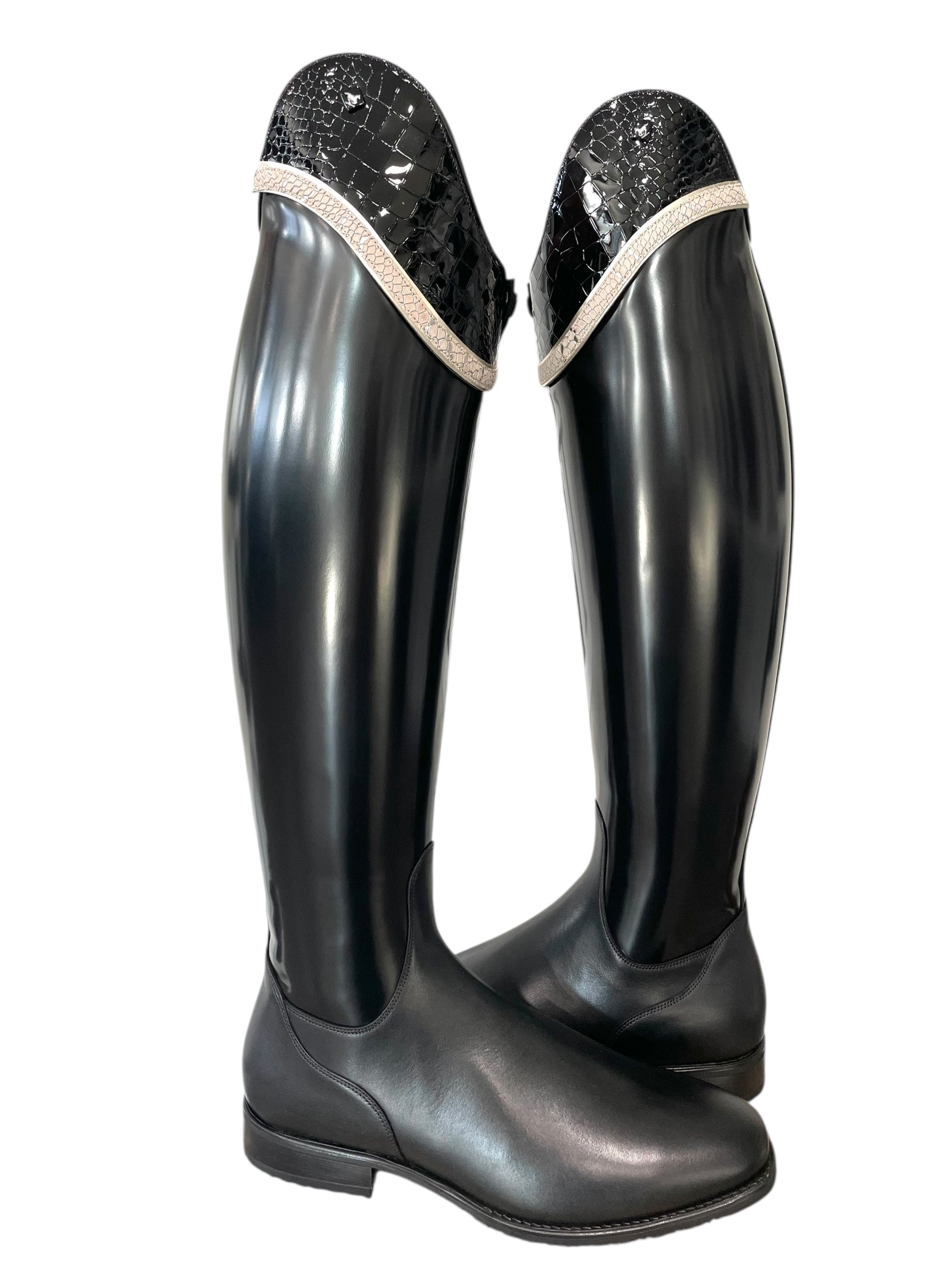 Description: Brushed black base, interchangeable G25 Lisa top (top #1 is patent cocco nero with regal pink strip and luxory 604 piping; top #2 is lucido veato terra with anna grey strip and WRAT brown 527 piping), WRAT black foot, and black outsole.