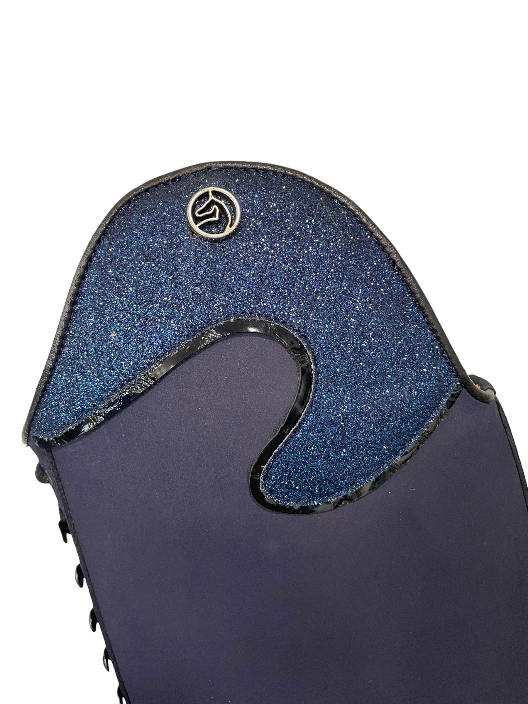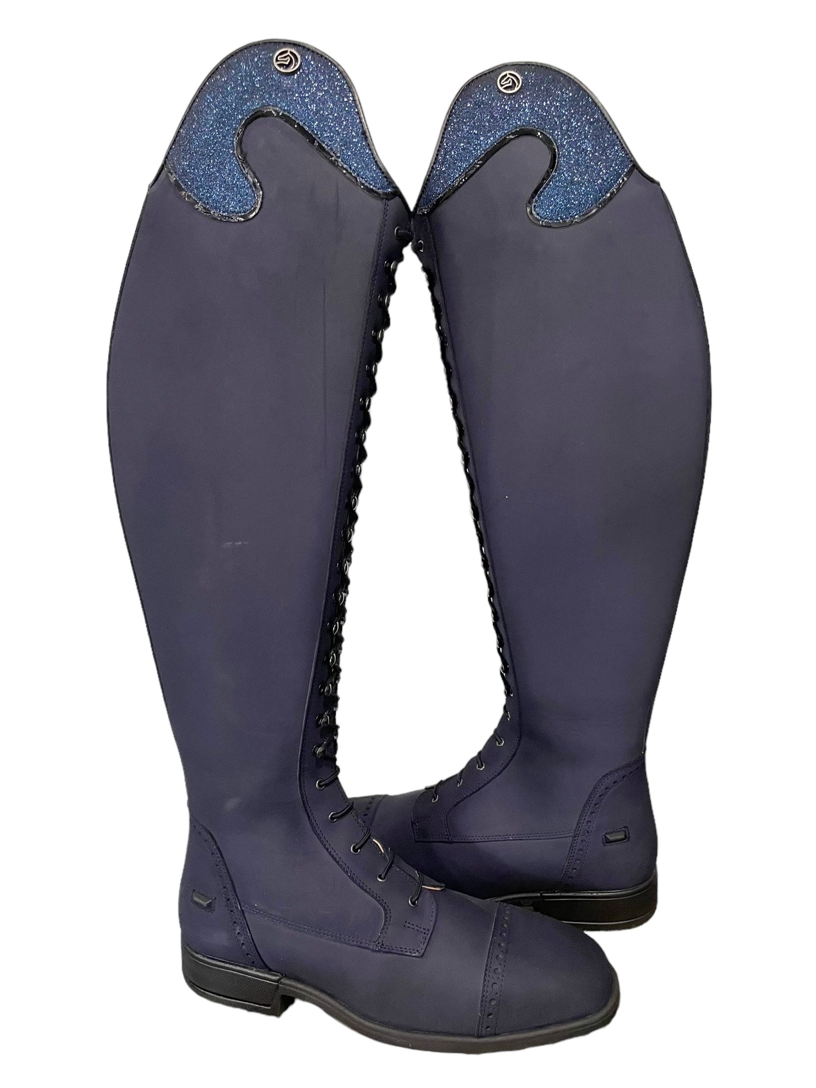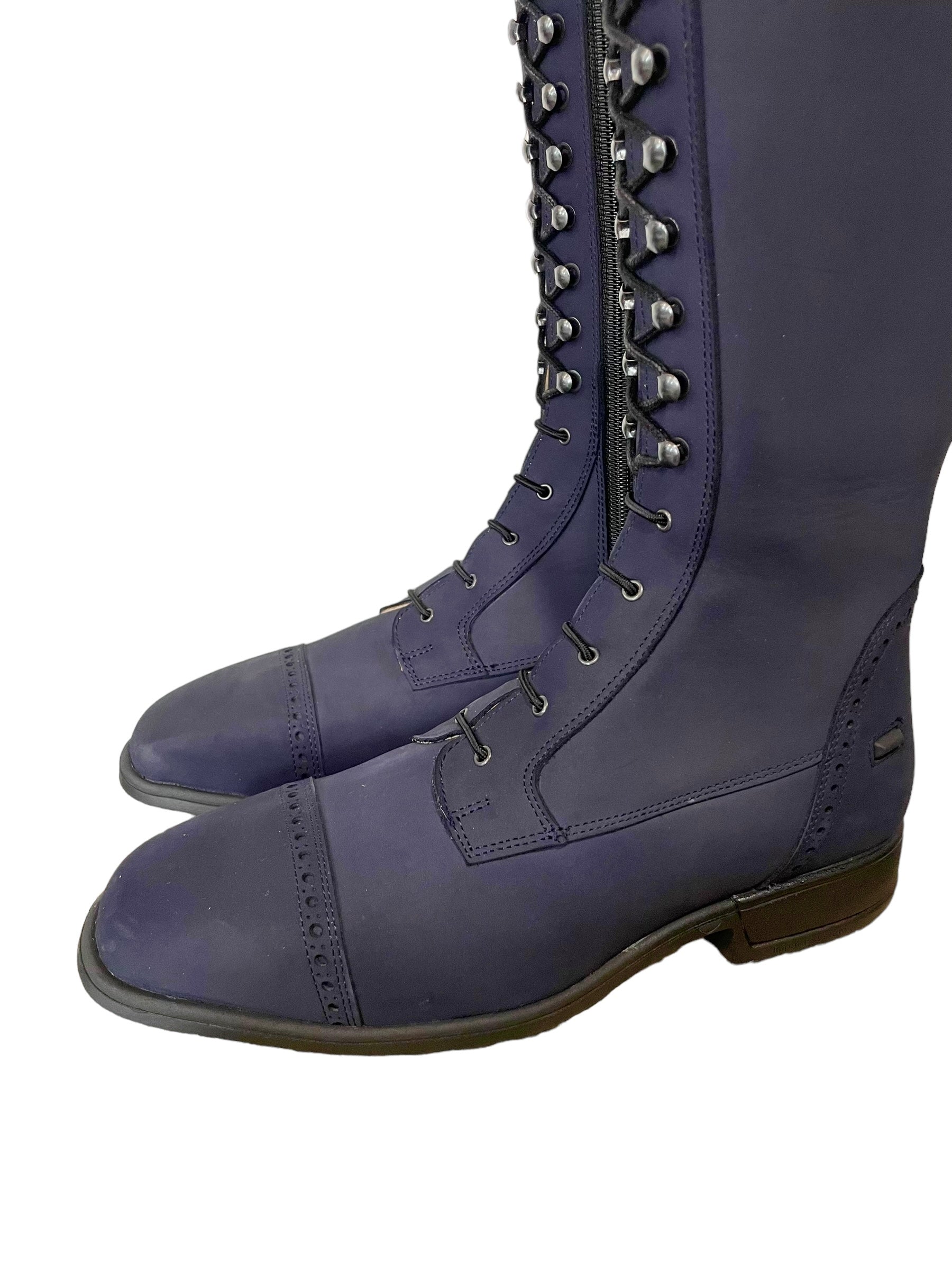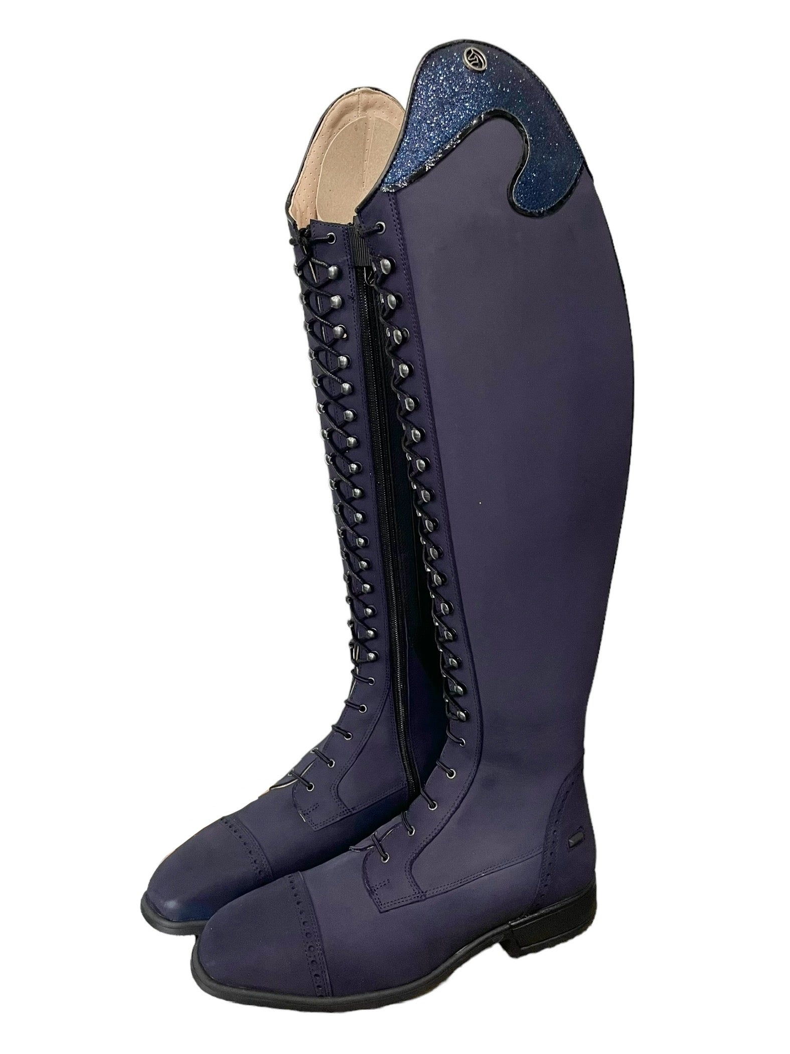 Description: P34 blue nubuck base, B1 toecap with brogues, heel with brogues, T1 top in P37 and P23, S3 spur rests, black laces, and S2 black outsole.