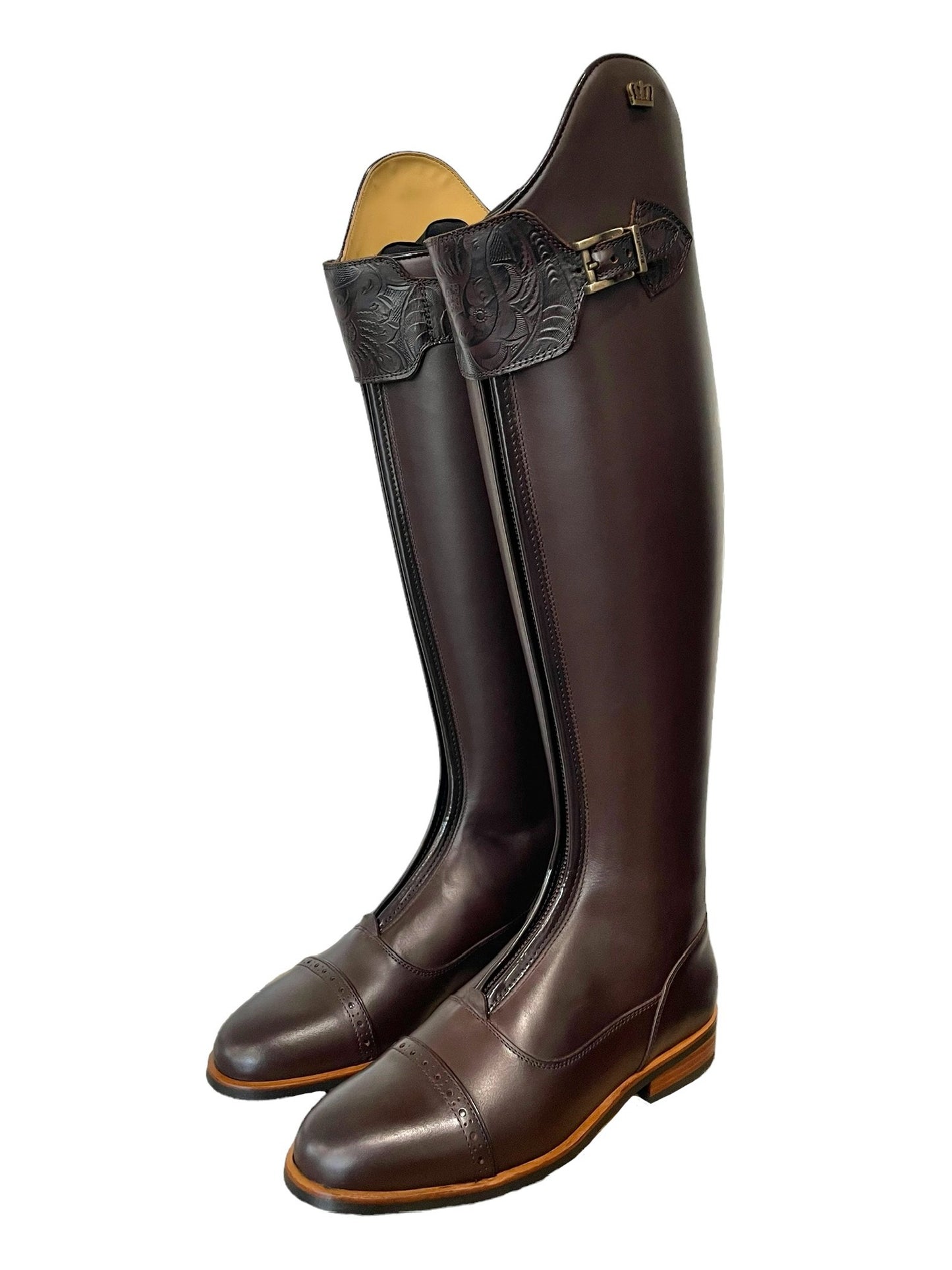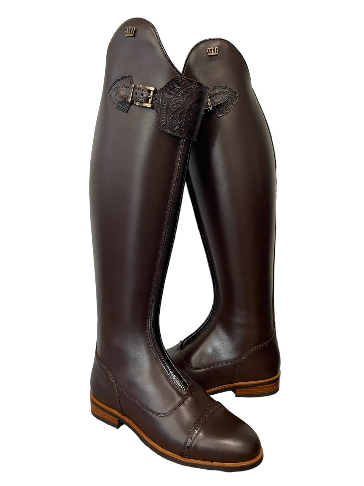 Description: Nature brown base, uragano dark brown parts along the zipper, engraved brown top strap, toecap with brogues with uragano dark brown piping/ underlayer, old gold logo and buckle, and brown outsole.