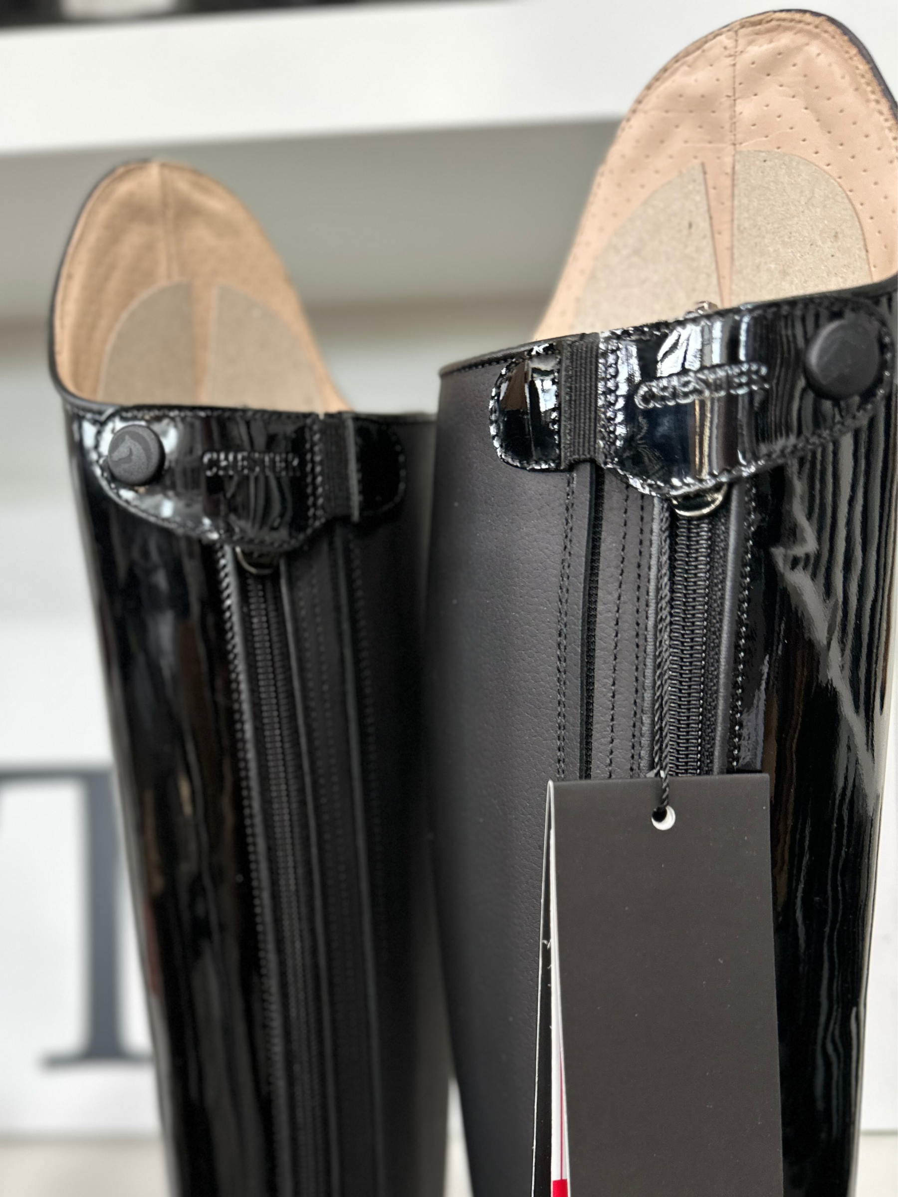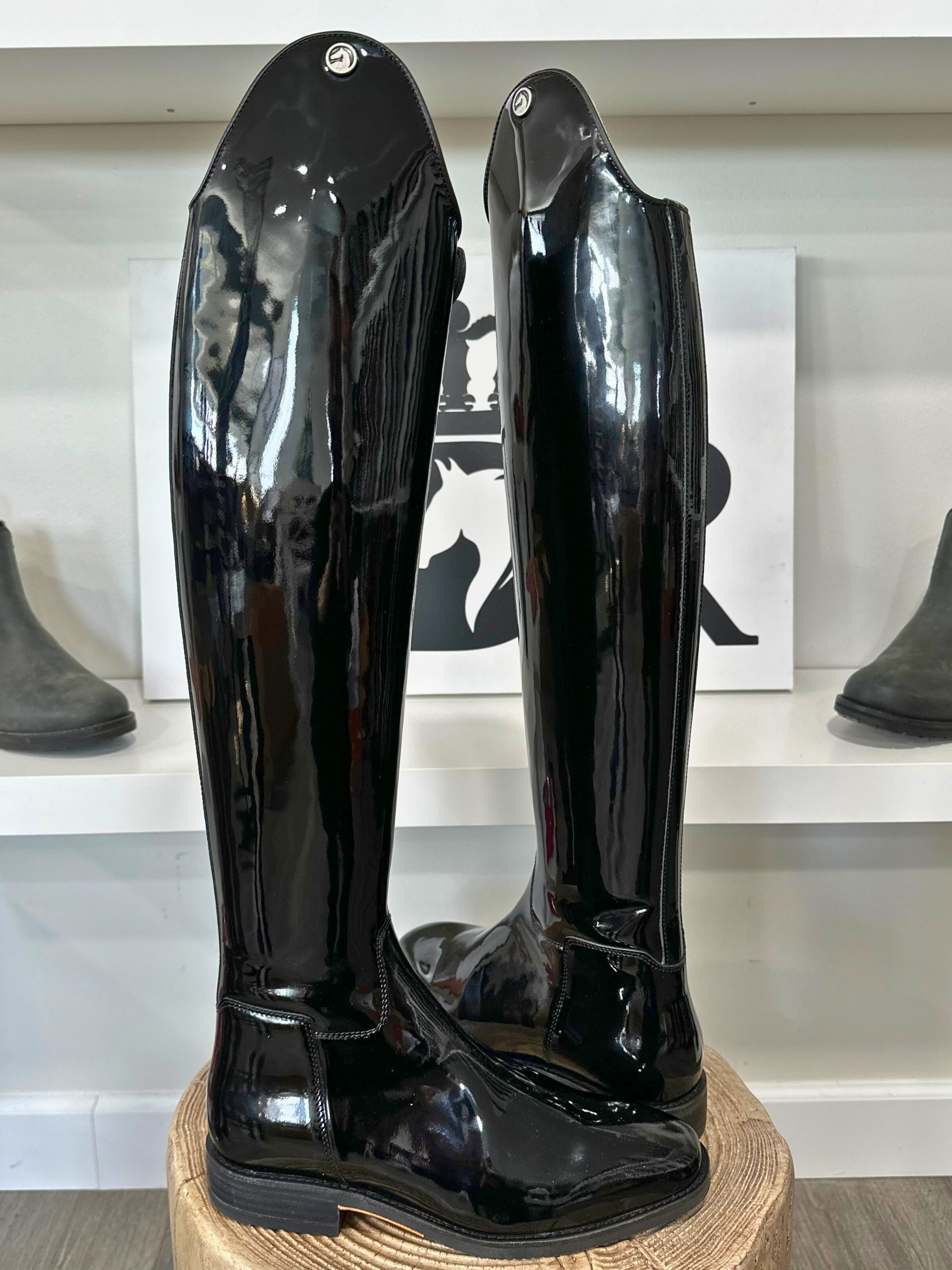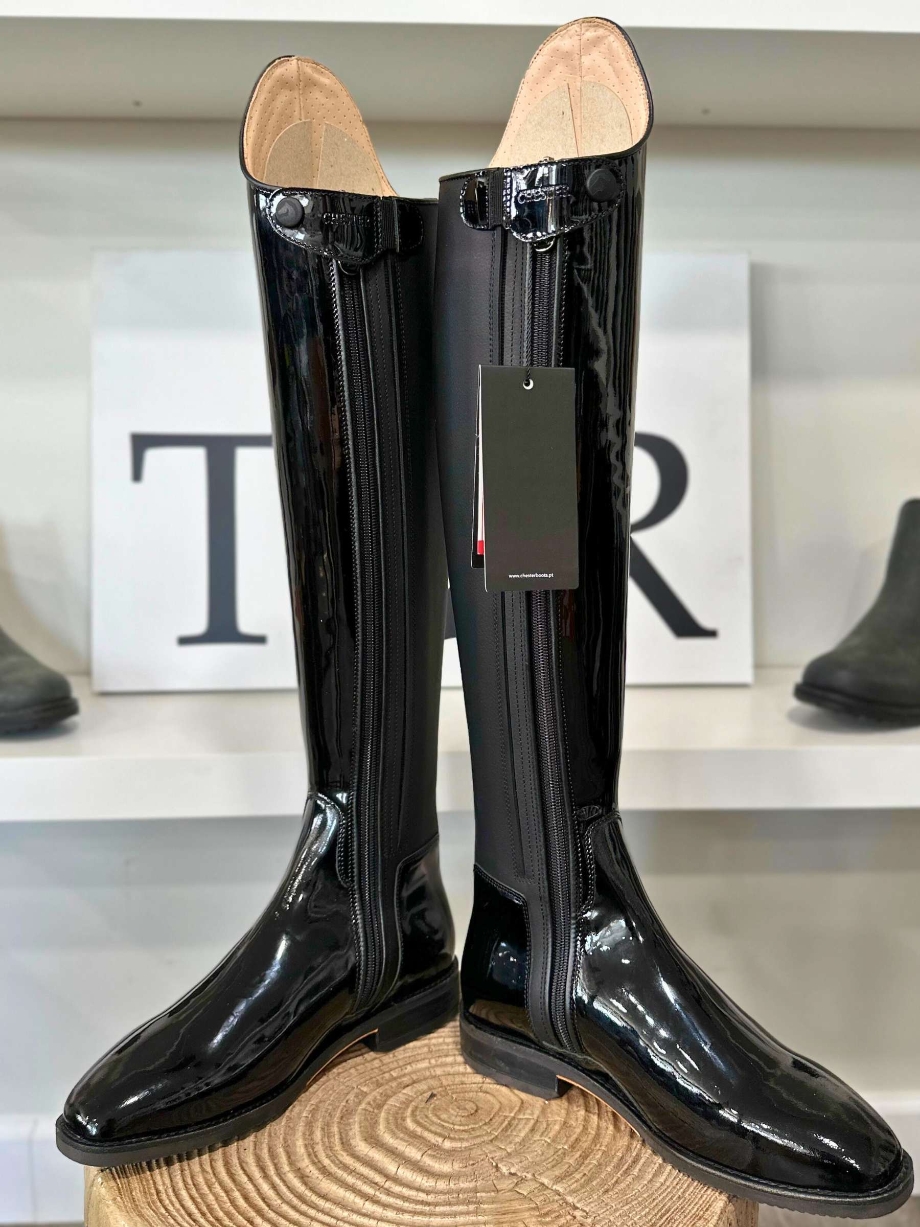 Description: Patent black base, inner grip panel, elastic stretch panel, and black outsole.