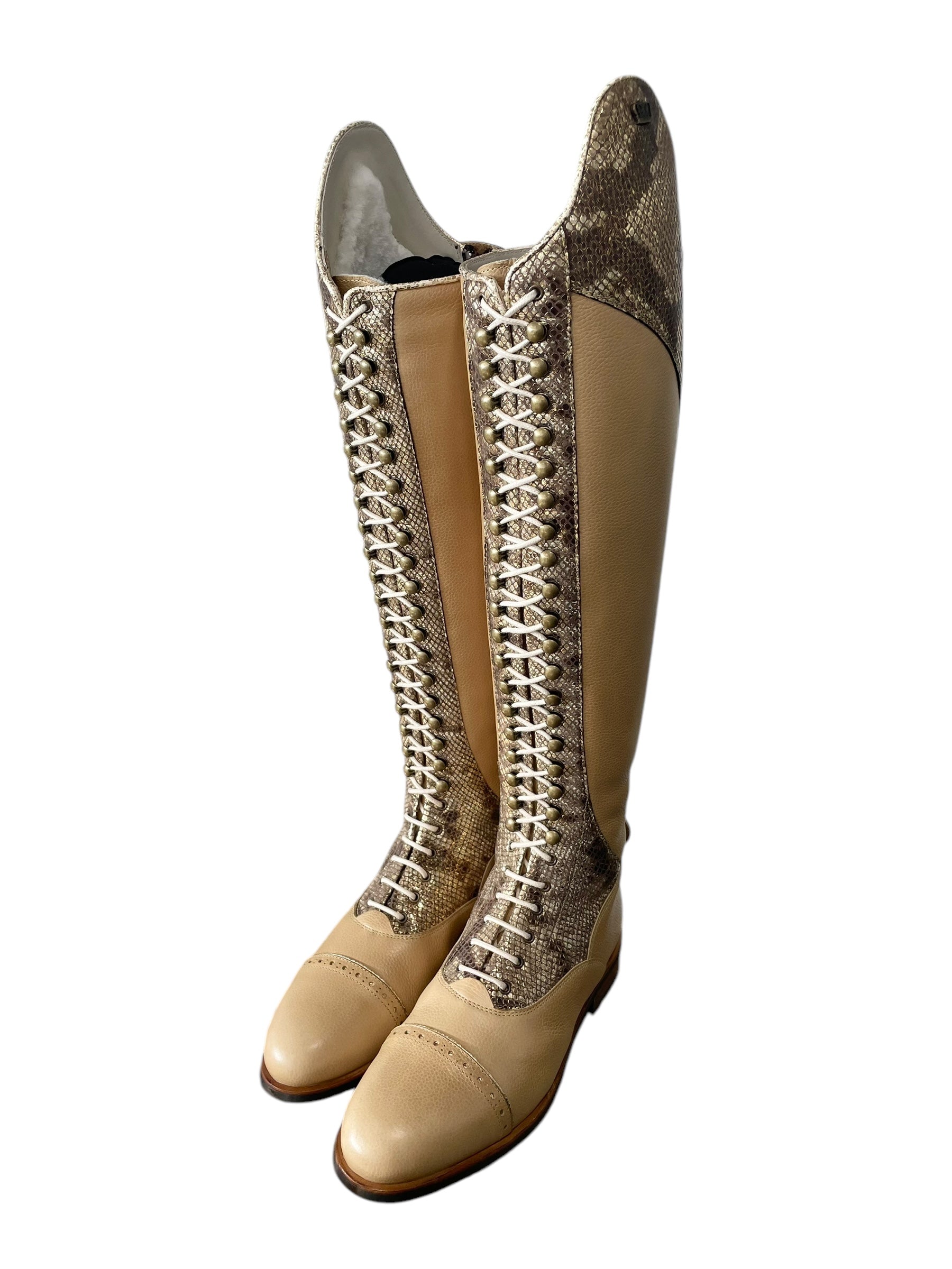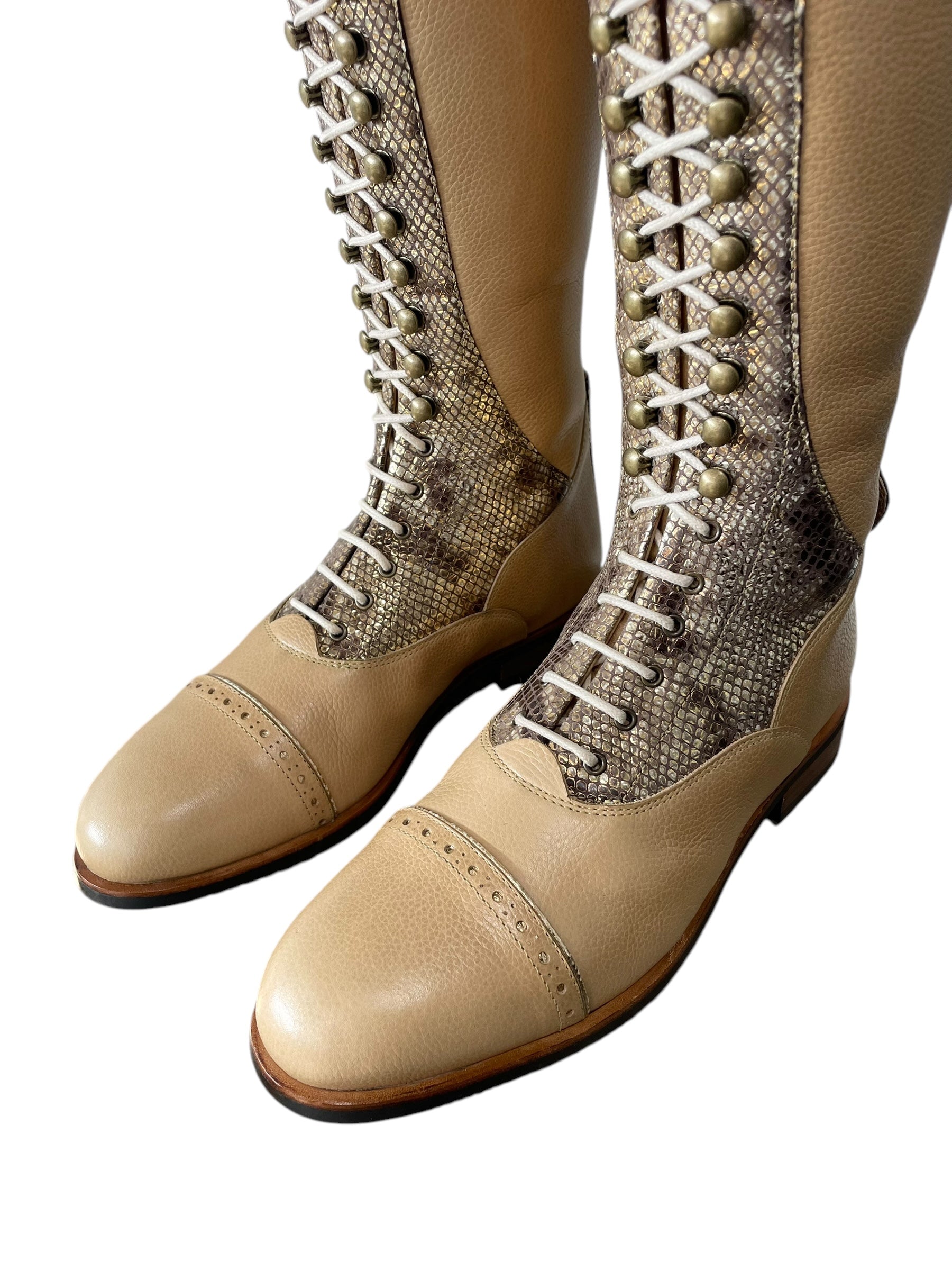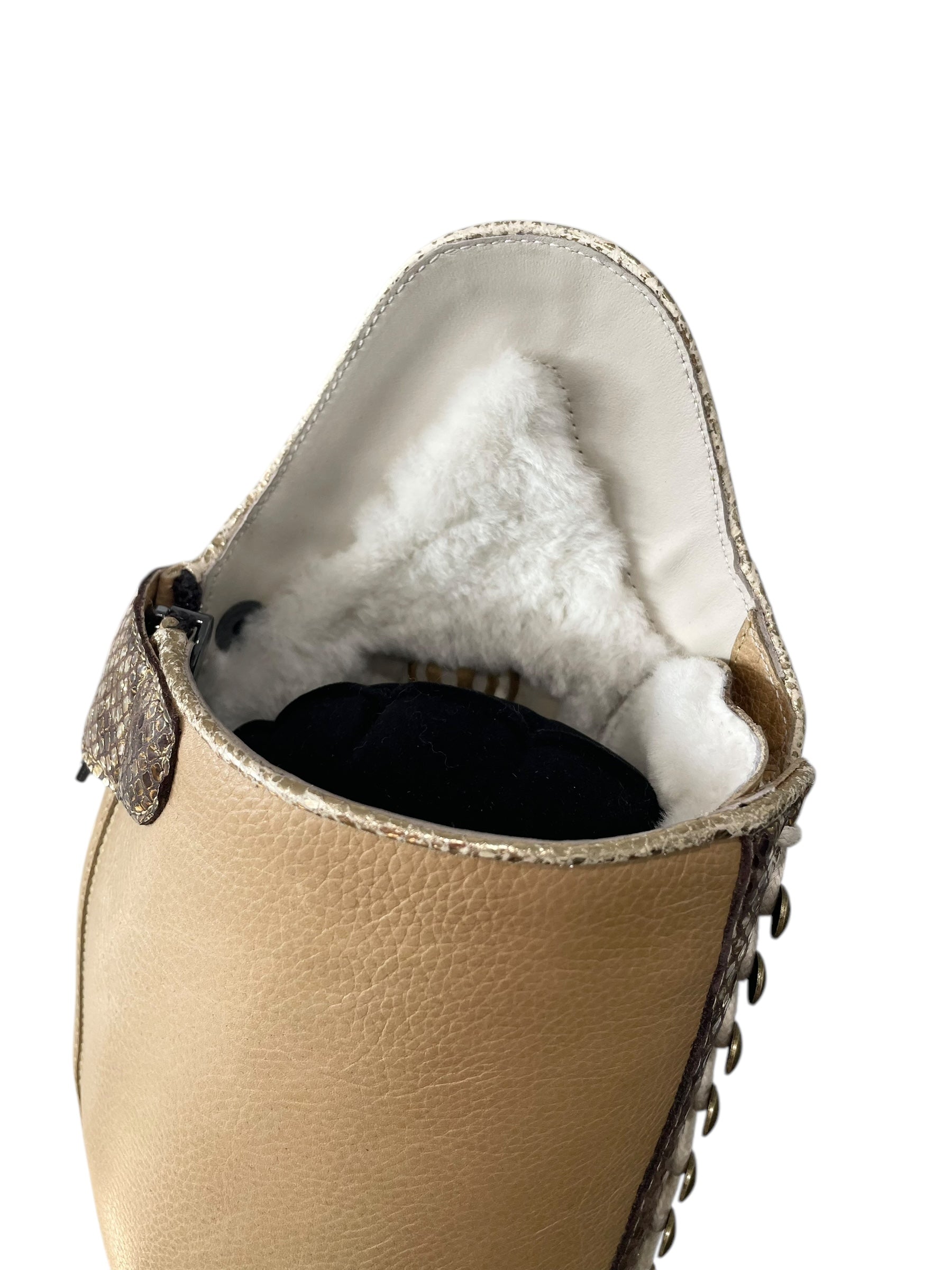 Description: Paxson oat base, Paula top in morphin gold, morphin gold zip protectors and instep, top and toecap piping in crack gold, creme laces, white sheepskin lining, old gold logo crown and hooks, and brown outsole.