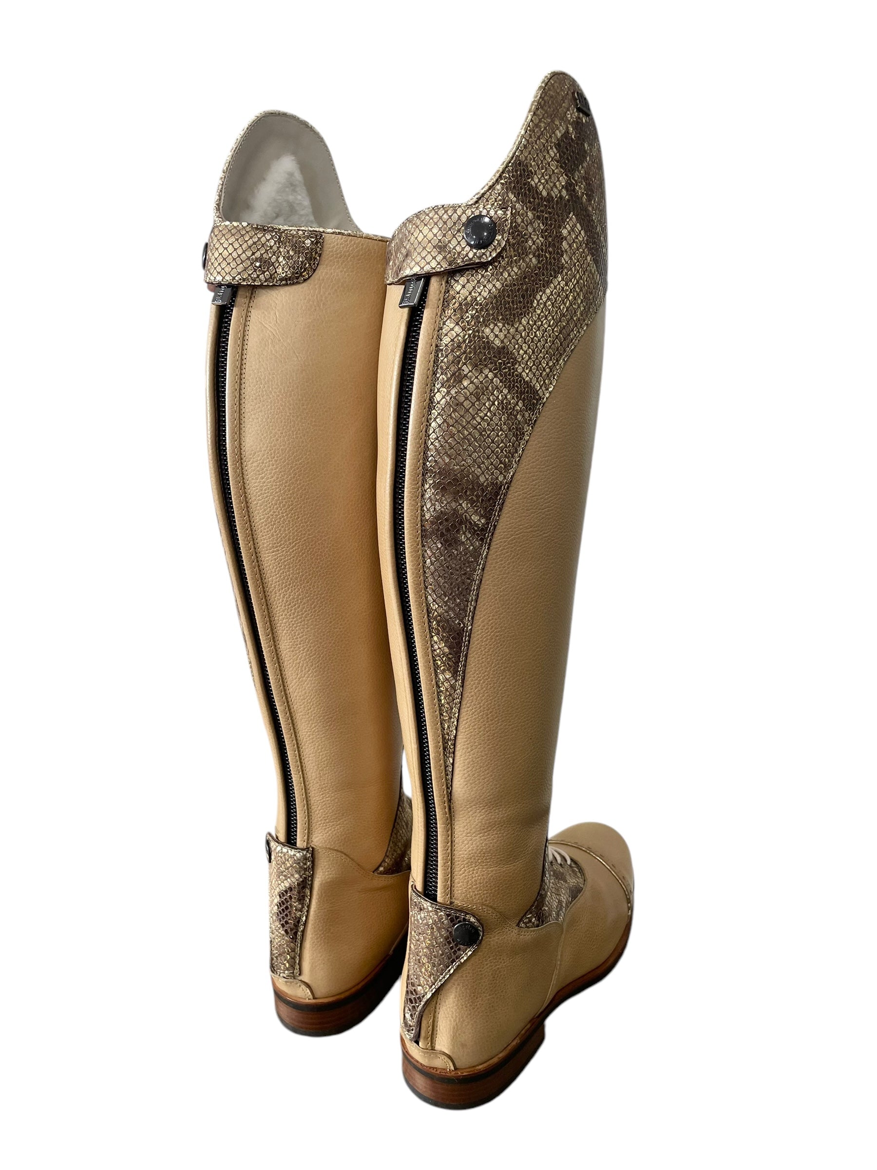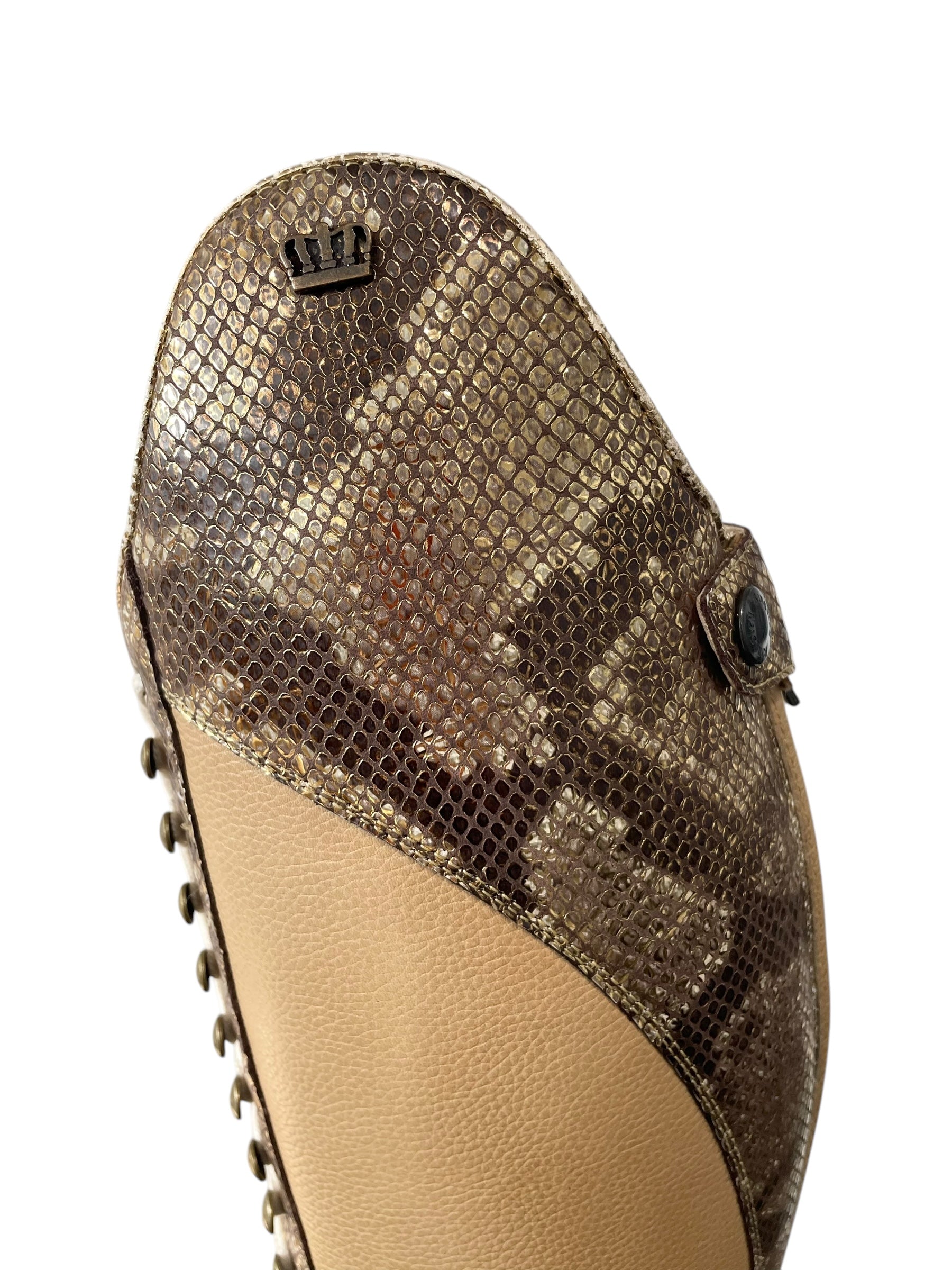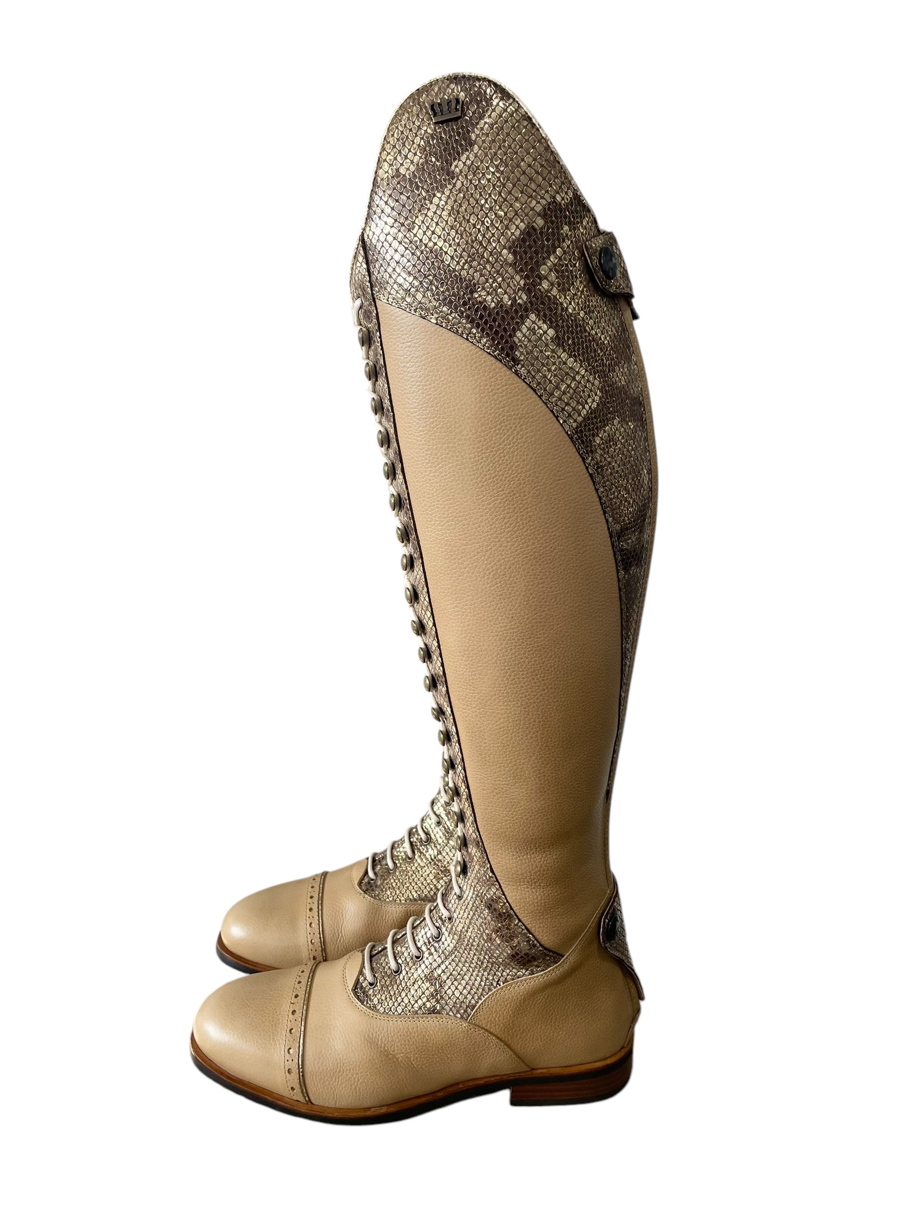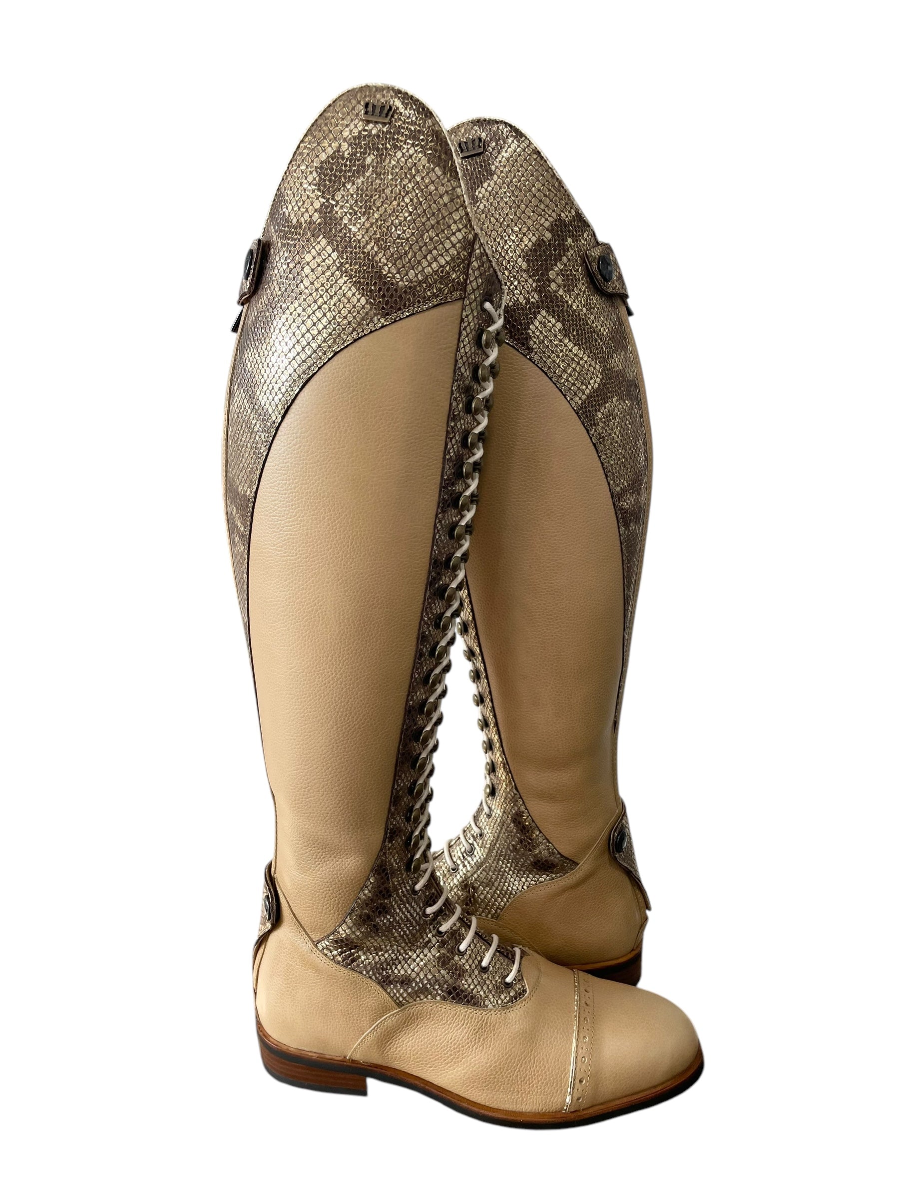 Description: Paxson oat base, Paula top in morphin gold, morphin gold zip protectors and instep, top and toecap piping in crack gold, creme laces, white sheepskin lining, old gold logo crown and hooks, and brown outsole.