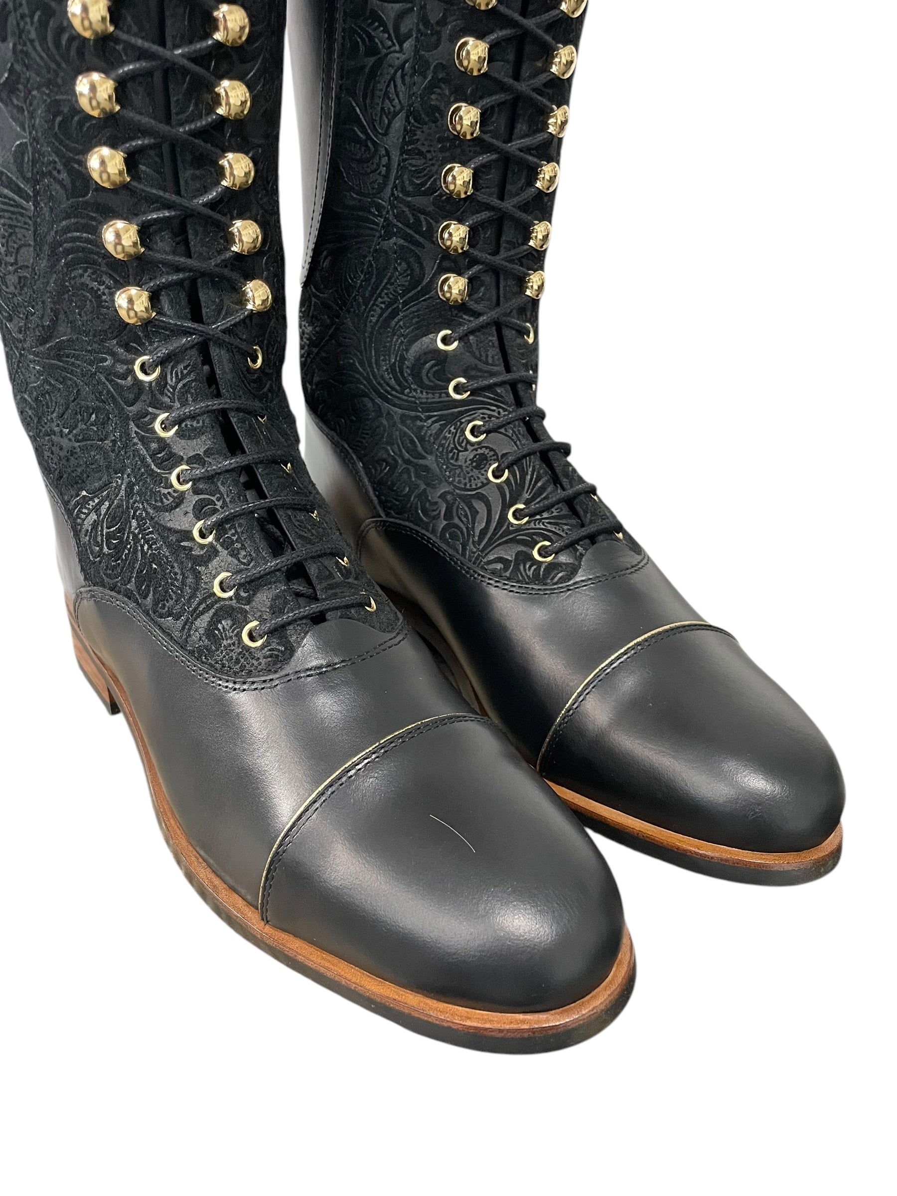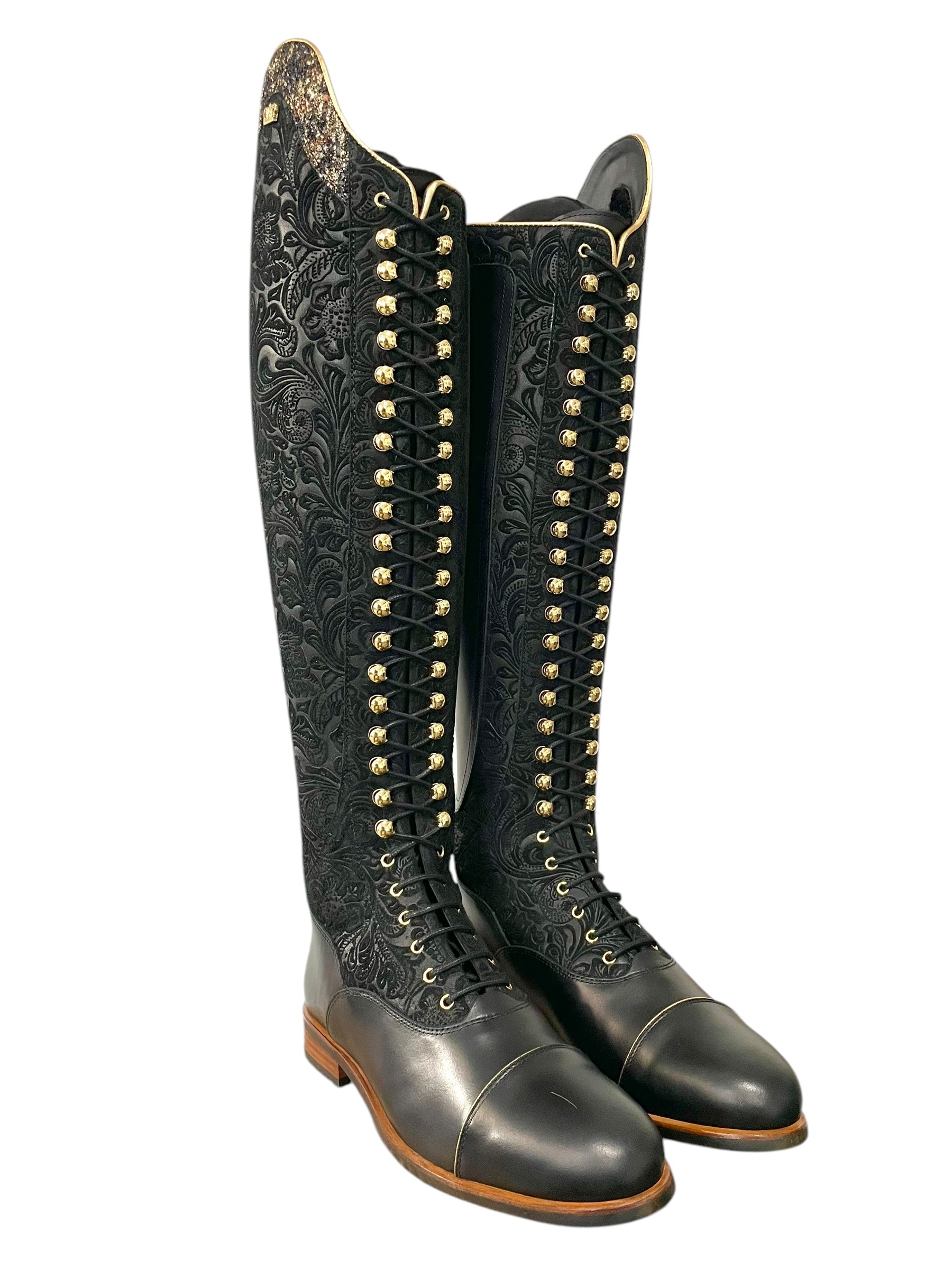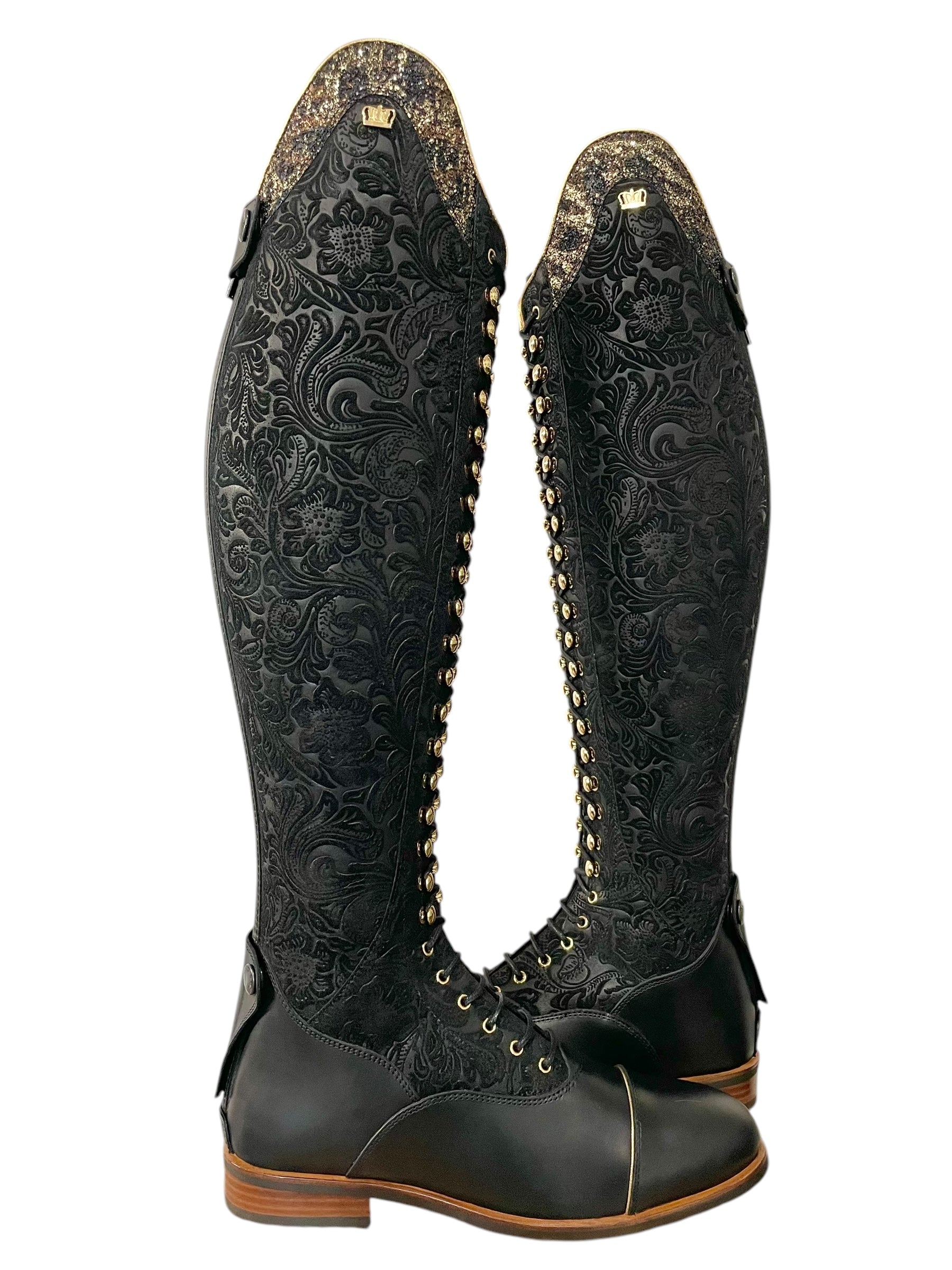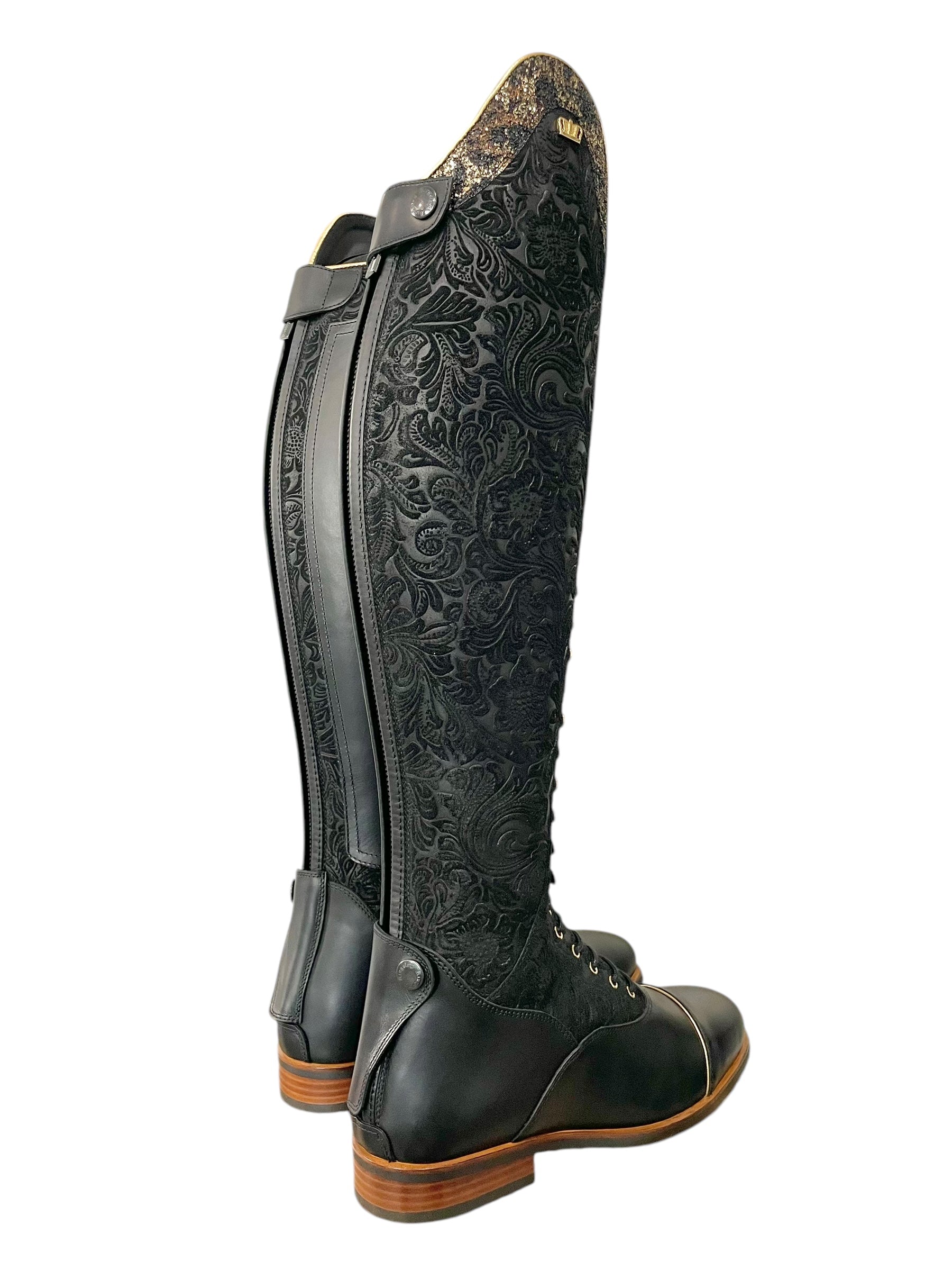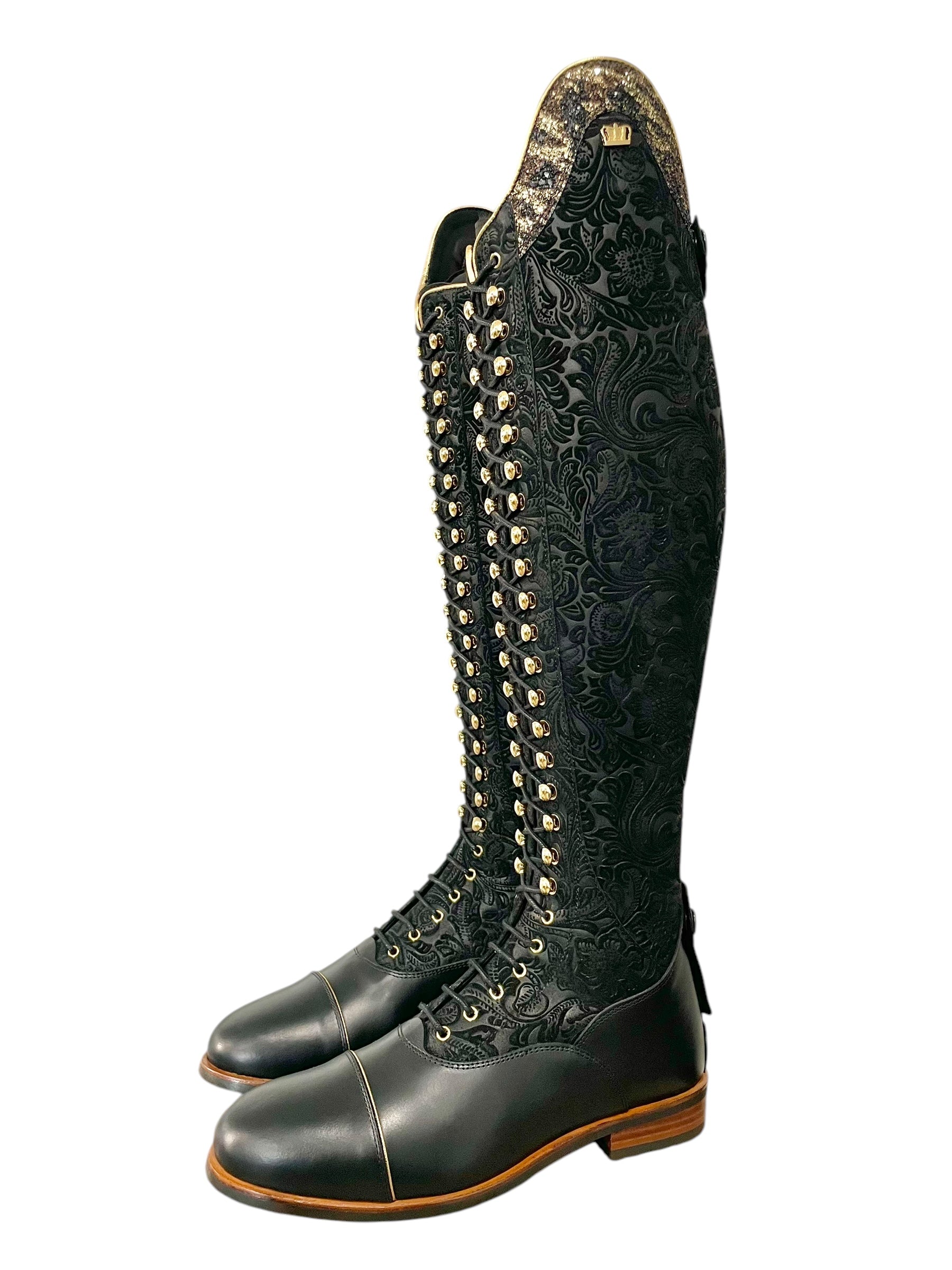 Description: Floral black base, nature black foot, zip protectors, inside patch, and parts along the zipper, toecap with gold piping, Jenny top in gold snake with gold piping, black laces, black sheepskin lining, gold hooks and logo crown, and brown outsole.