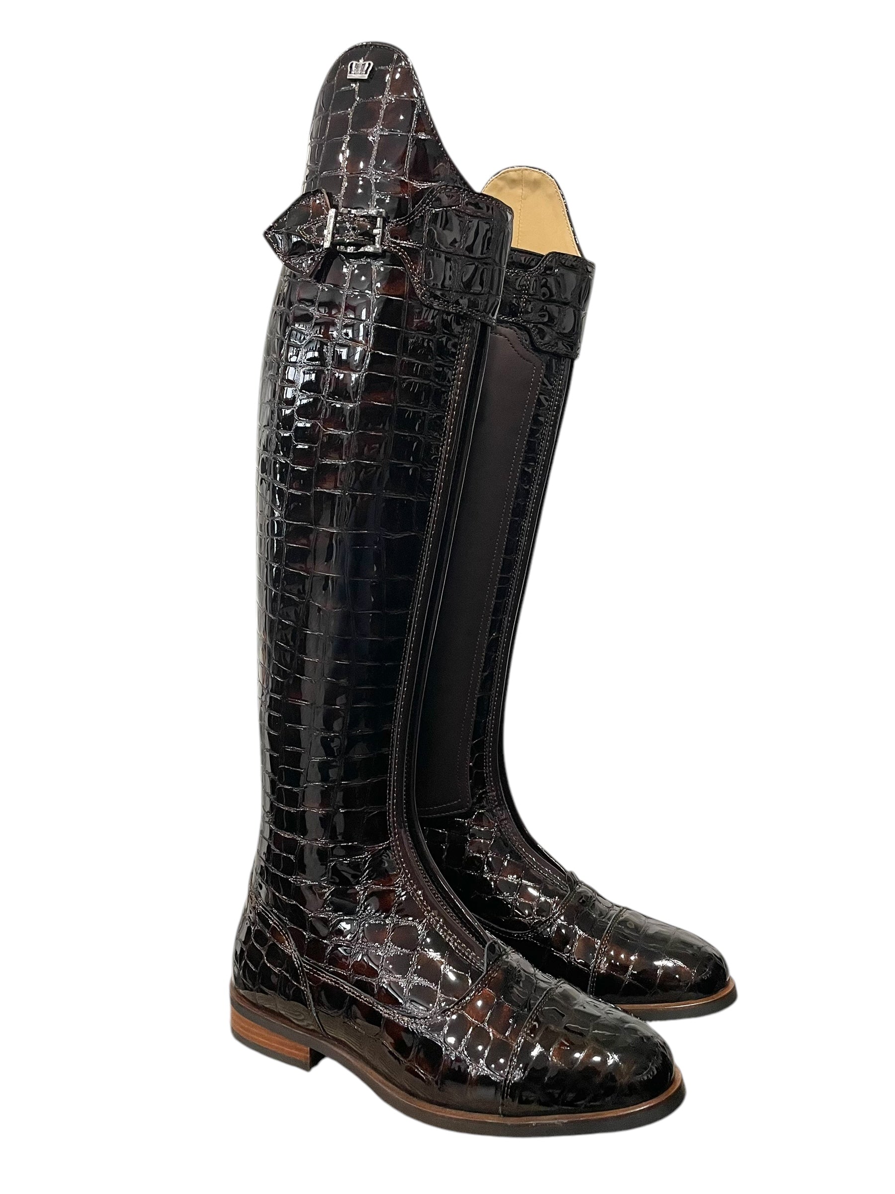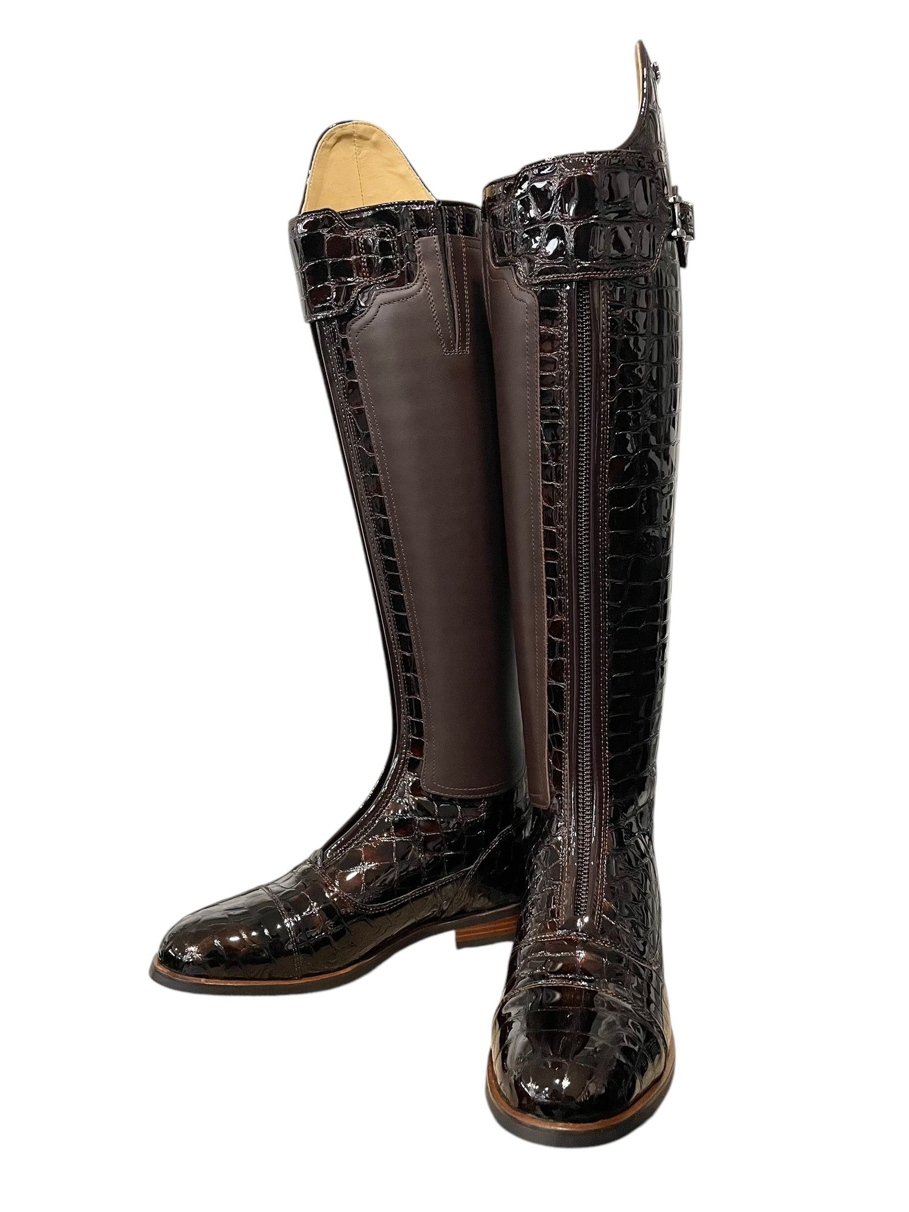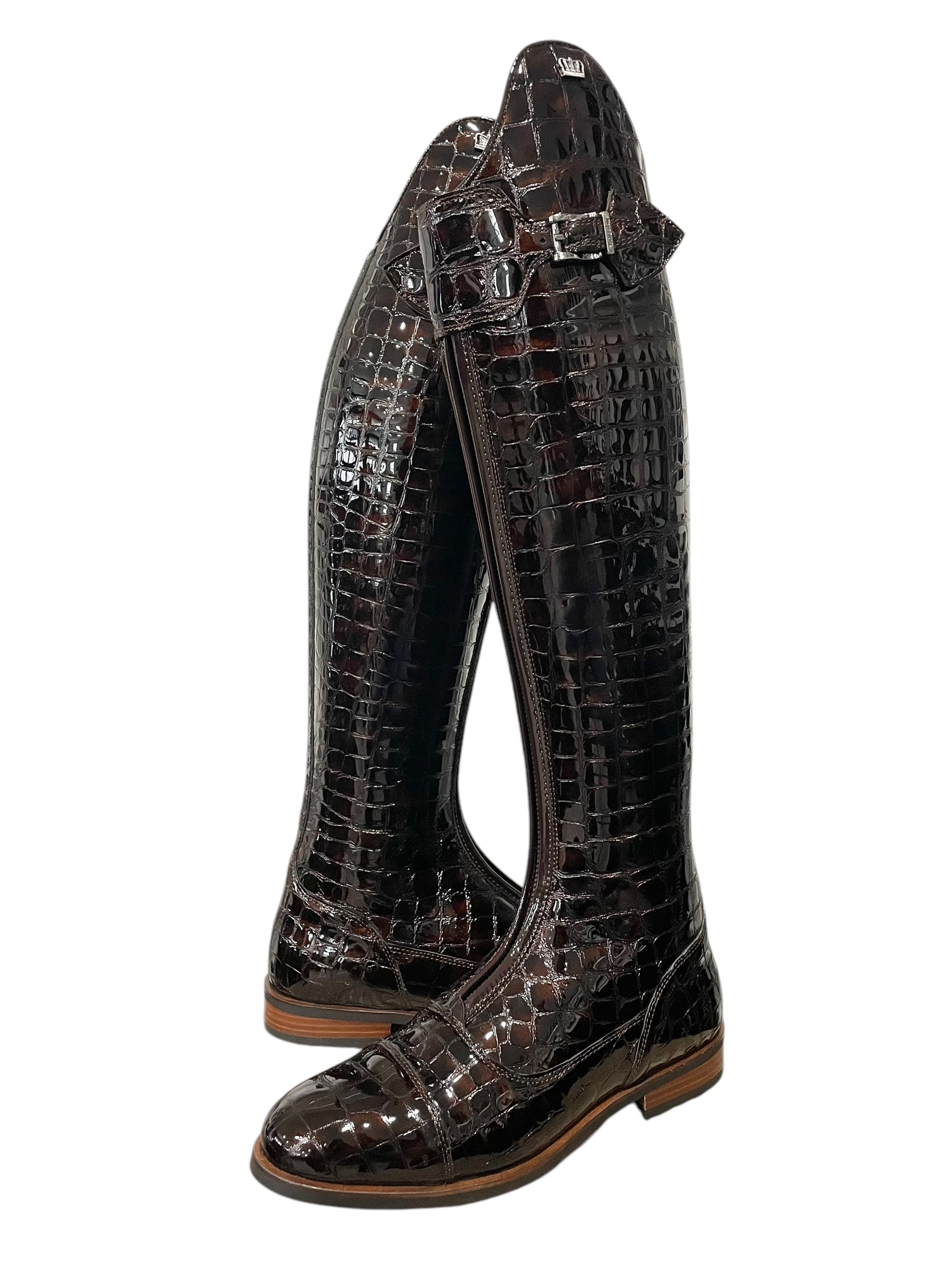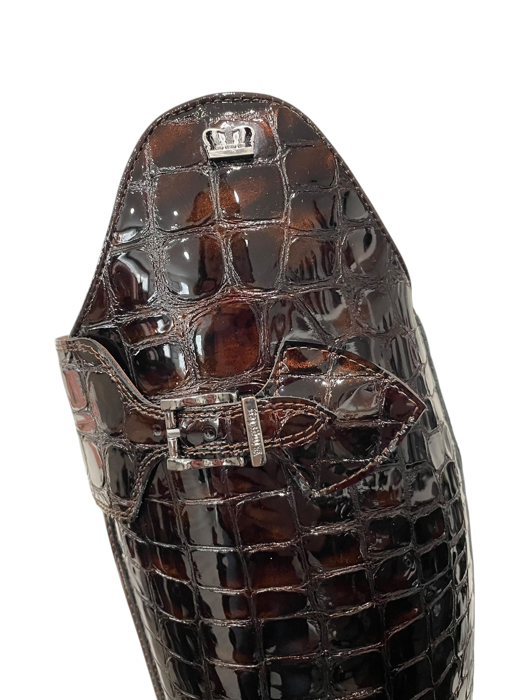 Description: Croco bril castanho base, nature brown inside patch, top piping and parts along the zipper in roma castanho, polished black logo crown and buckle, and brown outsole.