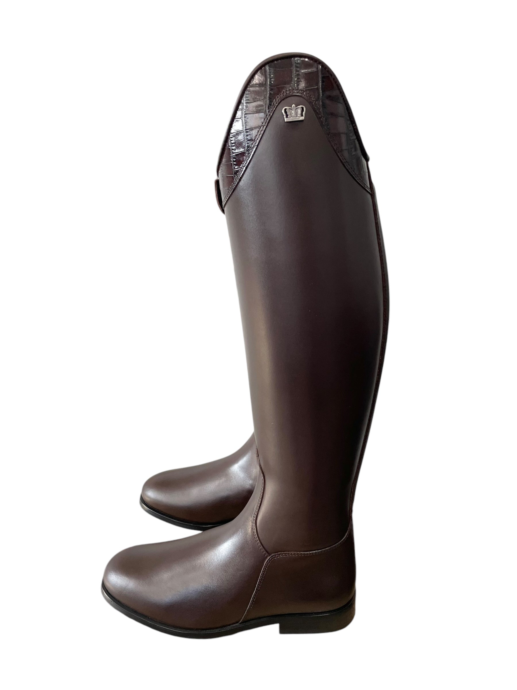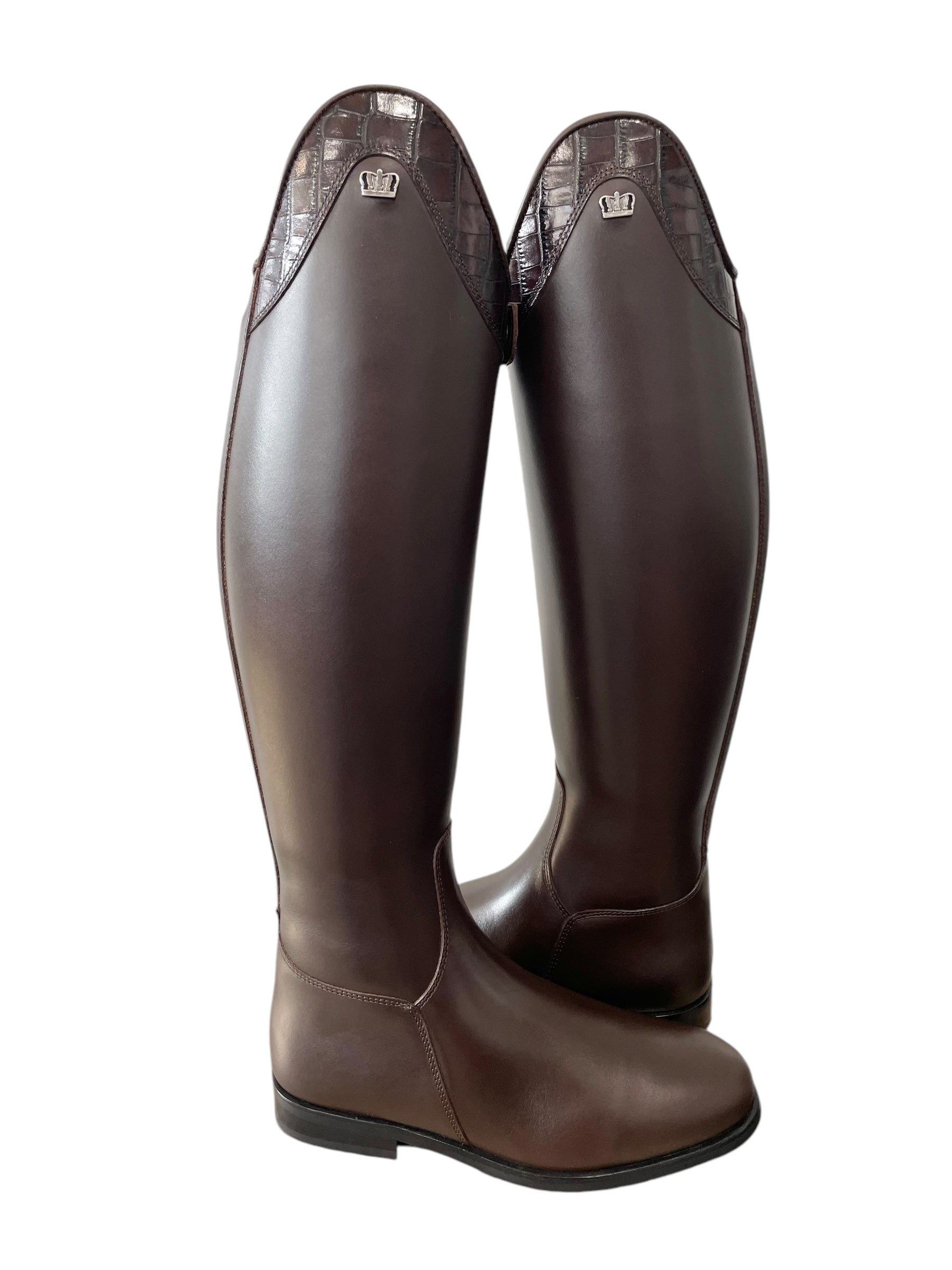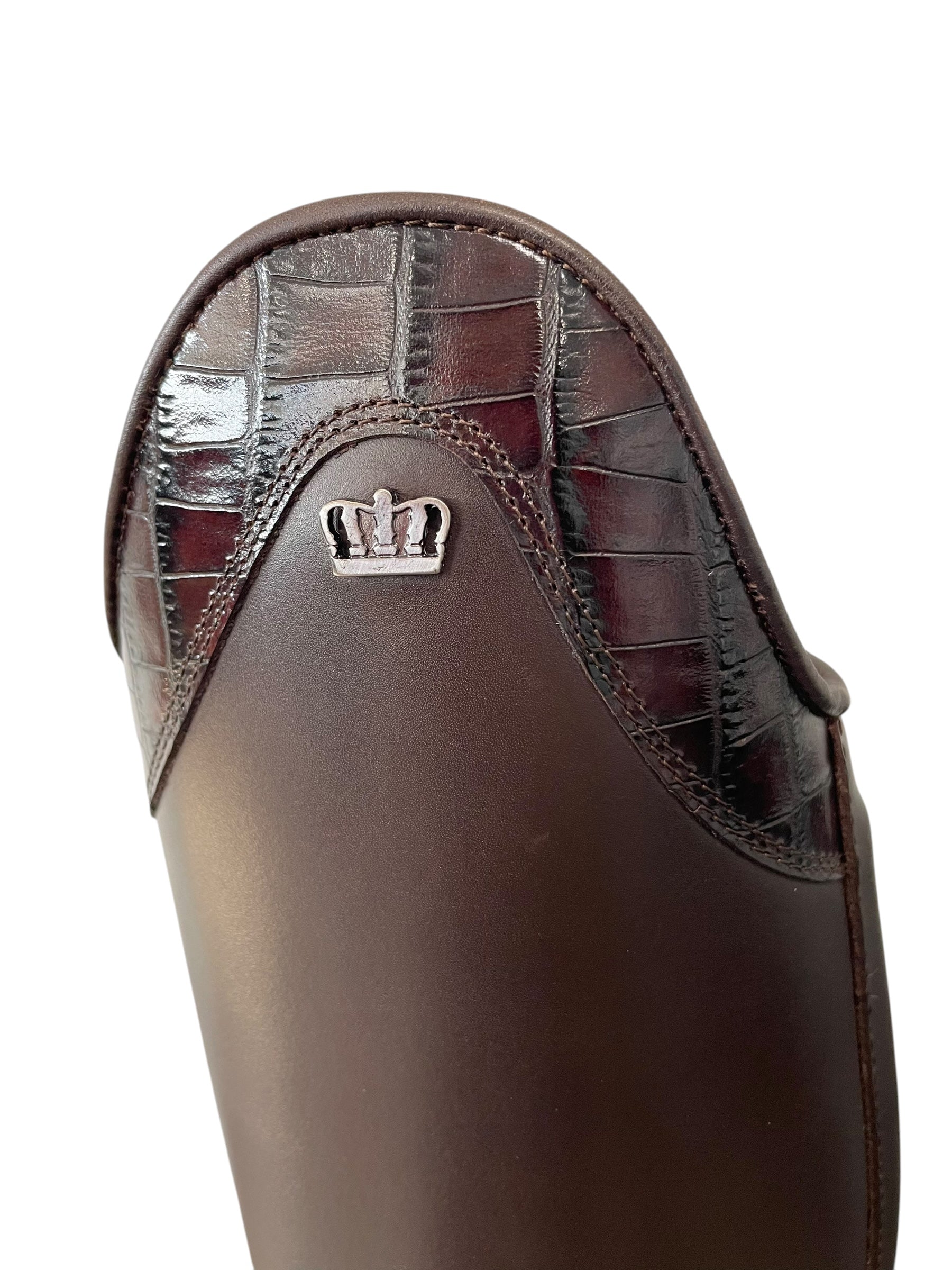 Description: Nature brown base, Jenny top in croco beleza brown, chocolate brown sheepskin lining inside, polished black logo crown, and black outsole.