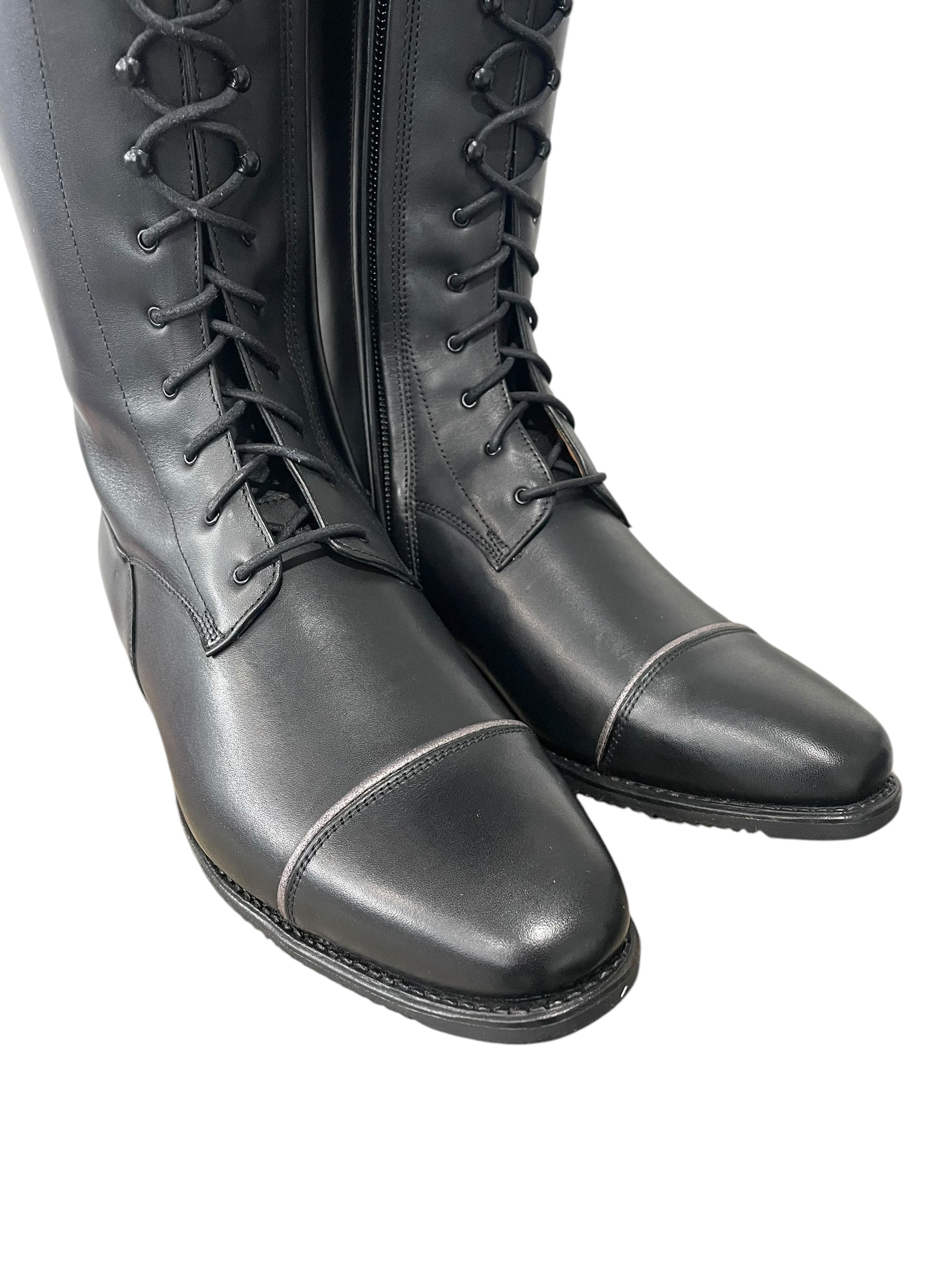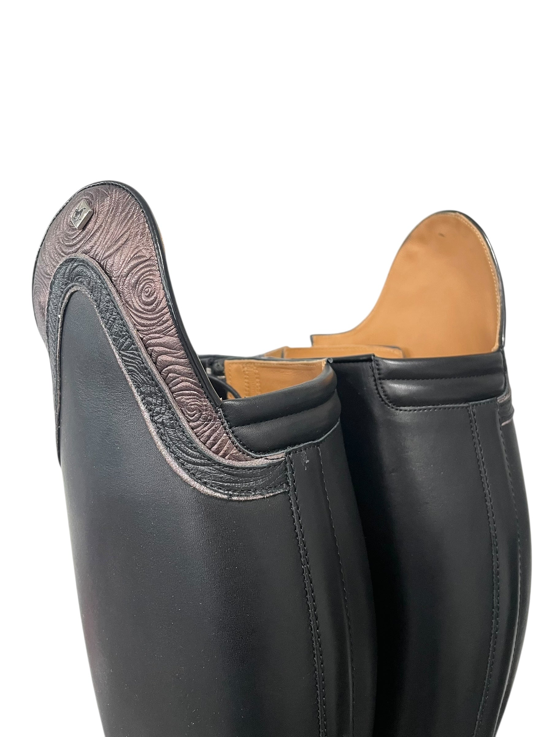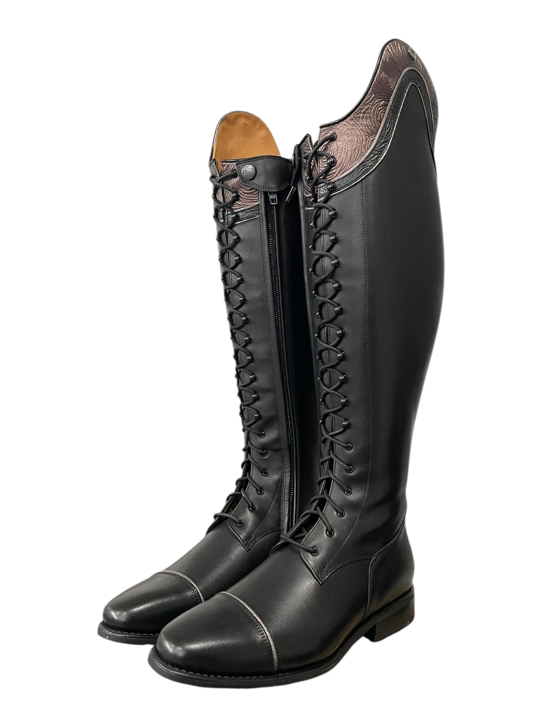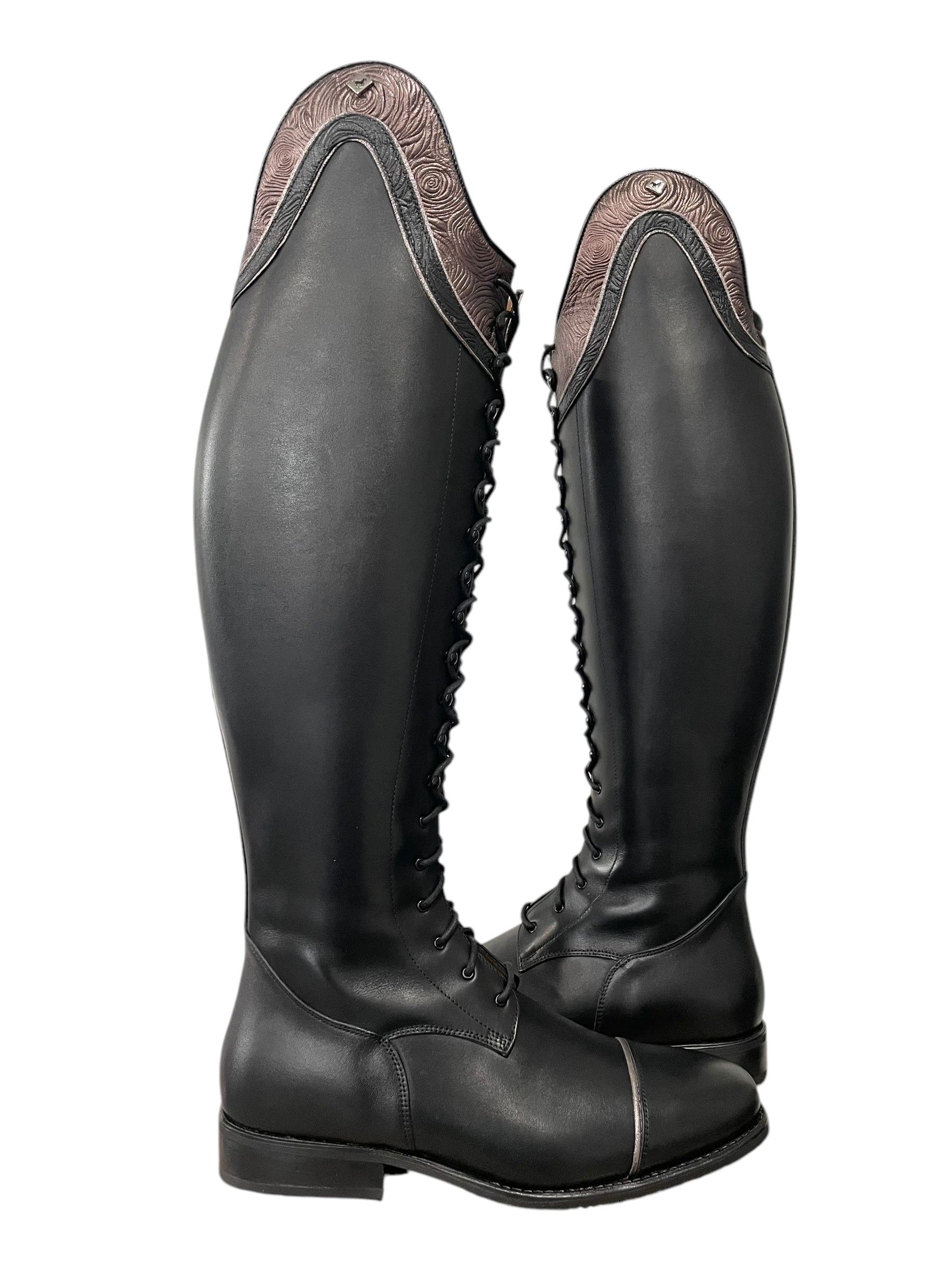 Description: WRAT black base, double Aurora top in rosetto brown with rosetta black underneath and glitter pink piping, toecap with glitter pink piping, silver logo, black hooks and black laces, comfort knee back, and black outsole.