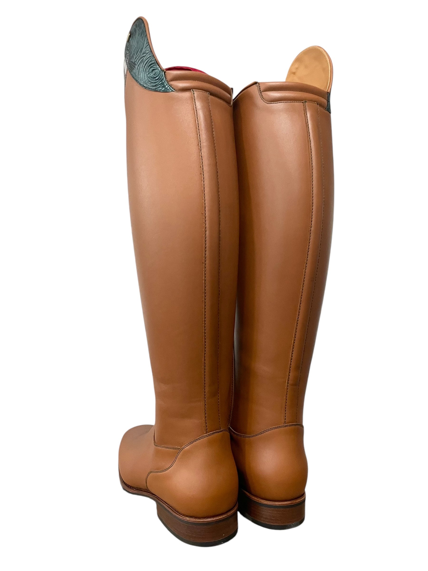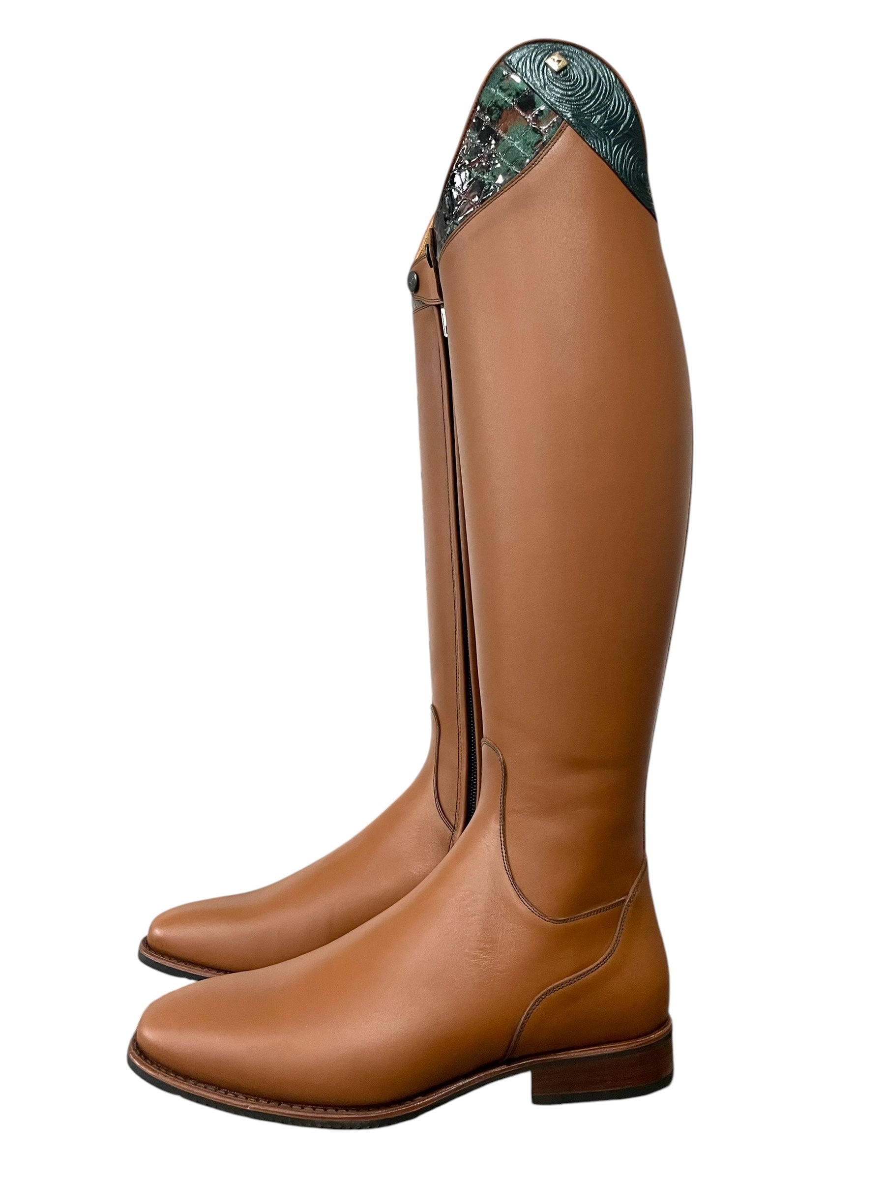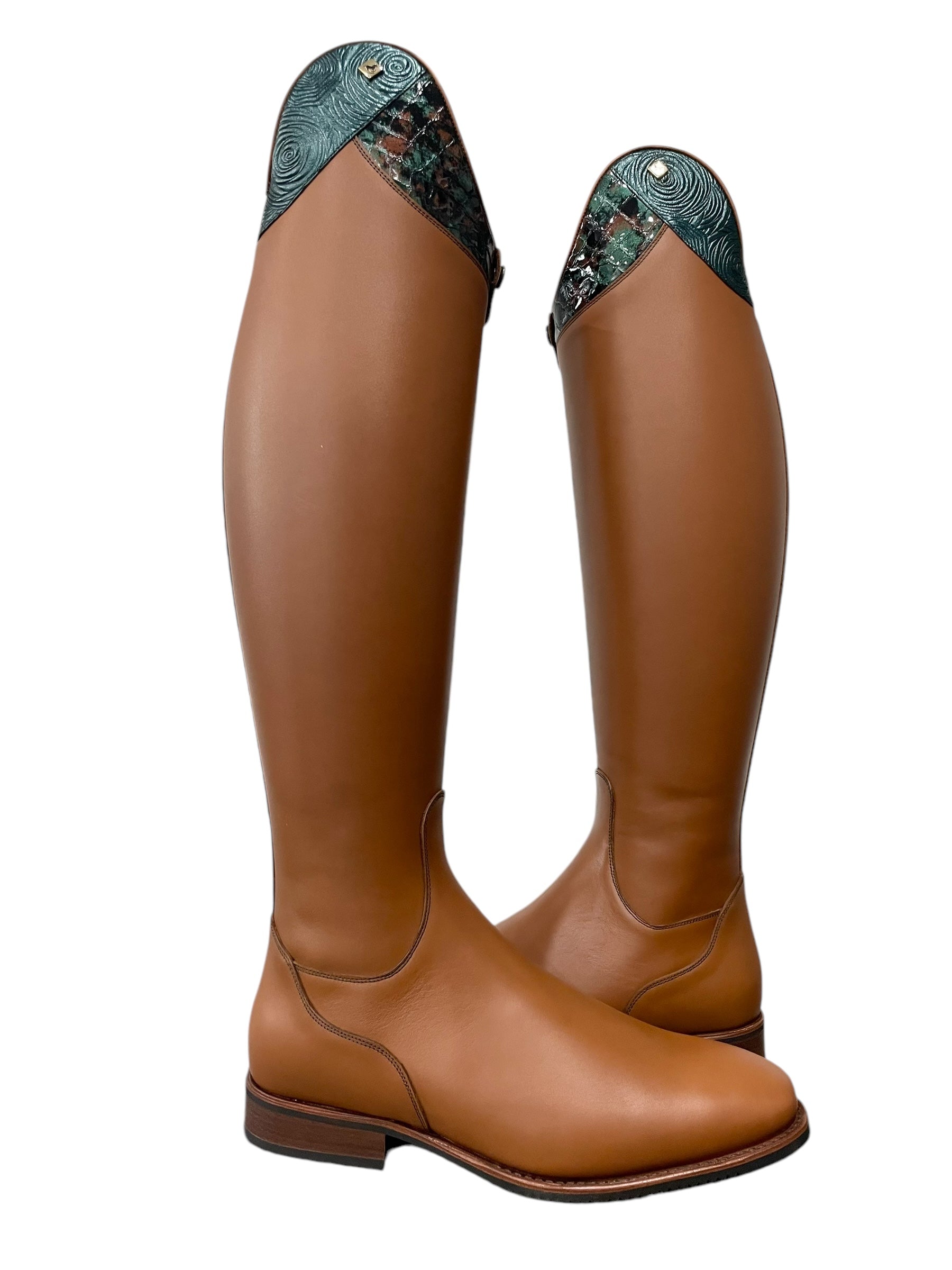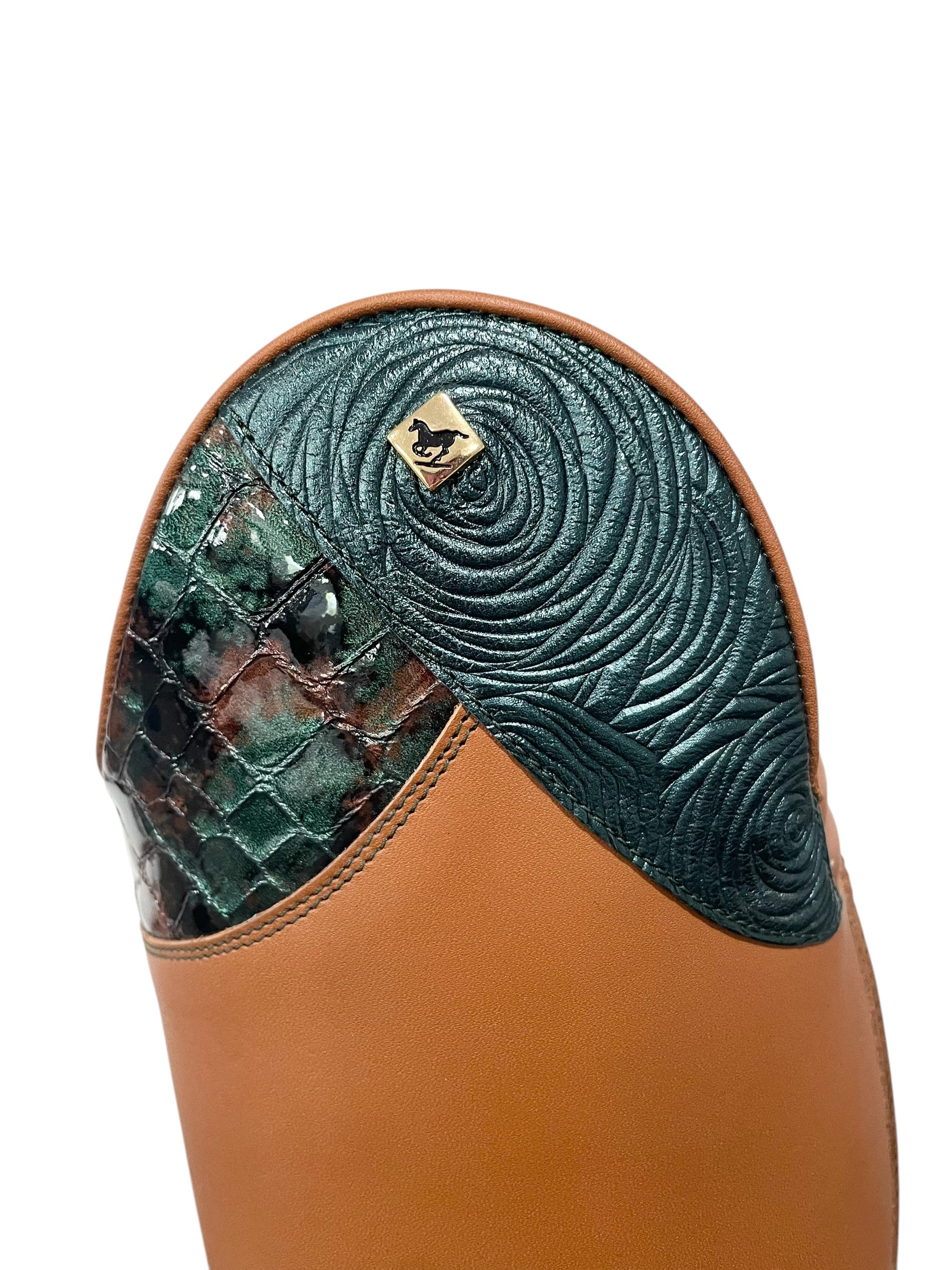 Description: WRAT oxford base, G35 musa top in lucido sfumato verde (left) and rosetto green (right), Q13 comfort knee, dark green stitching, gold logo, and brown outsole.
