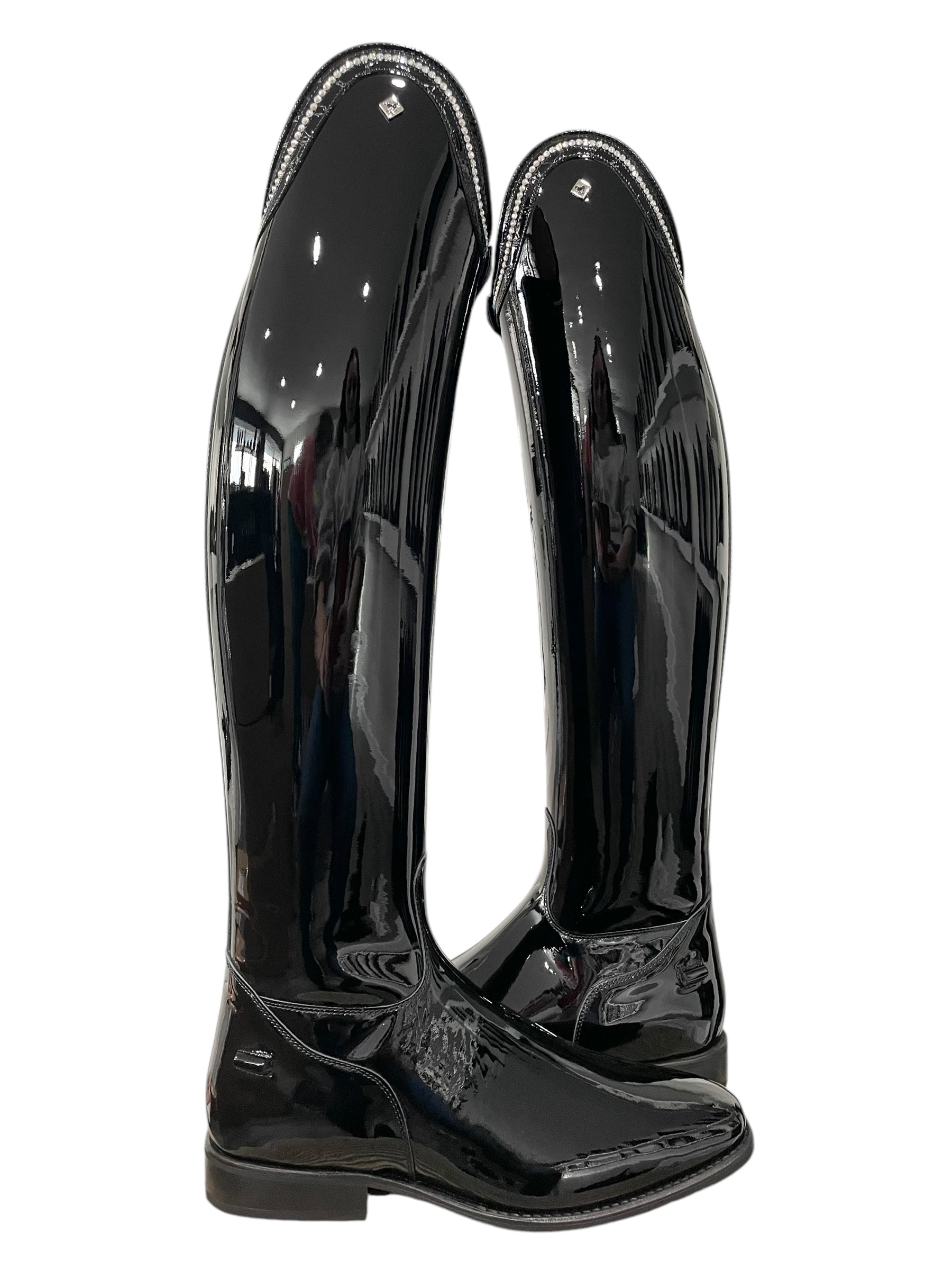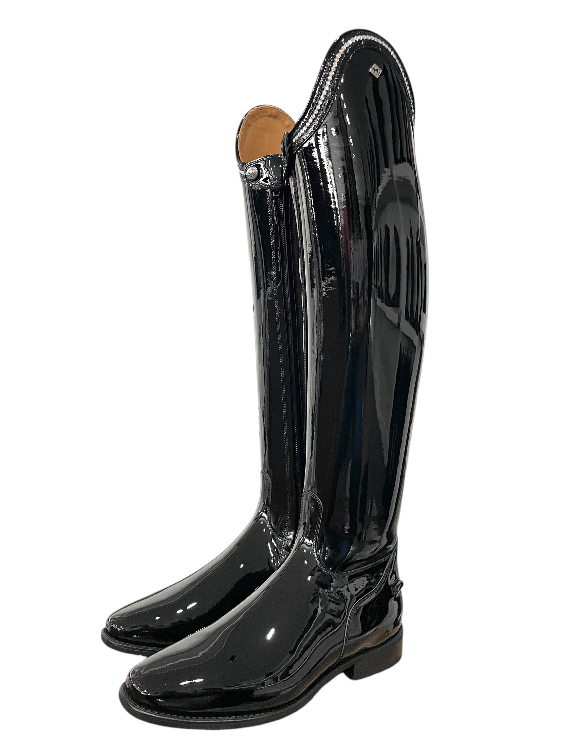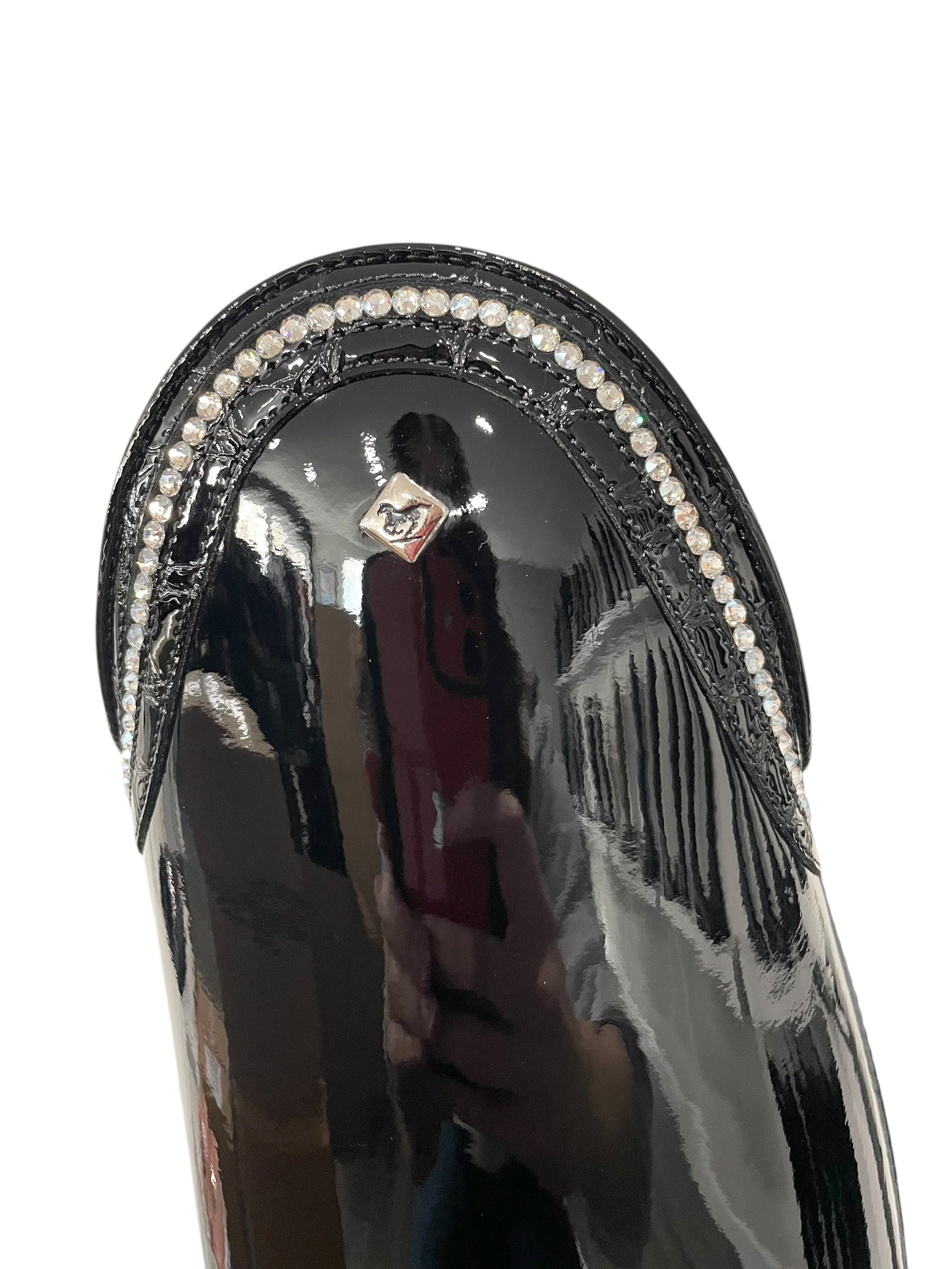 Description: Patent black base, G9 Rondine top in lucidi black with GGS79 moonlight row of crystals, silver logo, and black outsole.