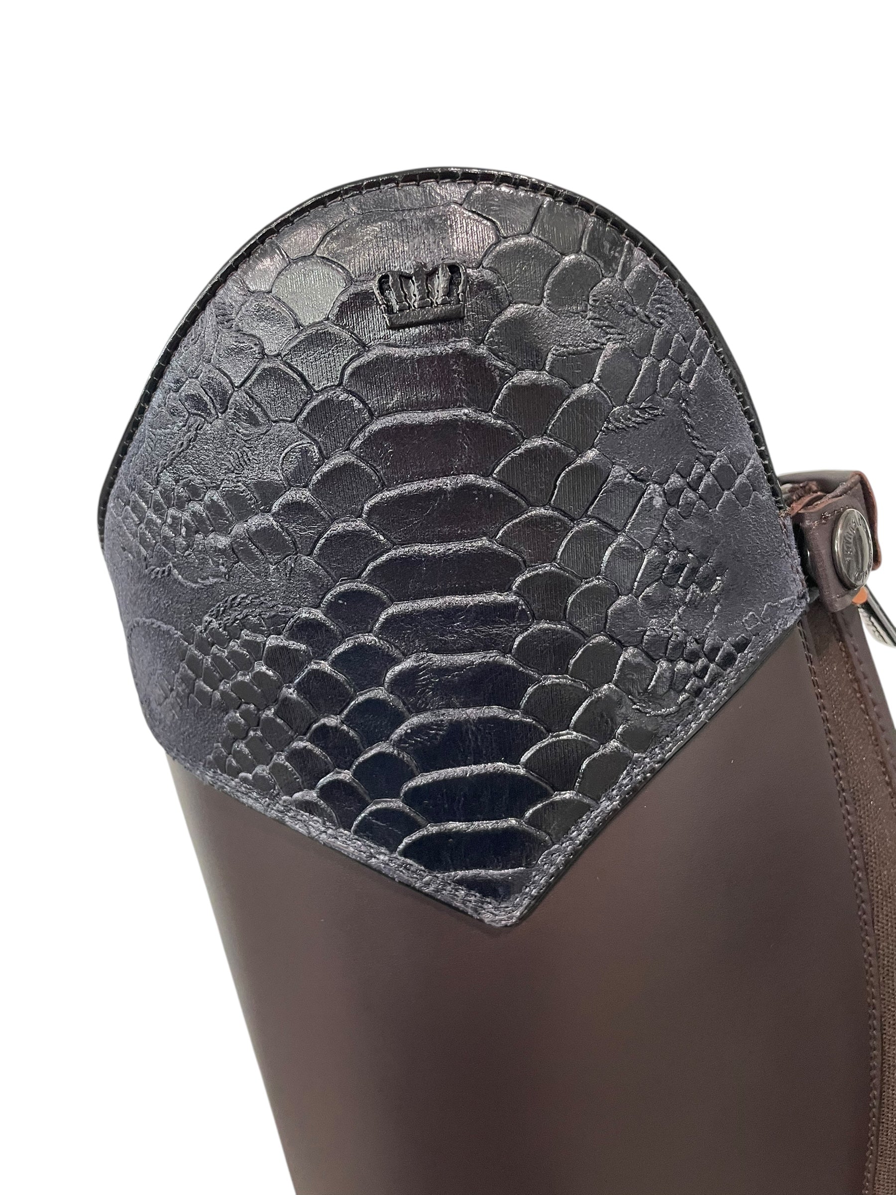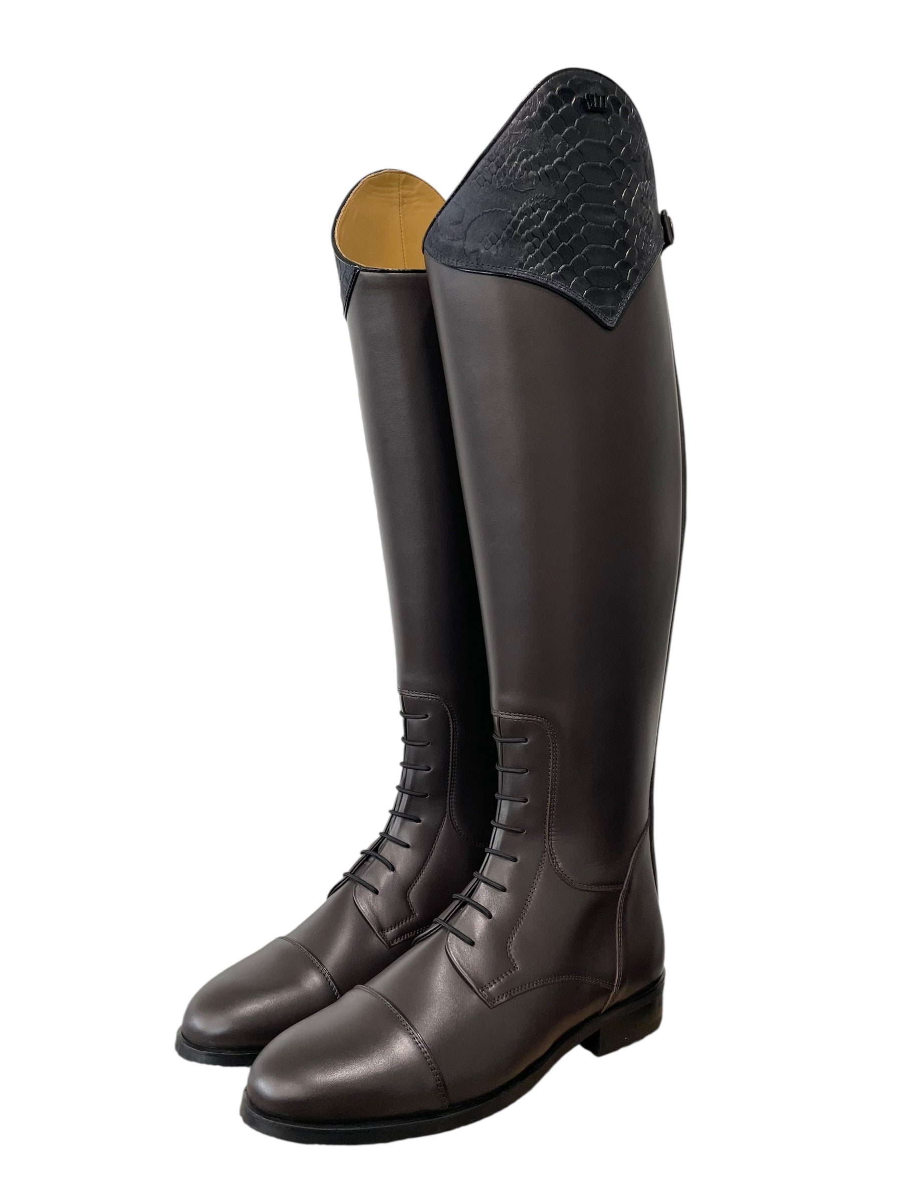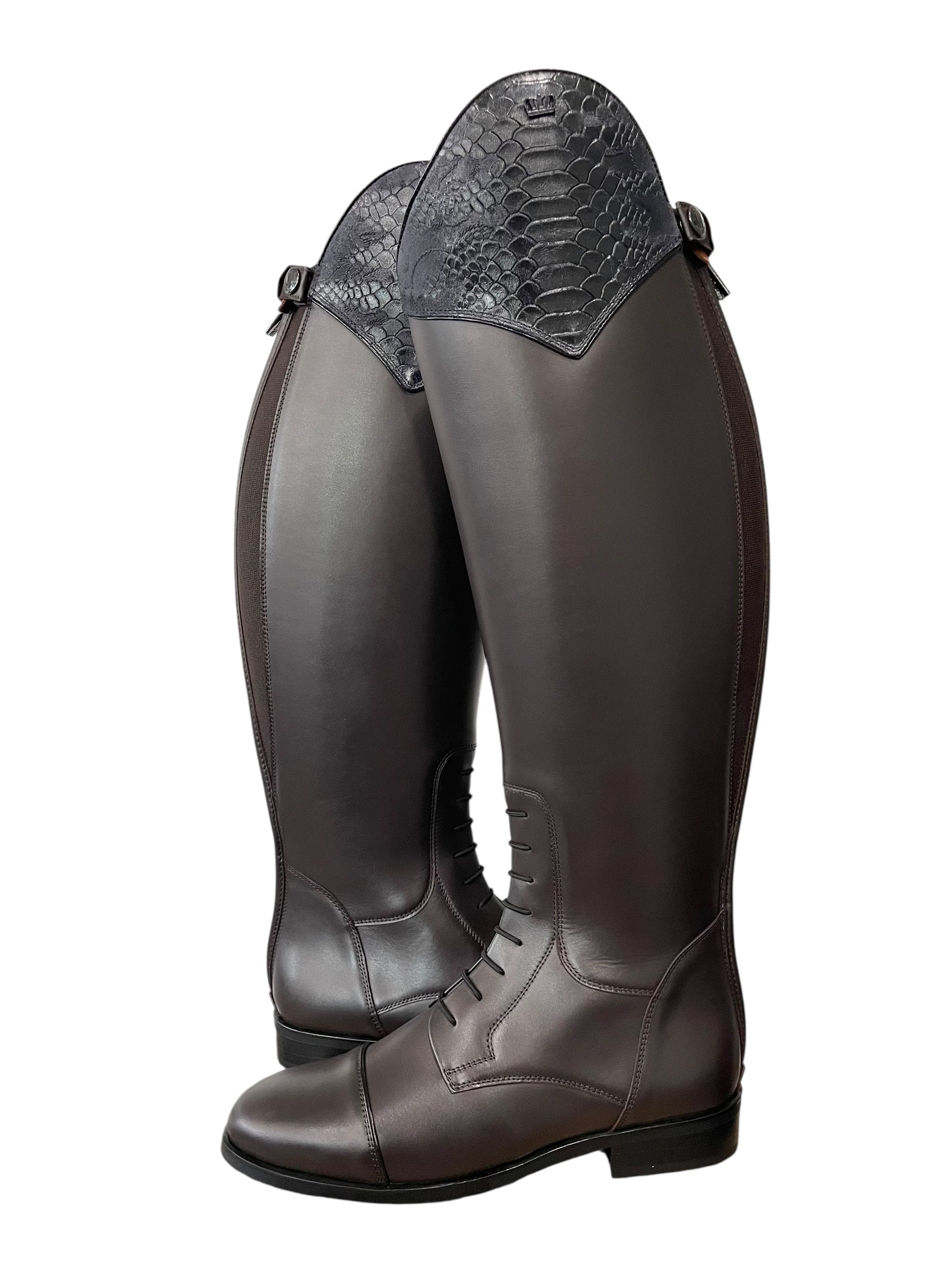 Description: Aspen dark brown base, Aspen Special top in vittoria dundee pilota, uragano black top and toecap piping, matte black logo crown, brown elastic, black laces, and black outsole.