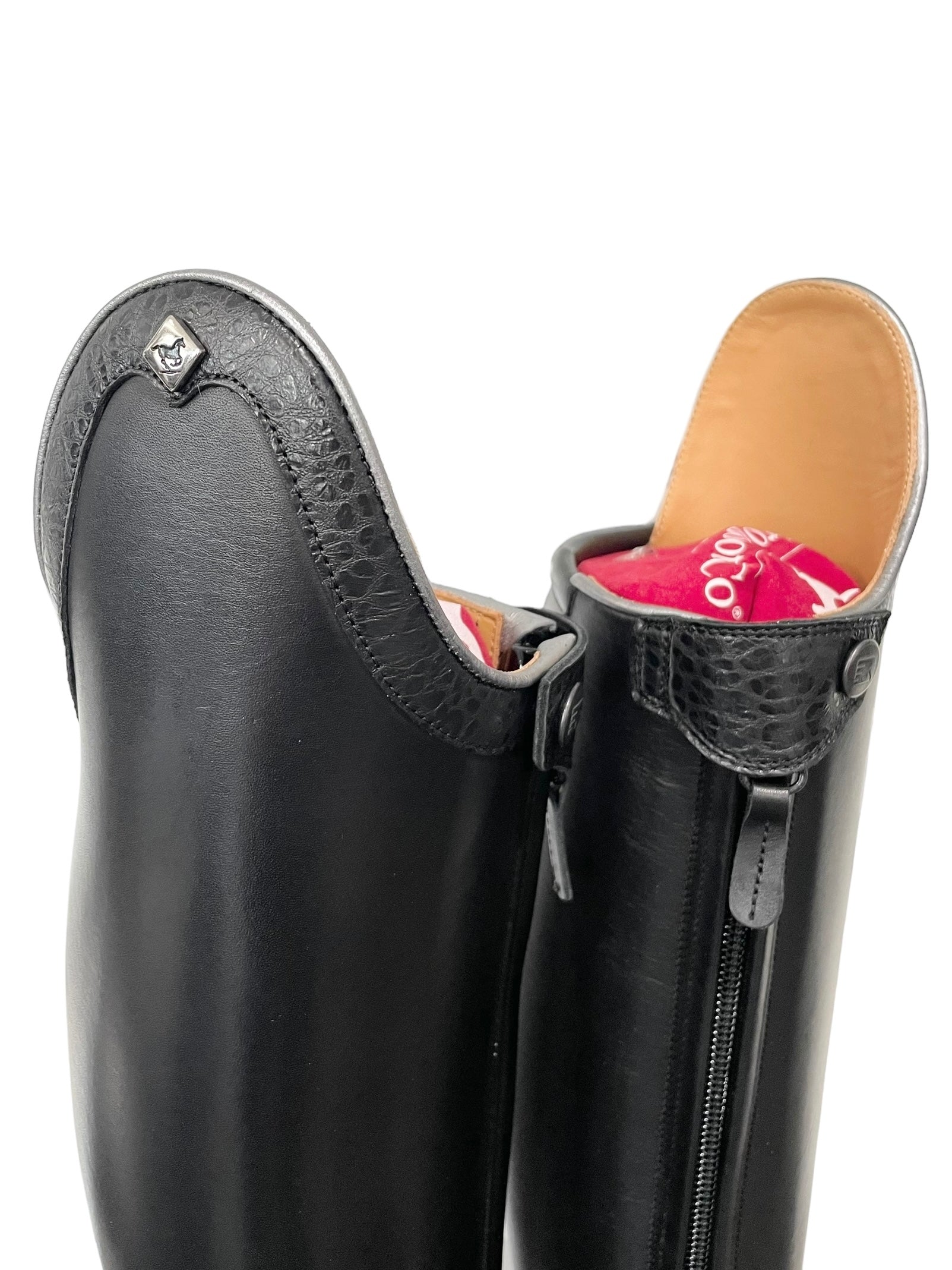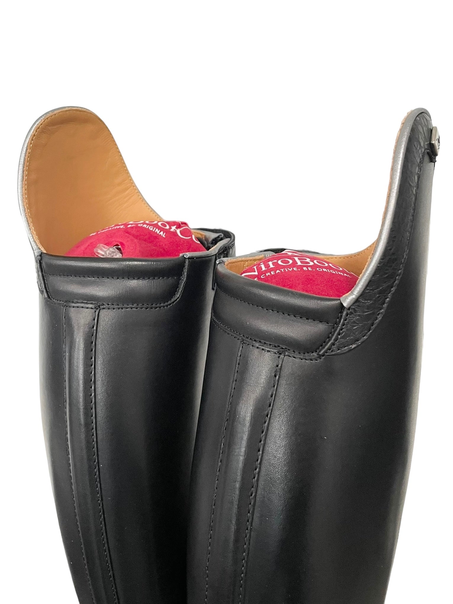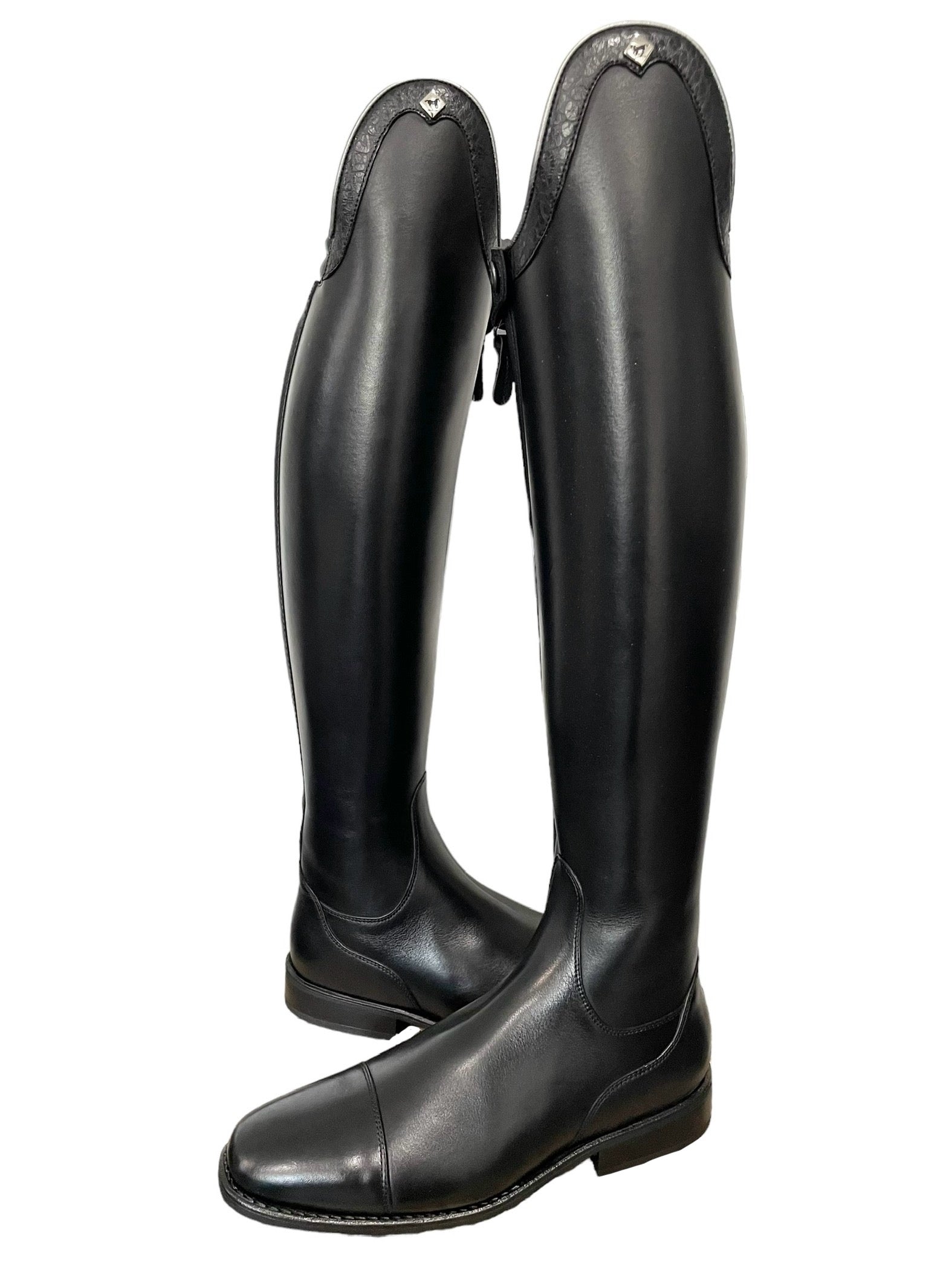 Description: WRAT black base, G9 Rondine top in buongiorno black with sattin top piping, zip protector in buongiorno black, E2 toecap, Q13 comfort knee, silver logo, and black outsole.
