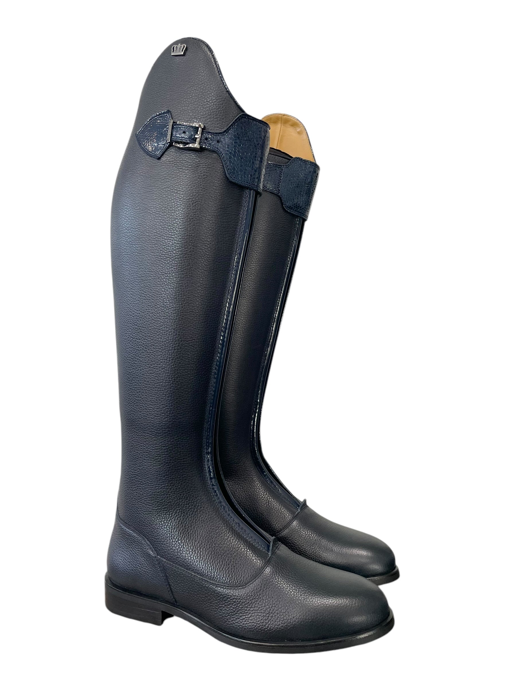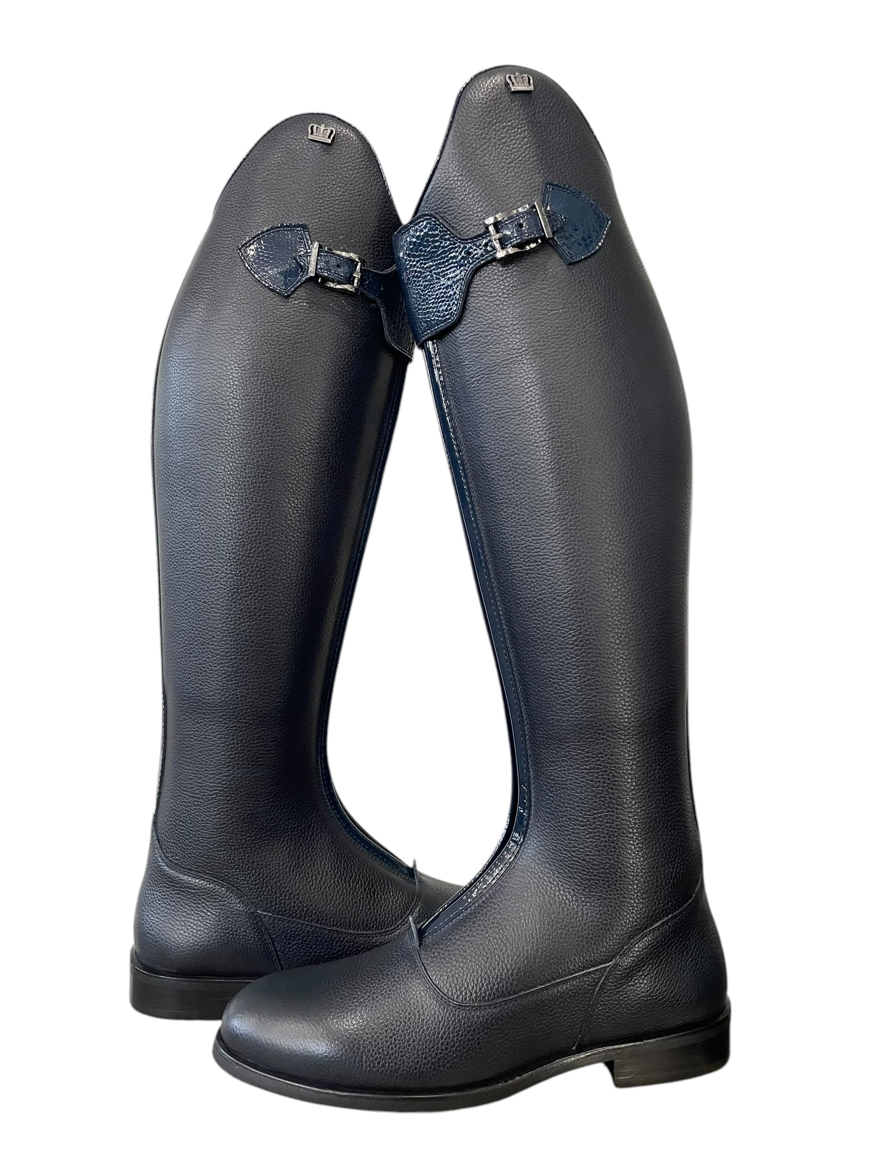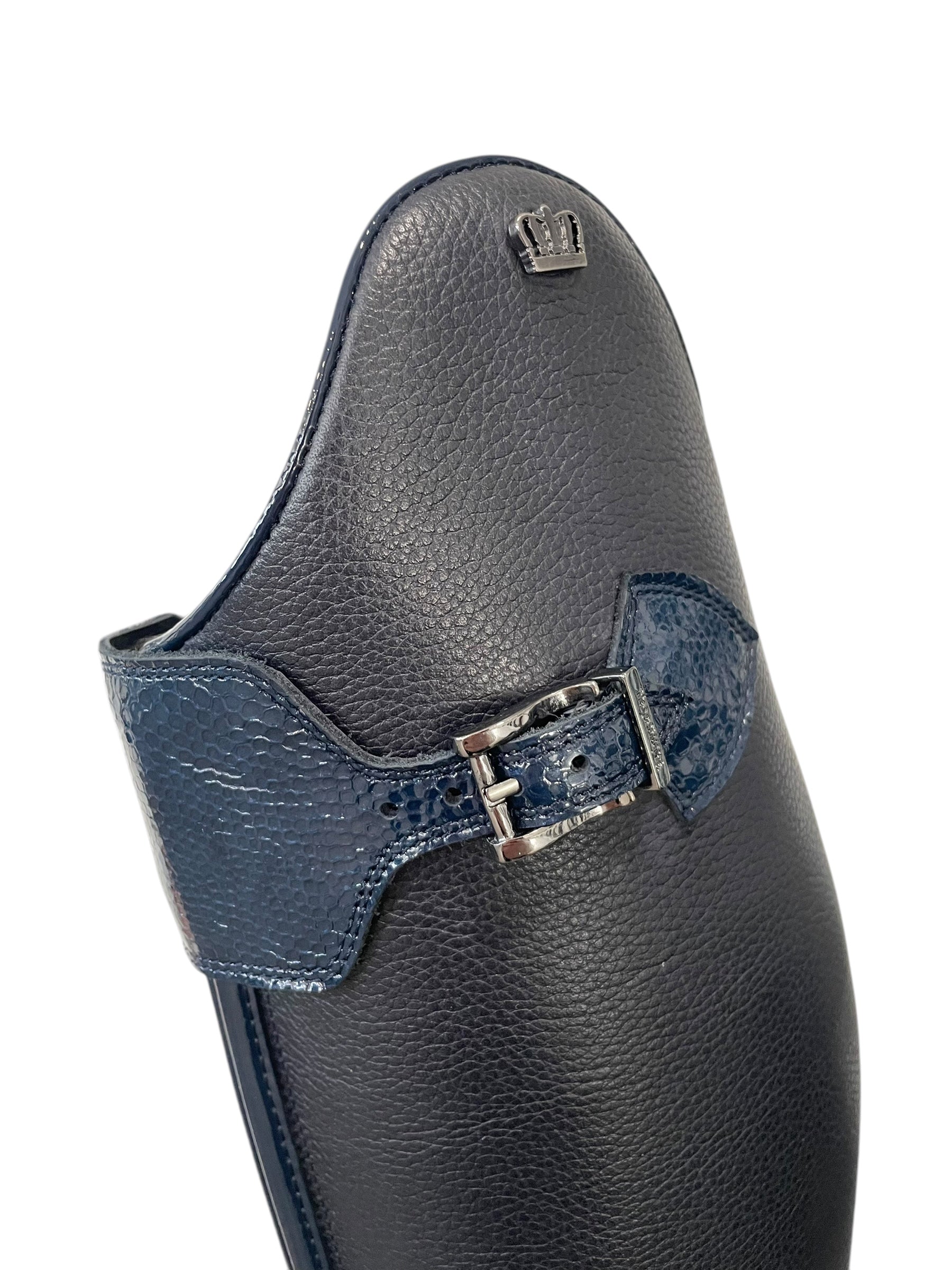 Description: Paxson blue base, top strap in milady blue, top piping in roma blue, parts along the zipper and back stripe in roma blue, polished black logo crown and buckles, and black outsole.