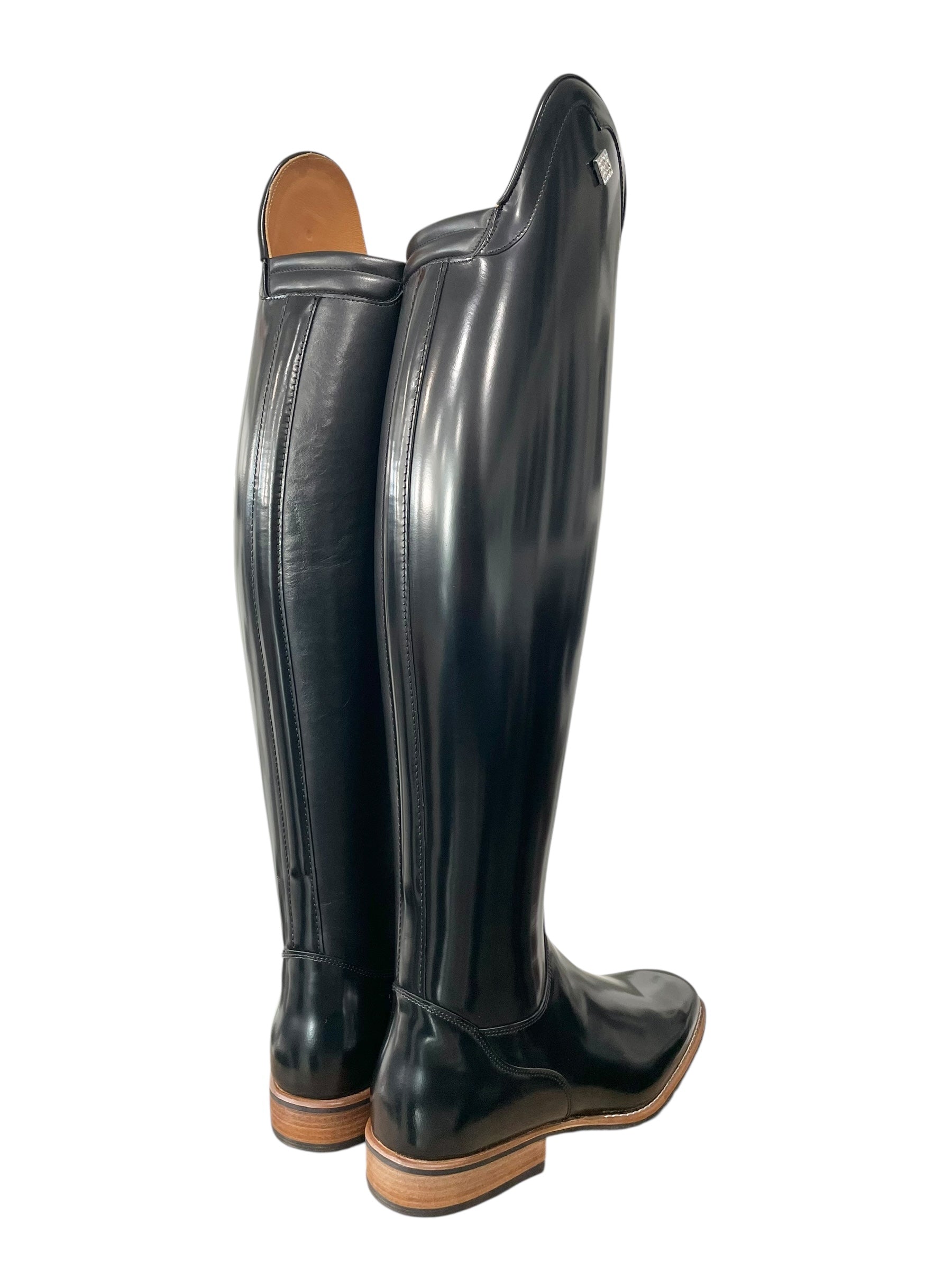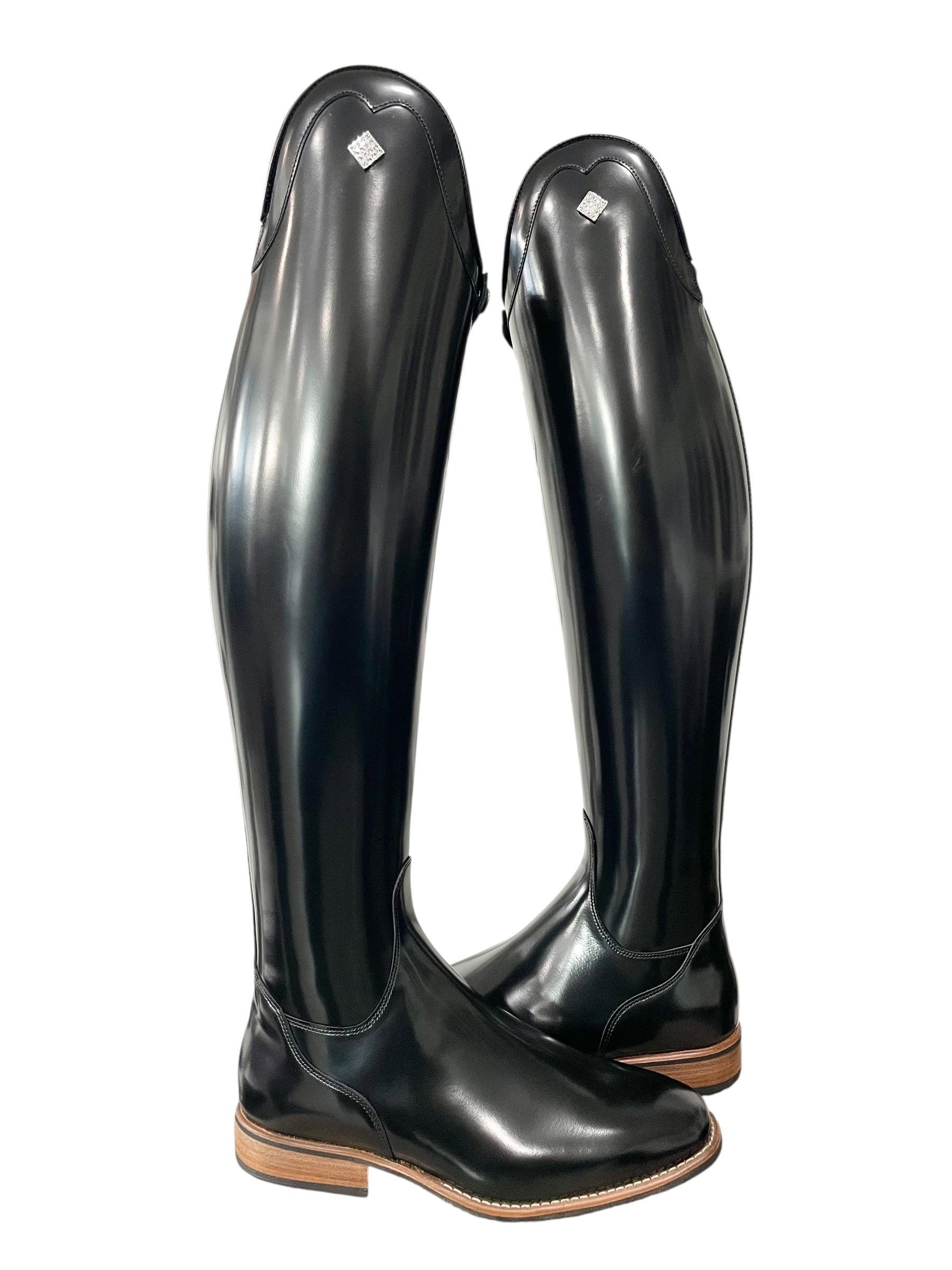 Description: Brushed black base, G9 Rondine top, M5 crystal logo, Q15 outer leg reinforcement, Q13 comfort knee, and natural outsole.