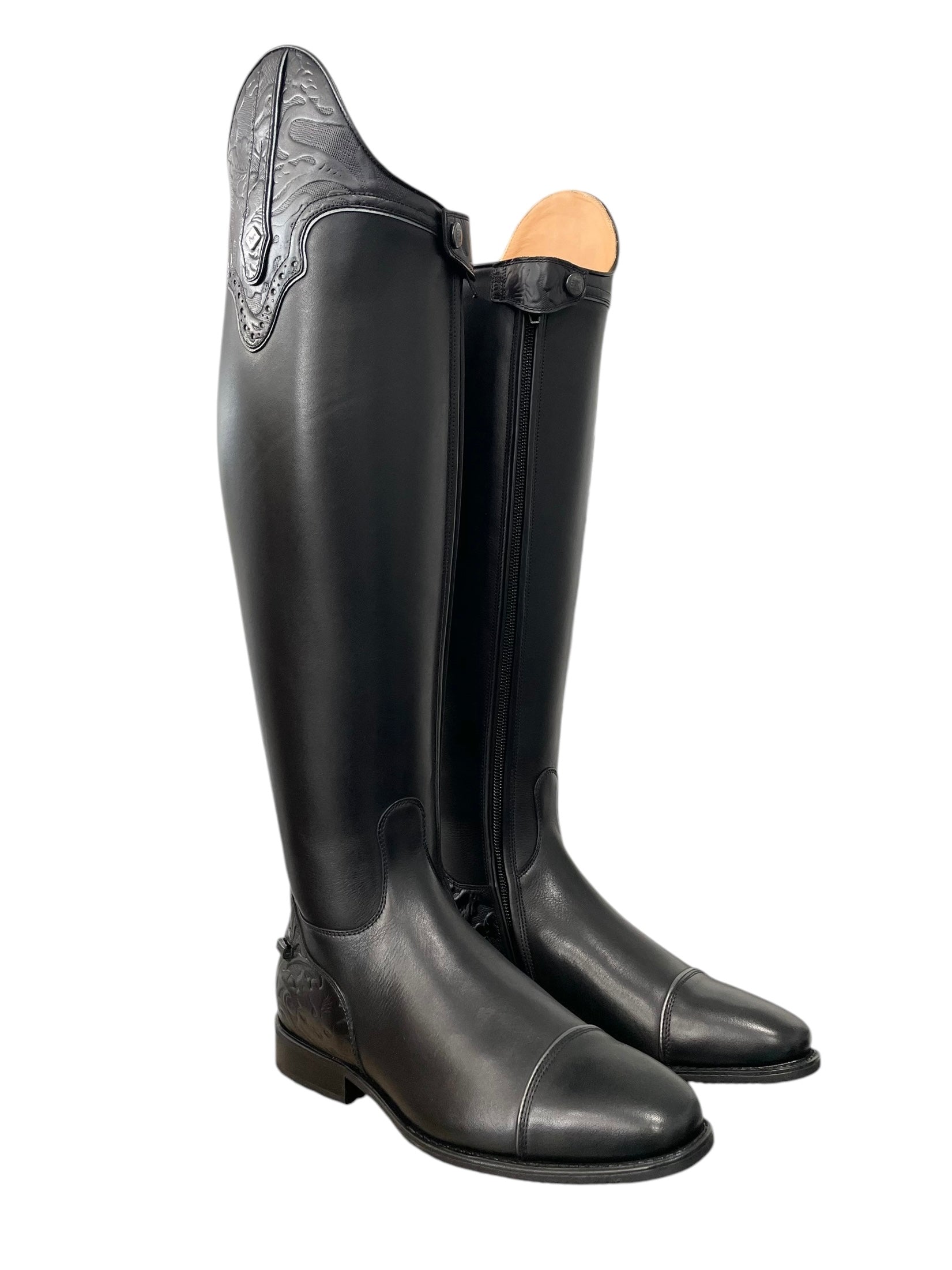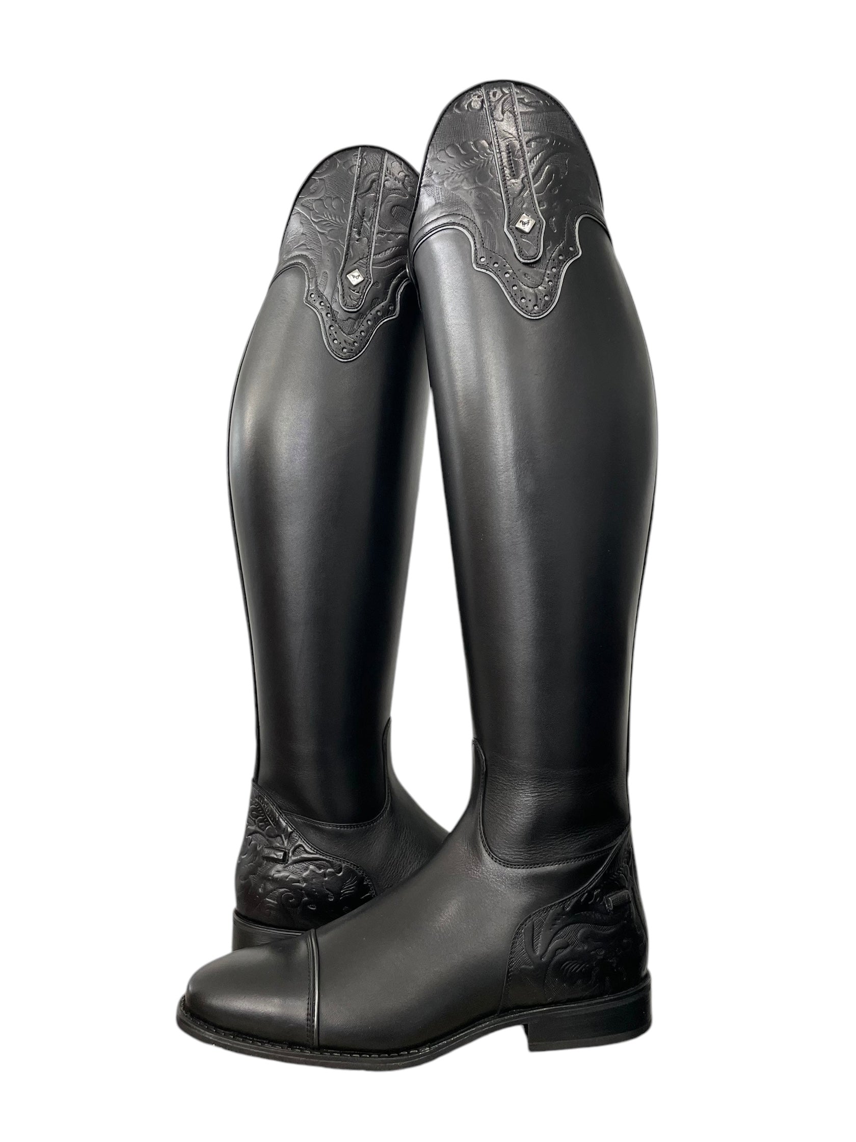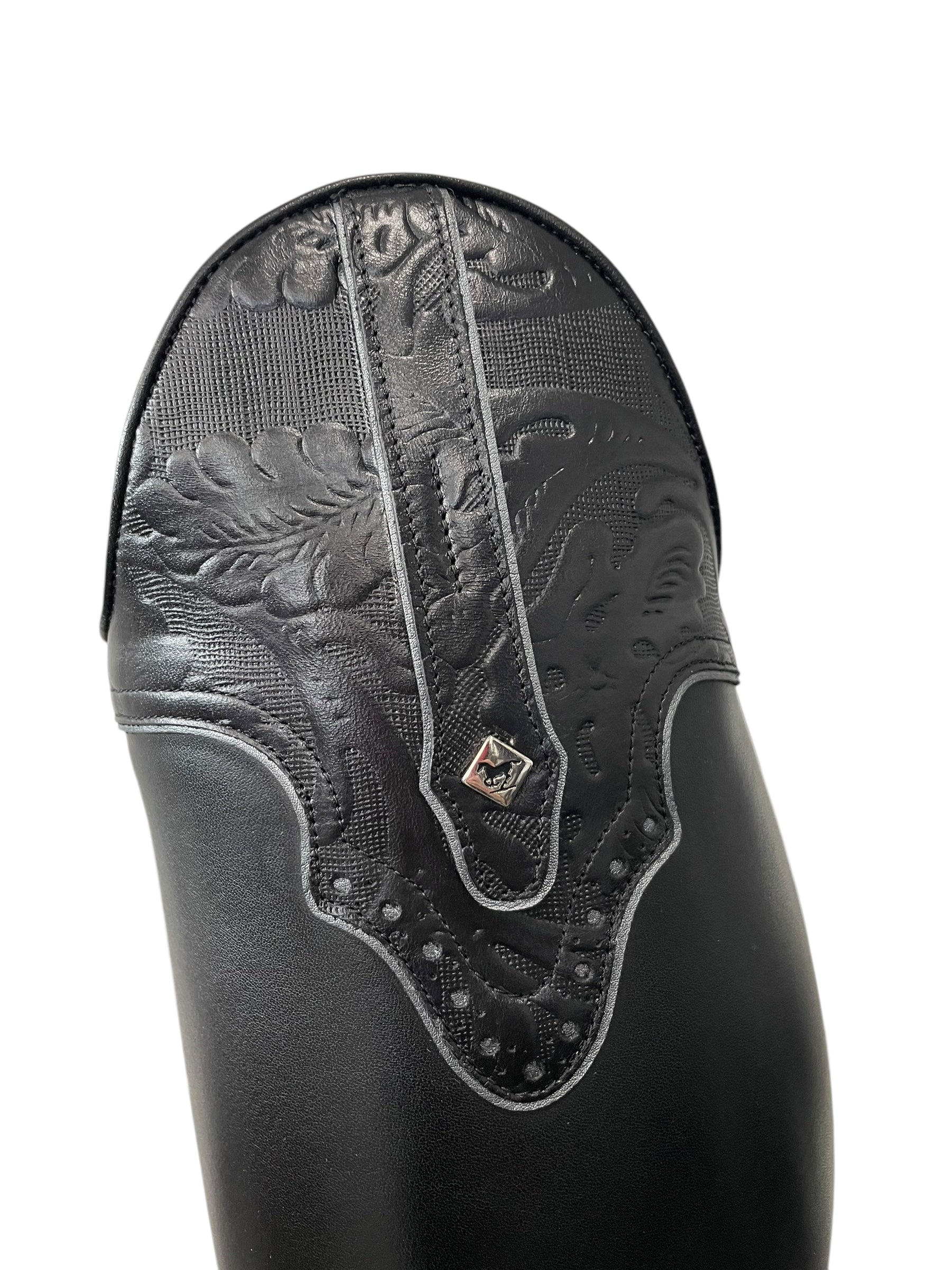 Description: WRAT black base, G5 America top in EMS nero with sinax grigio piping underneath, WRAT black piping on top, heel pattern in EMS nero, toecap with sinax grigio piping, zip protector in EMS nero, silver logo, and black outsole.