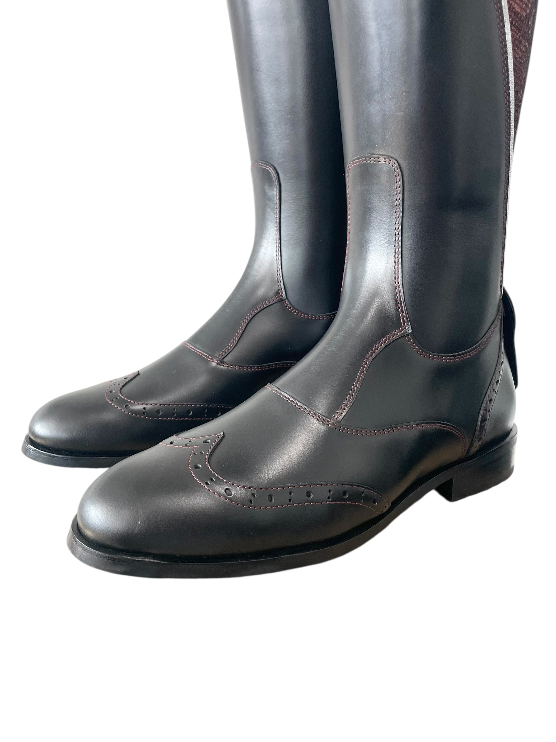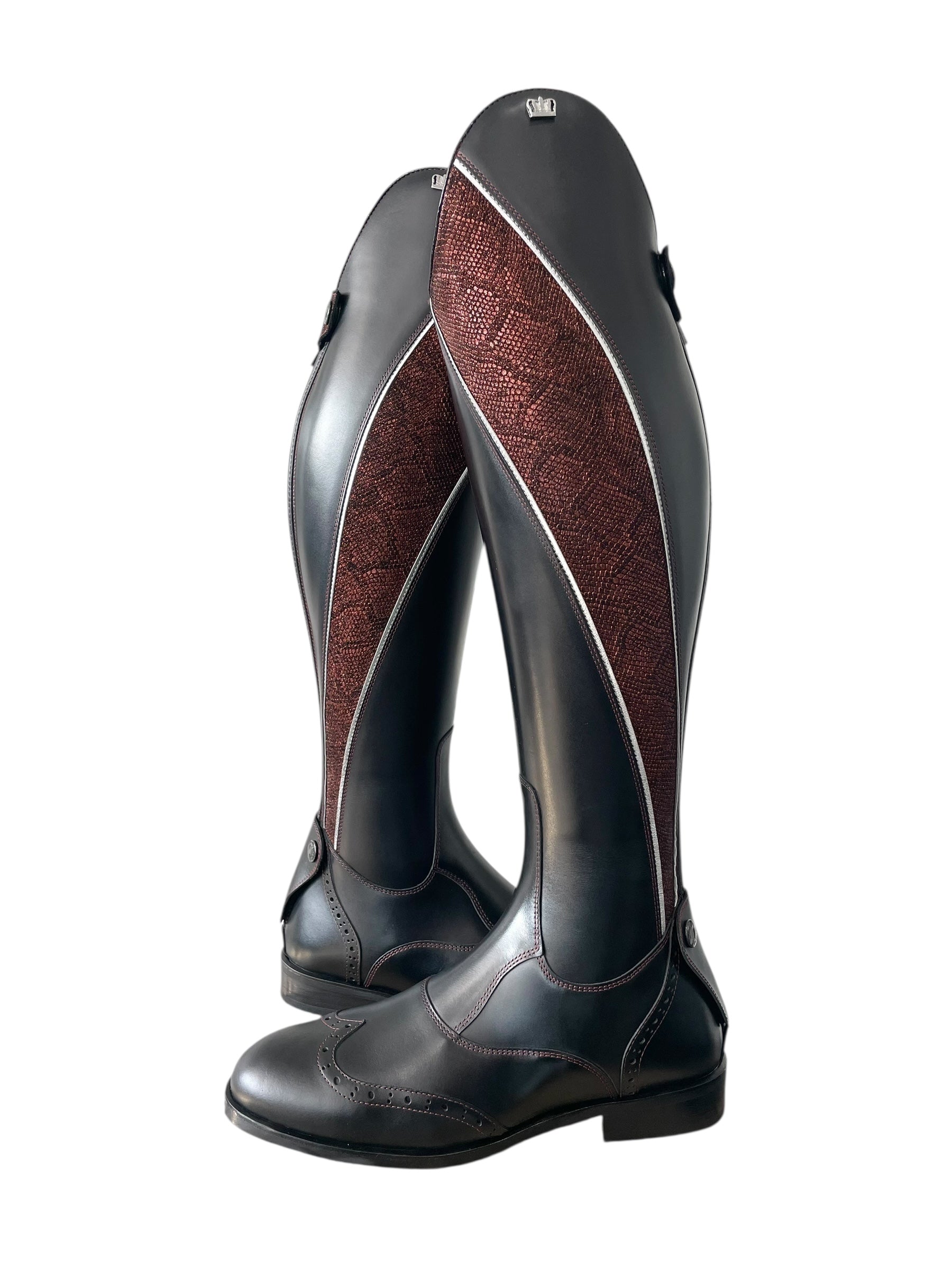 Description: Nature black base, snake copper with silver piping down the shaft, bordeaux stitching, toecap and heel with brogues, roma black top piping, top zip protector in snake copper, bottom zip protector in nature black, silver logo crown, and black sole.