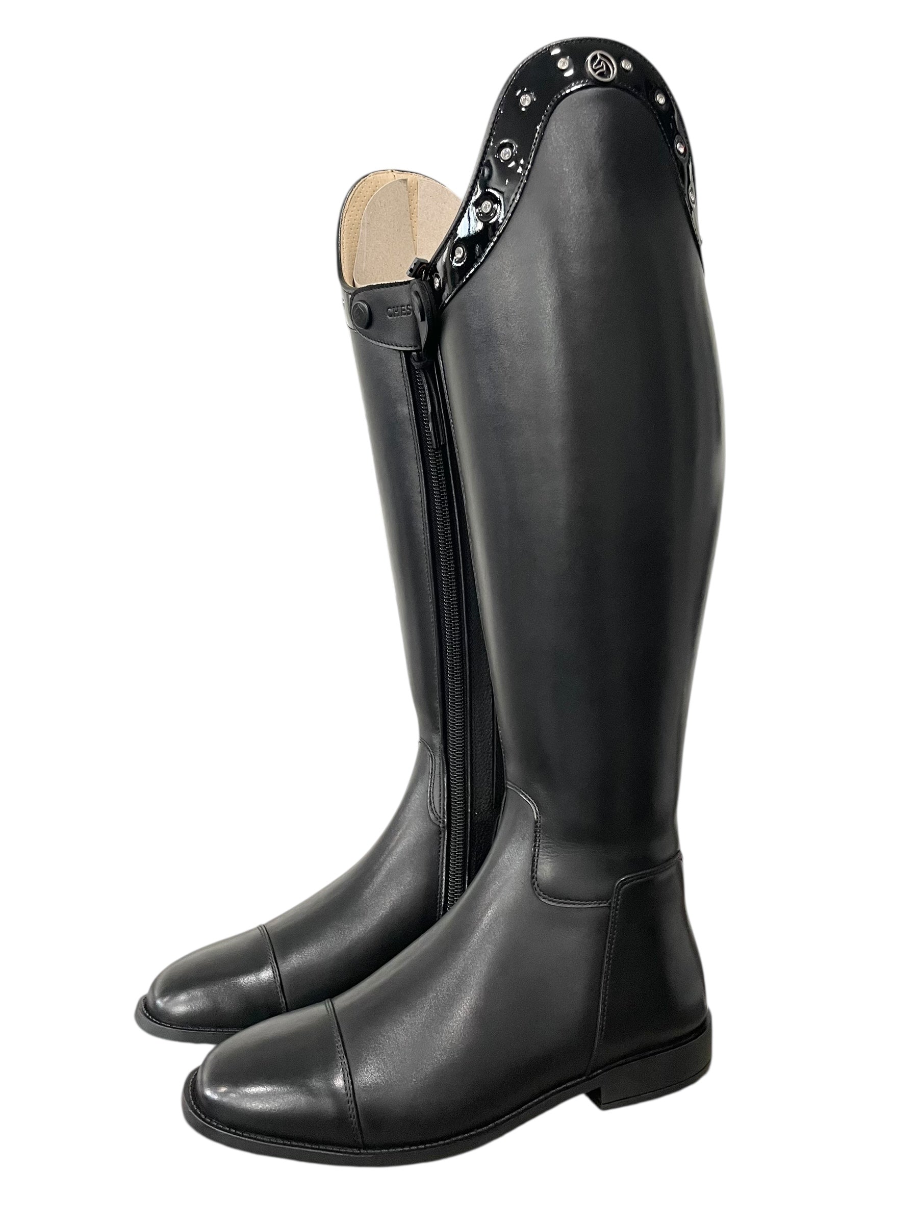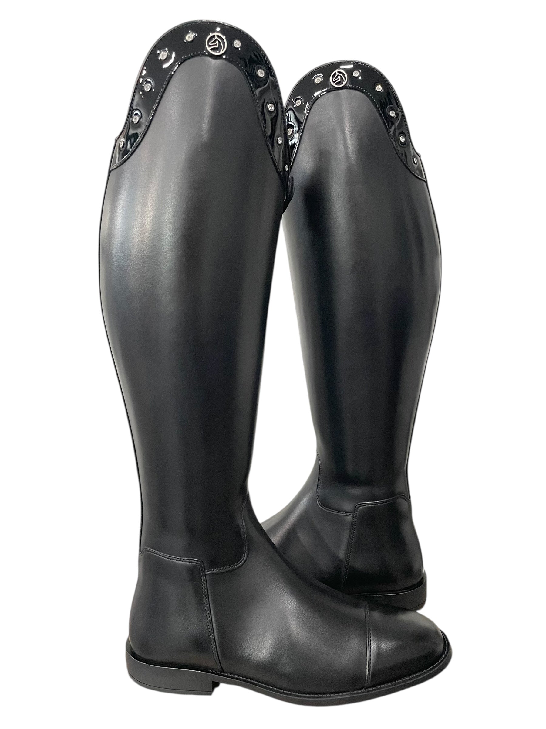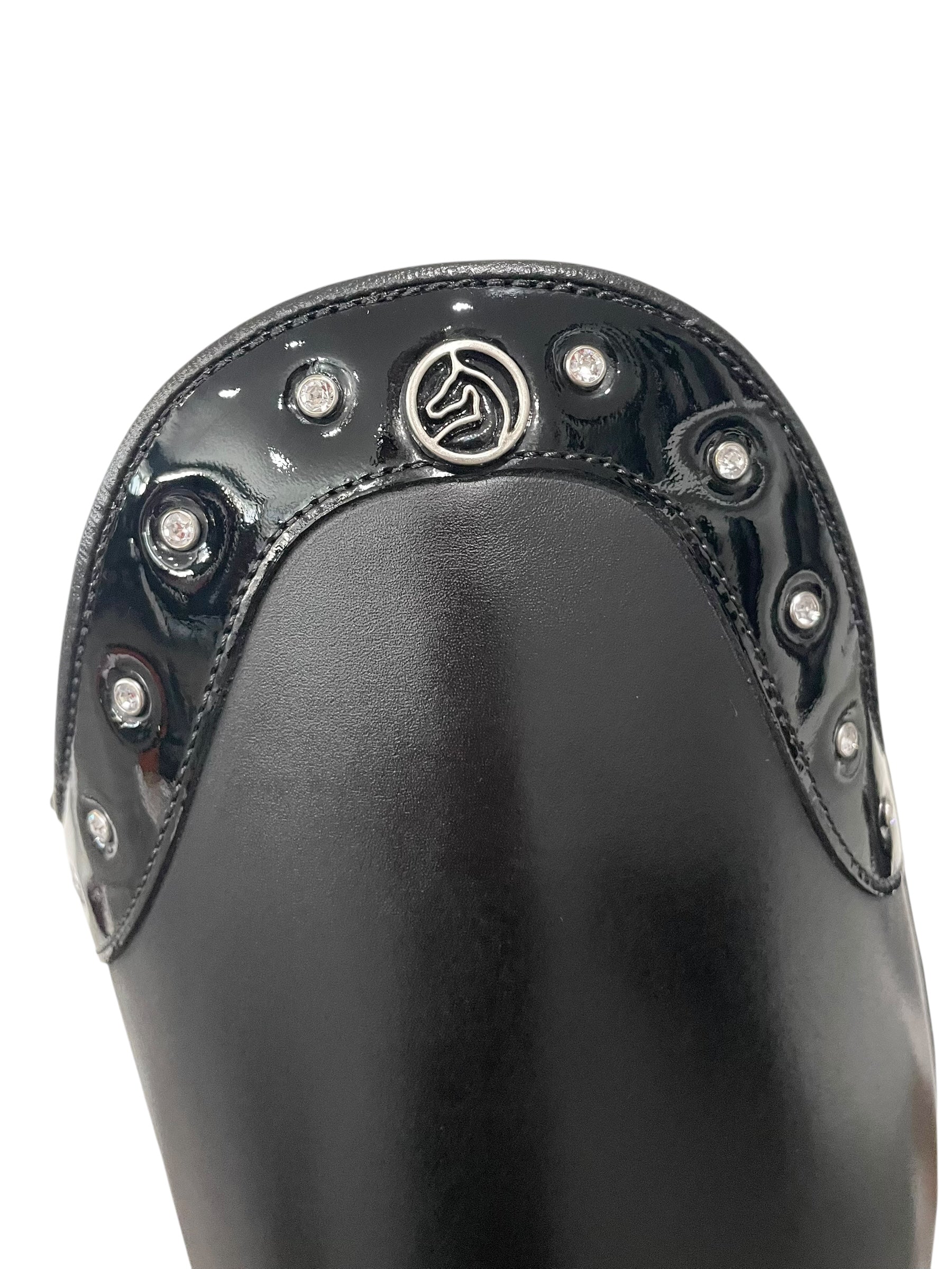 Description: P4 black base, T3 top in patent black top with crystals, B1 toecap, and black outsole.