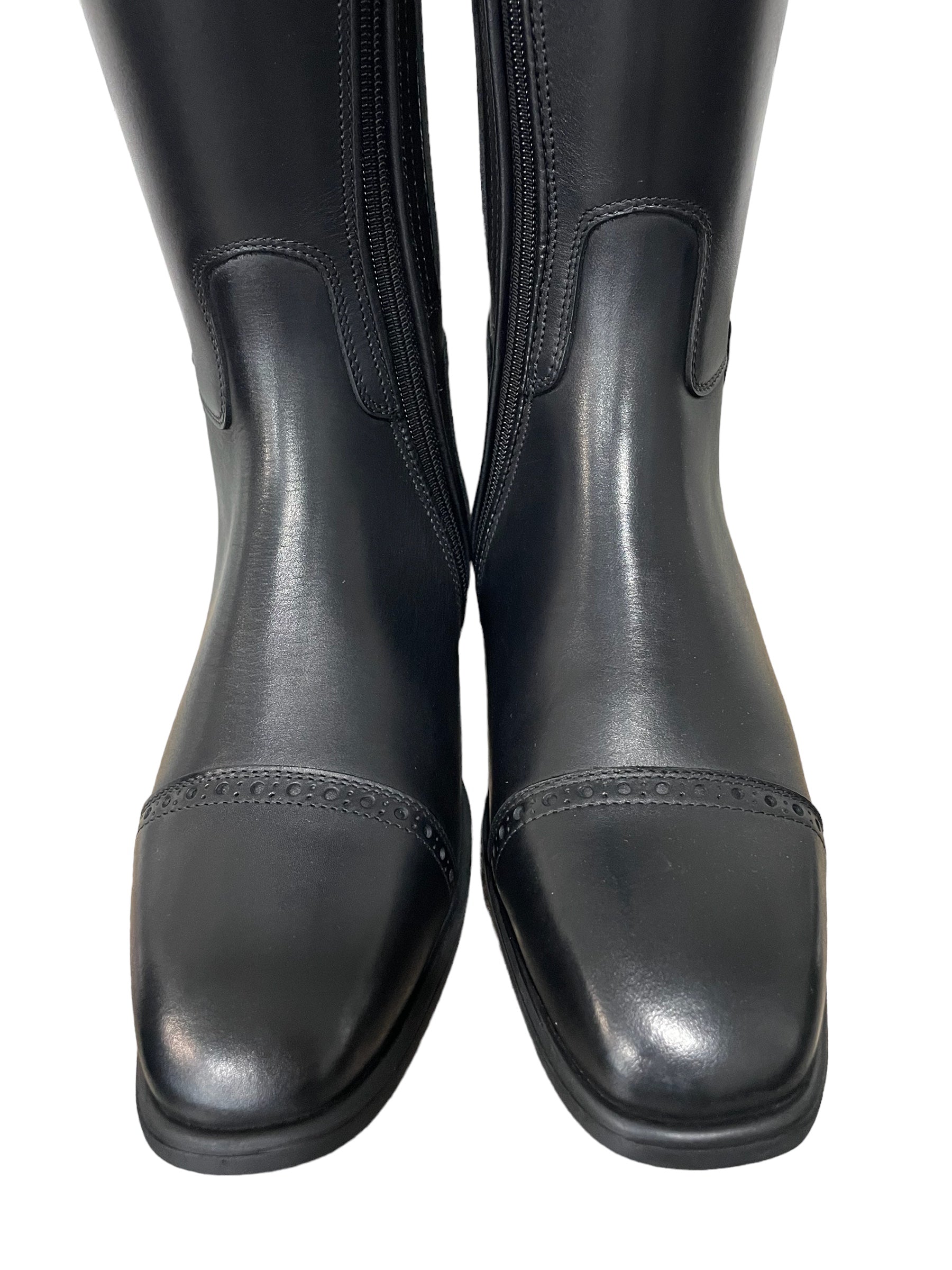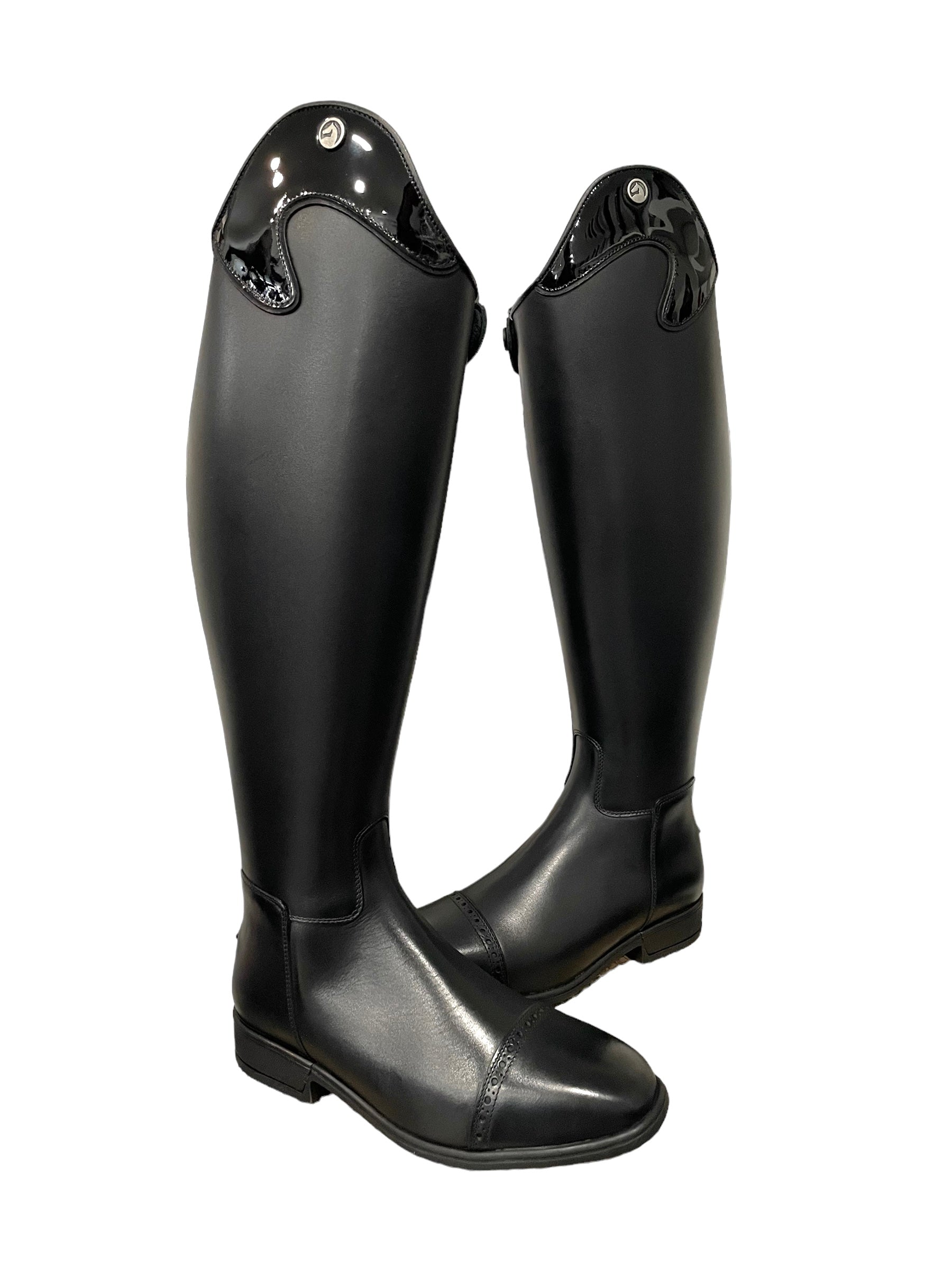 Description: Dressage boot with hard stiffness. Matte black base leather, black patent top, black anti-slip inside panel, elastic, topecap with broguing, and black outsole.