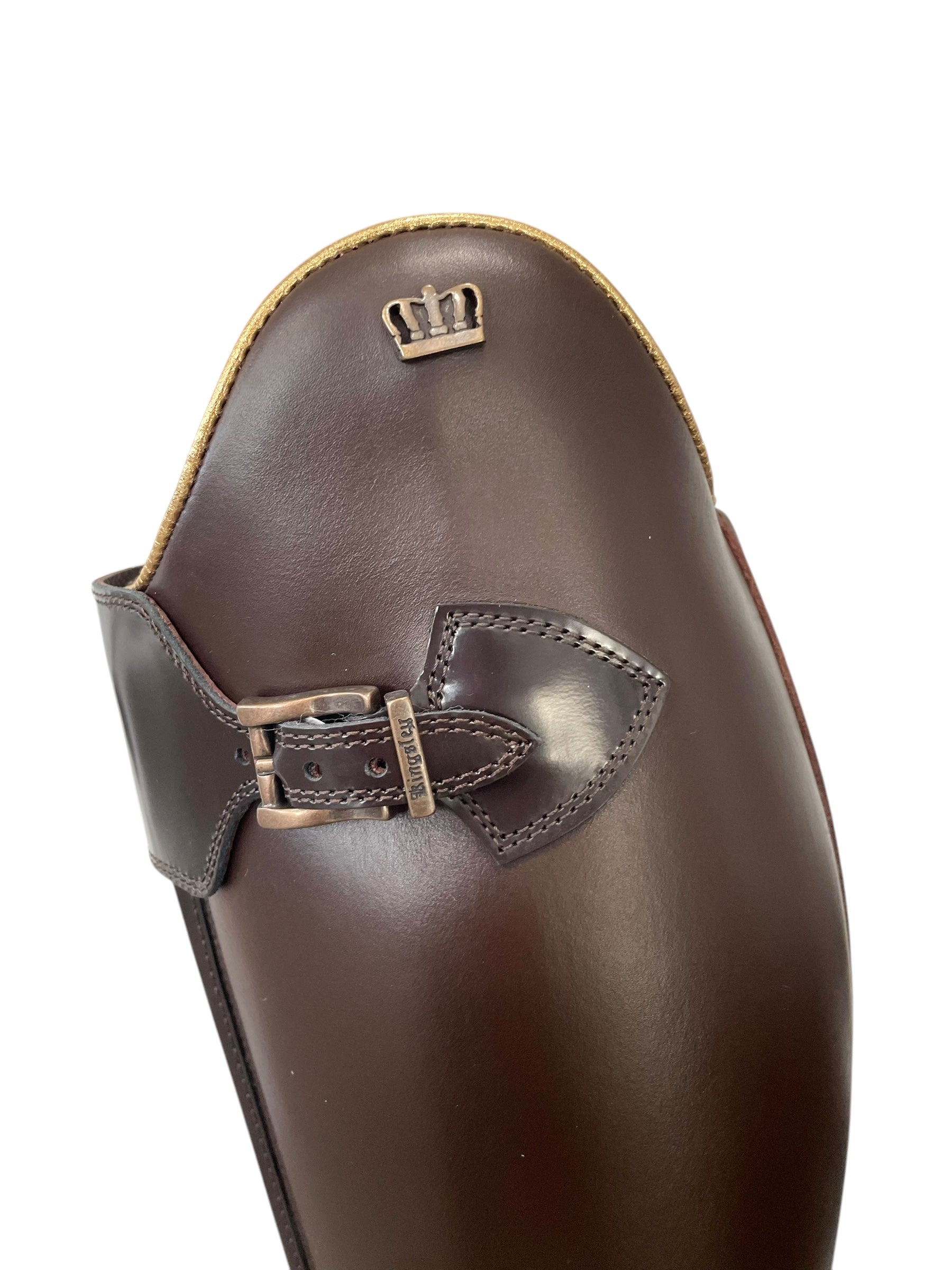 Description: Nature brown base, gold top piping, uragano dark brown top strap and parts along the zipper, old gold logo crown, and brown outsole.