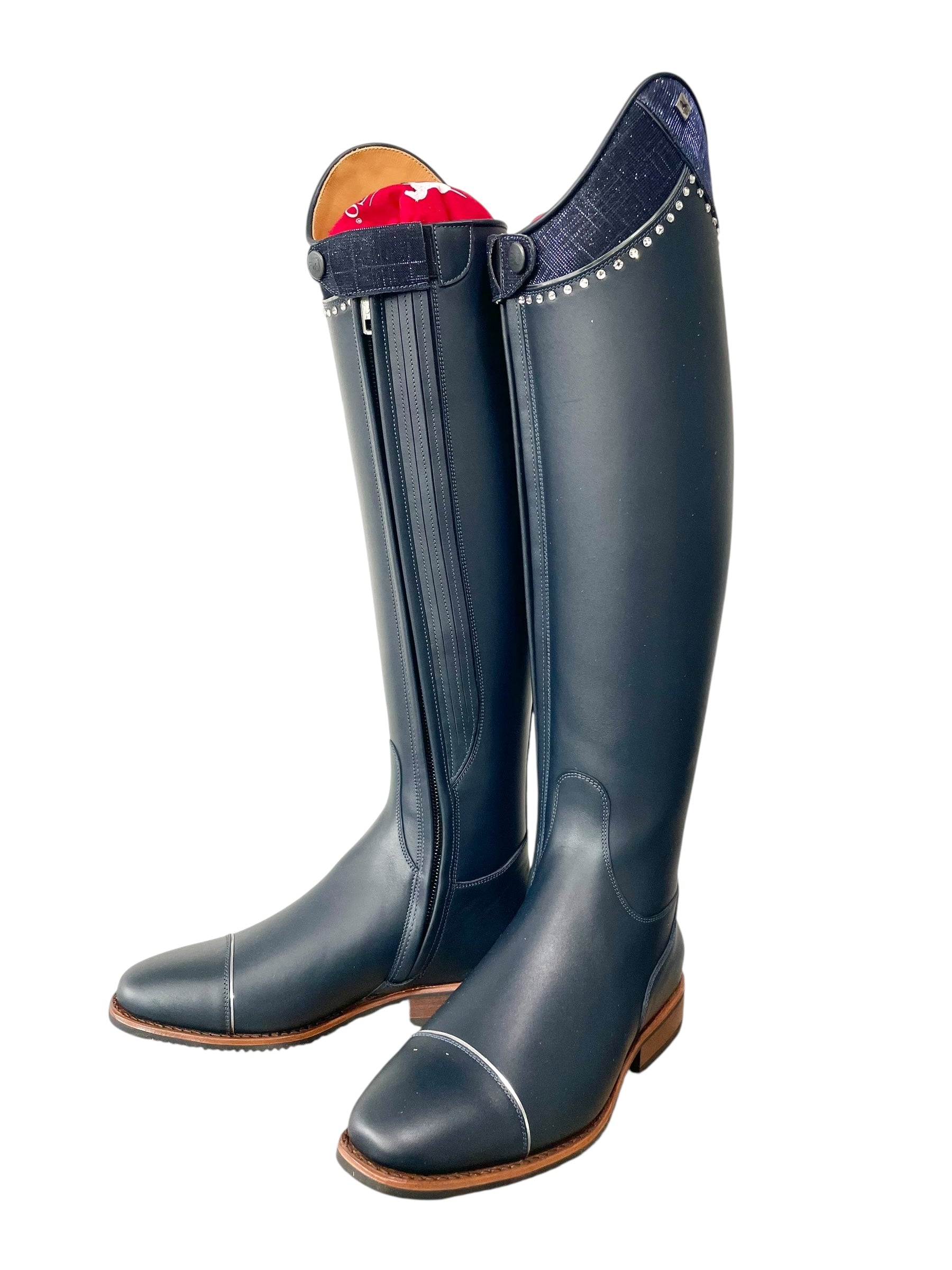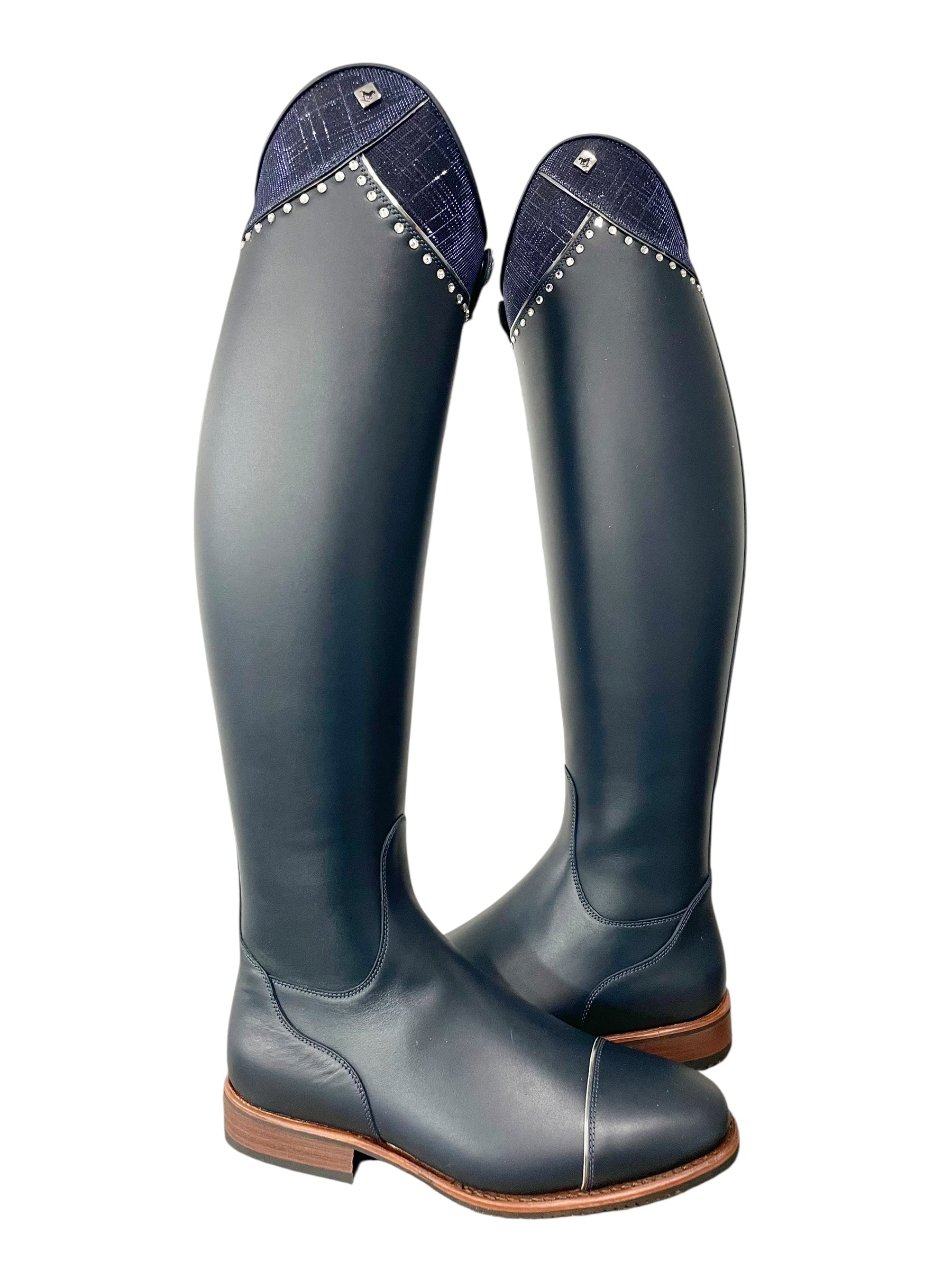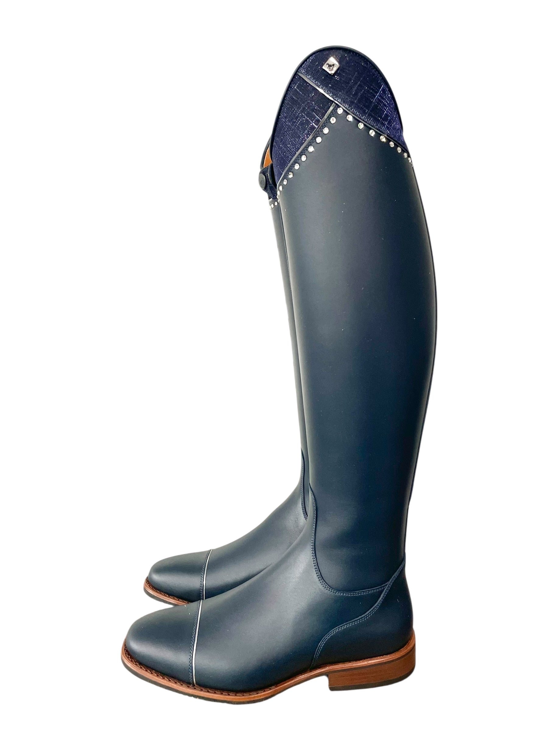 Description: WRAT indaco base, G35 musa top in iride oceano with GG08 Swarovski crystals and specchio iron piping, E4 toecap in WRAT indaco with specchio iron piping, Q7 inside shaft in WRAT indaco, Q16 6 cm bow, silver logo, and brown outsole.